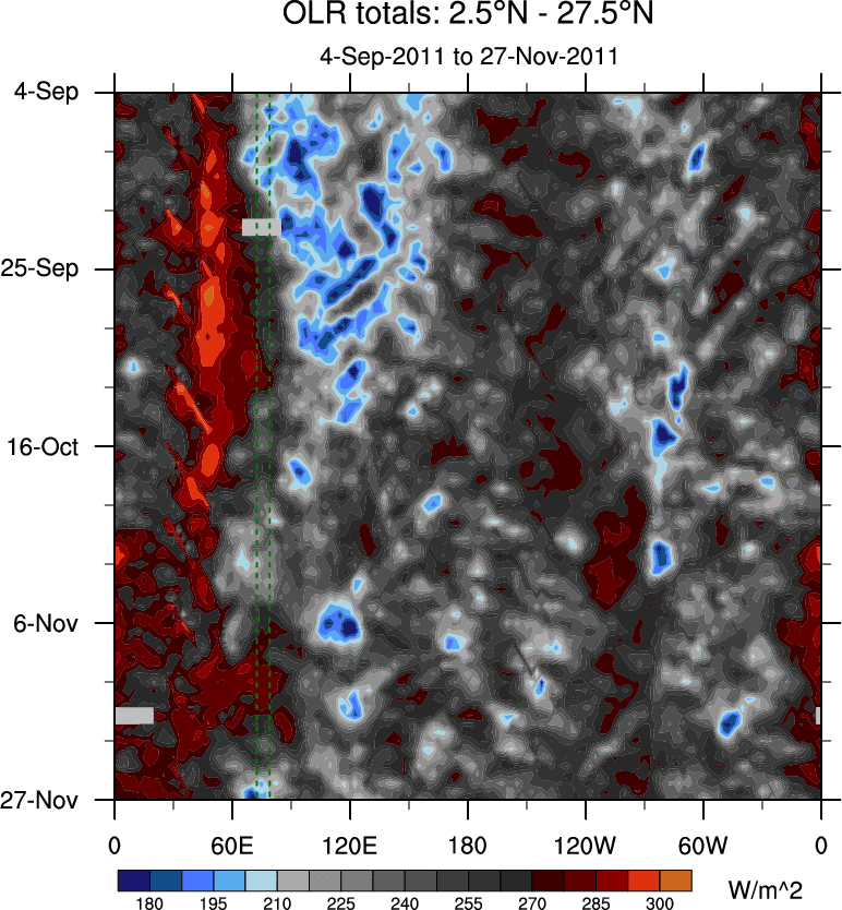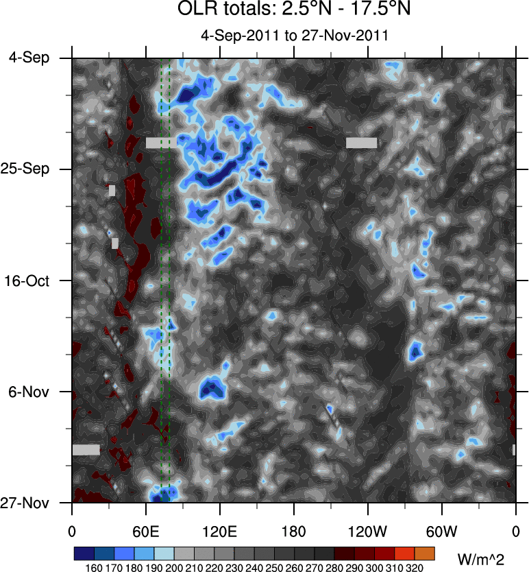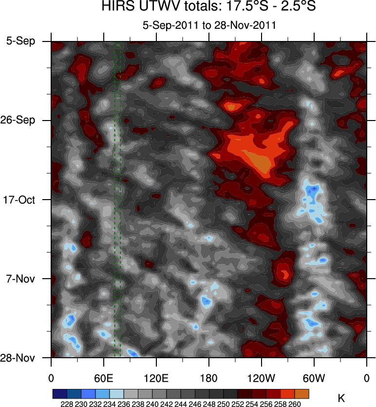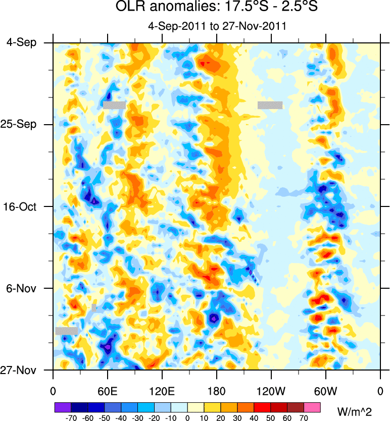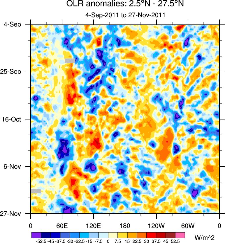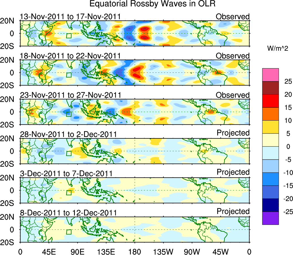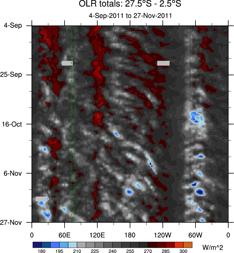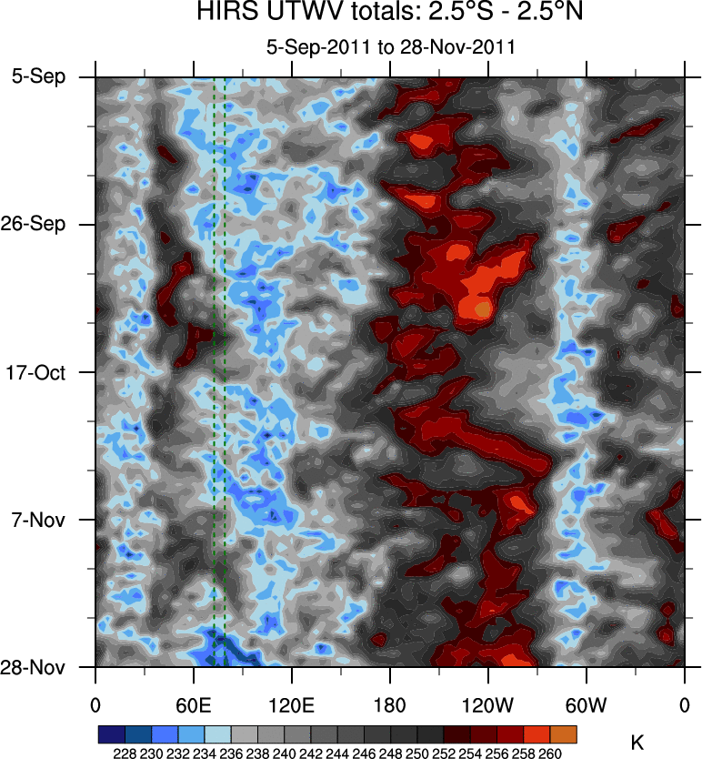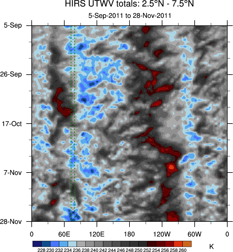 To identify tropical waves in near real-time, the OLR and UTWV data are filtered following Wheeler & Weickmann (2001 MWR). The daily anomalies are calculated using the first 3 harmonics of the seasonal cycle for 1979–2009. Missing values are then filled using linear interpolation in space and time. The most recent 365 days of anomalies are padded with 659 days of zeroes, and the result is filtered for each wave type.
