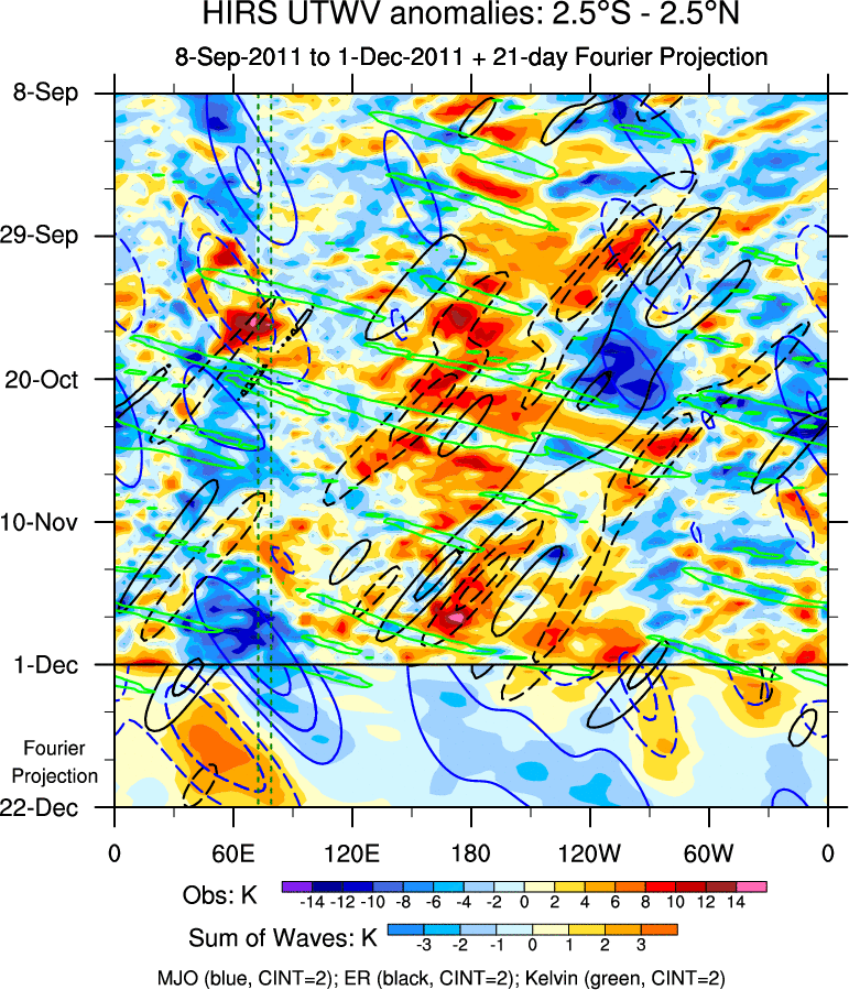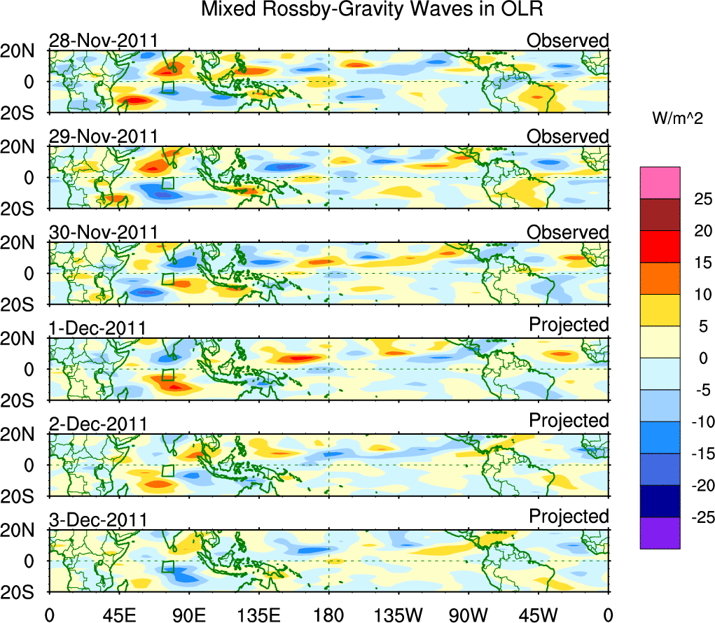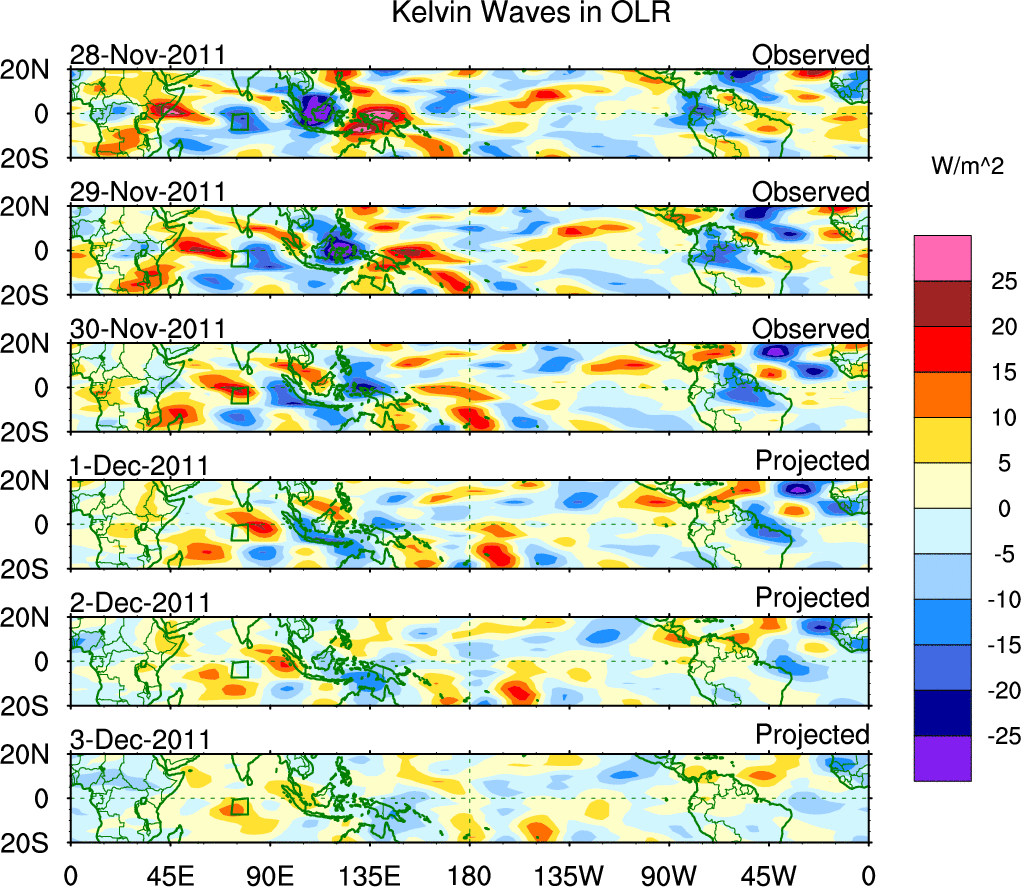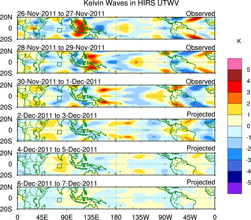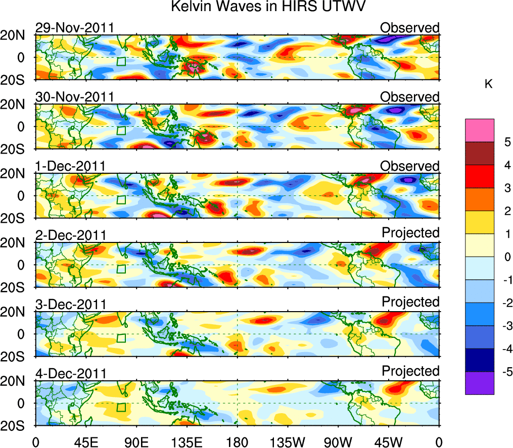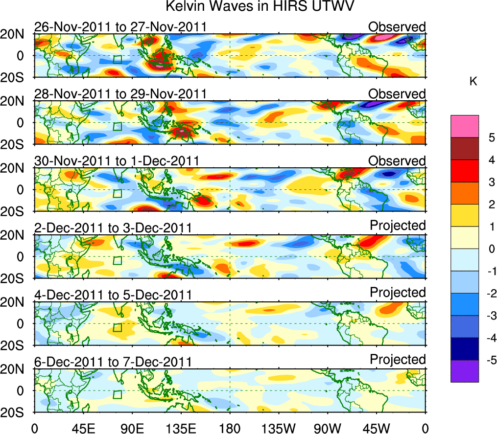 To identify tropical waves in near real-time, the OLR and UTWV data are filtered following Wheeler & Weickmann (2001 MWR). The daily anomalies are calculated using the first 3 harmonics of the seasonal cycle for 1979–2009. Missing values are then filled using linear interpolation in space and time. The most recent 365 days of anomalies are padded with 659 days of zeroes, and the result is filtered for each wave type.