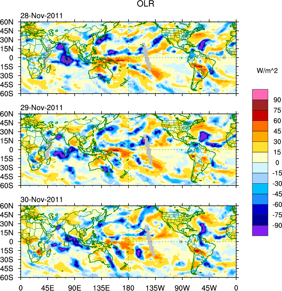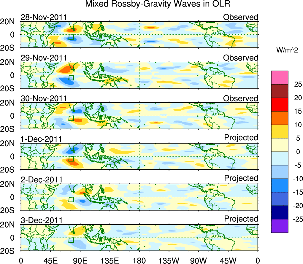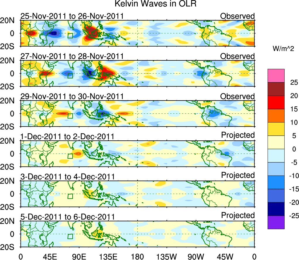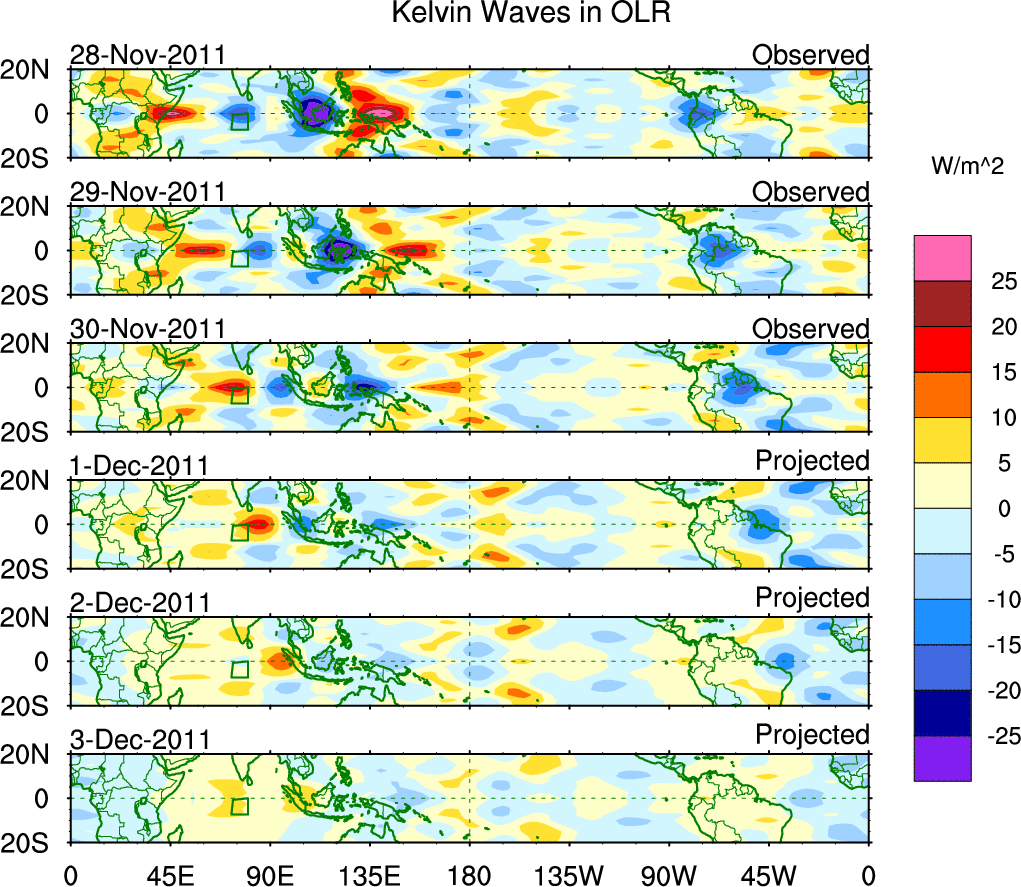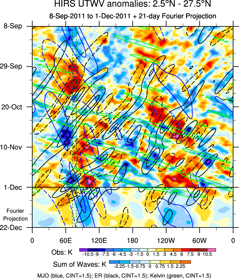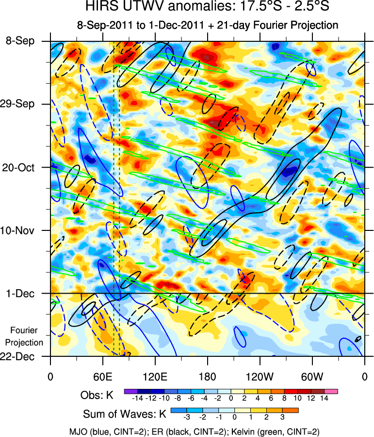 To identify tropical waves in near real-time, the OLR and UTWV data are filtered following Wheeler & Weickmann (2001 MWR). The daily anomalies are calculated using the first 3 harmonics of the seasonal cycle for 1979–2009. Missing values are then filled using linear interpolation in space and time. The most recent 365 days of anomalies are padded with 659 days of zeroes, and the result is filtered for each wave type.