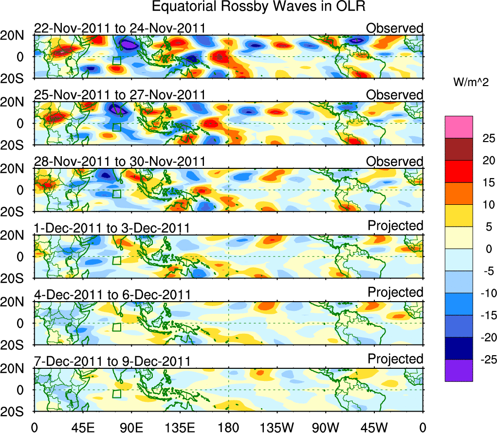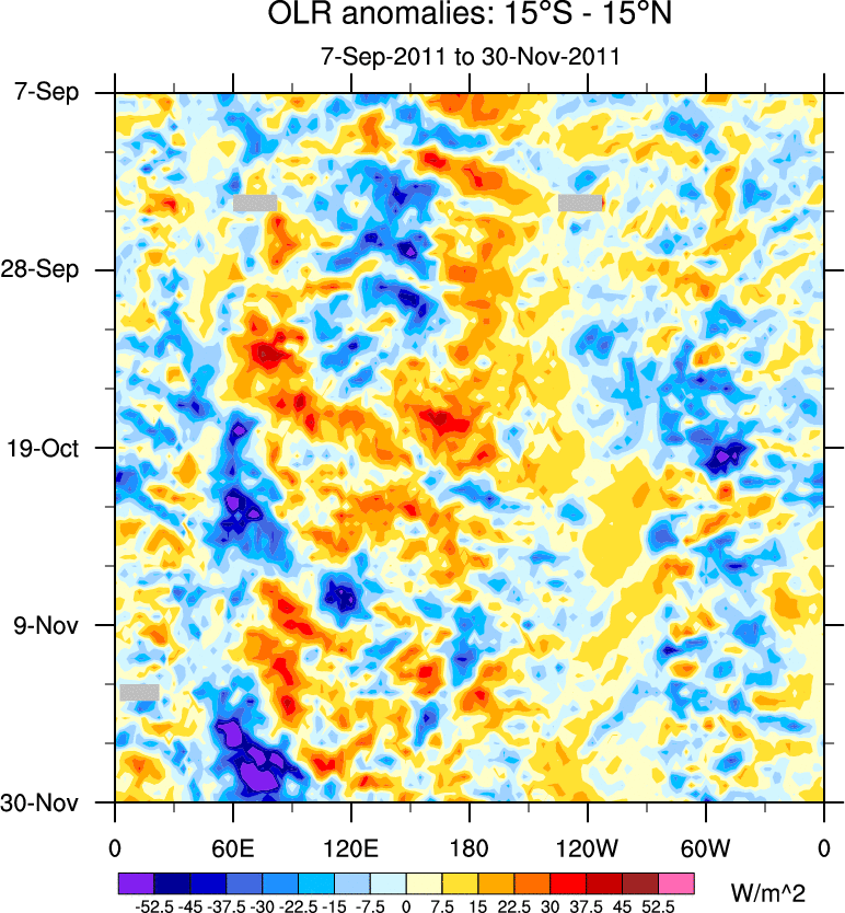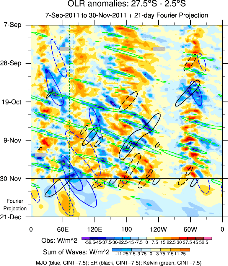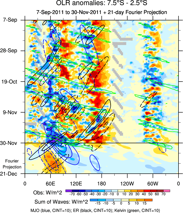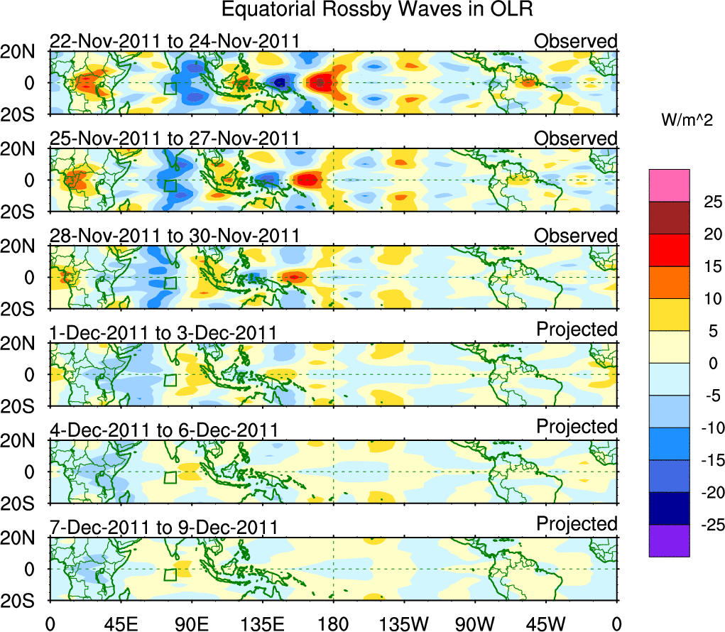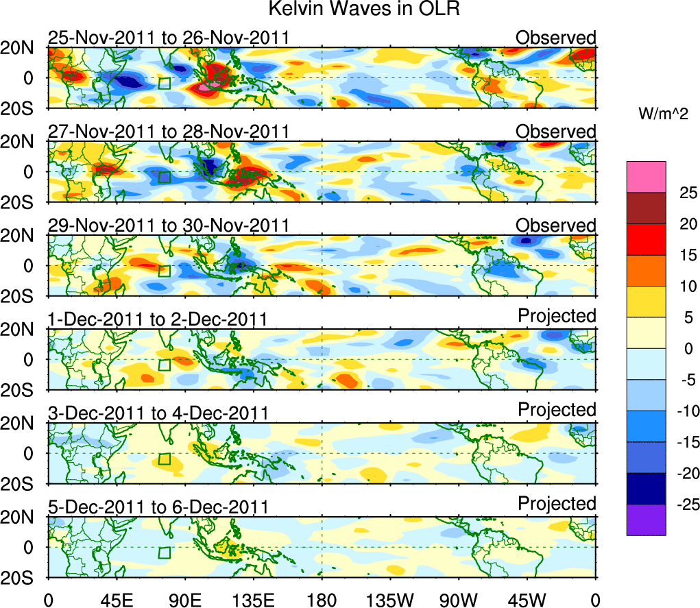 To identify tropical waves in near real-time, the OLR and UTWV data are filtered following Wheeler & Weickmann (2001 MWR). The daily anomalies are calculated using the first 3 harmonics of the seasonal cycle for 1979–2009. Missing values are then filled using linear interpolation in space and time. The most recent 365 days of anomalies are padded with 659 days of zeroes, and the result is filtered for each wave type.