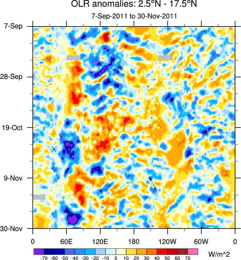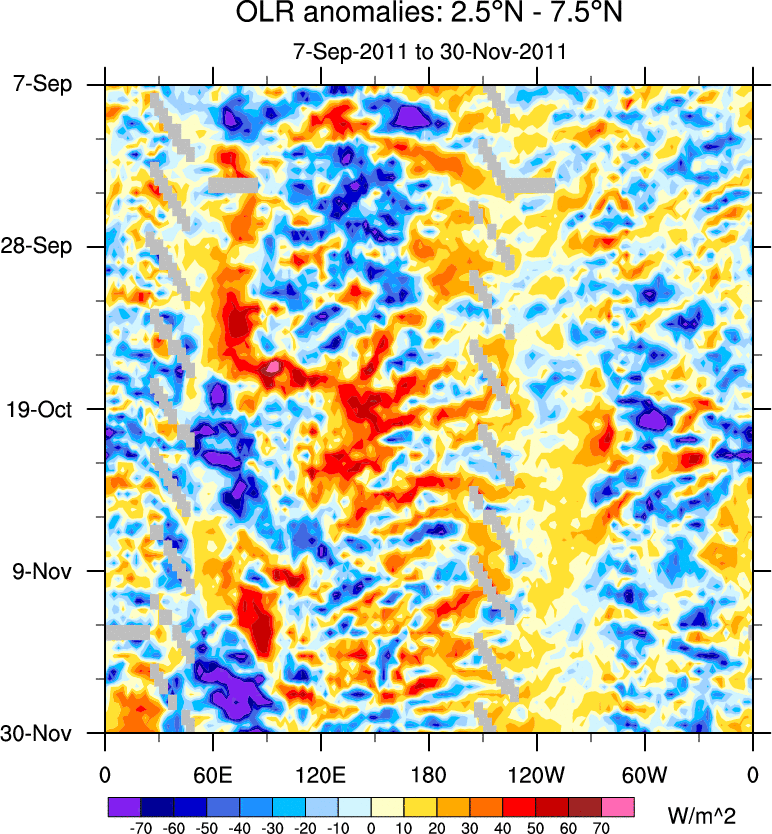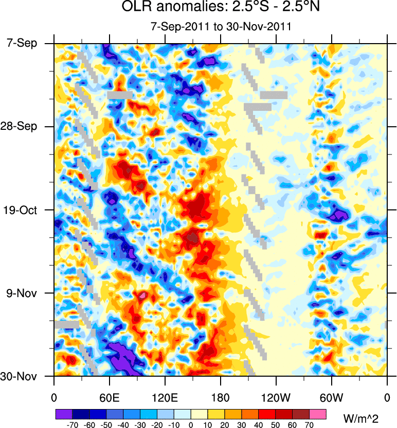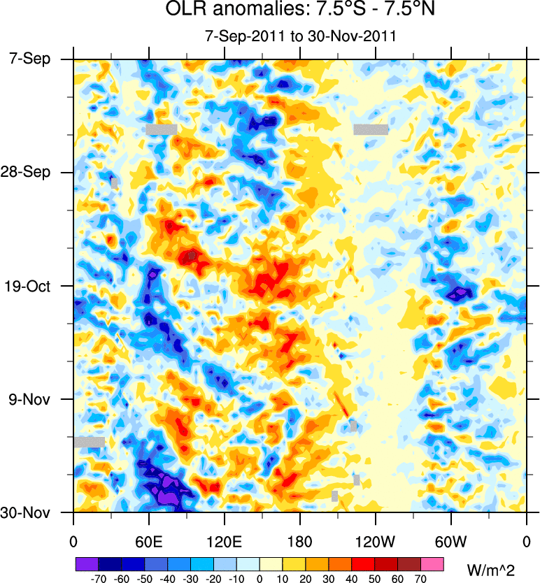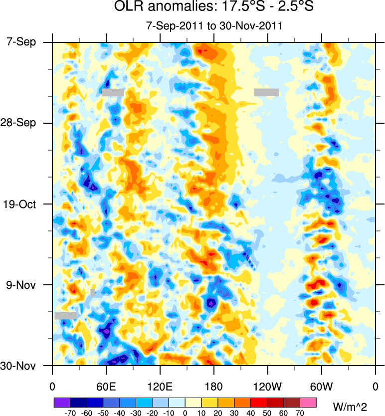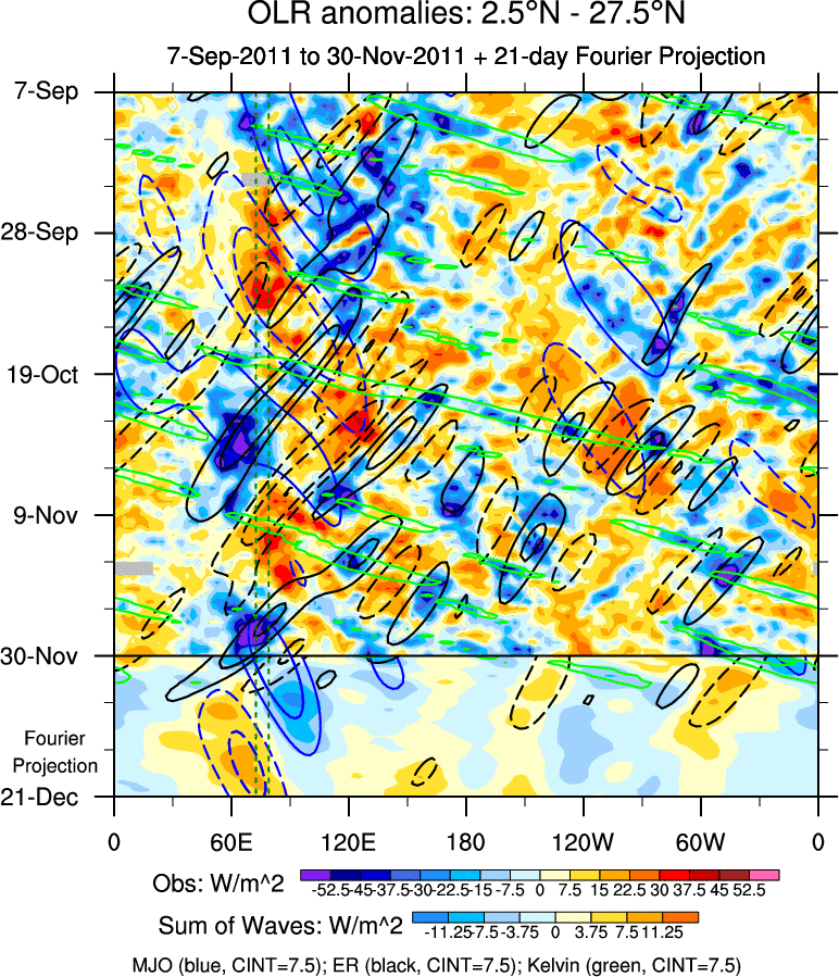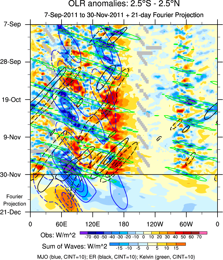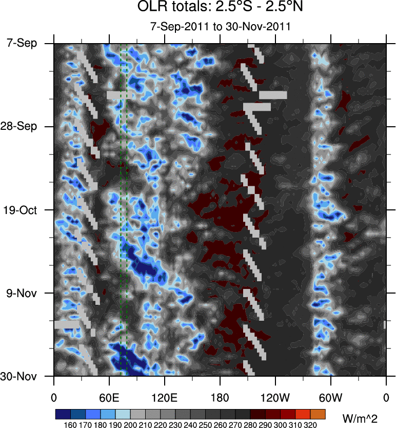 To identify tropical waves in near real-time, the OLR and UTWV data are filtered following Wheeler & Weickmann (2001 MWR). The daily anomalies are calculated using the first 3 harmonics of the seasonal cycle for 1979–2009. Missing values are then filled using linear interpolation in space and time. The most recent 365 days of anomalies are padded with 659 days of zeroes, and the result is filtered for each wave type.