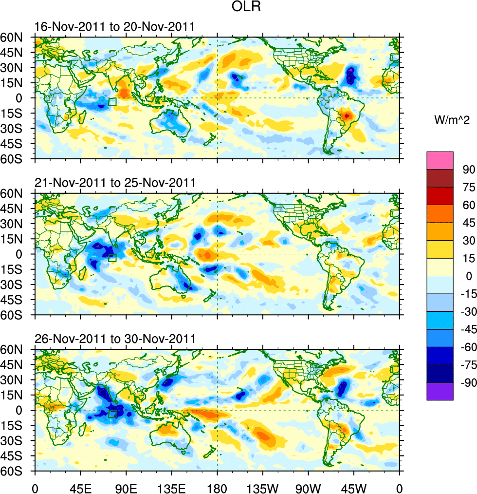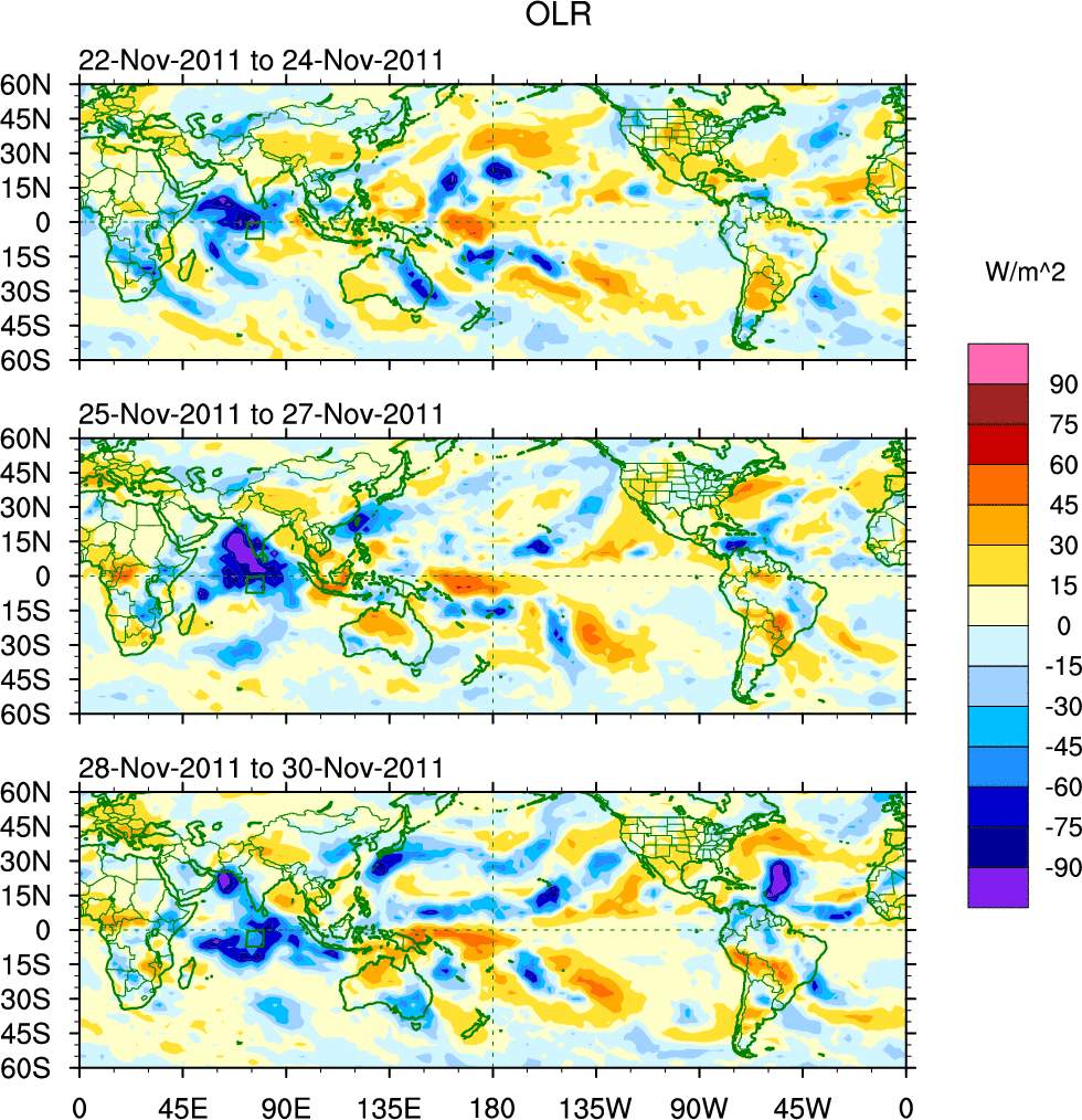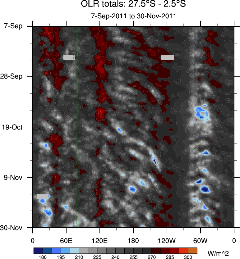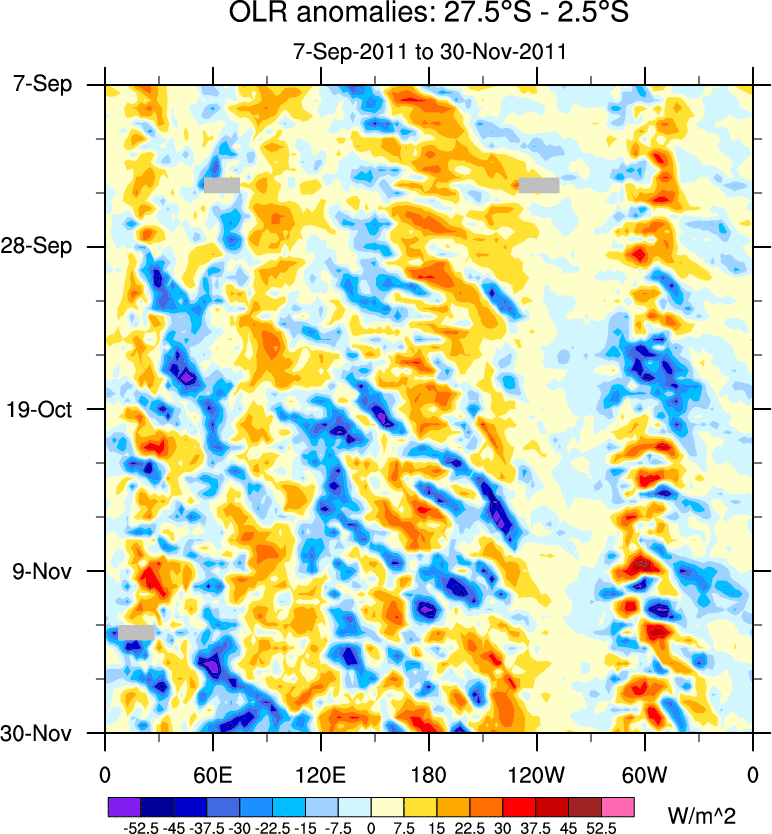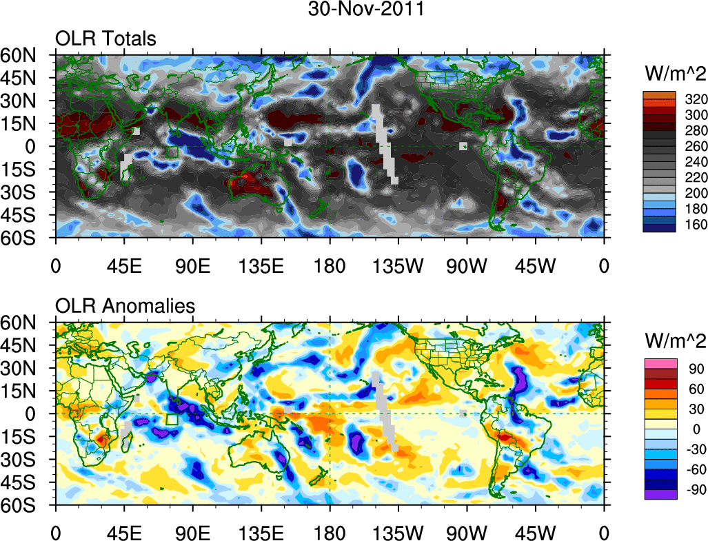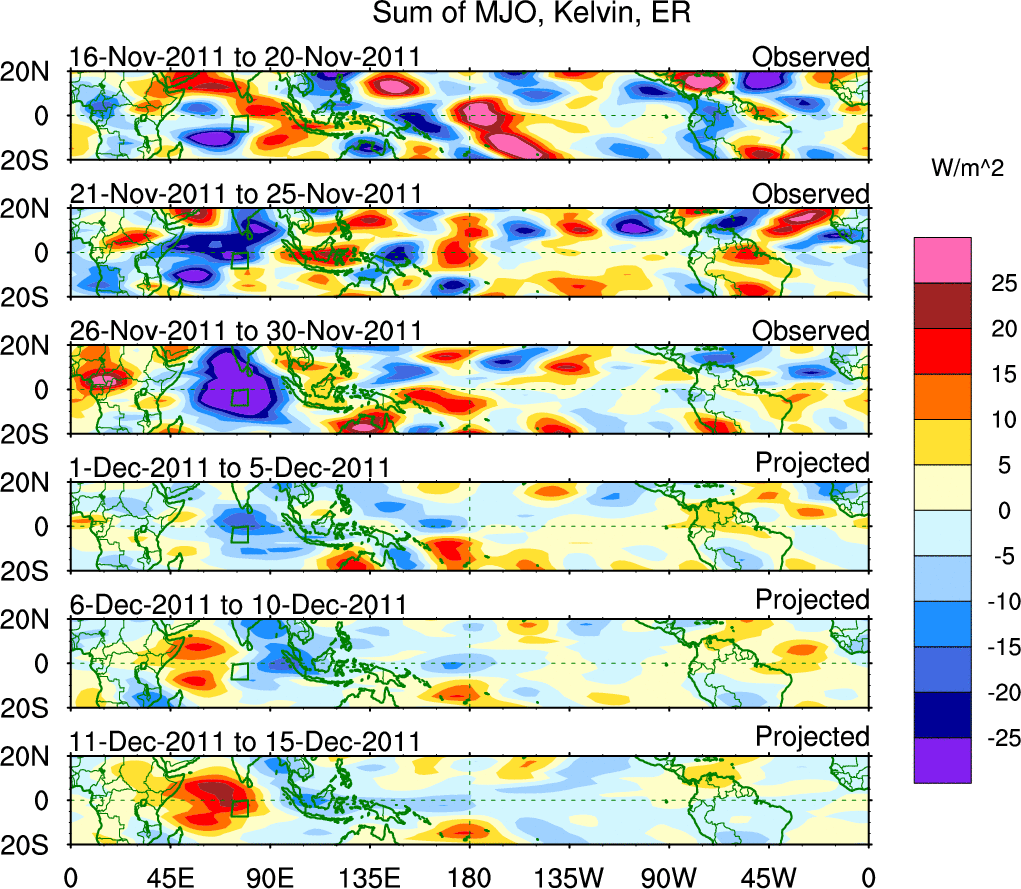 To identify tropical waves in near real-time, the OLR and UTWV data are filtered following Wheeler & Weickmann (2001 MWR). The daily anomalies are calculated using the first 3 harmonics of the seasonal cycle for 1979–2009. Missing values are then filled using linear interpolation in space and time. The most recent 365 days of anomalies are padded with 659 days of zeroes, and the result is filtered for each wave type.