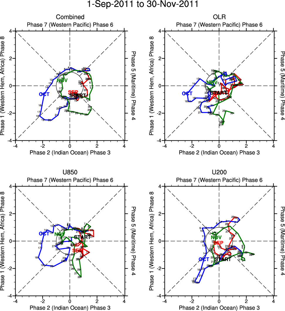 Wheeler and Hendon (2004) constructed the RMM index for monitoring the MJO. This index consists of the first two principal components (PCs) of OLR, 850-hPa zonal wind, and 200-hPa zonal wind averaged 15S-15N.