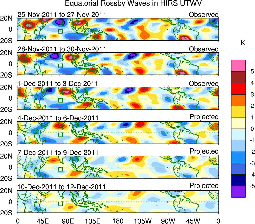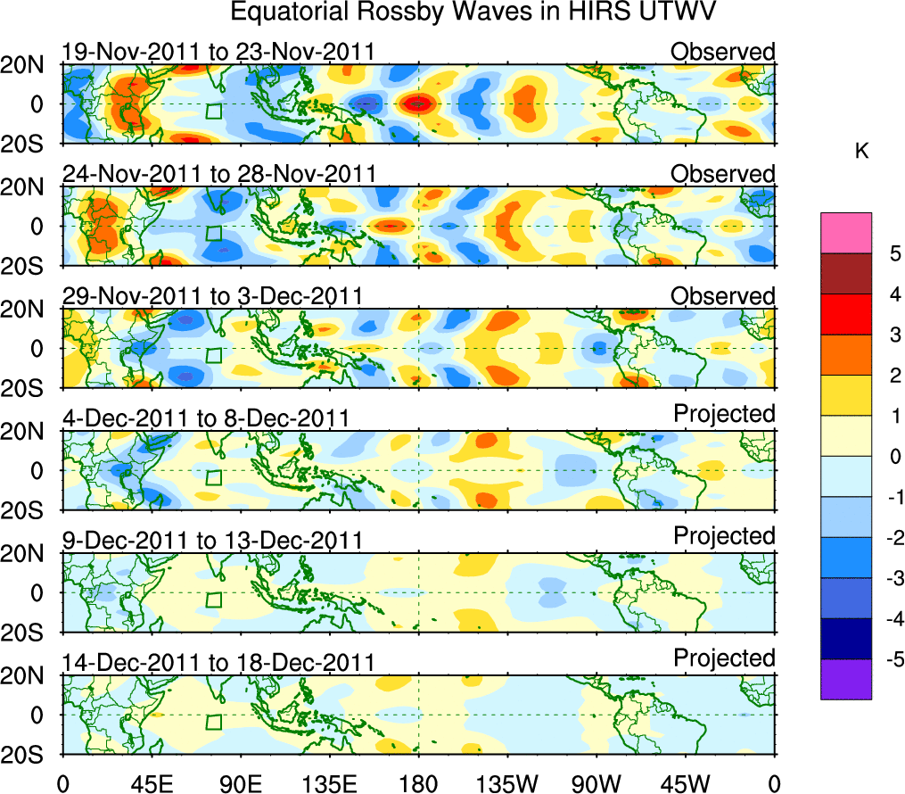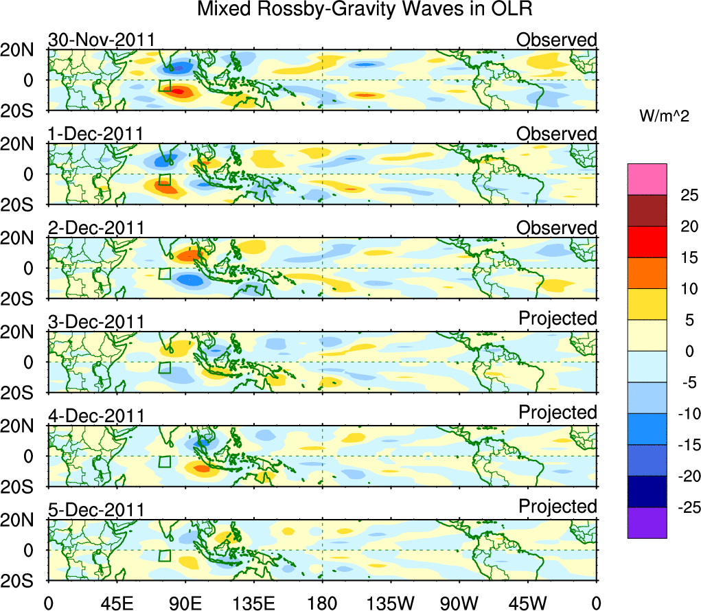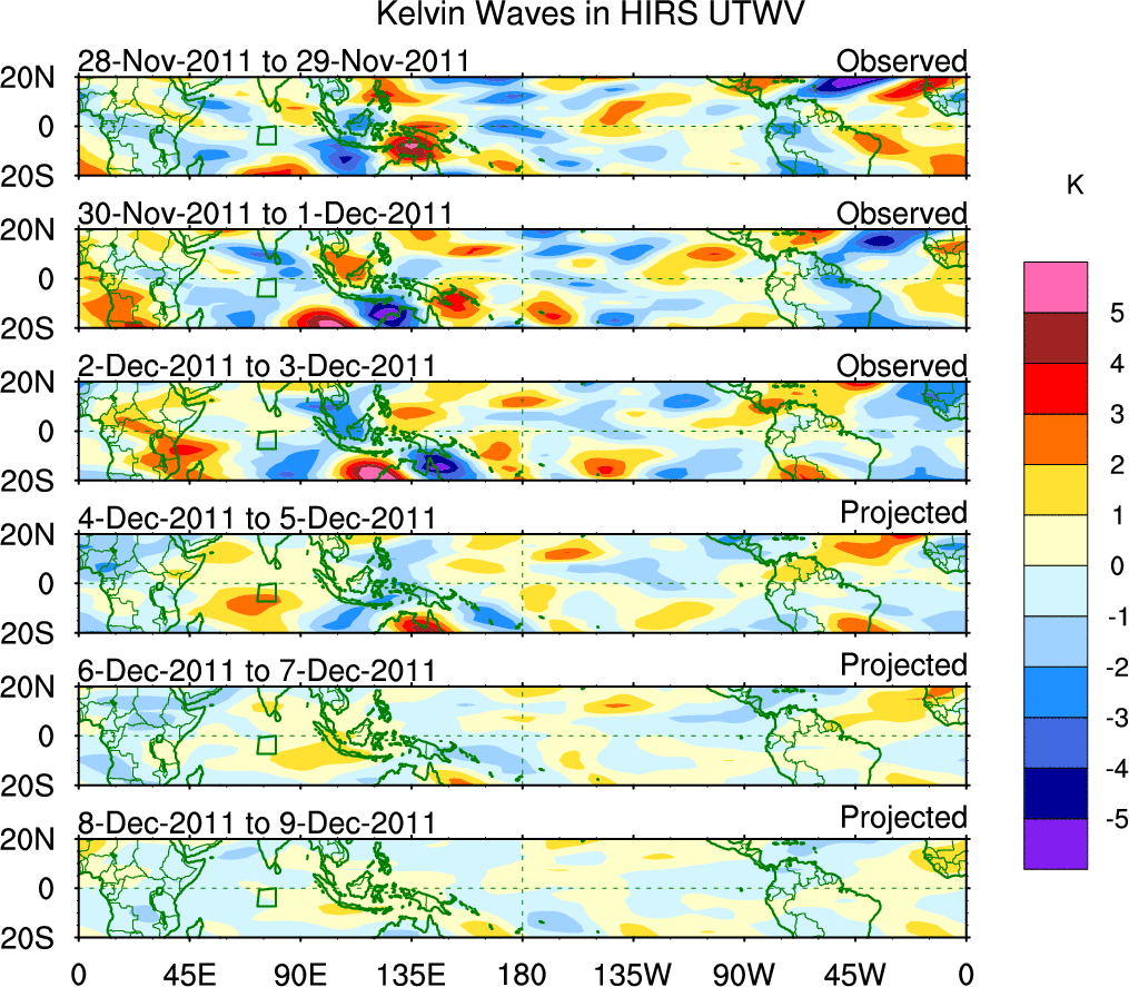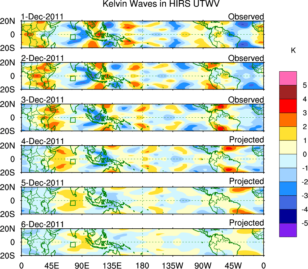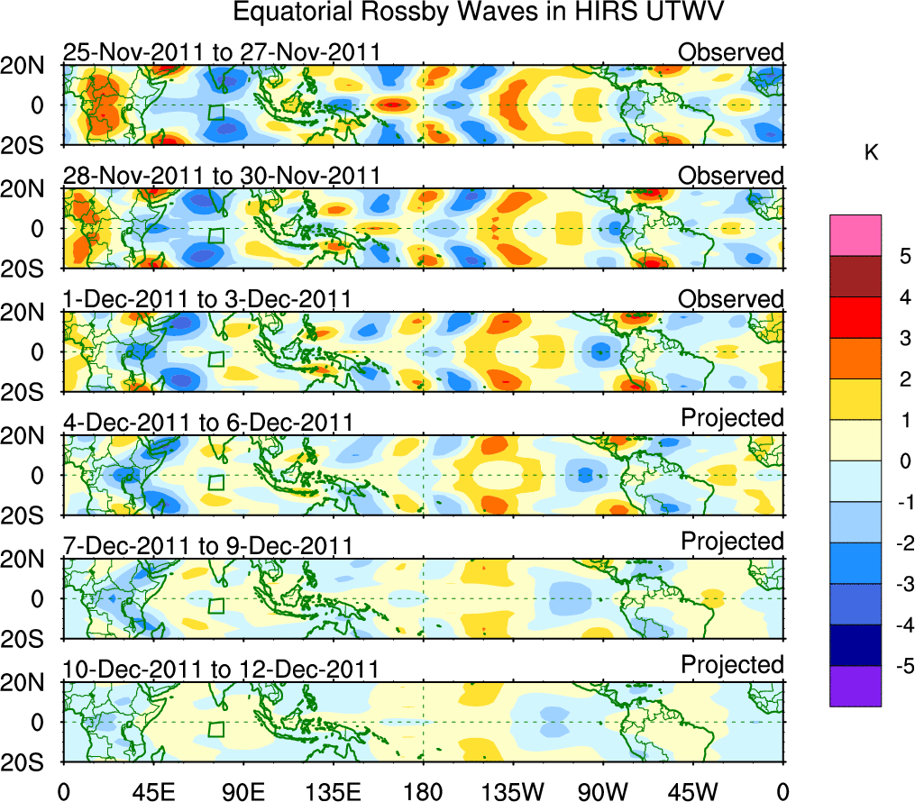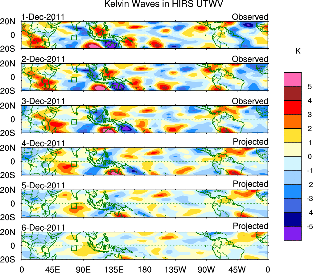 To identify tropical waves in near real-time, the OLR and UTWV data are filtered following Wheeler & Weickmann (2001 MWR). The daily anomalies are calculated using the first 3 harmonics of the seasonal cycle for 1979–2009. Missing values are then filled using linear interpolation in space and time. The most recent 365 days of anomalies are padded with 659 days of zeroes, and the result is filtered for each wave type.