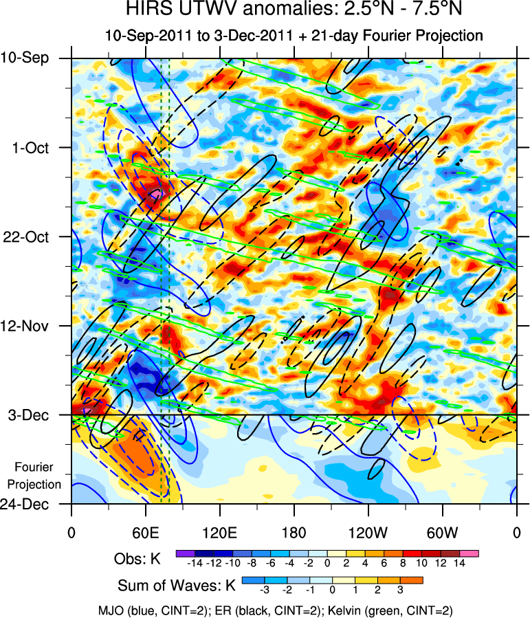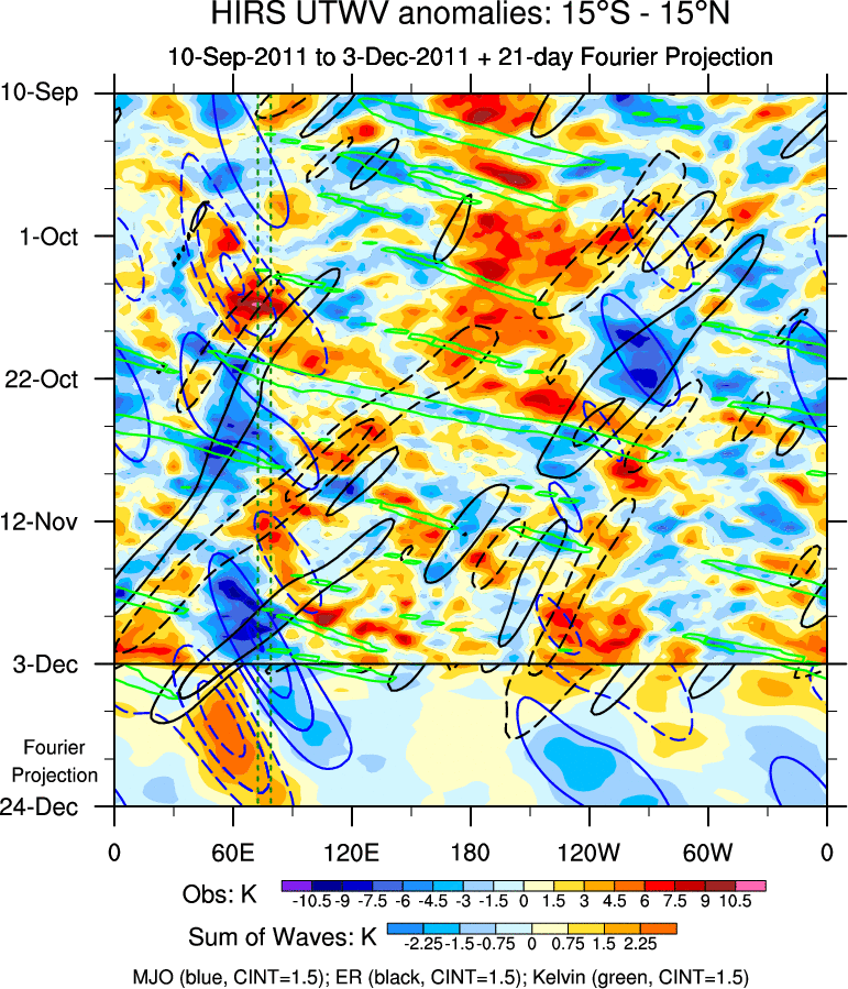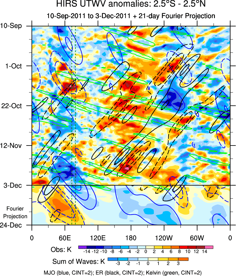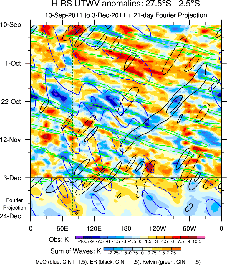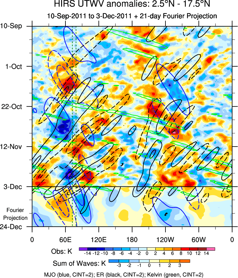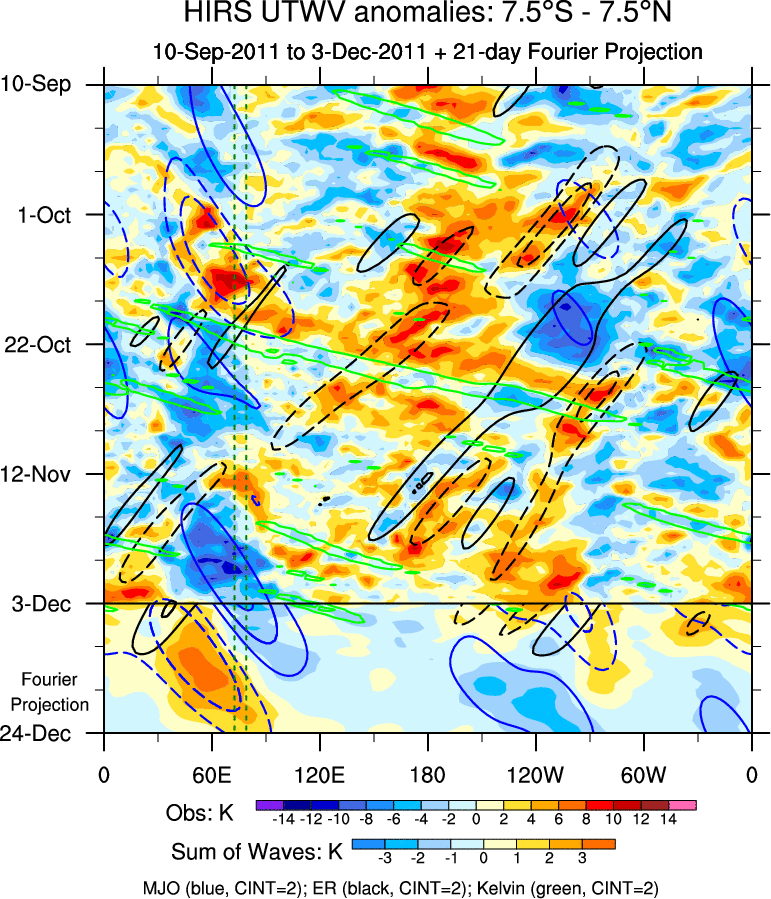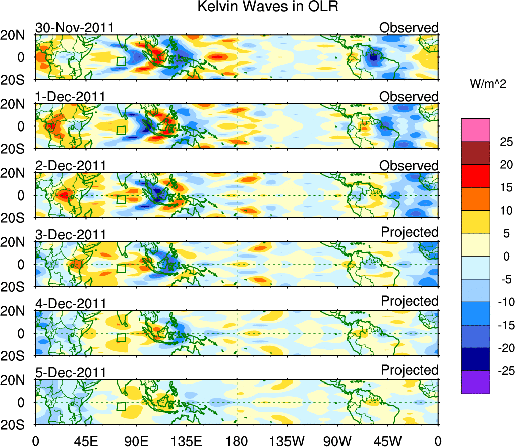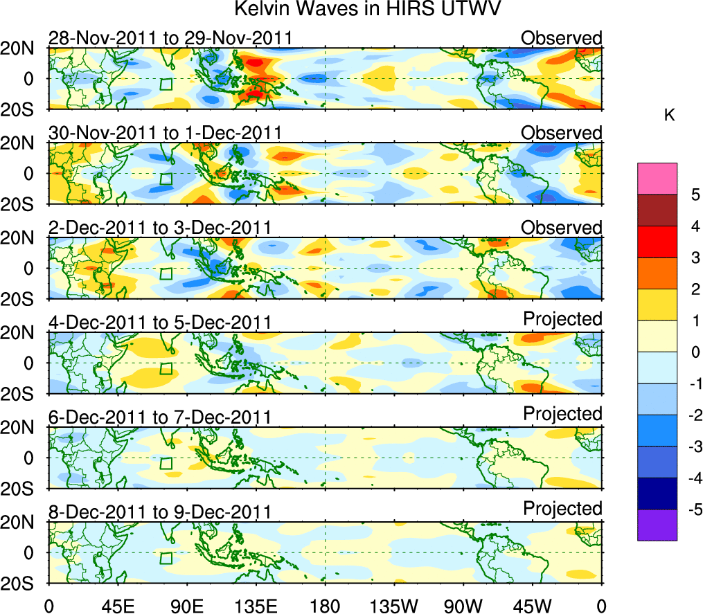 To identify tropical waves in near real-time, the OLR and UTWV data are filtered following Wheeler & Weickmann (2001 MWR). The daily anomalies are calculated using the first 3 harmonics of the seasonal cycle for 1979–2009. Missing values are then filled using linear interpolation in space and time. The most recent 365 days of anomalies are padded with 659 days of zeroes, and the result is filtered for each wave type.
