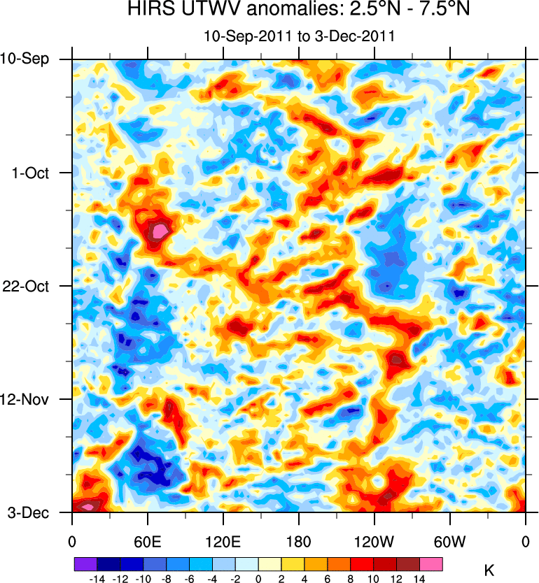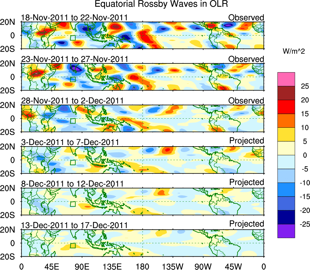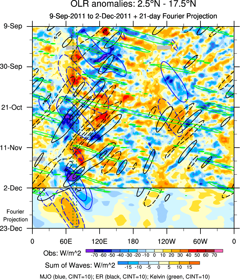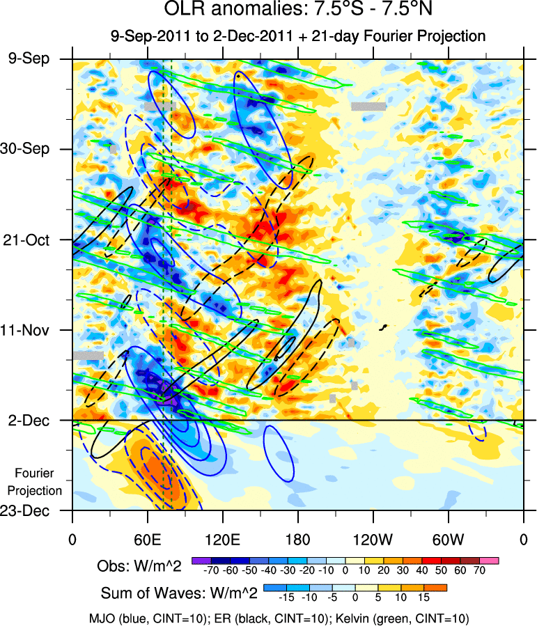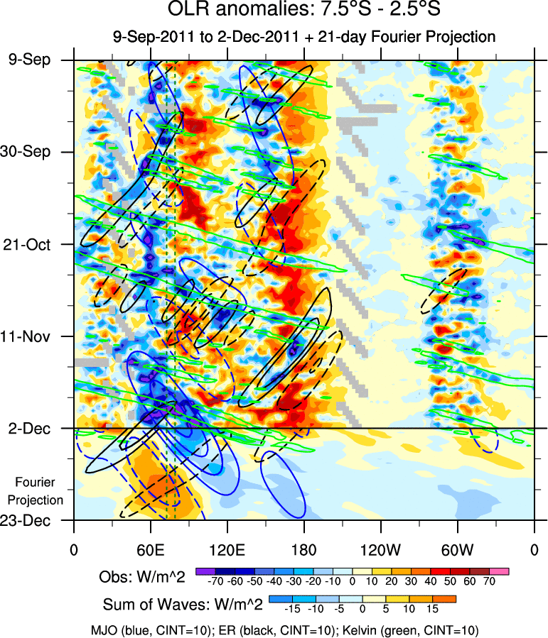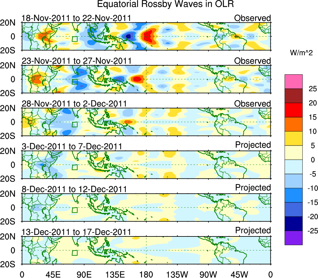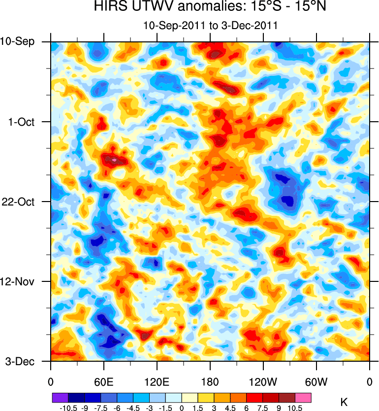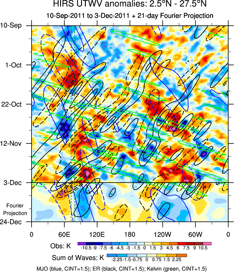 To identify tropical waves in near real-time, the OLR and UTWV data are filtered following Wheeler & Weickmann (2001 MWR). The daily anomalies are calculated using the first 3 harmonics of the seasonal cycle for 1979–2009. Missing values are then filled using linear interpolation in space and time. The most recent 365 days of anomalies are padded with 659 days of zeroes, and the result is filtered for each wave type.