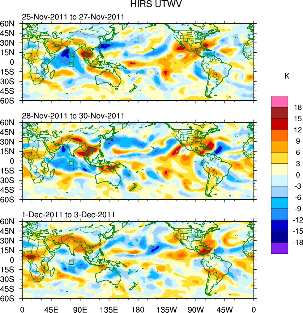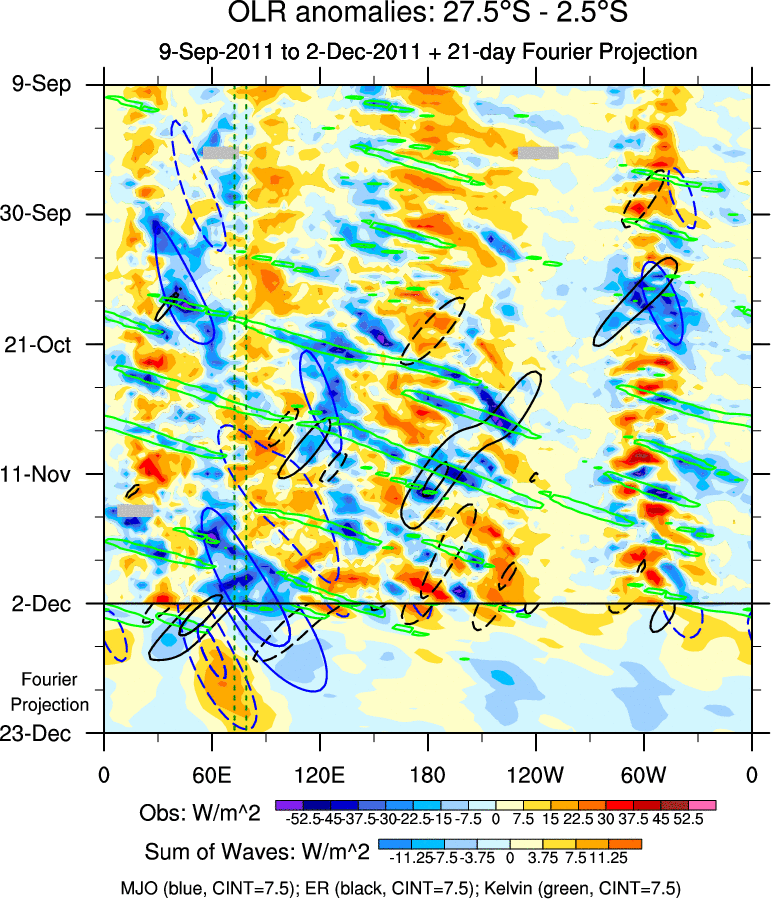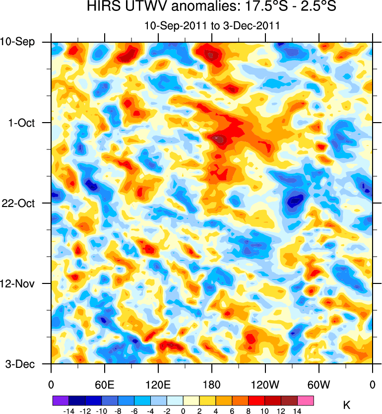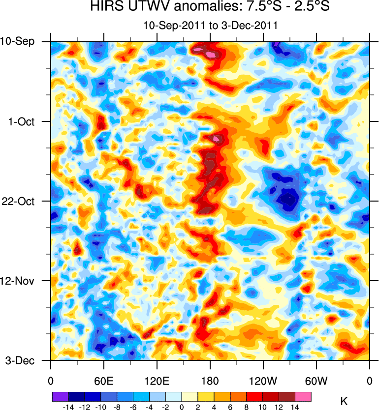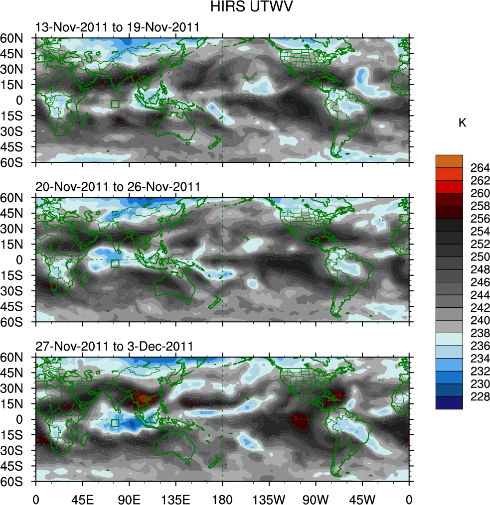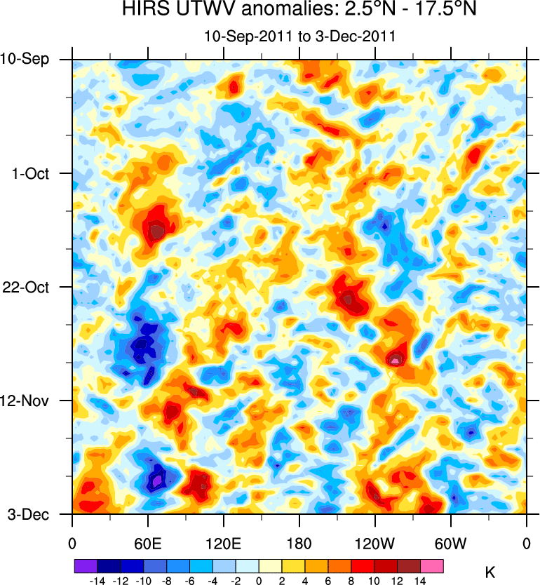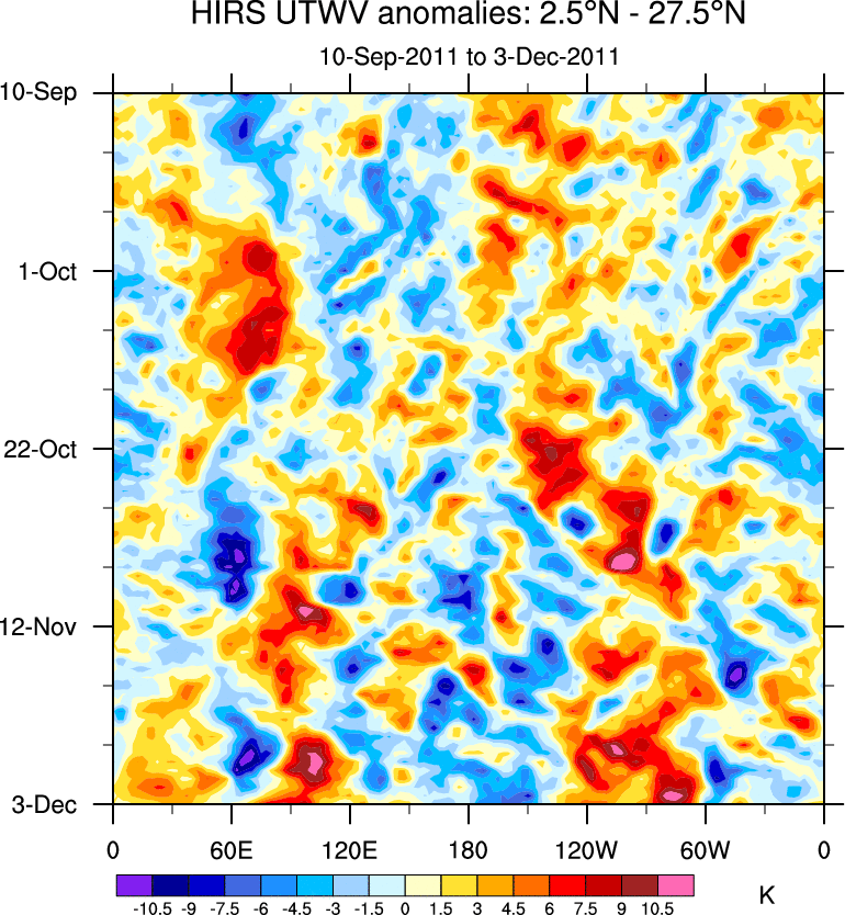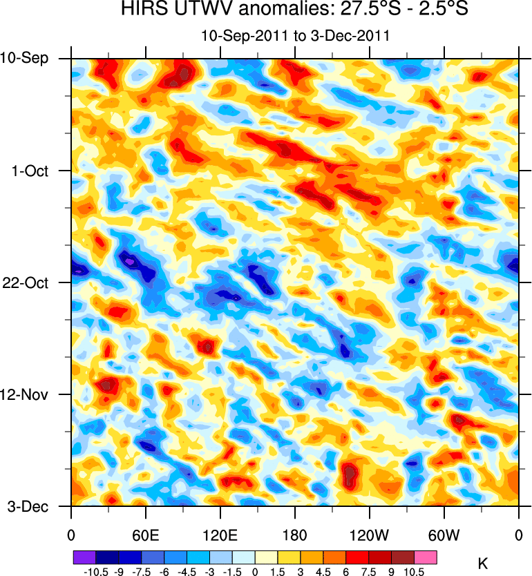 To identify tropical waves in near real-time, the OLR and UTWV data are filtered following Wheeler & Weickmann (2001 MWR). The daily anomalies are calculated using the first 3 harmonics of the seasonal cycle for 1979–2009. Missing values are then filled using linear interpolation in space and time. The most recent 365 days of anomalies are padded with 659 days of zeroes, and the result is filtered for each wave type.