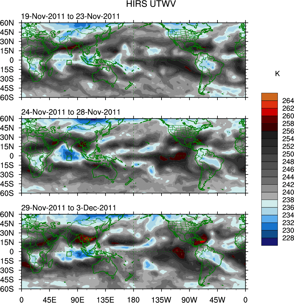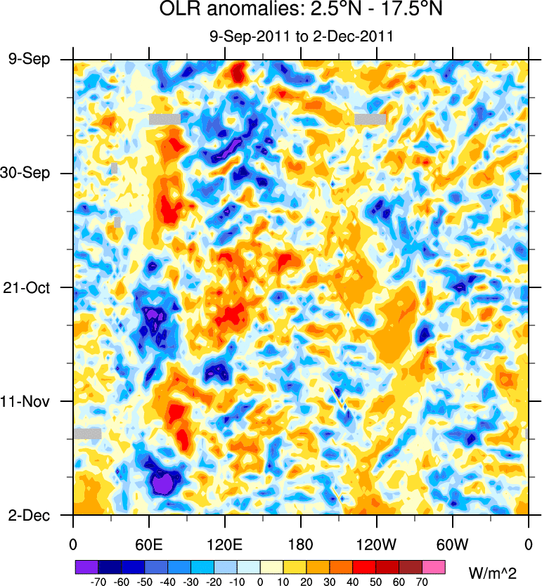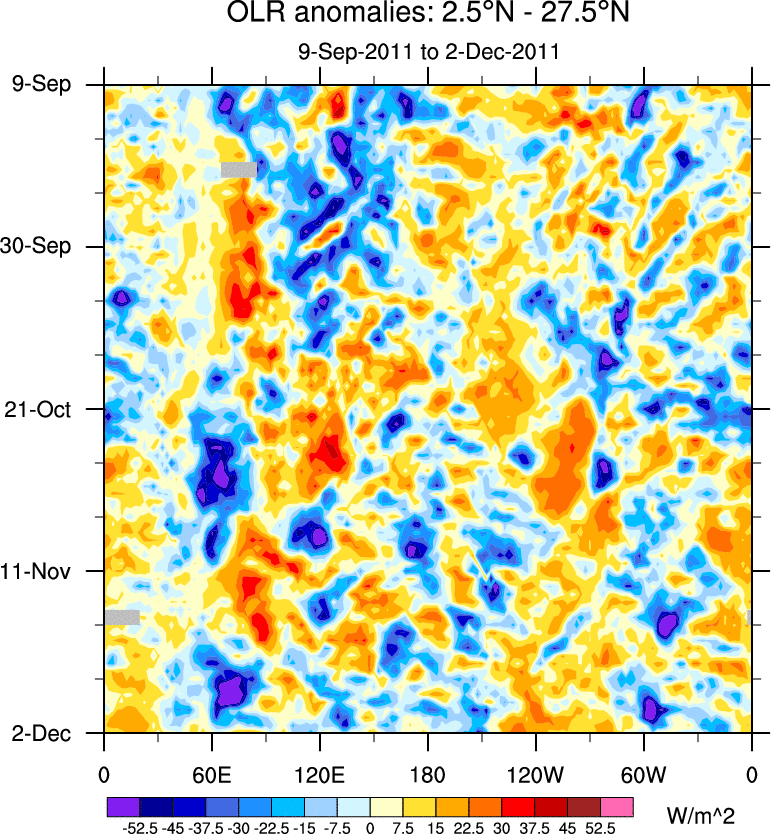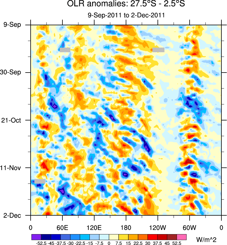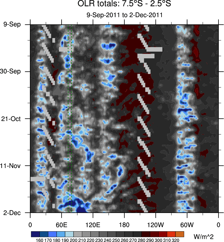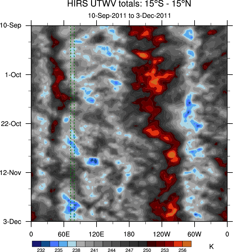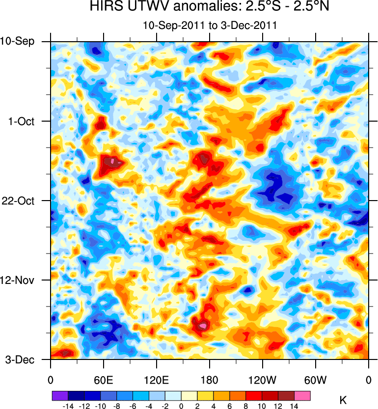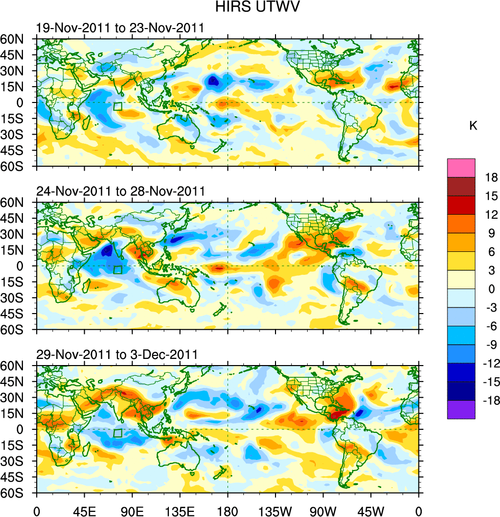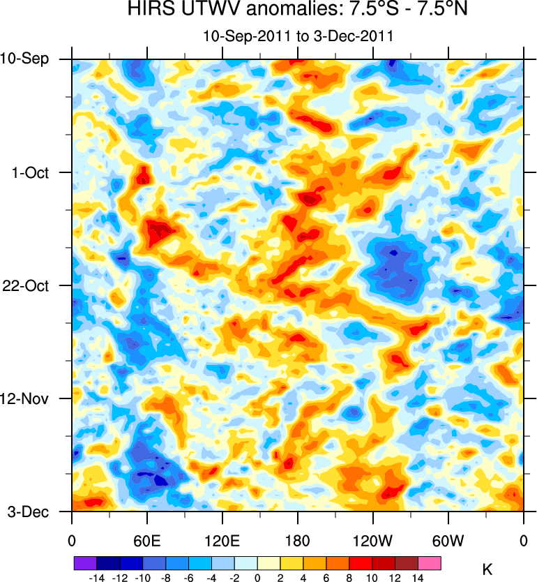 To identify tropical waves in near real-time, the OLR and UTWV data are filtered following Wheeler & Weickmann (2001 MWR). The daily anomalies are calculated using the first 3 harmonics of the seasonal cycle for 1979–2009. Missing values are then filled using linear interpolation in space and time. The most recent 365 days of anomalies are padded with 659 days of zeroes, and the result is filtered for each wave type.