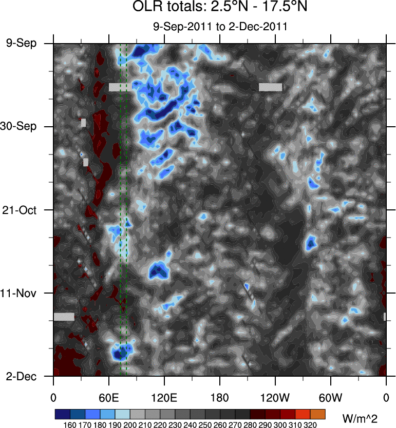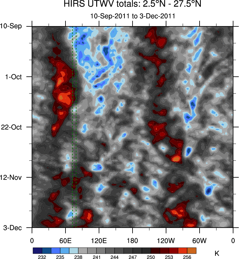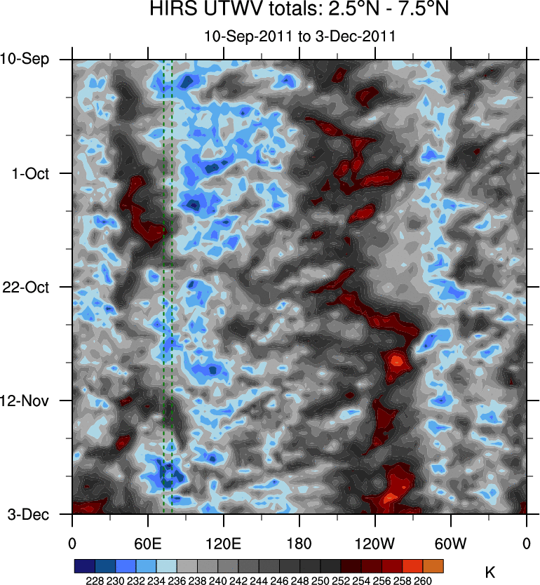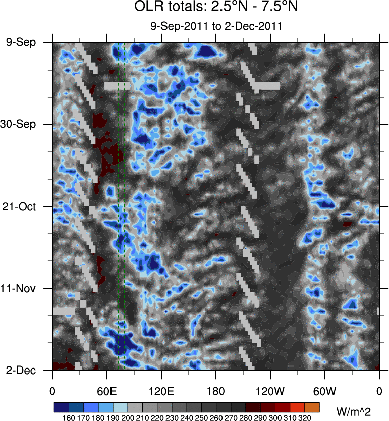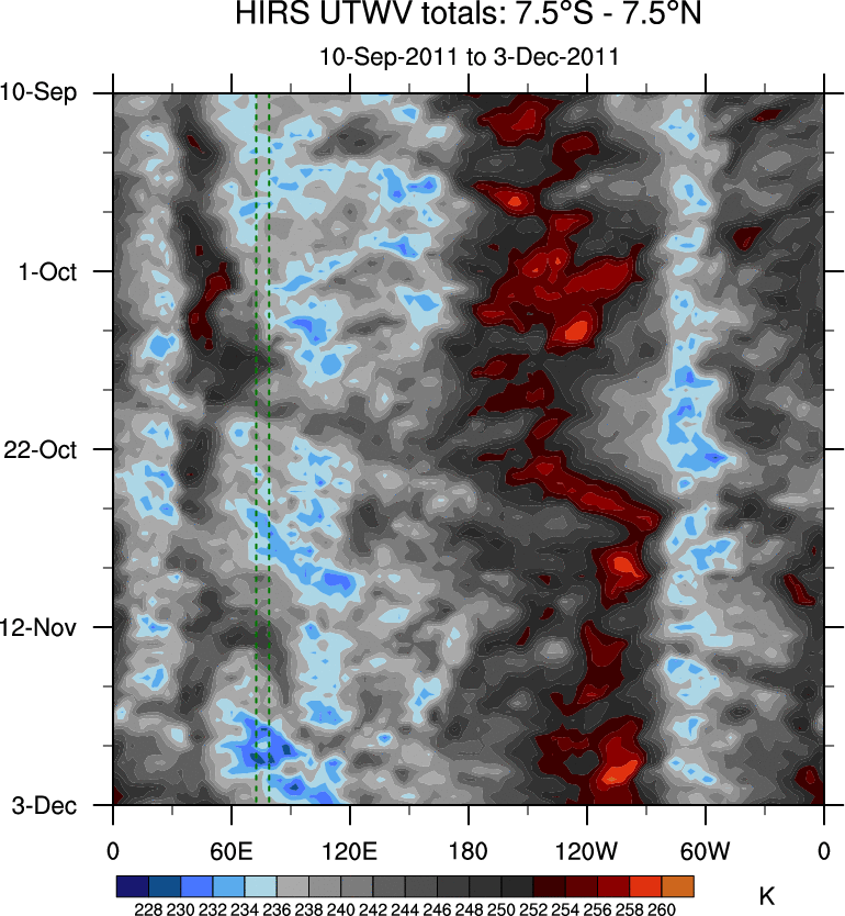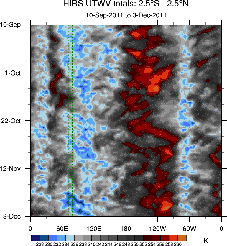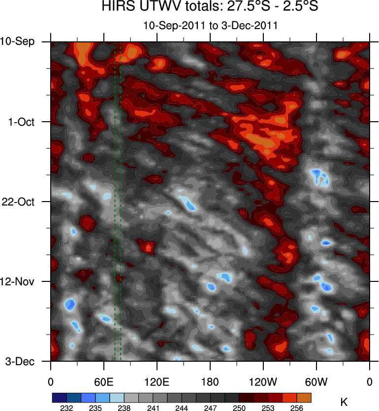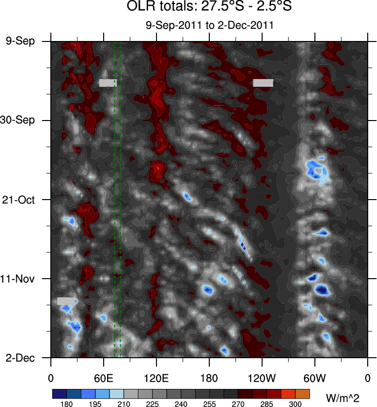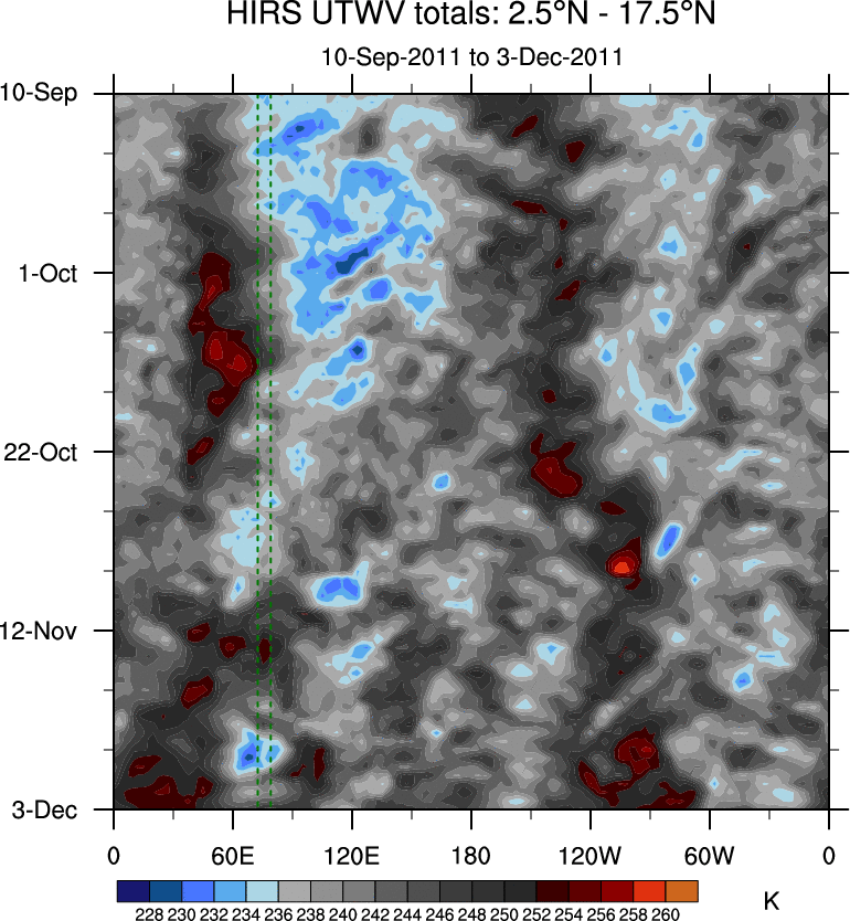 To identify tropical waves in near real-time, the OLR and UTWV data are filtered following Wheeler & Weickmann (2001 MWR). The daily anomalies are calculated using the first 3 harmonics of the seasonal cycle for 1979–2009. Missing values are then filled using linear interpolation in space and time. The most recent 365 days of anomalies are padded with 659 days of zeroes, and the result is filtered for each wave type.
