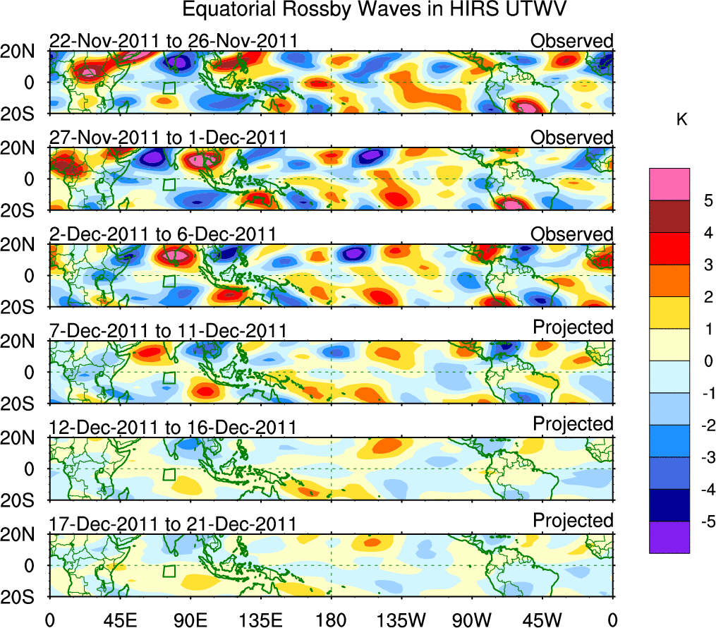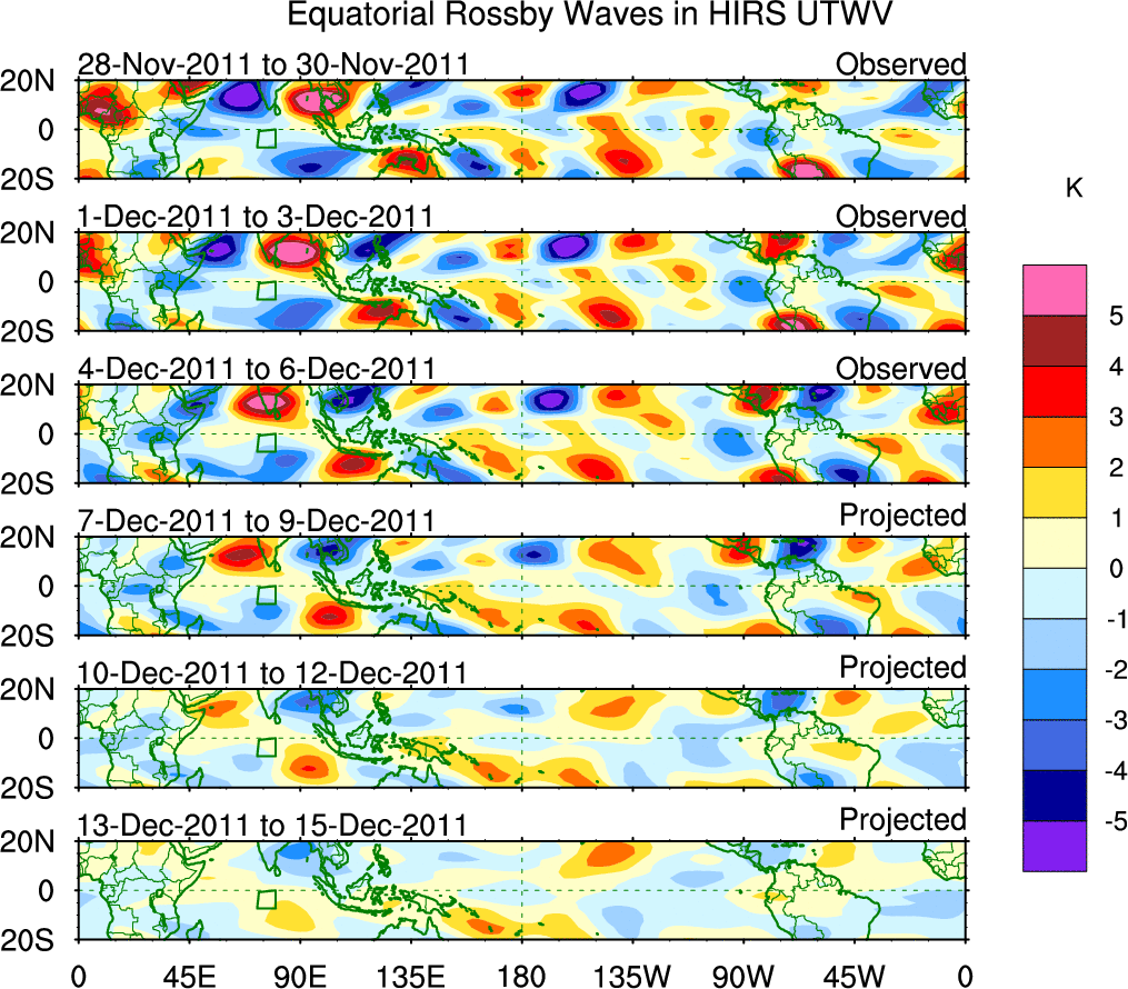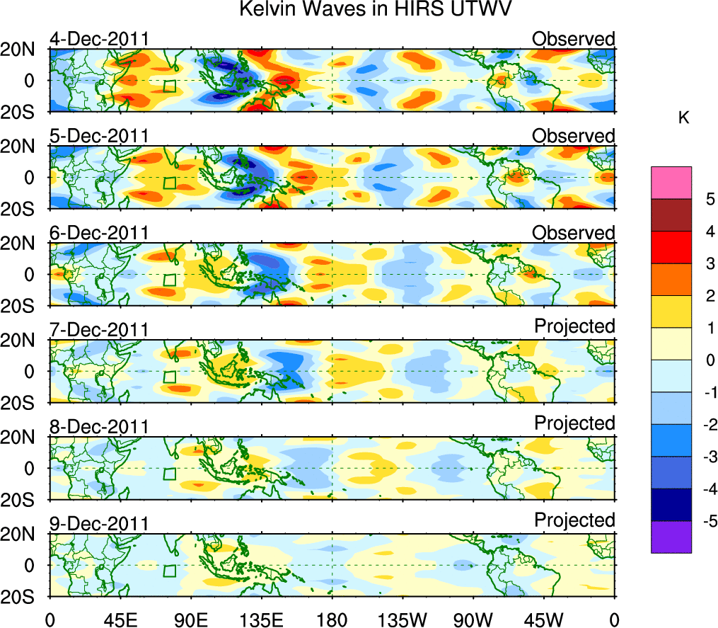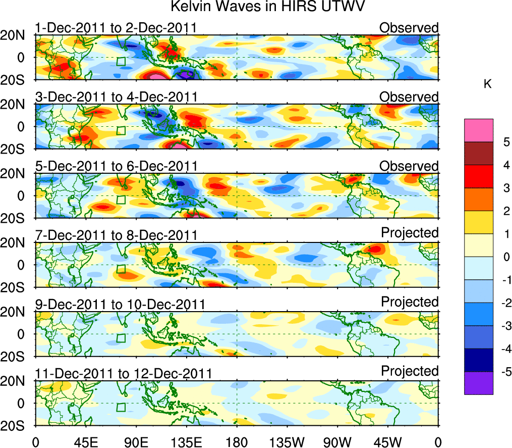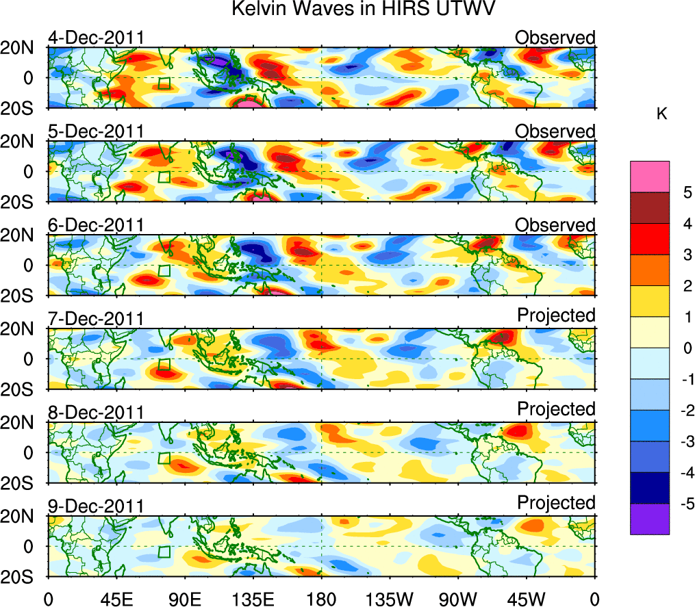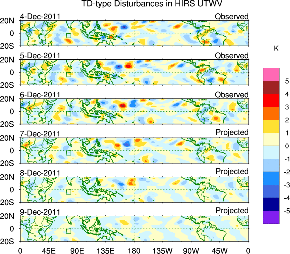 To identify tropical waves in near real-time, the OLR and UTWV data are filtered following Wheeler & Weickmann (2001 MWR). The daily anomalies are calculated using the first 3 harmonics of the seasonal cycle for 1979–2009. Missing values are then filled using linear interpolation in space and time. The most recent 365 days of anomalies are padded with 659 days of zeroes, and the result is filtered for each wave type.