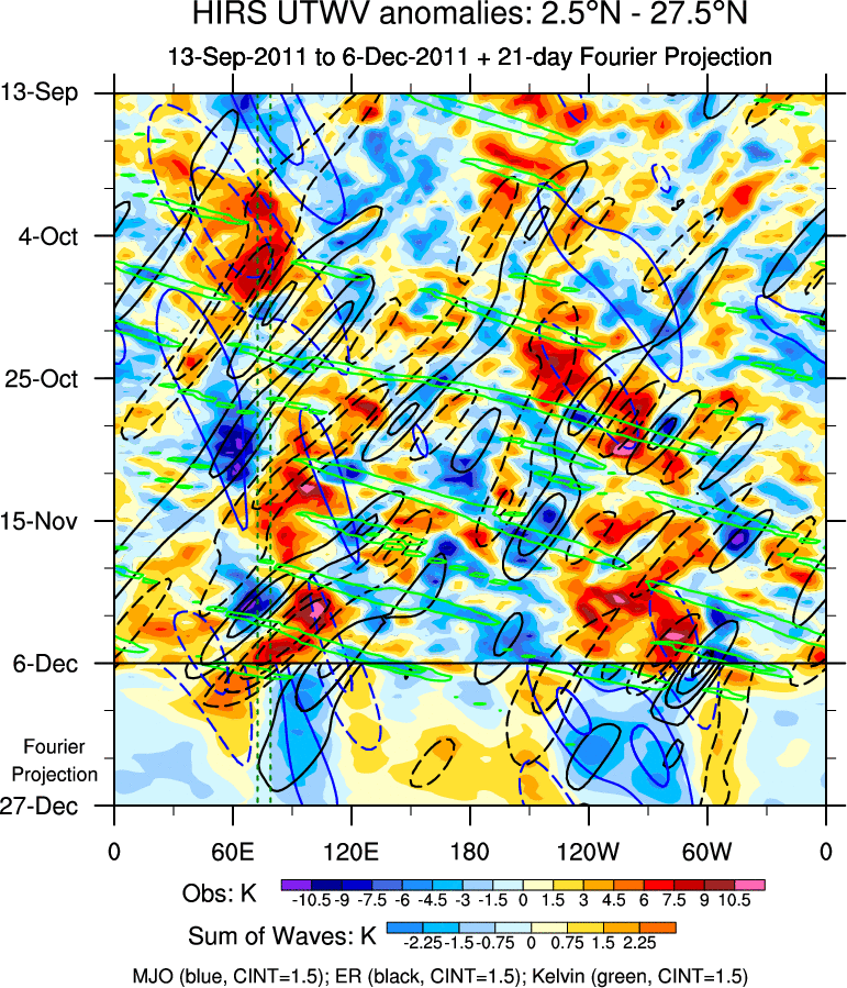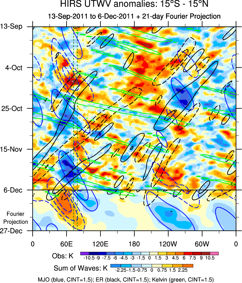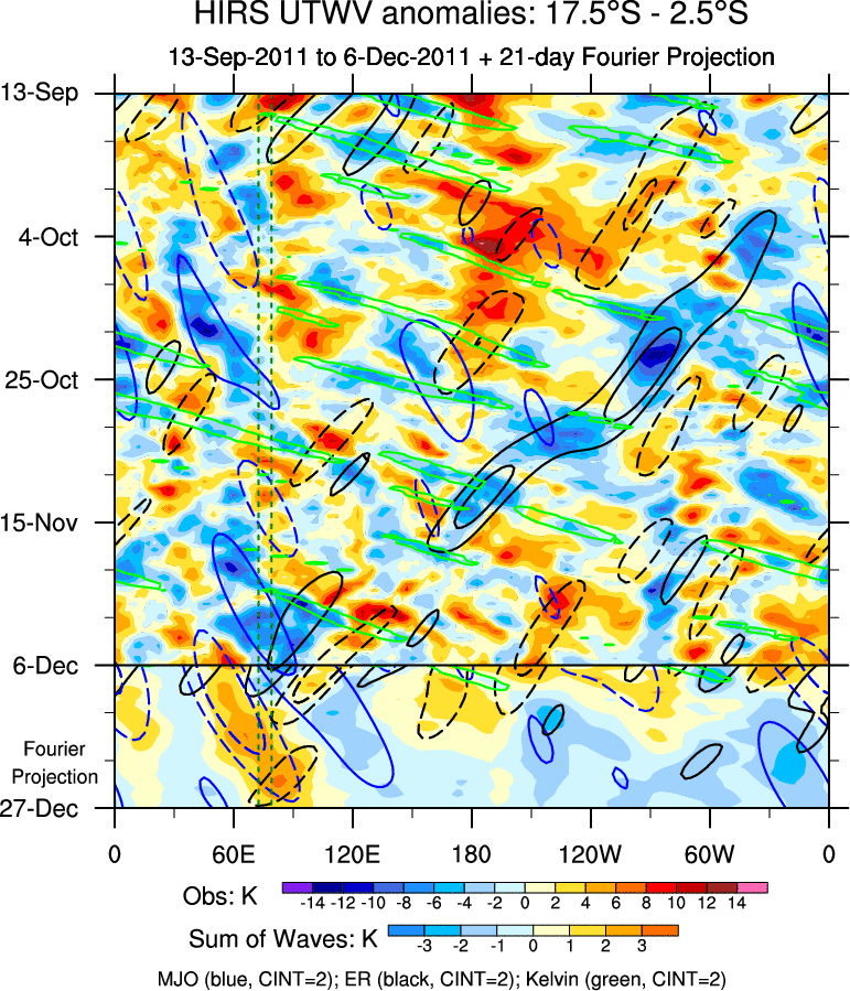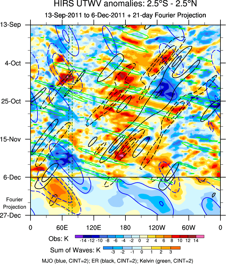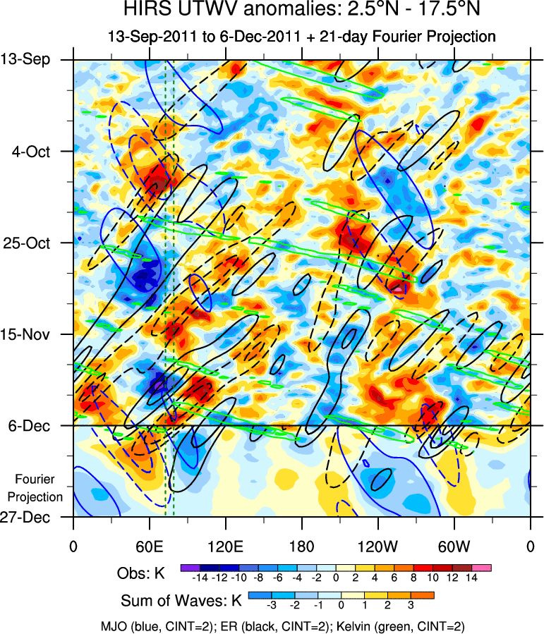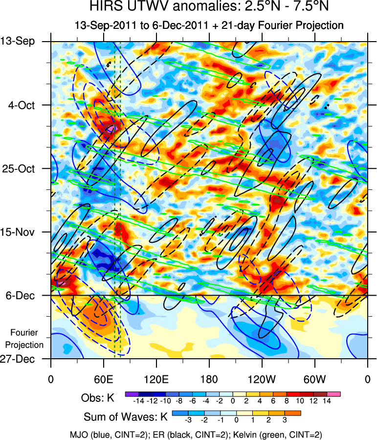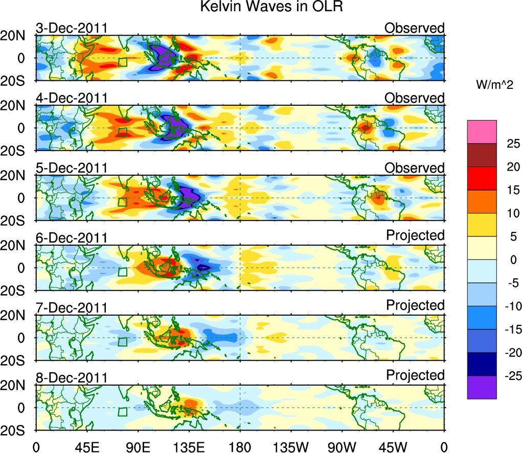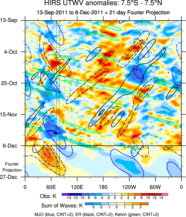 To identify tropical waves in near real-time, the OLR and UTWV data are filtered following Wheeler & Weickmann (2001 MWR). The daily anomalies are calculated using the first 3 harmonics of the seasonal cycle for 1979–2009. Missing values are then filled using linear interpolation in space and time. The most recent 365 days of anomalies are padded with 659 days of zeroes, and the result is filtered for each wave type.