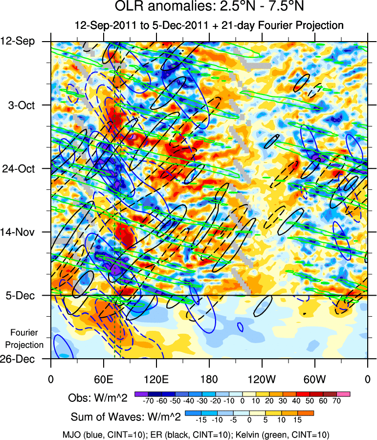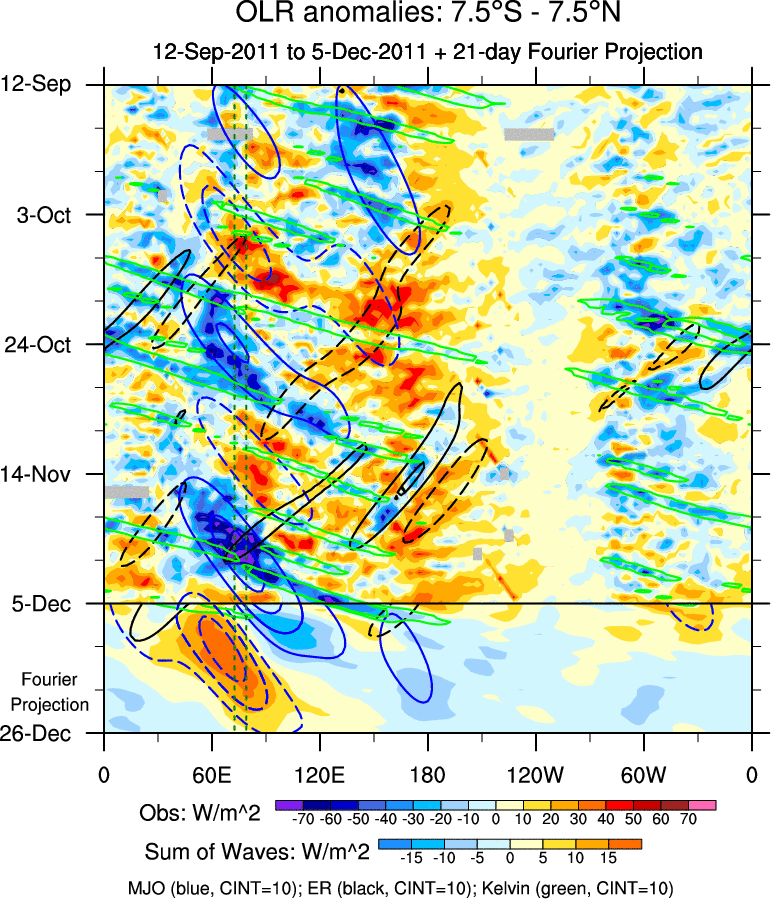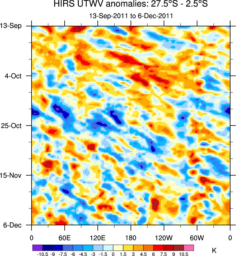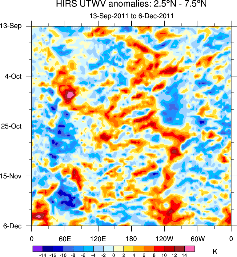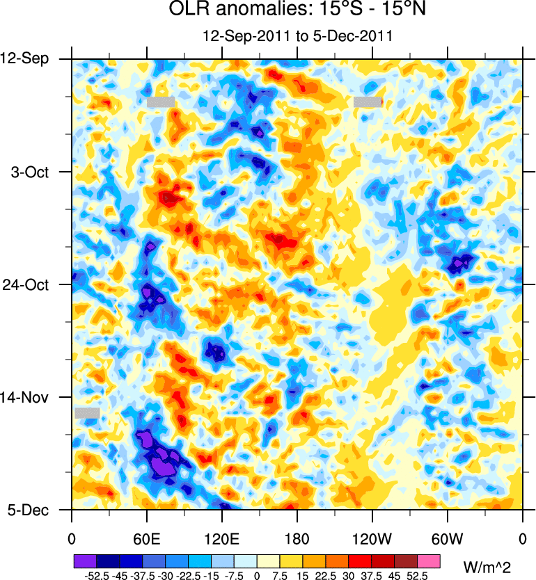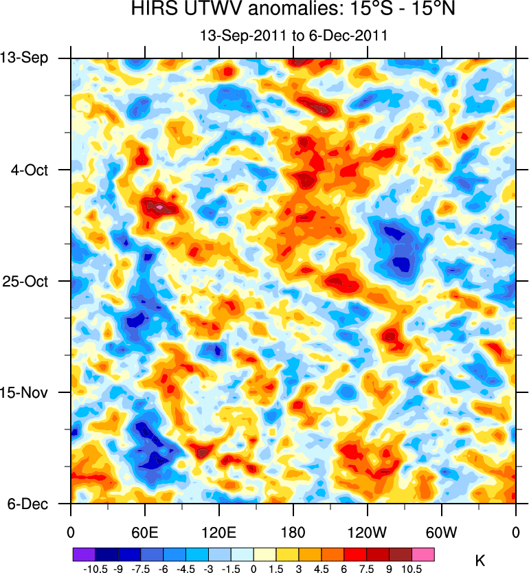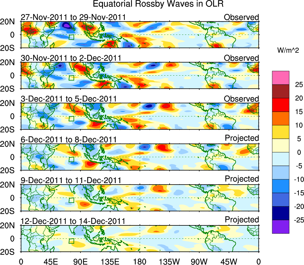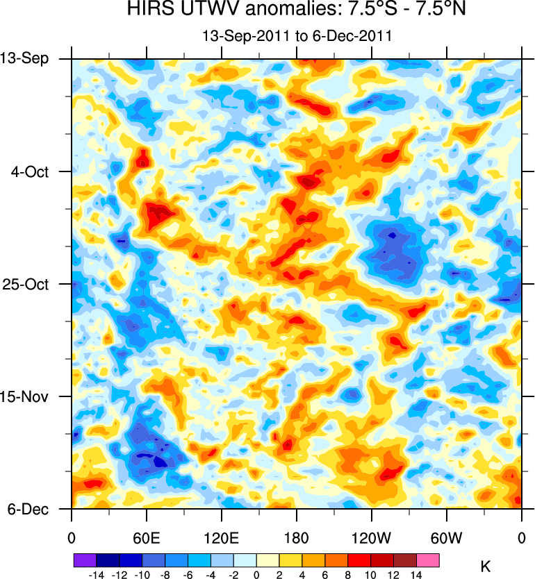To identify tropical waves in near real-time, the OLR and UTWV data are filtered following Wheeler & Weickmann (2001 MWR). The daily anomalies are calculated using the first 3 harmonics of the seasonal cycle for 1979–2009. Missing values are then filled using linear interpolation in space and time. The most recent 365 days of anomalies are padded with 659 days of zeroes, and the result is filtered for each wave type.