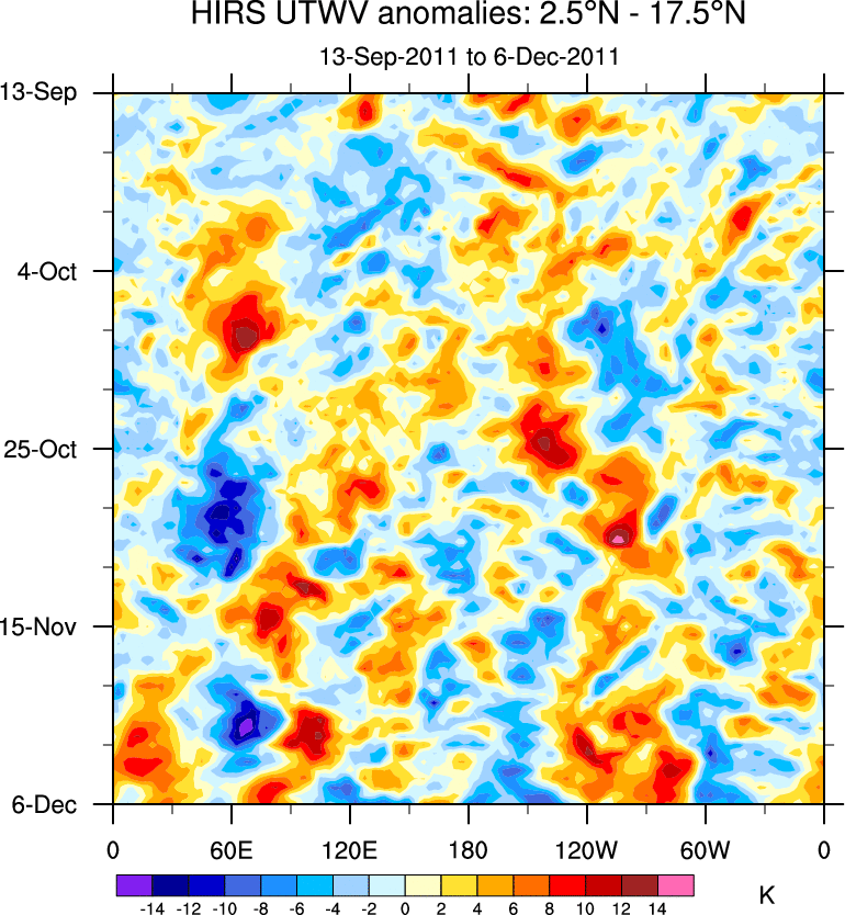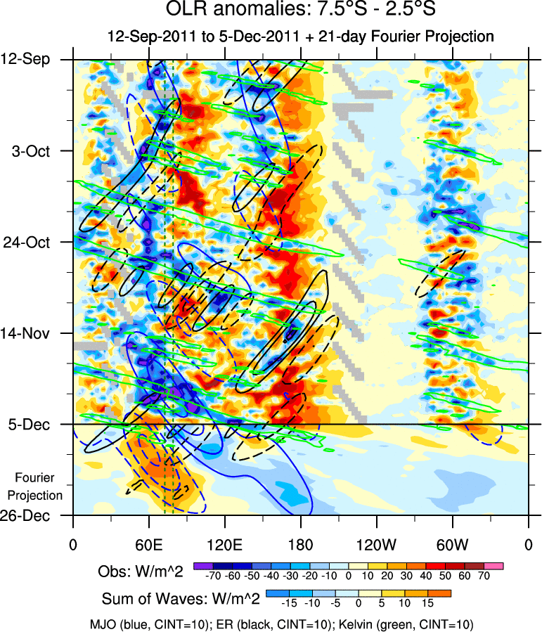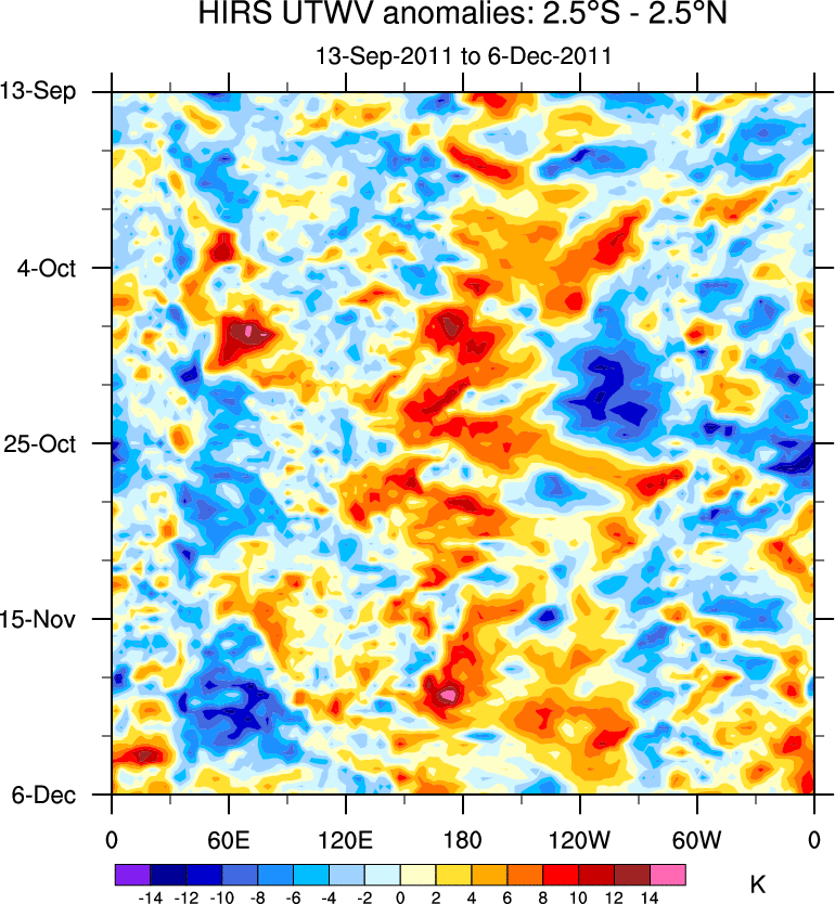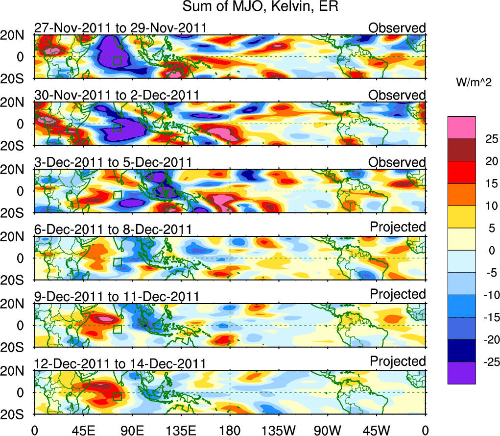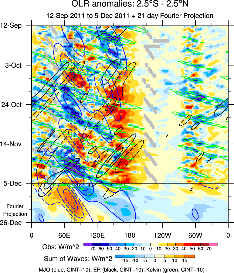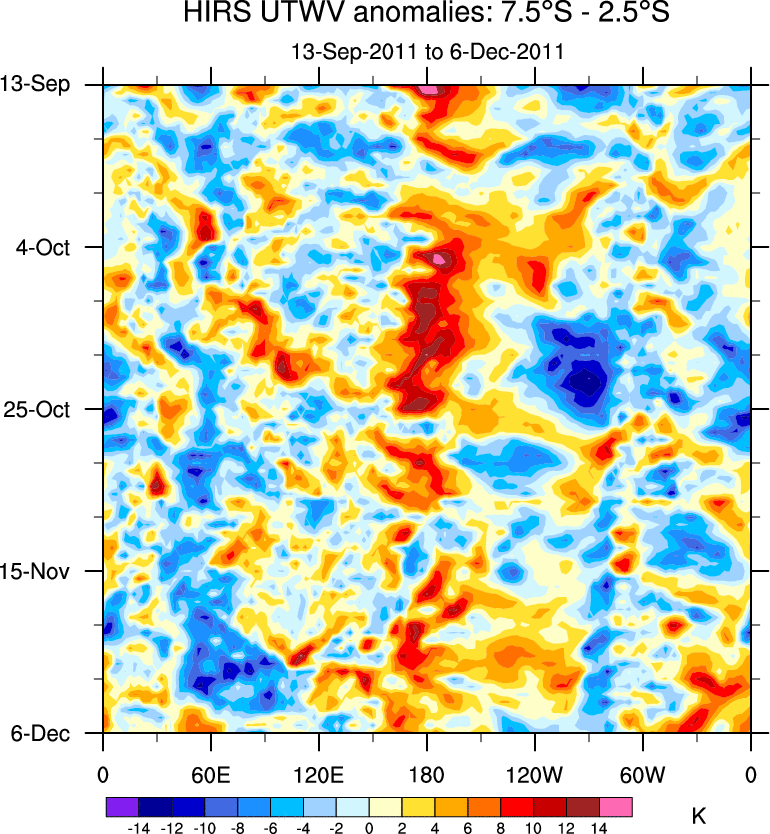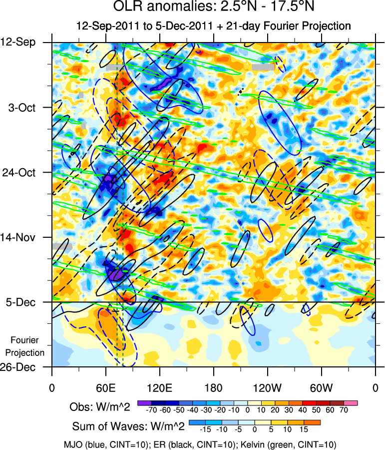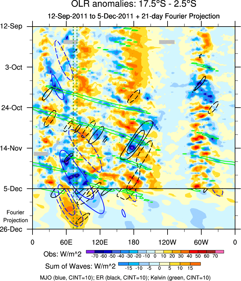 To identify tropical waves in near real-time, the OLR and UTWV data are filtered following Wheeler & Weickmann (2001 MWR). The daily anomalies are calculated using the first 3 harmonics of the seasonal cycle for 1979–2009. Missing values are then filled using linear interpolation in space and time. The most recent 365 days of anomalies are padded with 659 days of zeroes, and the result is filtered for each wave type.