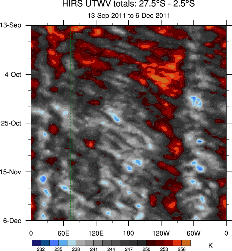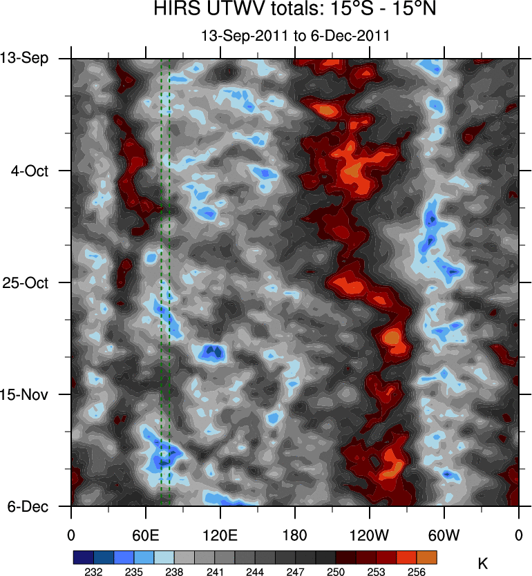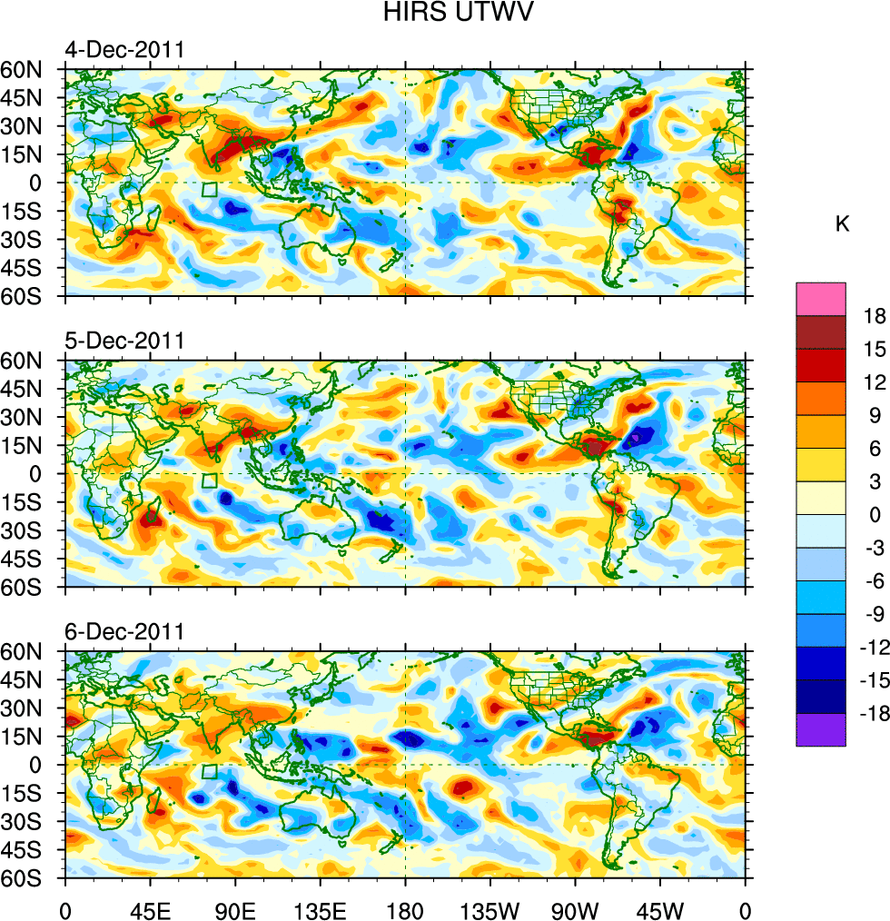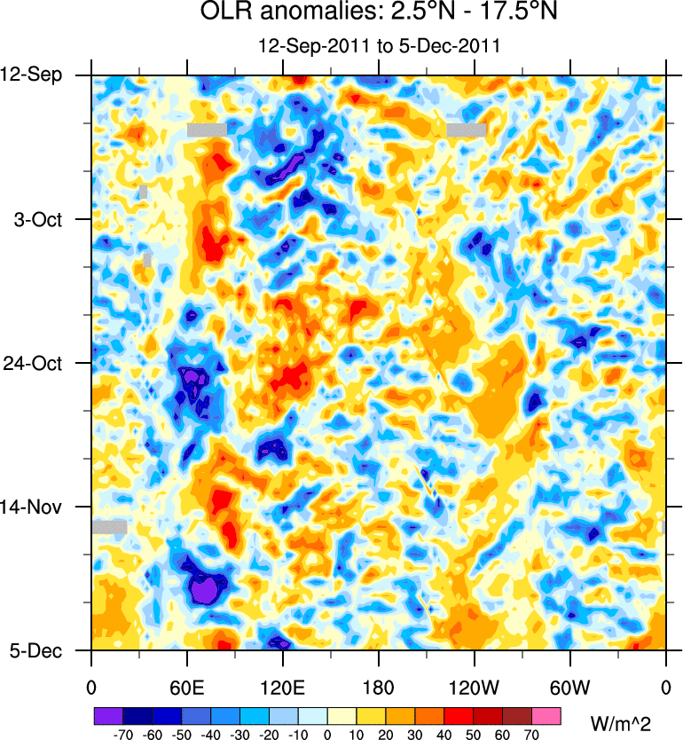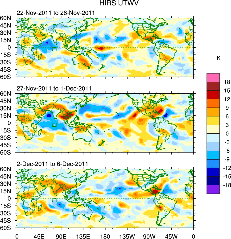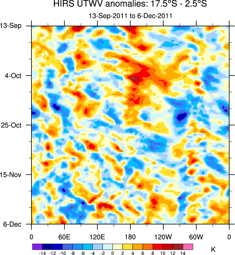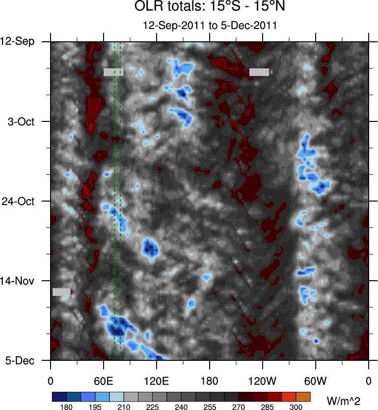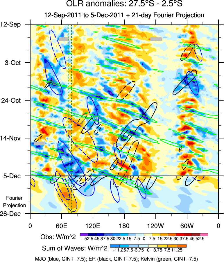To identify tropical waves in near real-time, the OLR and UTWV data are filtered following Wheeler & Weickmann (2001 MWR). The daily anomalies are calculated using the first 3 harmonics of the seasonal cycle for 1979–2009. Missing values are then filled using linear interpolation in space and time. The most recent 365 days of anomalies are padded with 659 days of zeroes, and the result is filtered for each wave type.