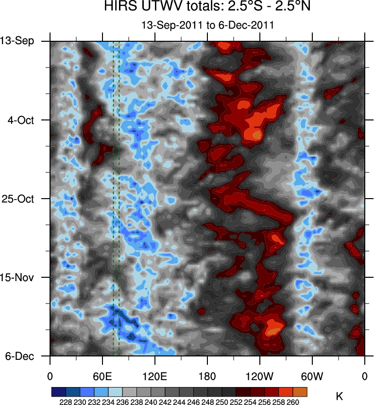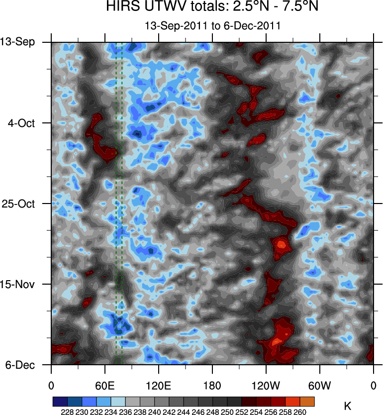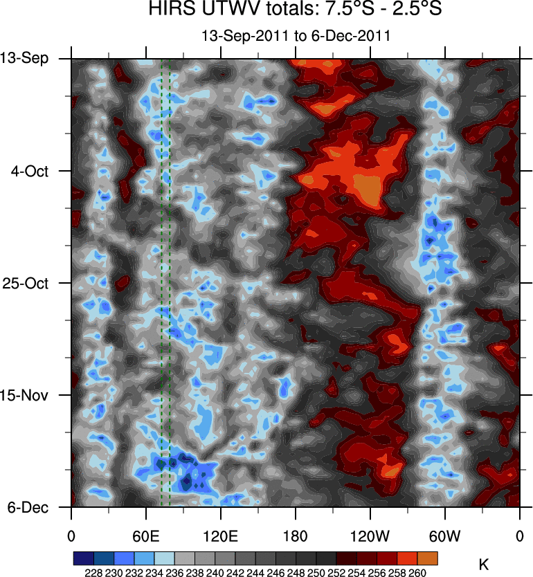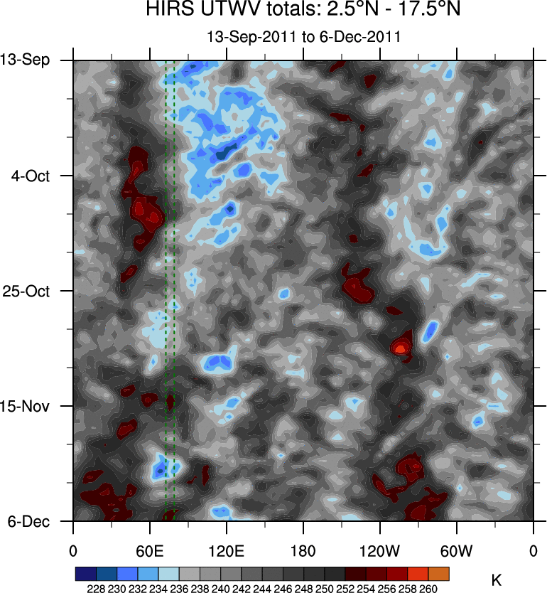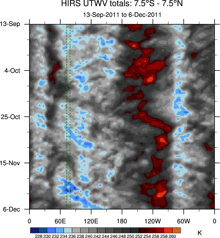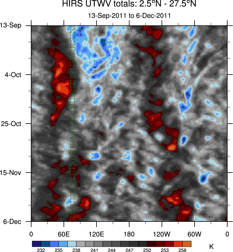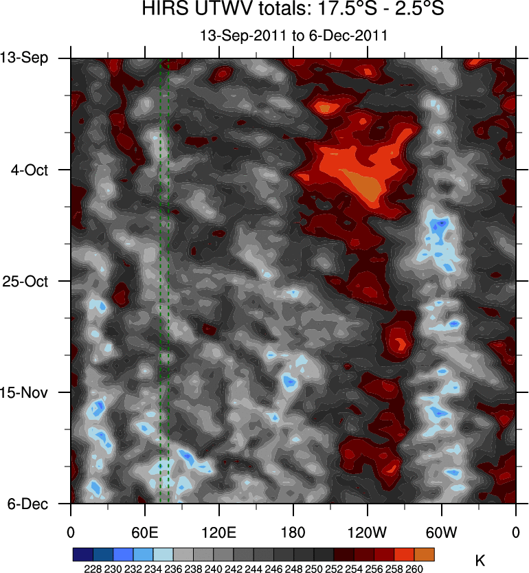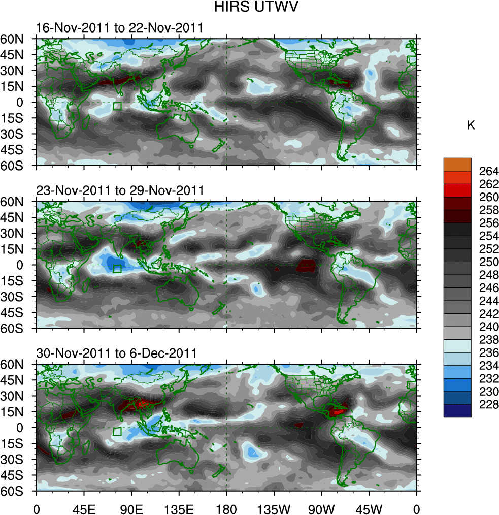 To identify tropical waves in near real-time, the OLR and UTWV data are filtered following Wheeler & Weickmann (2001 MWR). The daily anomalies are calculated using the first 3 harmonics of the seasonal cycle for 1979–2009. Missing values are then filled using linear interpolation in space and time. The most recent 365 days of anomalies are padded with 659 days of zeroes, and the result is filtered for each wave type.