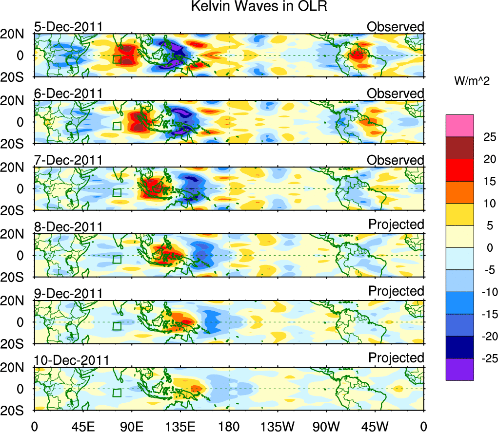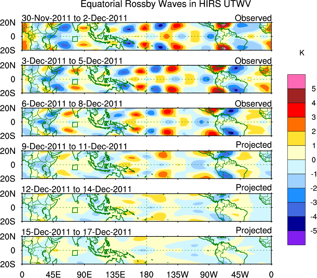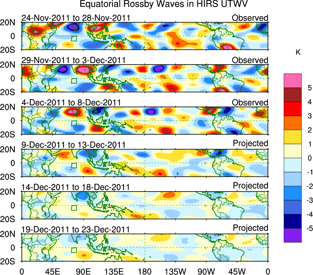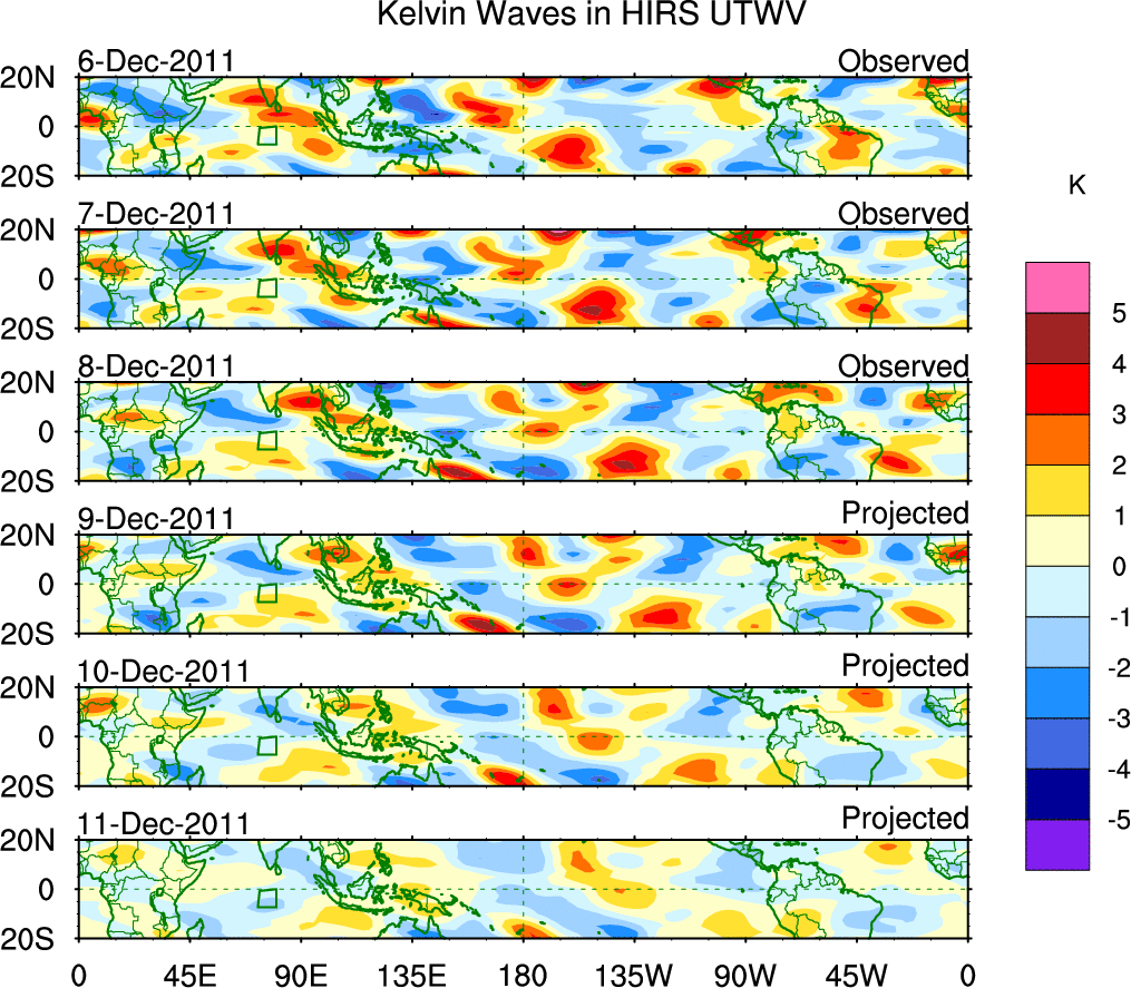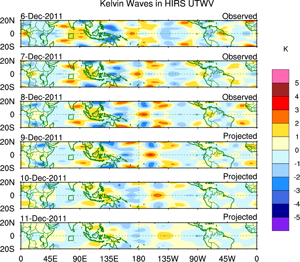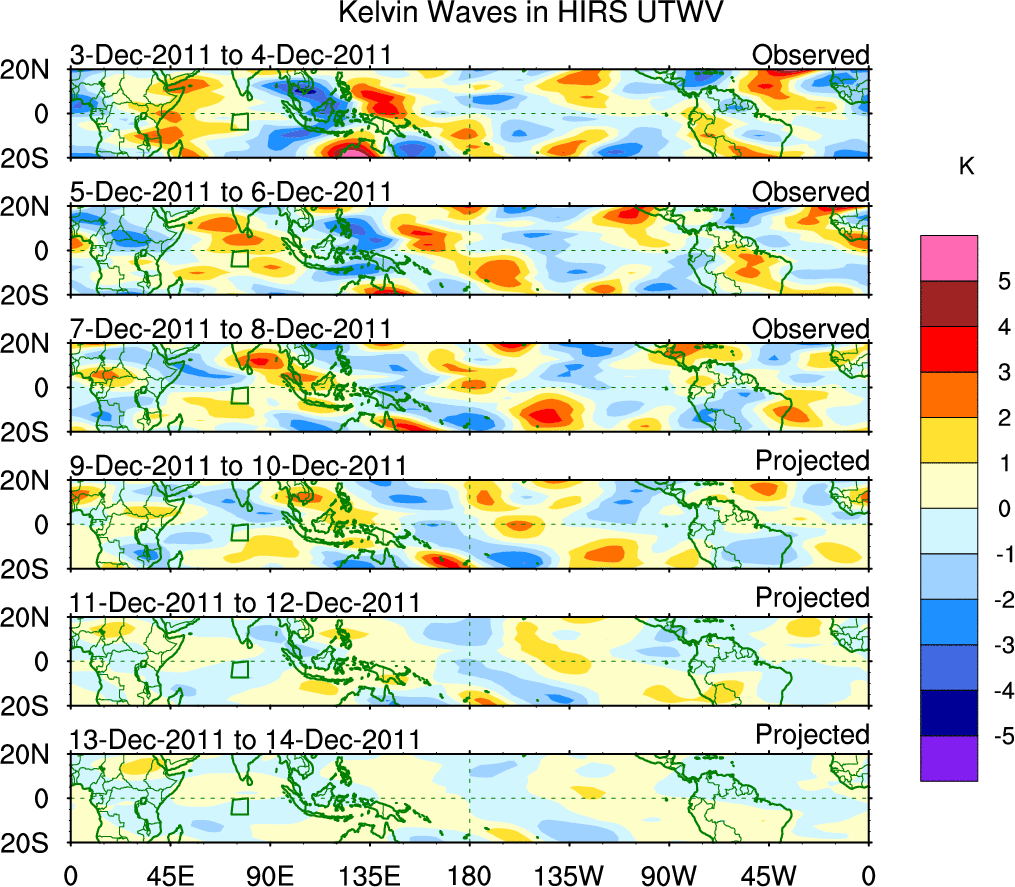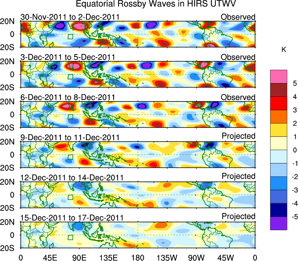 To identify tropical waves in near real-time, the OLR and UTWV data are filtered following Wheeler & Weickmann (2001 MWR). The daily anomalies are calculated using the first 3 harmonics of the seasonal cycle for 1979–2009. Missing values are then filled using linear interpolation in space and time. The most recent 365 days of anomalies are padded with 659 days of zeroes, and the result is filtered for each wave type.
