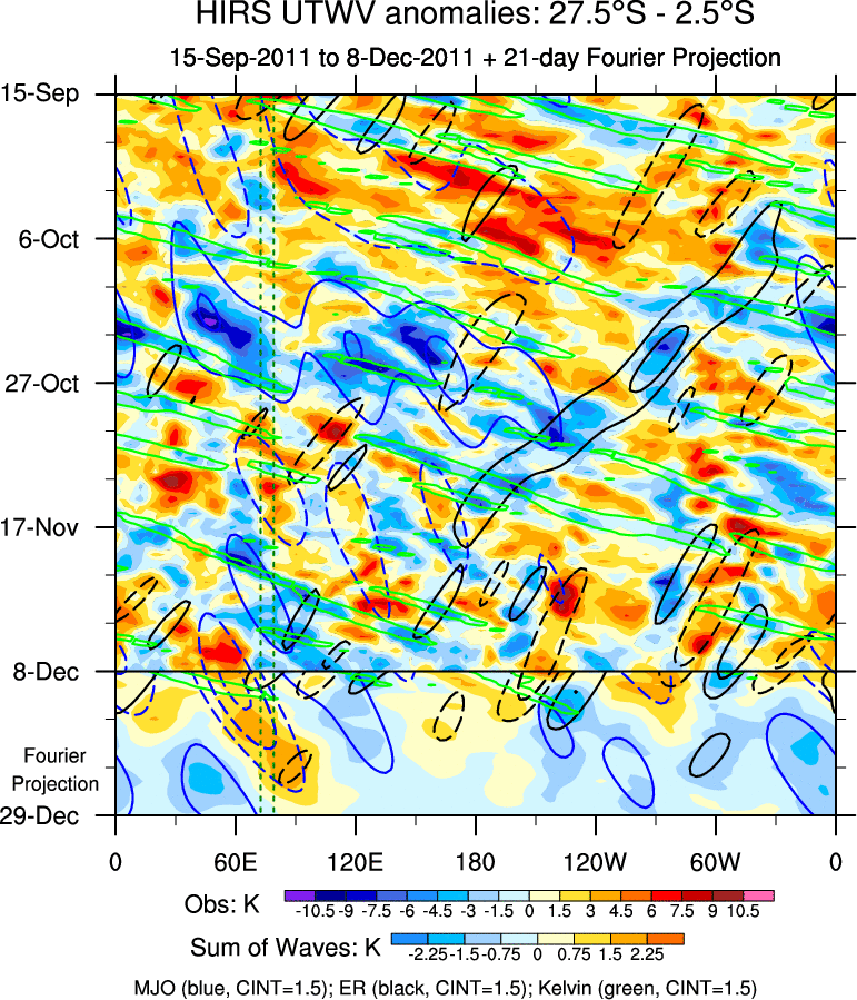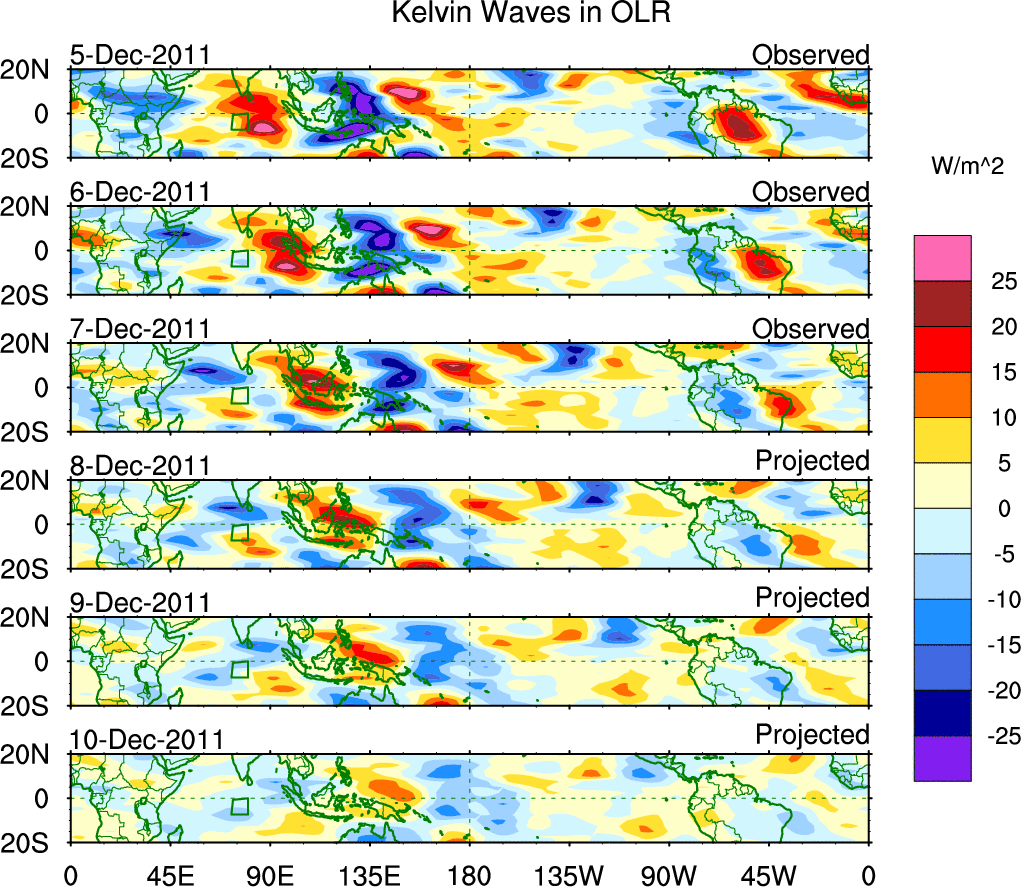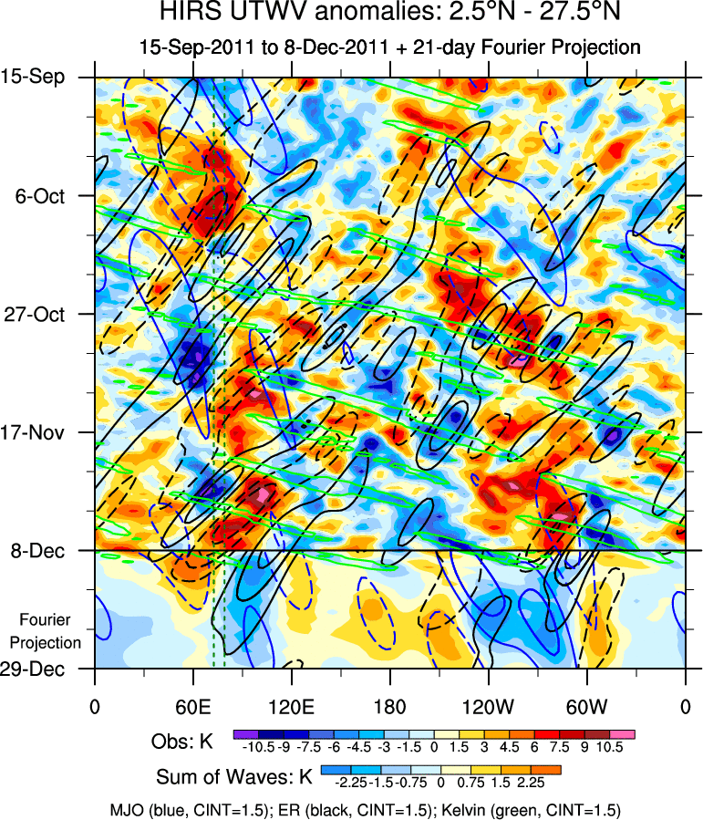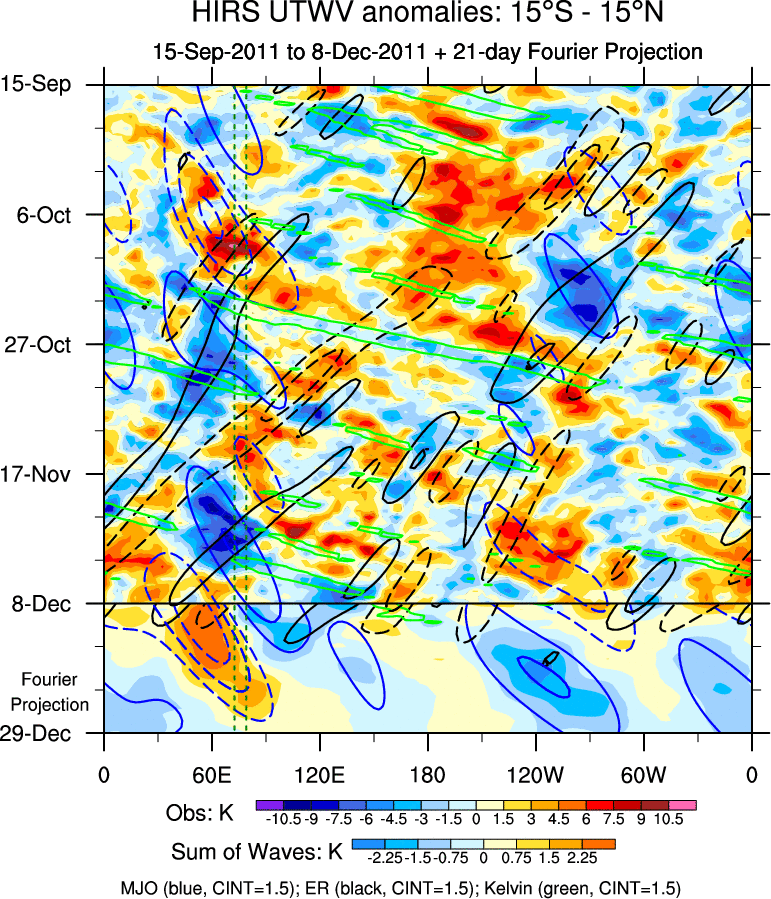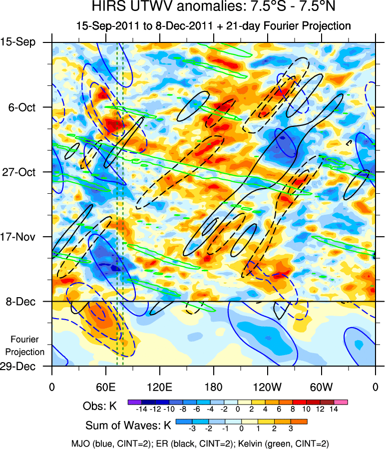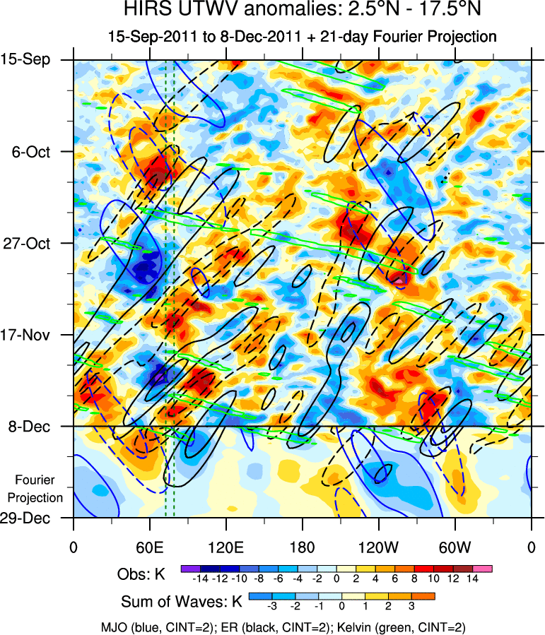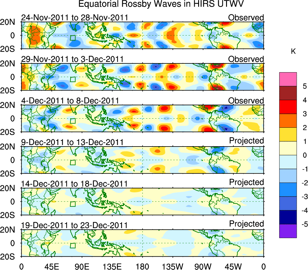 To identify tropical waves in near real-time, the OLR and UTWV data are filtered following Wheeler & Weickmann (2001 MWR). The daily anomalies are calculated using the first 3 harmonics of the seasonal cycle for 1979–2009. Missing values are then filled using linear interpolation in space and time. The most recent 365 days of anomalies are padded with 659 days of zeroes, and the result is filtered for each wave type.