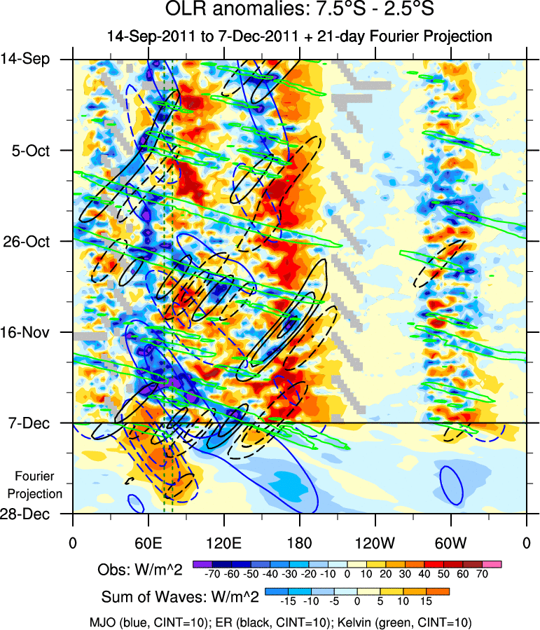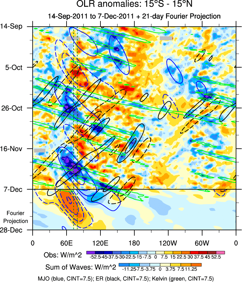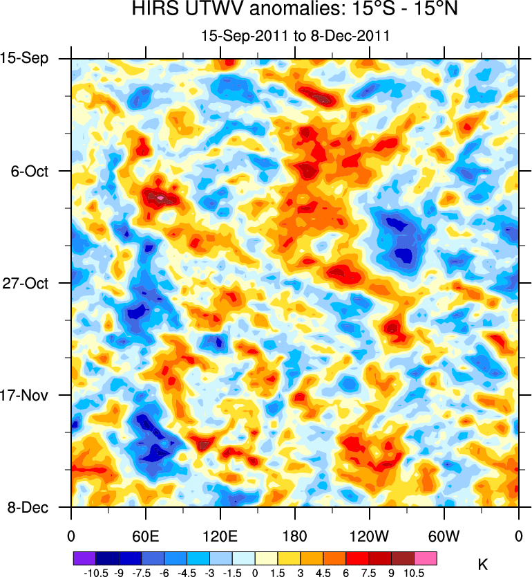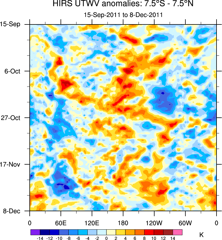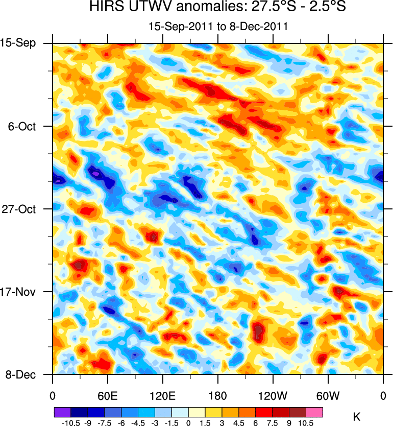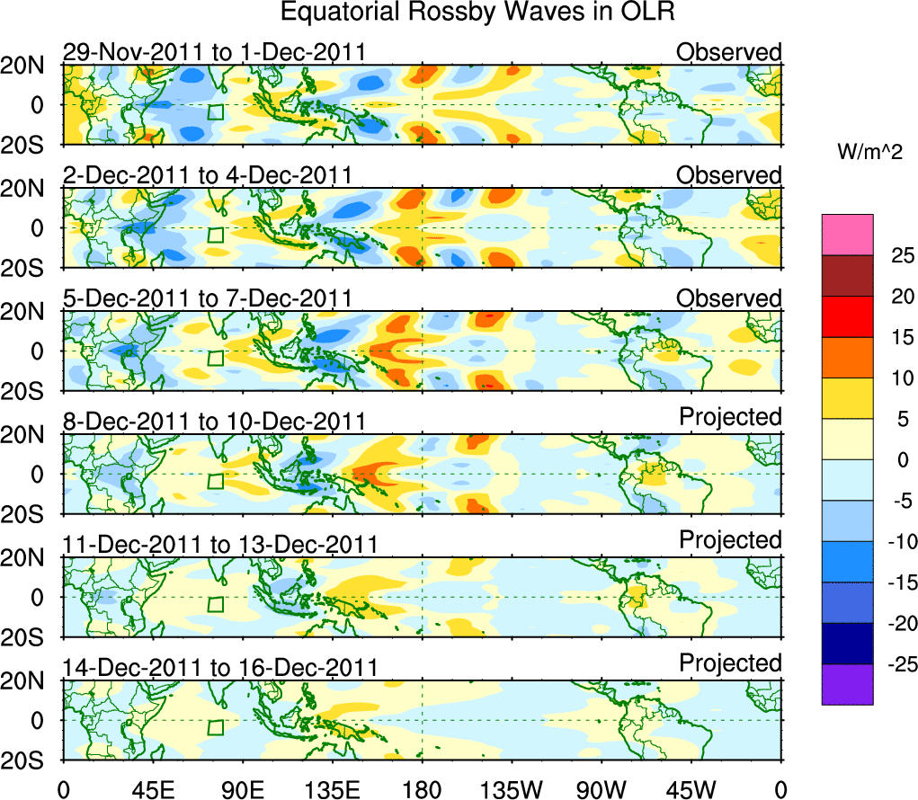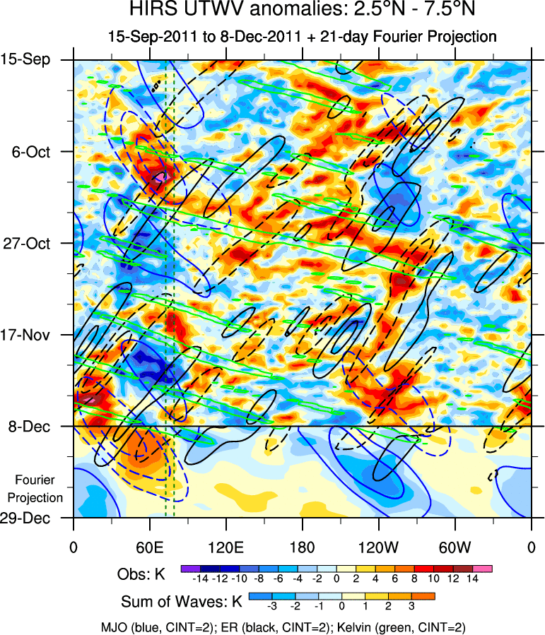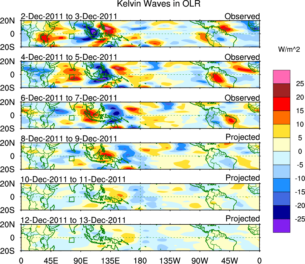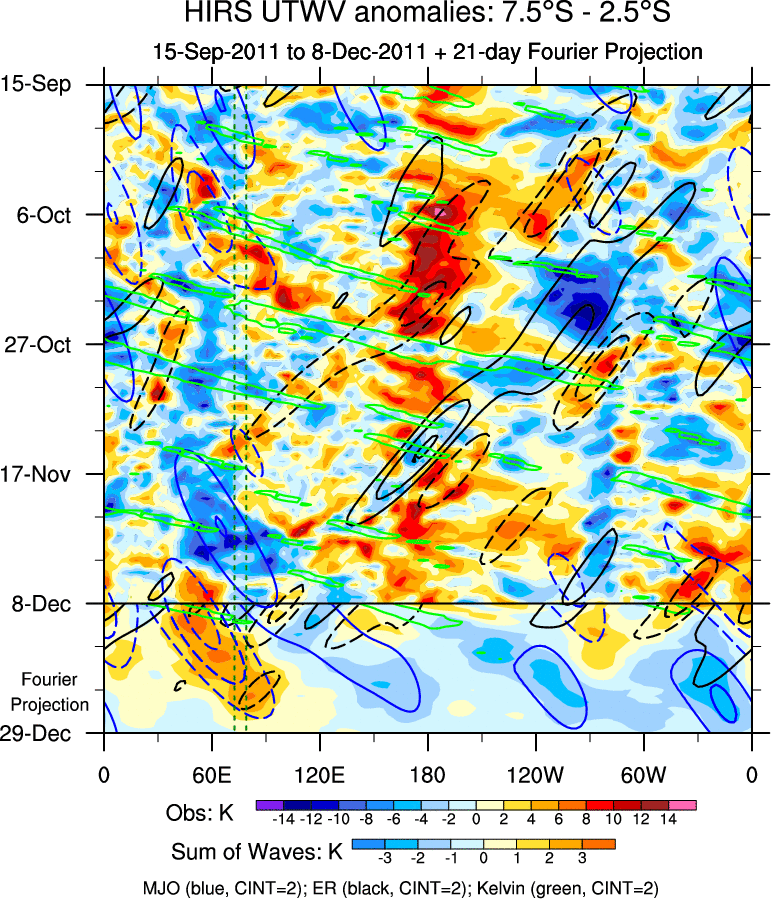 To identify tropical waves in near real-time, the OLR and UTWV data are filtered following Wheeler & Weickmann (2001 MWR). The daily anomalies are calculated using the first 3 harmonics of the seasonal cycle for 1979–2009. Missing values are then filled using linear interpolation in space and time. The most recent 365 days of anomalies are padded with 659 days of zeroes, and the result is filtered for each wave type.