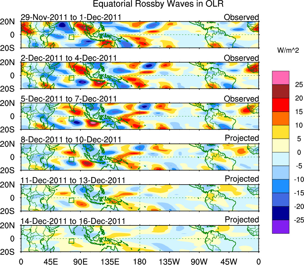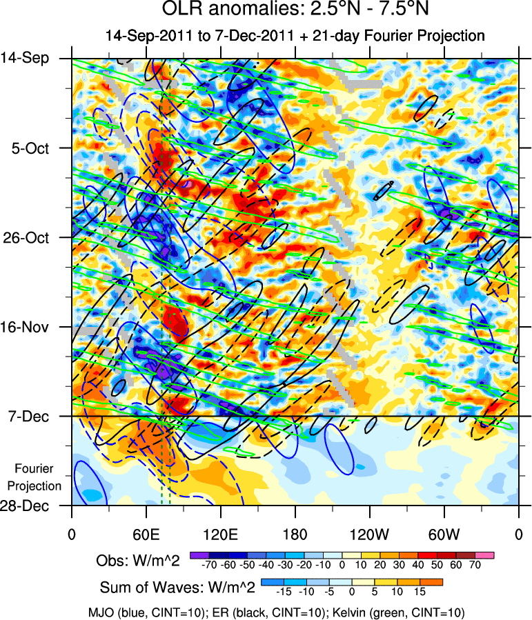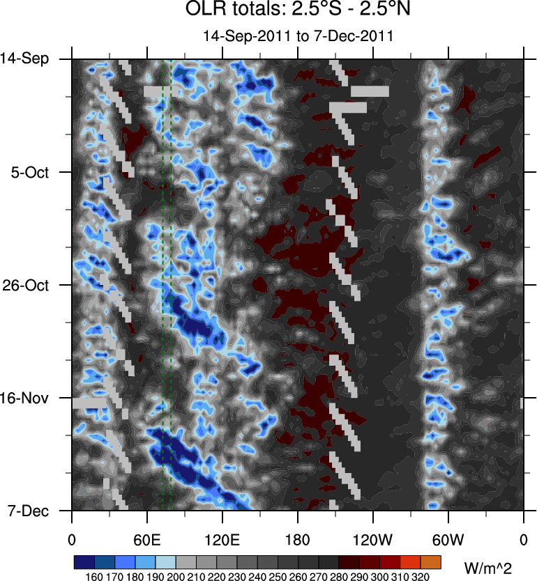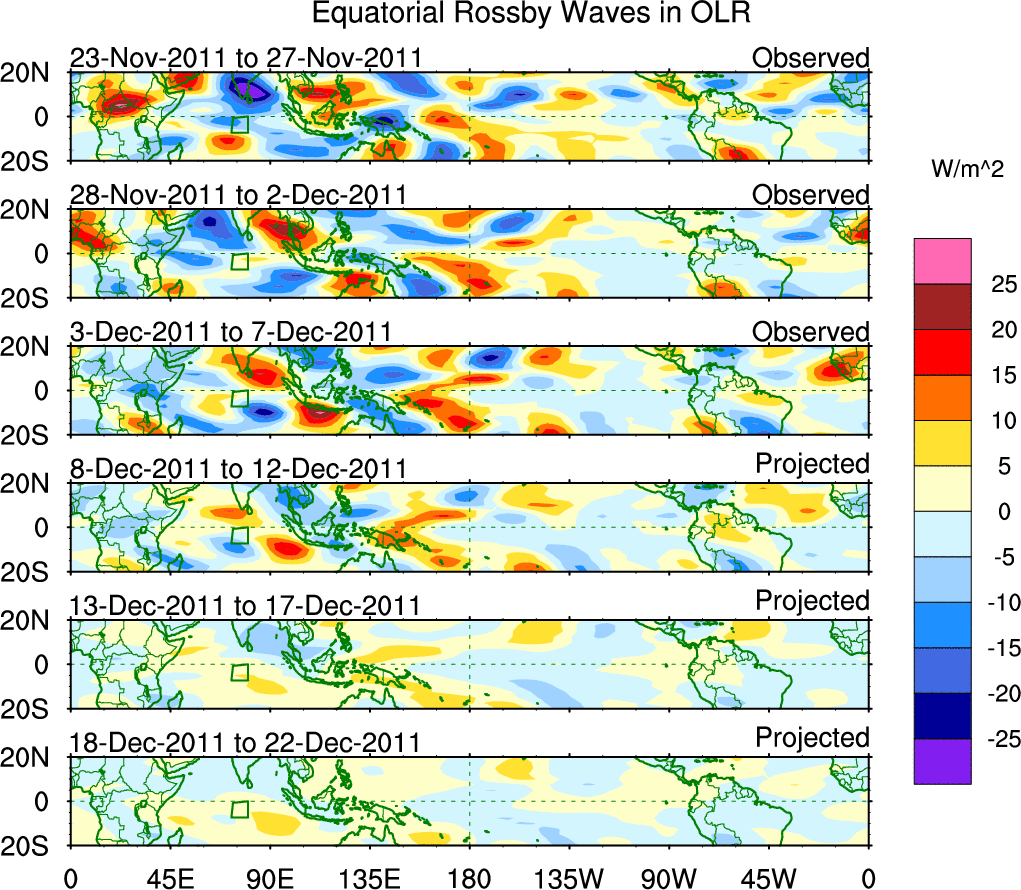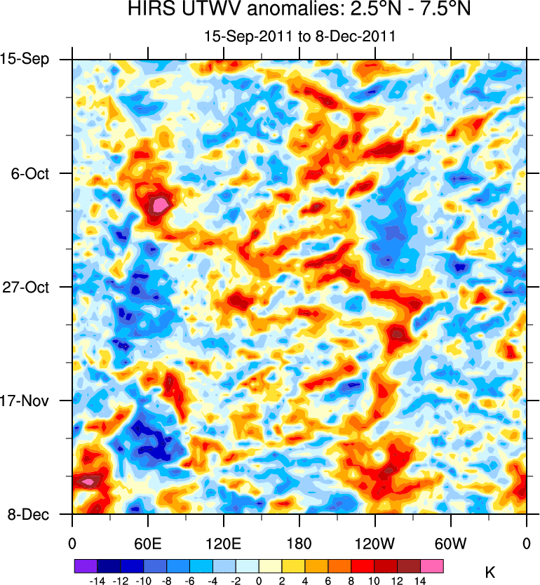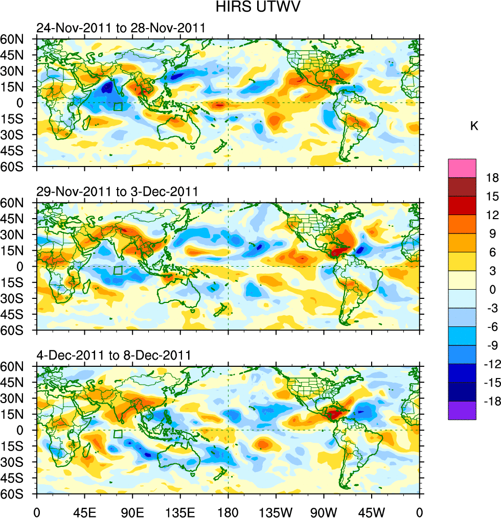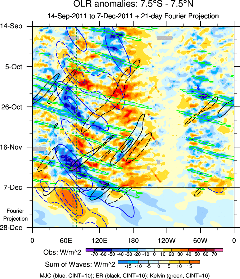 To identify tropical waves in near real-time, the OLR and UTWV data are filtered following Wheeler & Weickmann (2001 MWR). The daily anomalies are calculated using the first 3 harmonics of the seasonal cycle for 1979–2009. Missing values are then filled using linear interpolation in space and time. The most recent 365 days of anomalies are padded with 659 days of zeroes, and the result is filtered for each wave type.