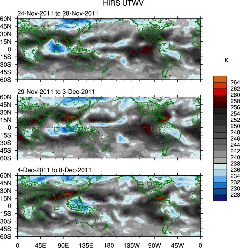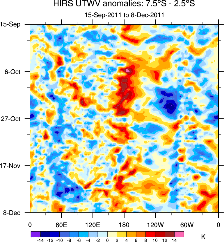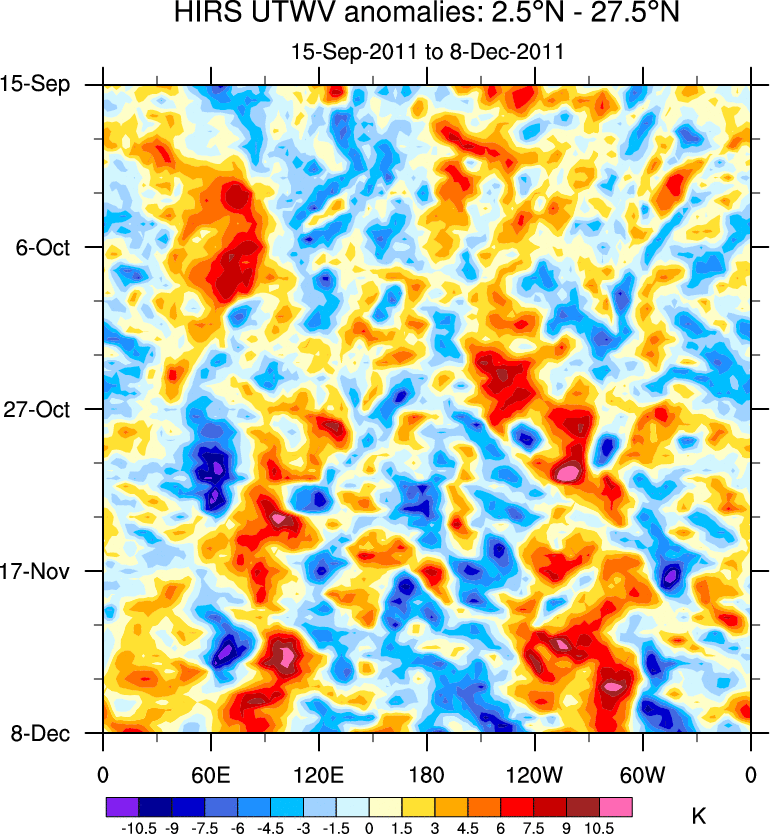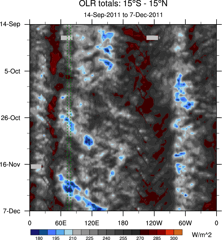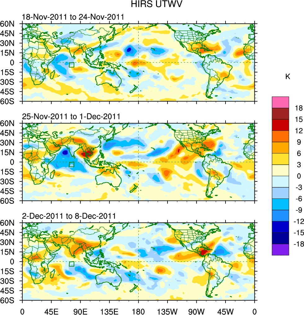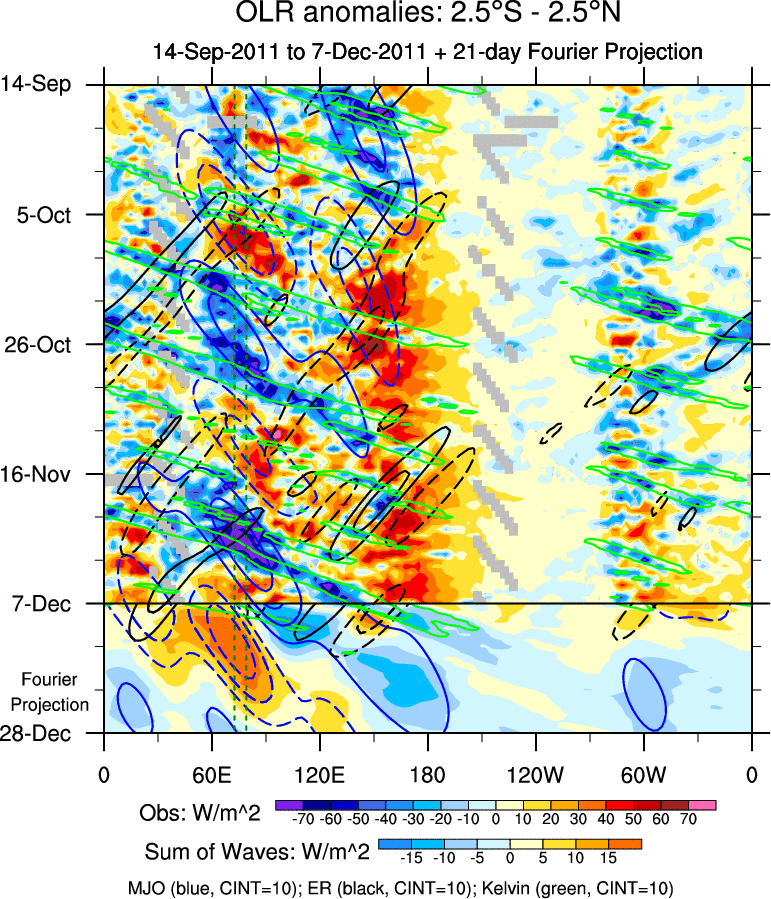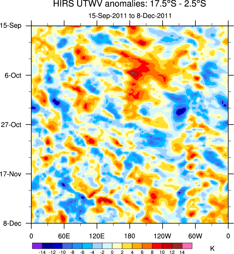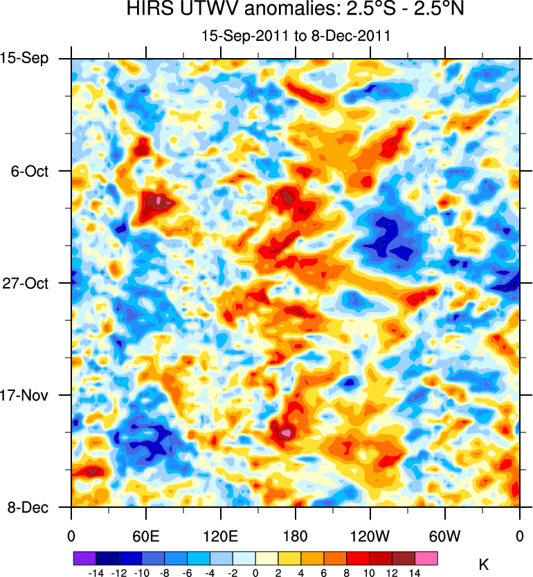 To identify tropical waves in near real-time, the OLR and UTWV data are filtered following Wheeler & Weickmann (2001 MWR). The daily anomalies are calculated using the first 3 harmonics of the seasonal cycle for 1979–2009. Missing values are then filled using linear interpolation in space and time. The most recent 365 days of anomalies are padded with 659 days of zeroes, and the result is filtered for each wave type.