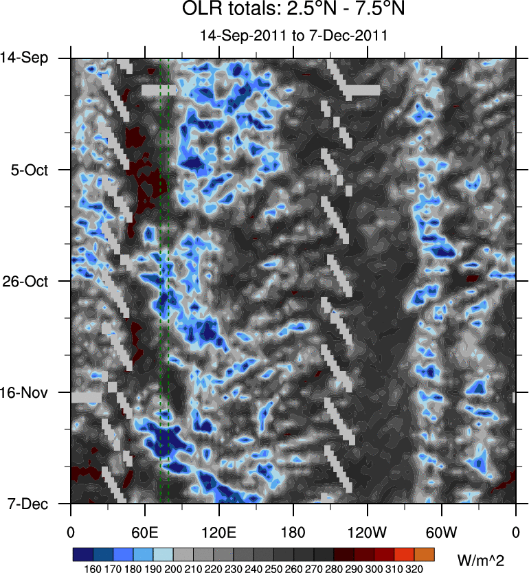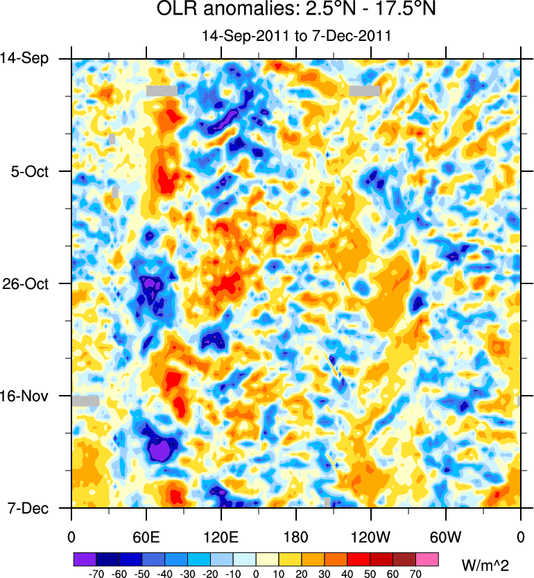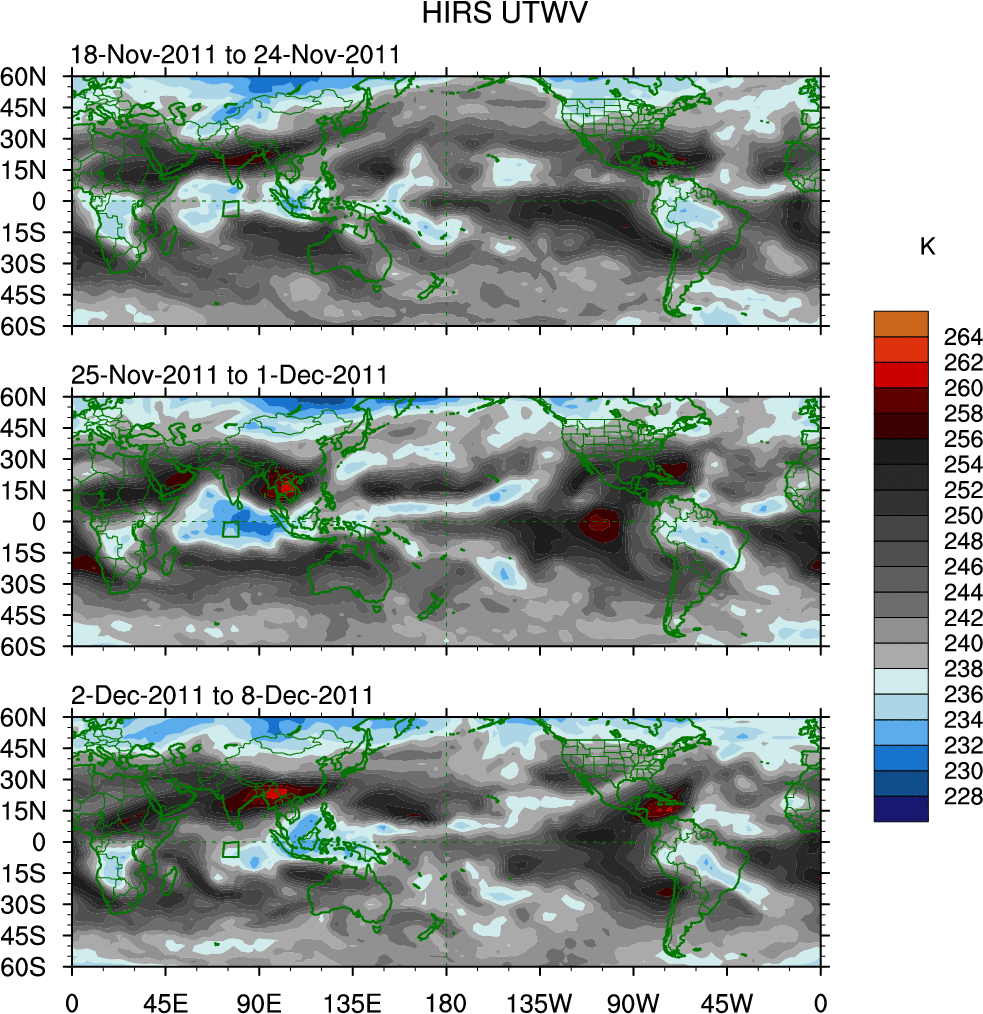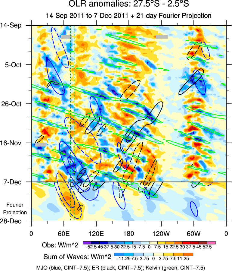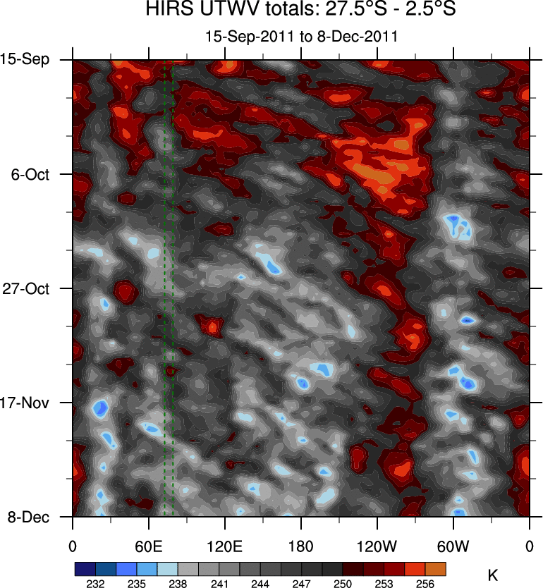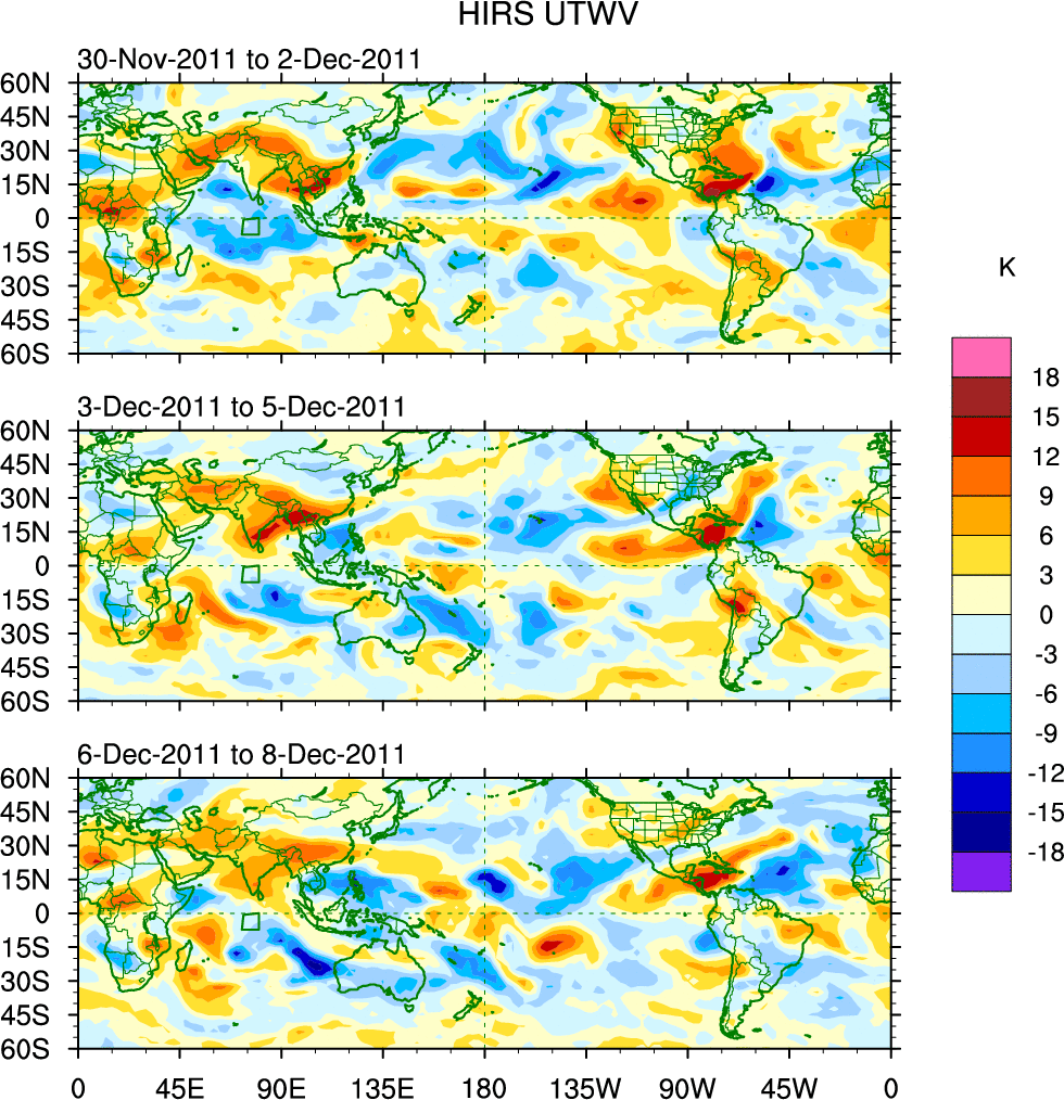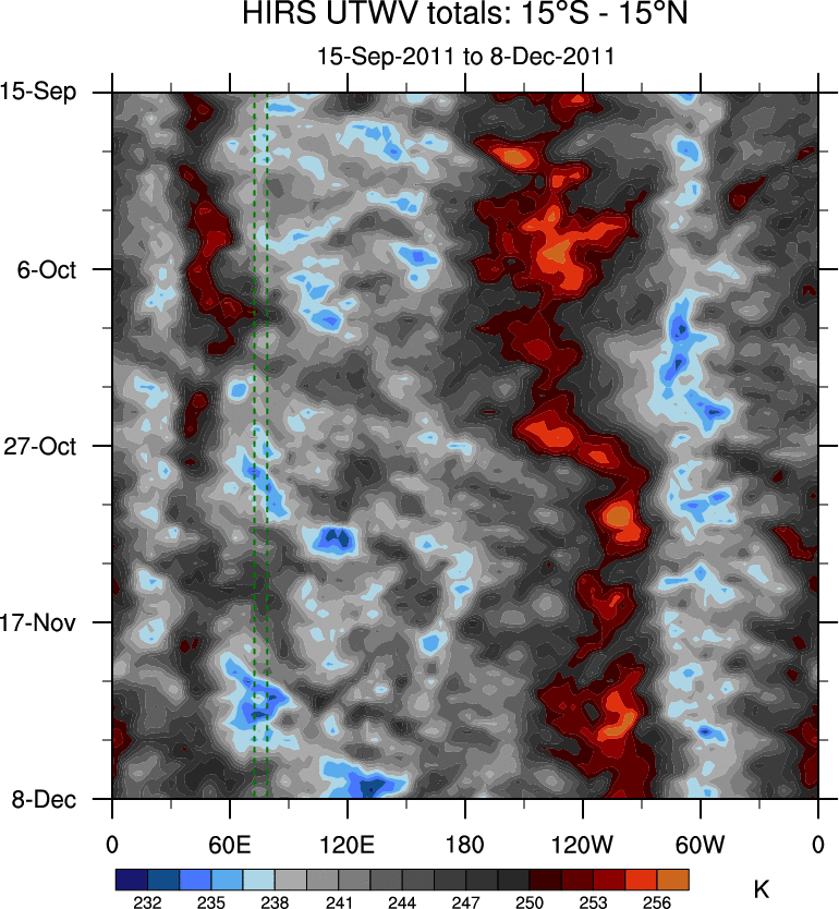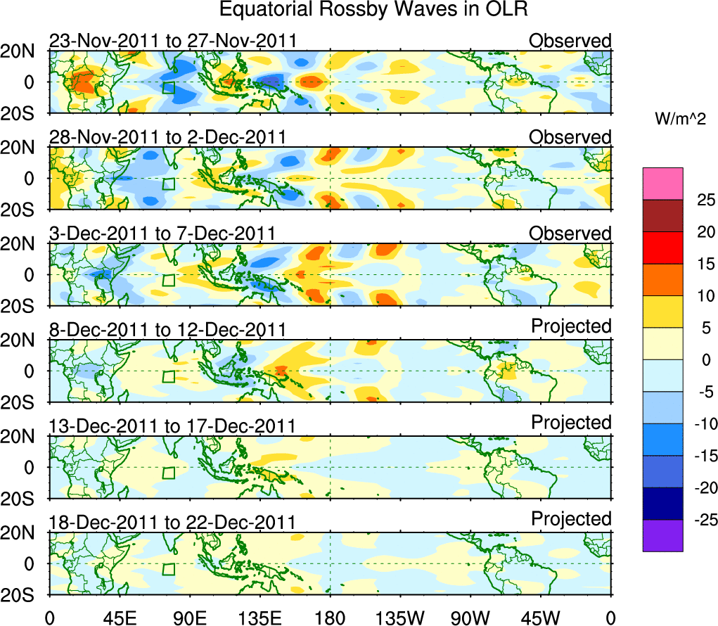 To identify tropical waves in near real-time, the OLR and UTWV data are filtered following Wheeler & Weickmann (2001 MWR). The daily anomalies are calculated using the first 3 harmonics of the seasonal cycle for 1979–2009. Missing values are then filled using linear interpolation in space and time. The most recent 365 days of anomalies are padded with 659 days of zeroes, and the result is filtered for each wave type.