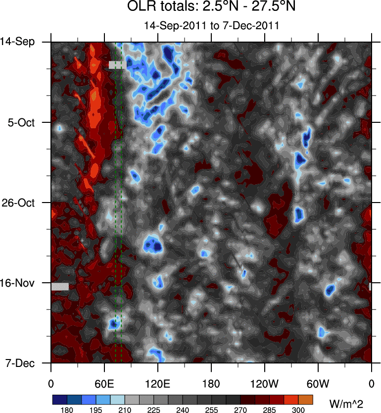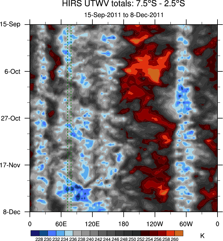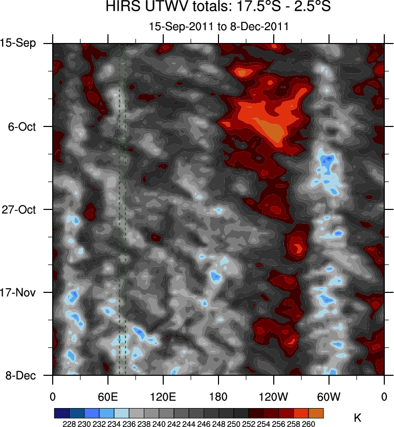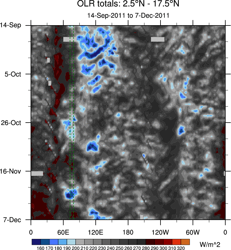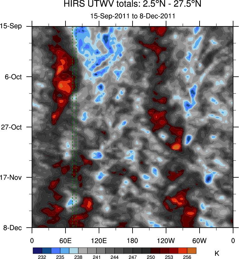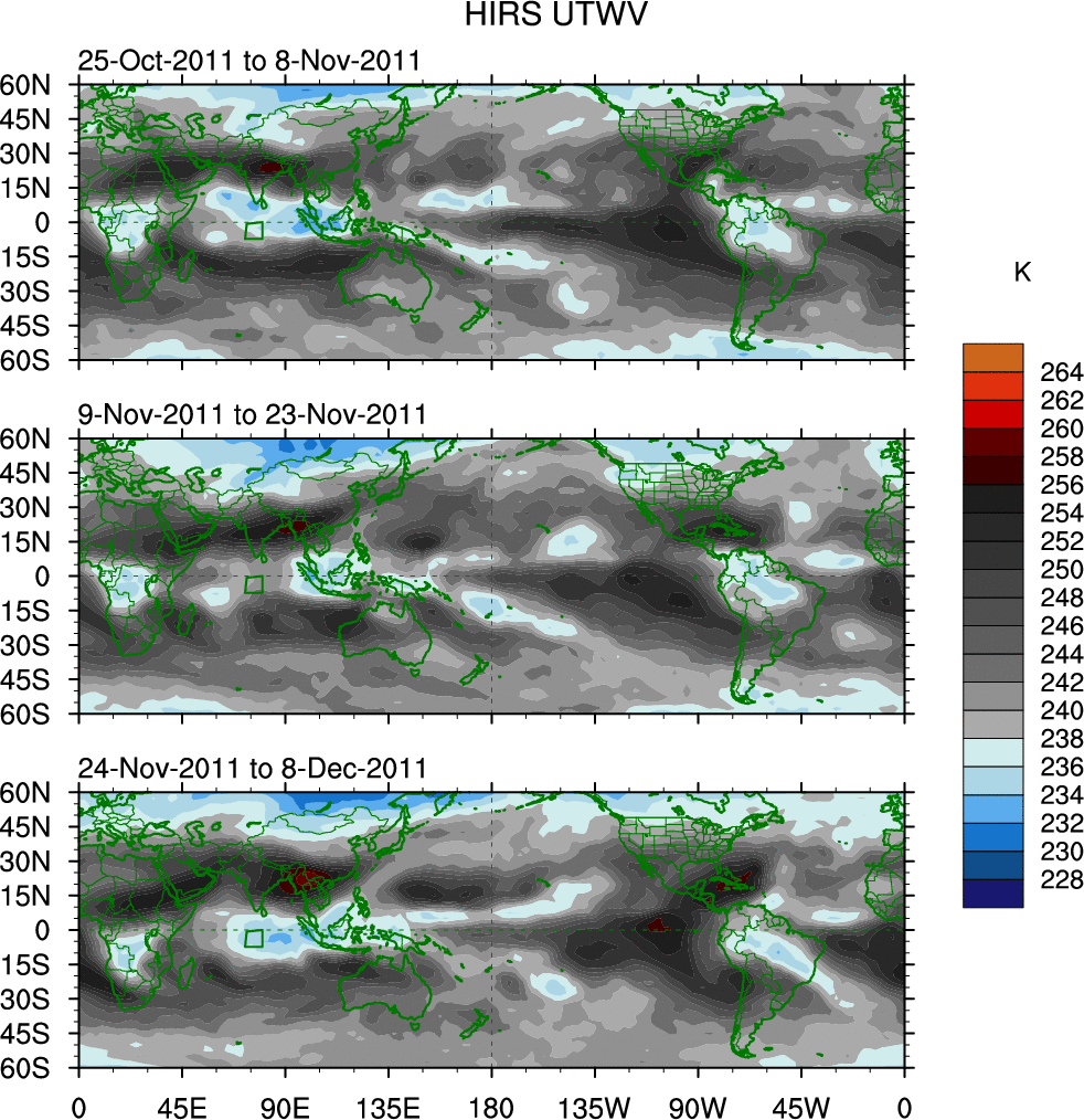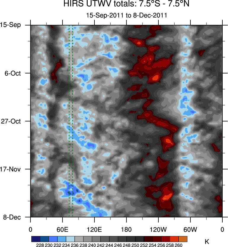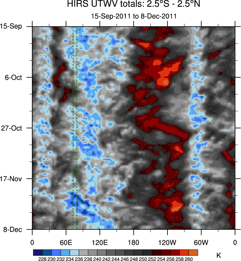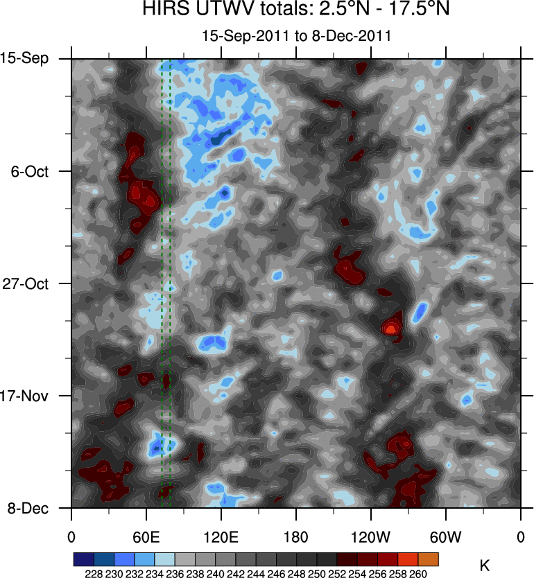 To identify tropical waves in near real-time, the OLR and UTWV data are filtered following Wheeler & Weickmann (2001 MWR). The daily anomalies are calculated using the first 3 harmonics of the seasonal cycle for 1979–2009. Missing values are then filled using linear interpolation in space and time. The most recent 365 days of anomalies are padded with 659 days of zeroes, and the result is filtered for each wave type.