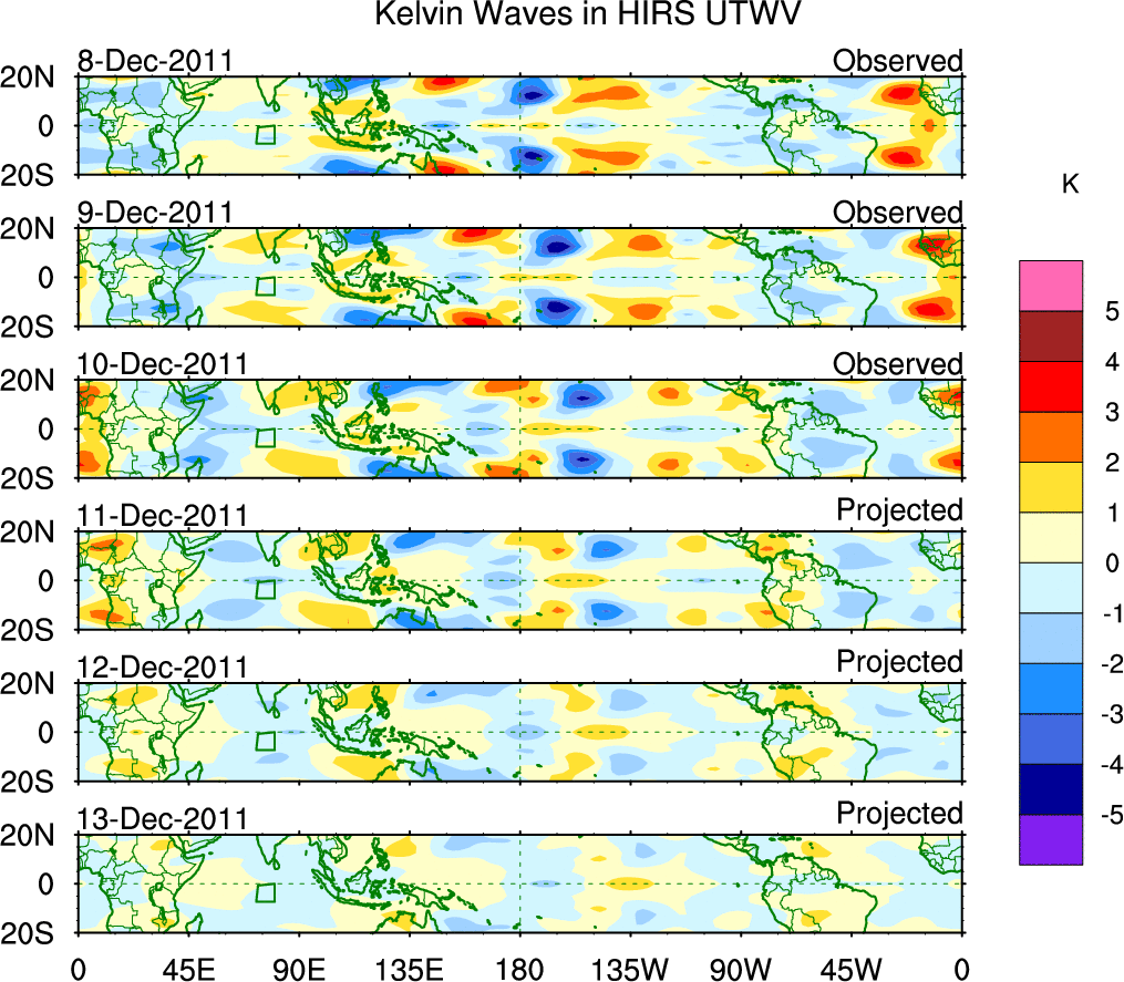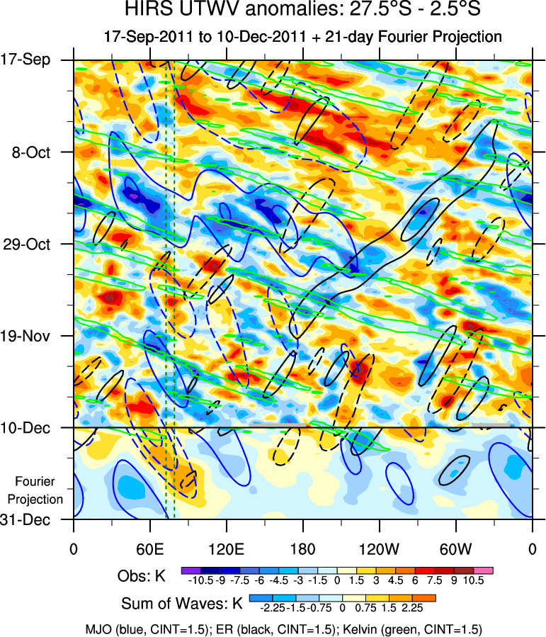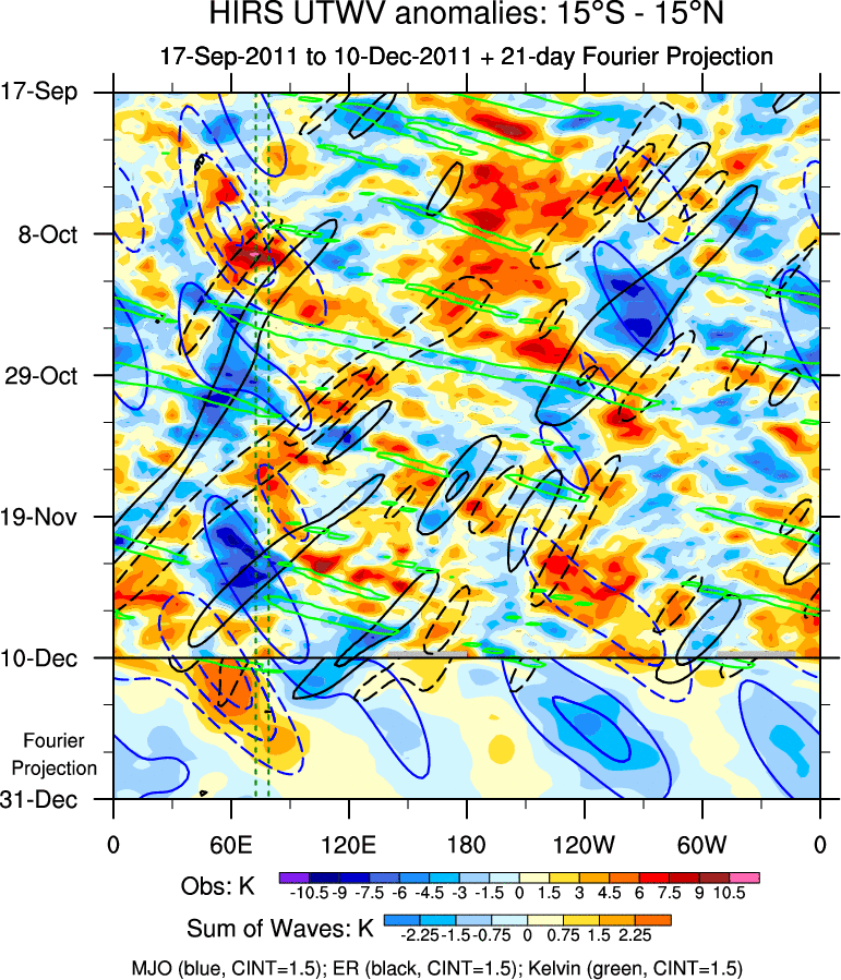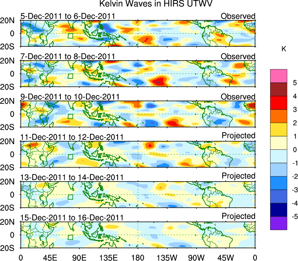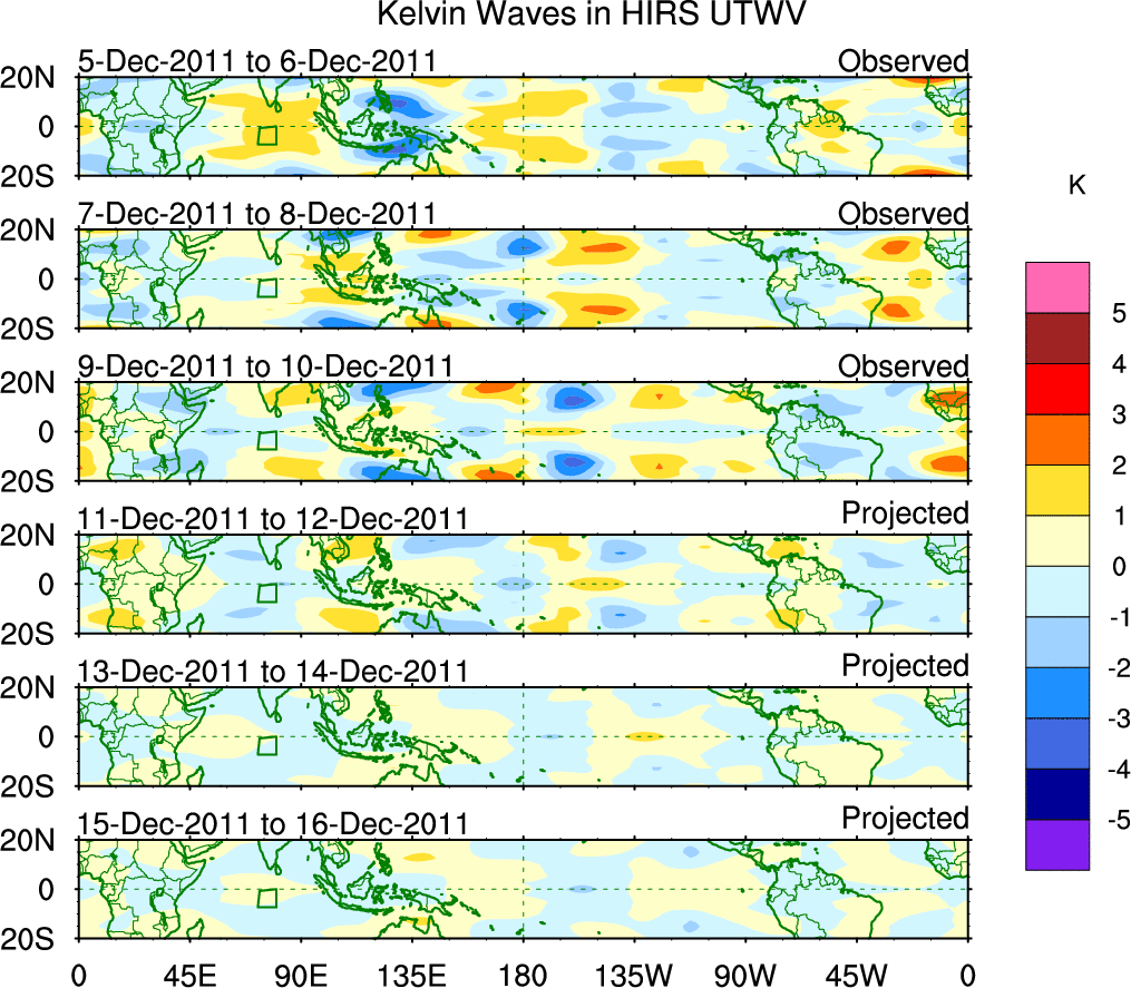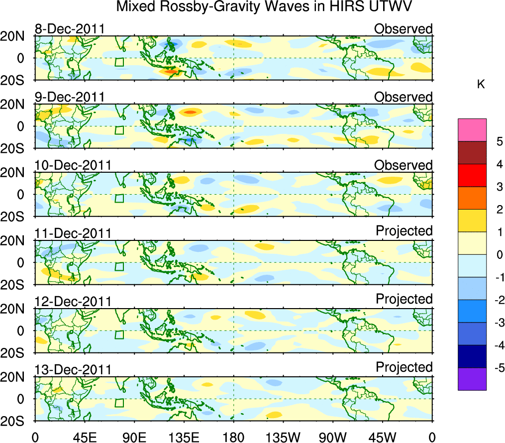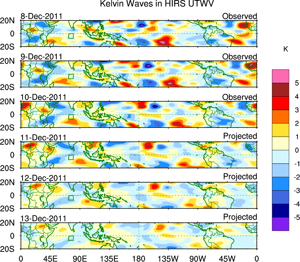 To identify tropical waves in near real-time, the OLR and UTWV data are filtered following Wheeler & Weickmann (2001 MWR). The daily anomalies are calculated using the first 3 harmonics of the seasonal cycle for 1979–2009. Missing values are then filled using linear interpolation in space and time. The most recent 365 days of anomalies are padded with 659 days of zeroes, and the result is filtered for each wave type.