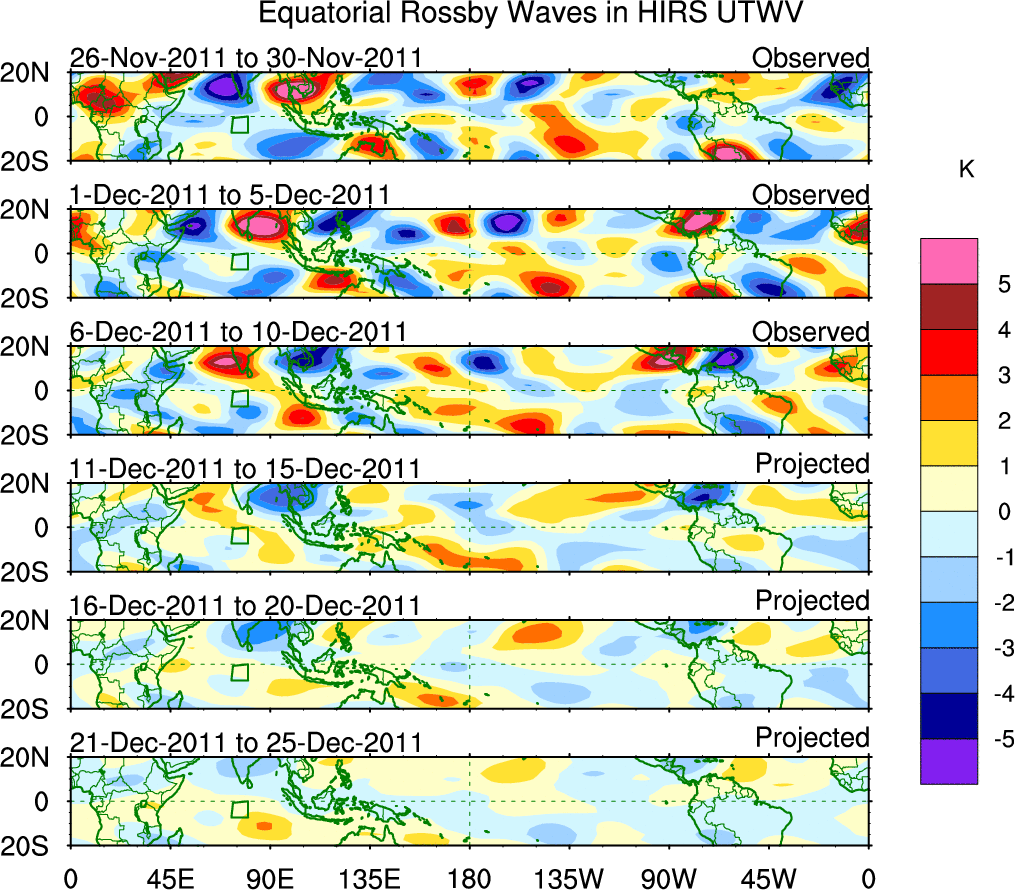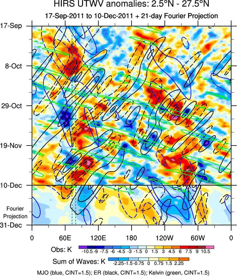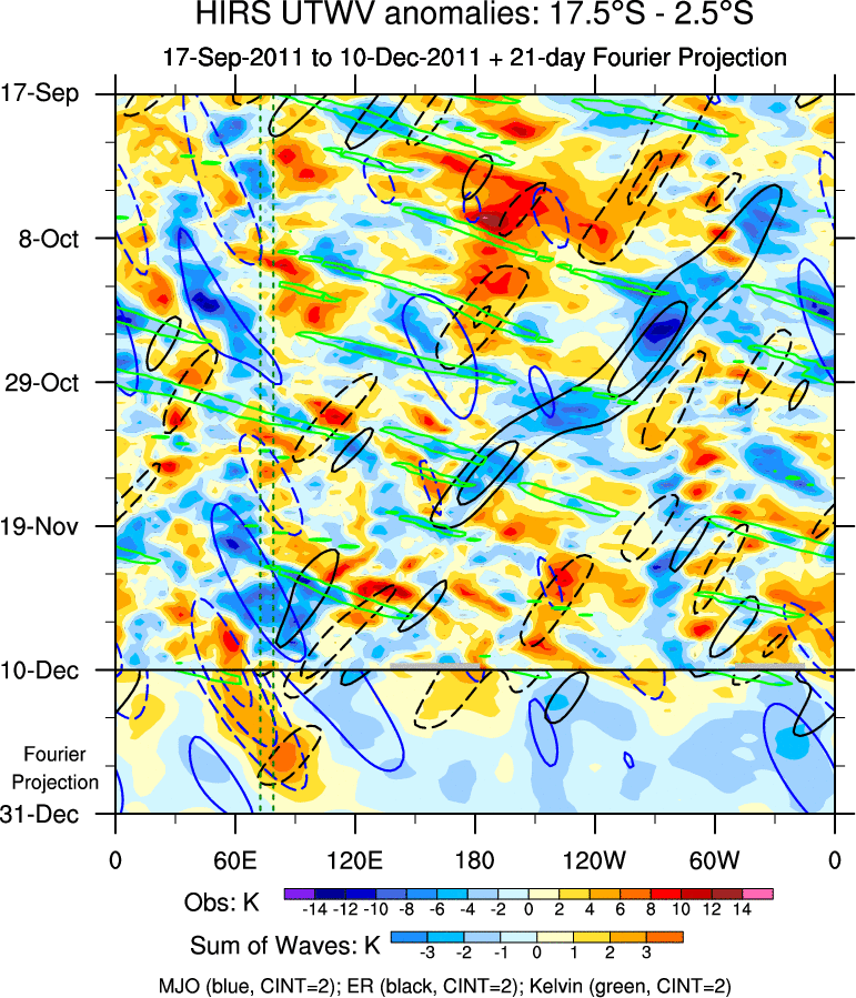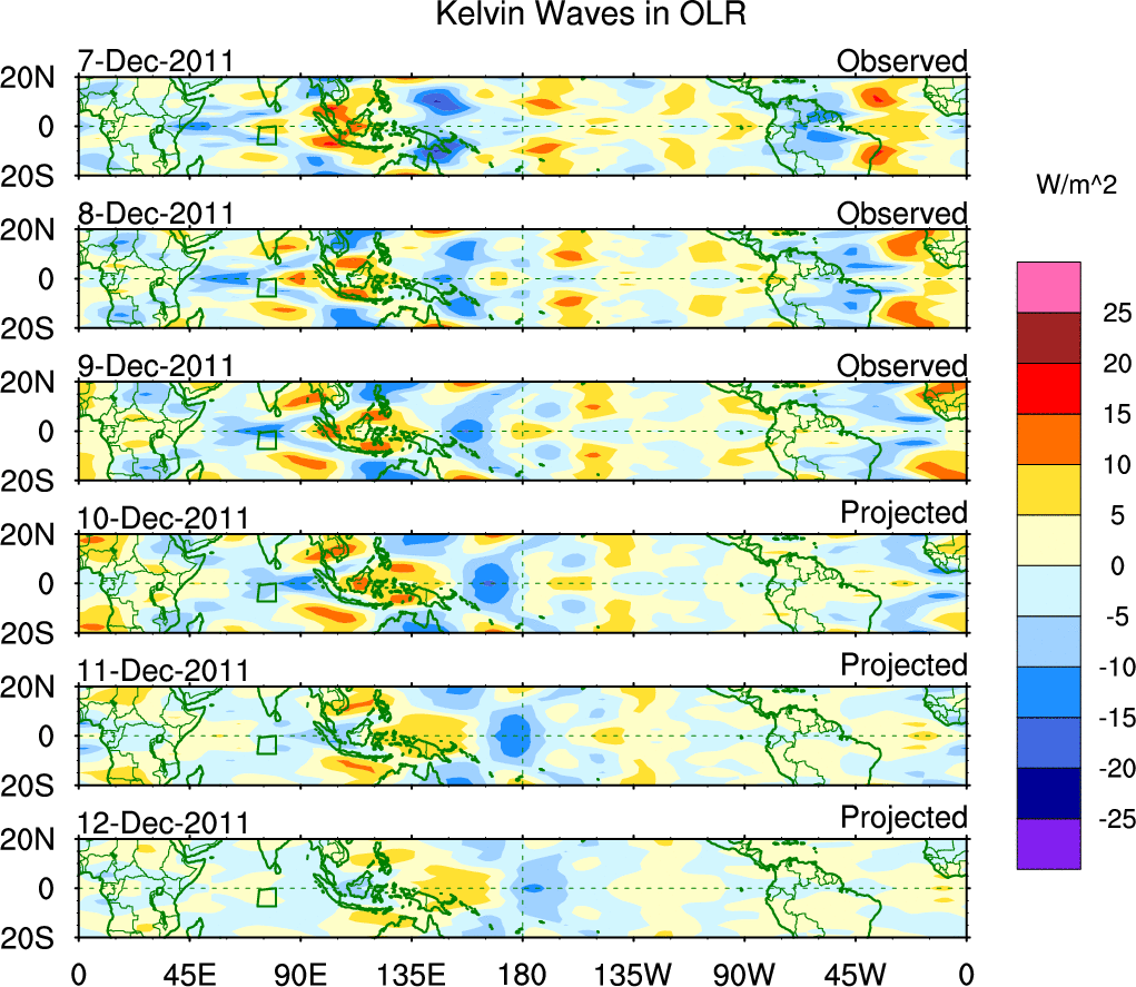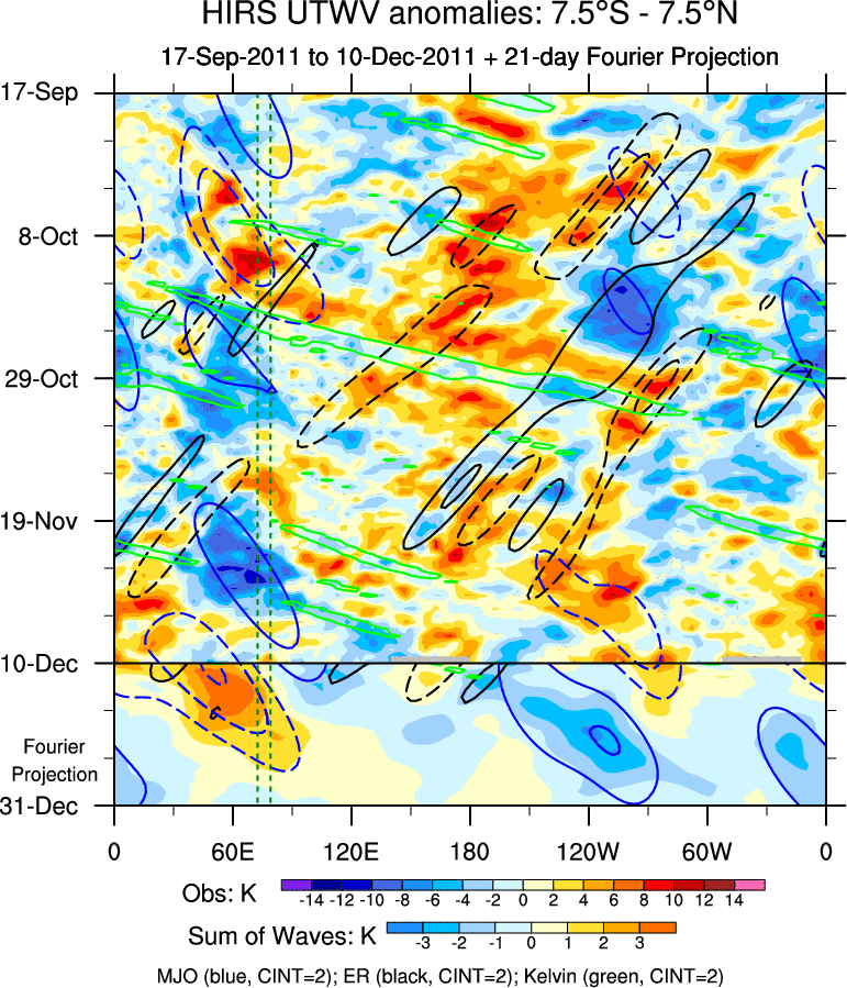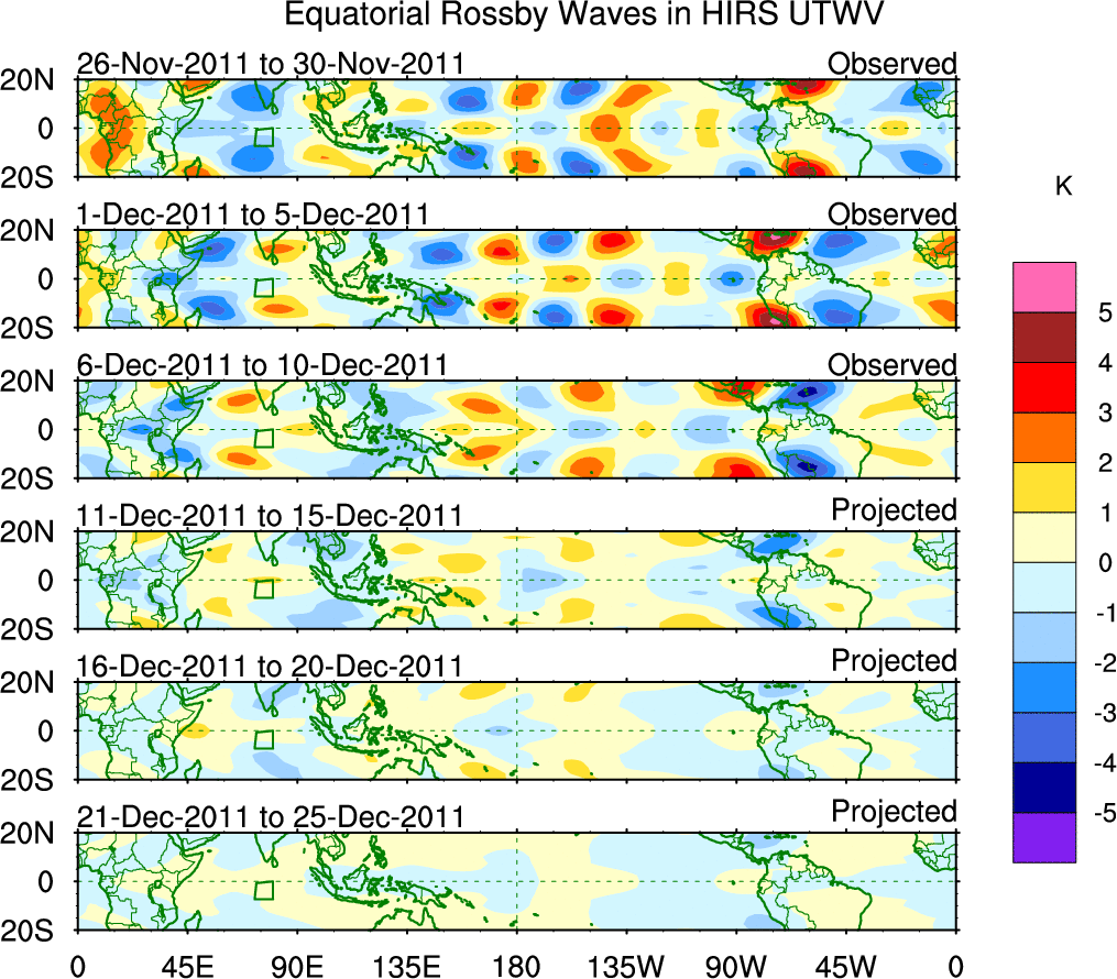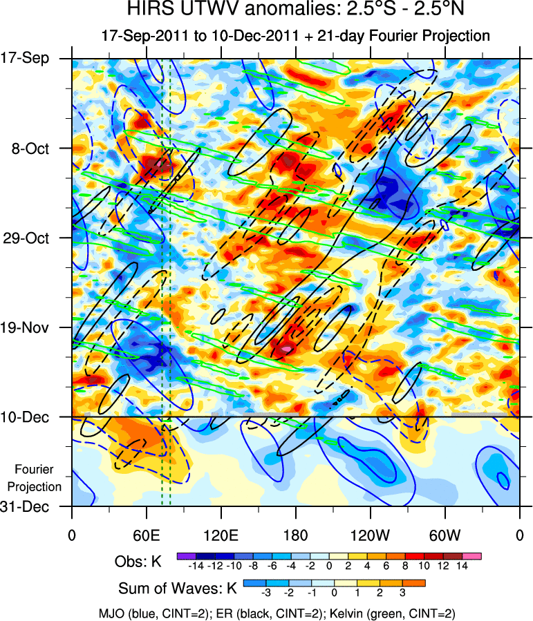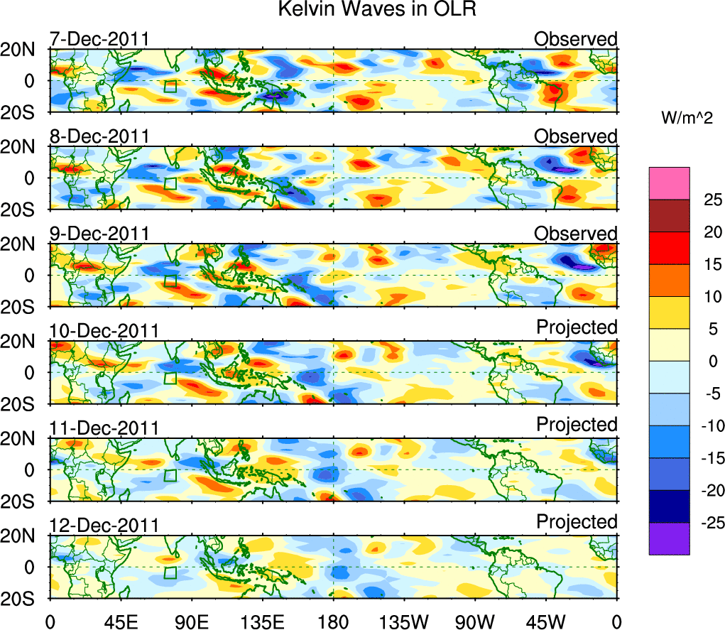 To identify tropical waves in near real-time, the OLR and UTWV data are filtered following Wheeler & Weickmann (2001 MWR). The daily anomalies are calculated using the first 3 harmonics of the seasonal cycle for 1979–2009. Missing values are then filled using linear interpolation in space and time. The most recent 365 days of anomalies are padded with 659 days of zeroes, and the result is filtered for each wave type.