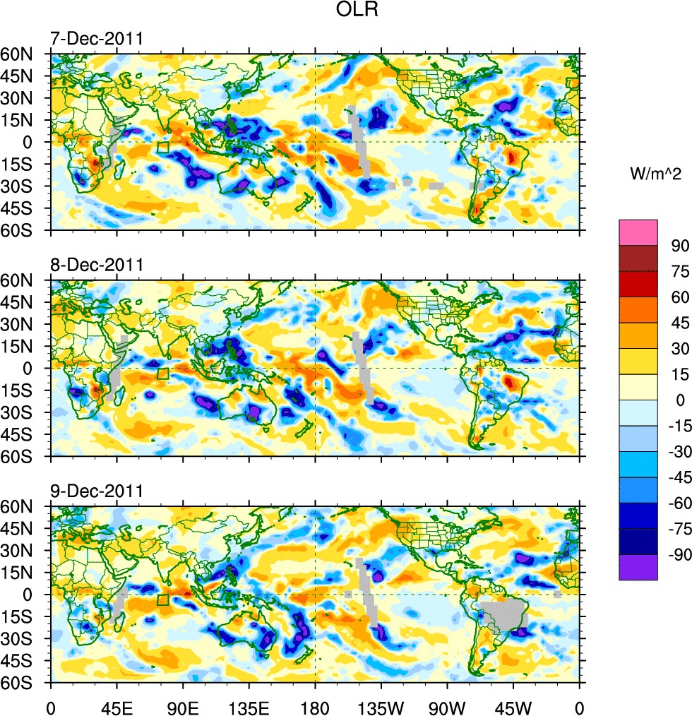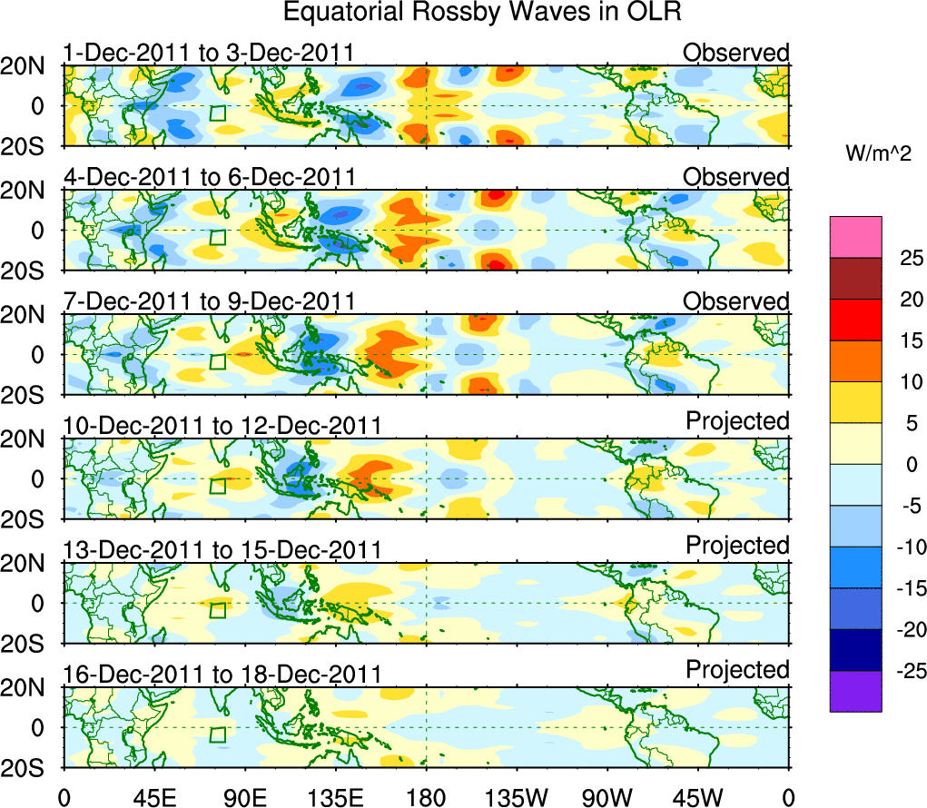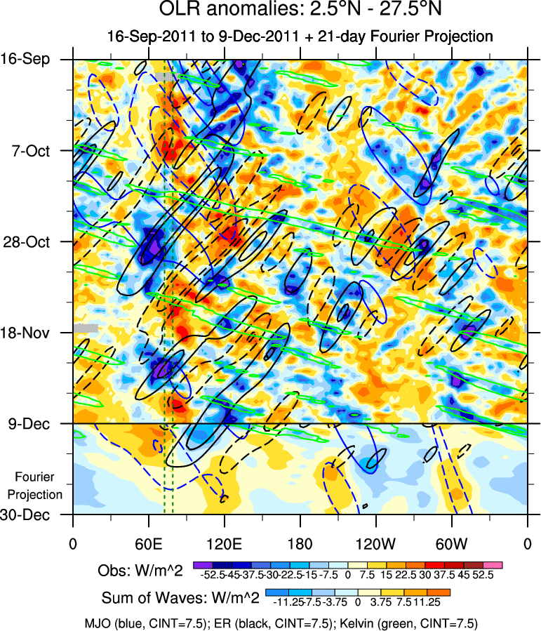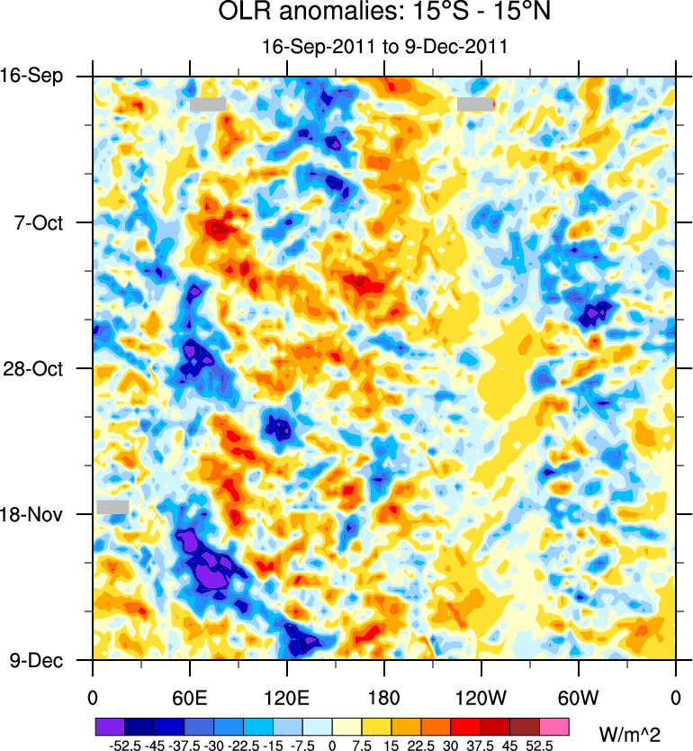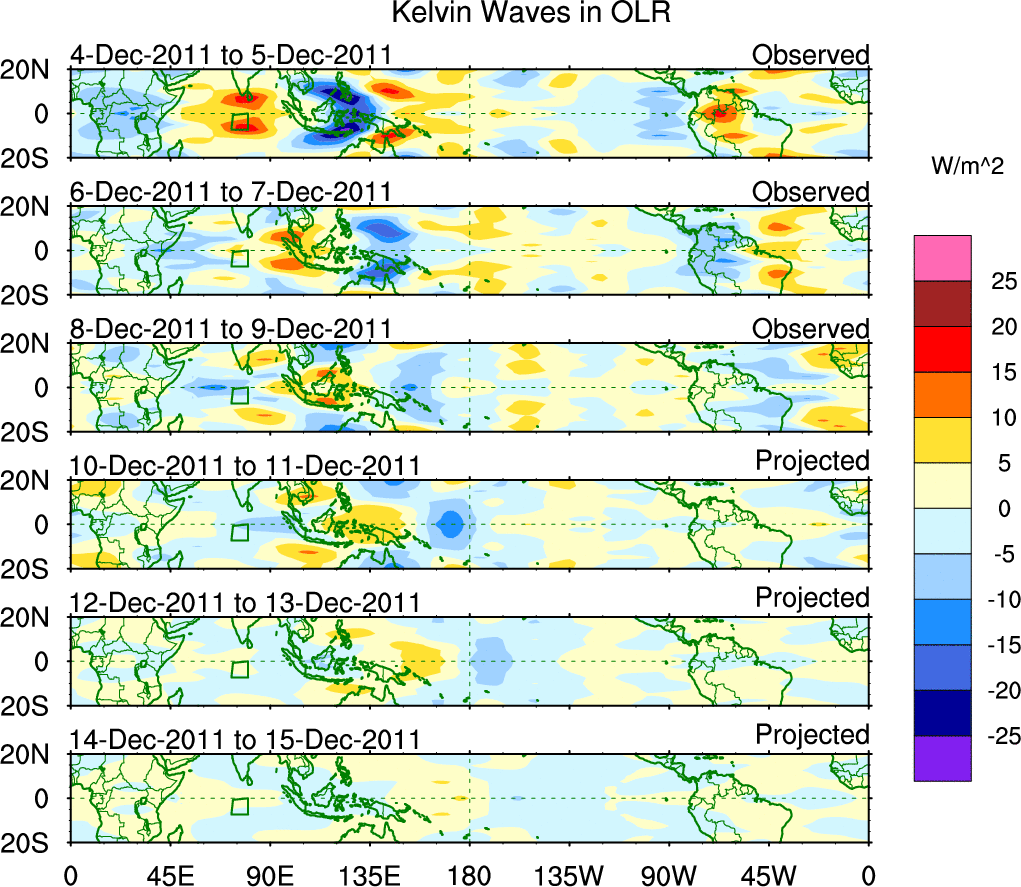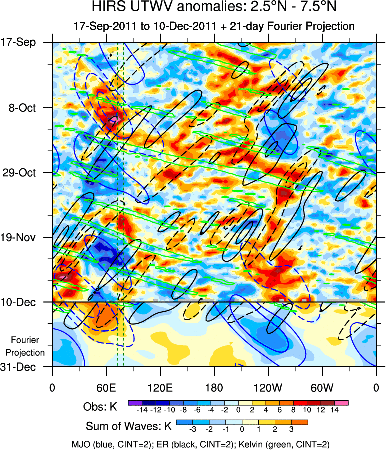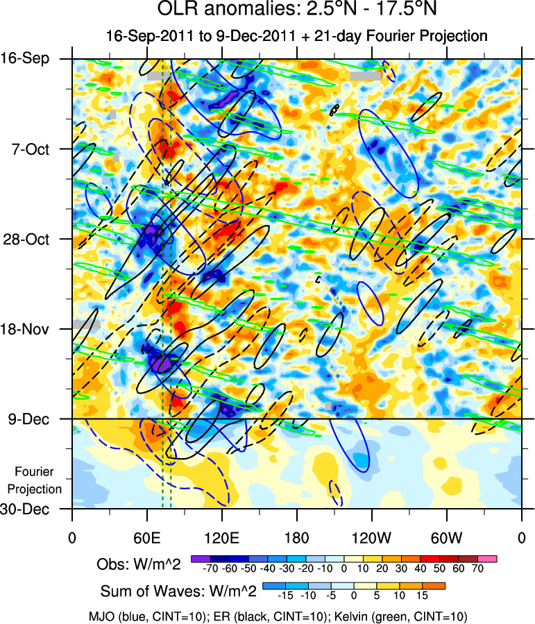 To identify tropical waves in near real-time, the OLR and UTWV data are filtered following Wheeler & Weickmann (2001 MWR). The daily anomalies are calculated using the first 3 harmonics of the seasonal cycle for 1979–2009. Missing values are then filled using linear interpolation in space and time. The most recent 365 days of anomalies are padded with 659 days of zeroes, and the result is filtered for each wave type.