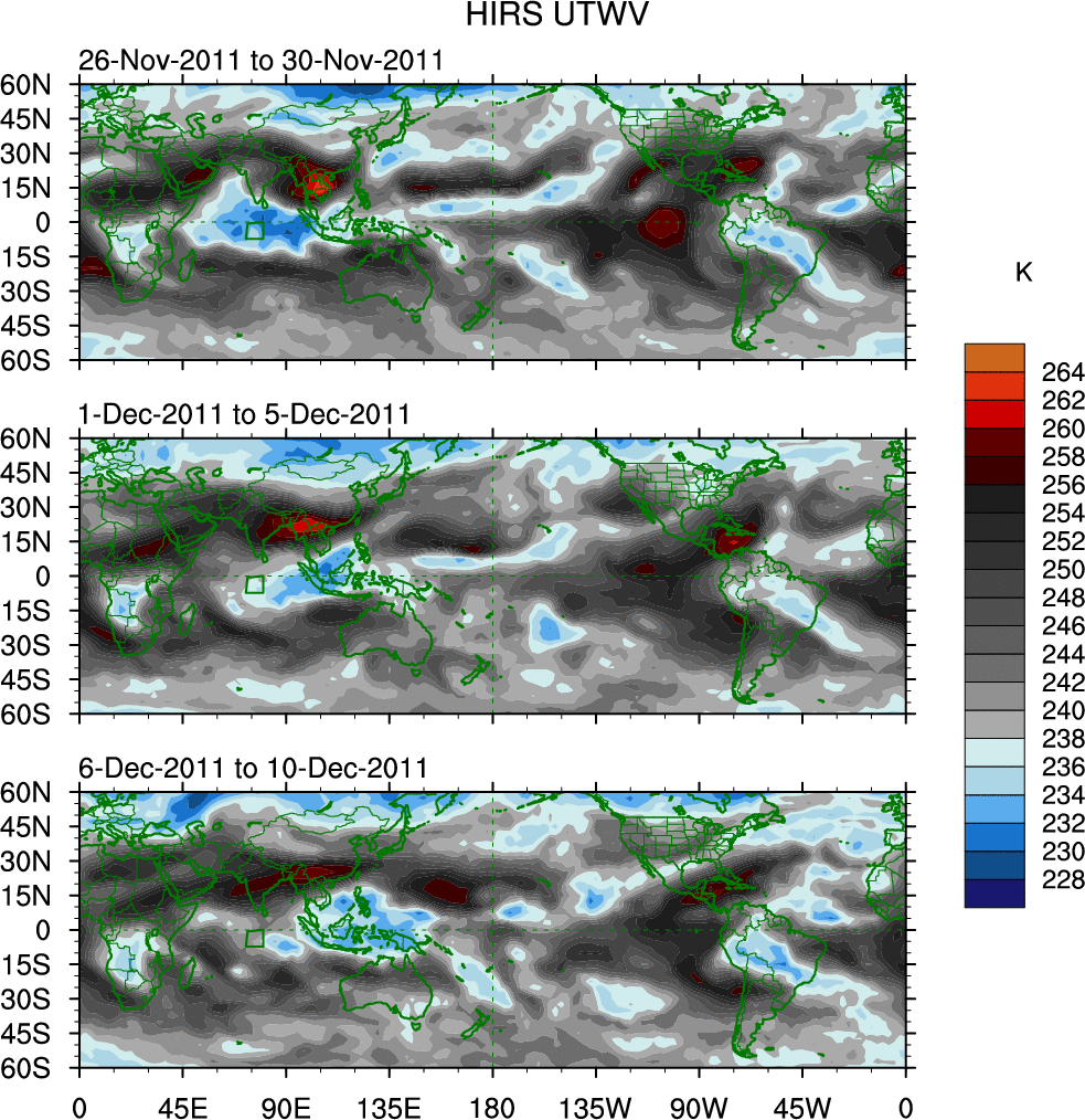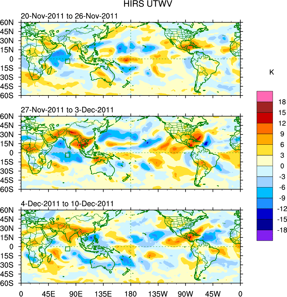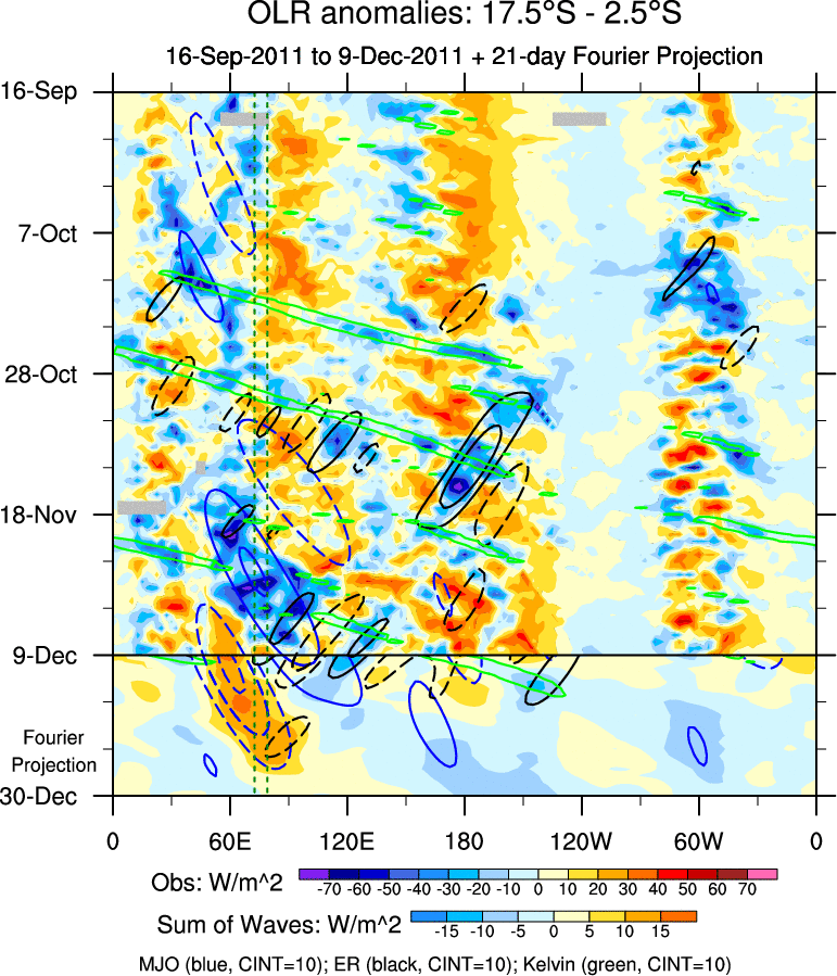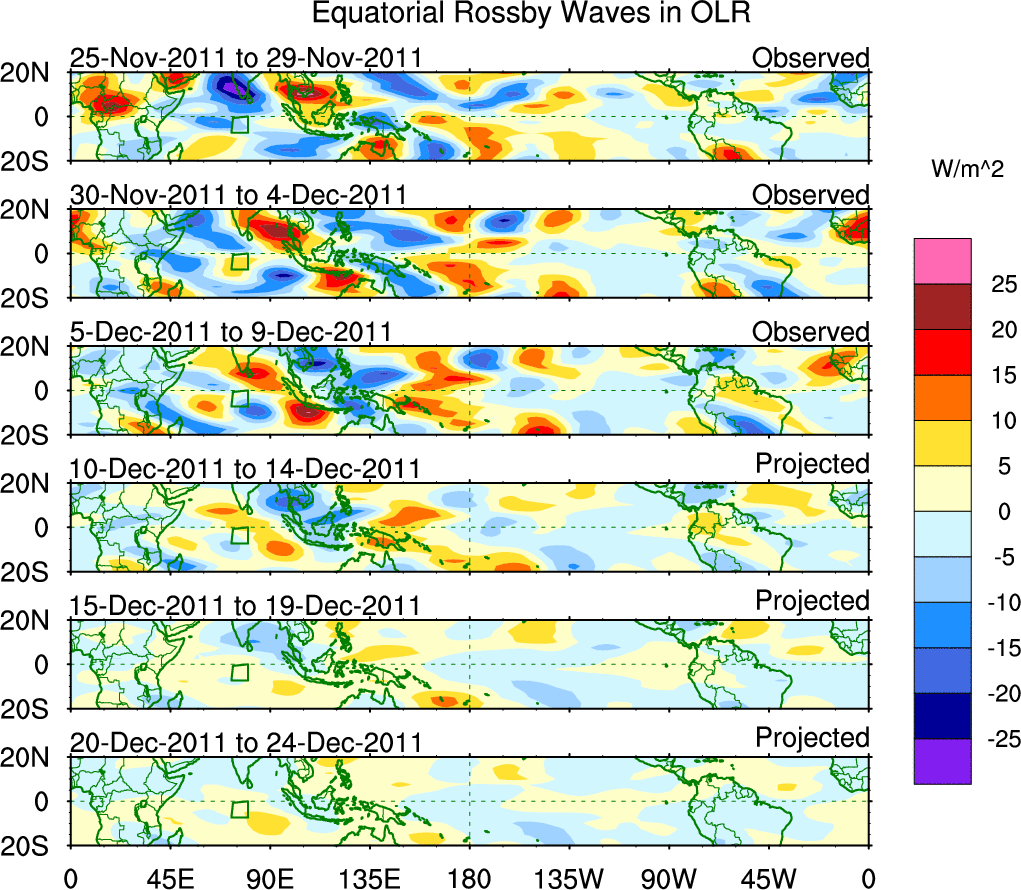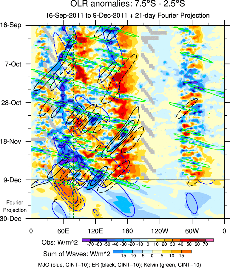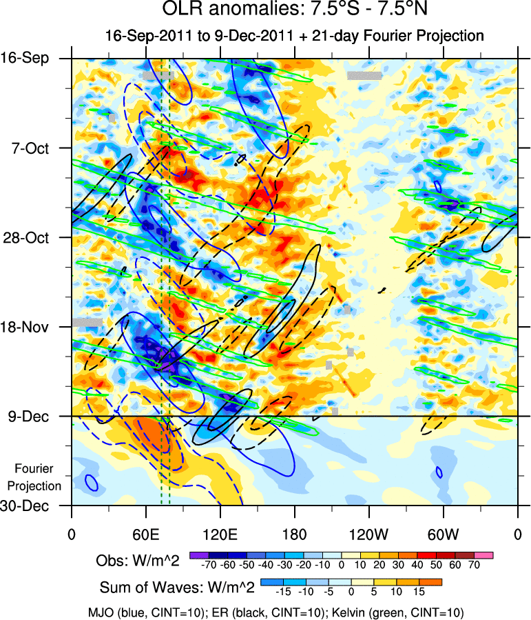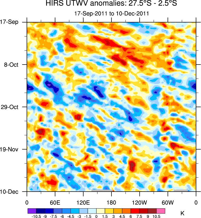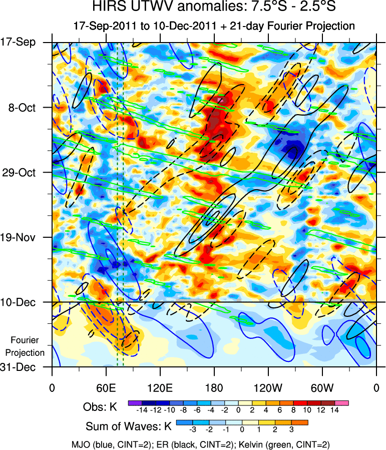 To identify tropical waves in near real-time, the OLR and UTWV data are filtered following Wheeler & Weickmann (2001 MWR). The daily anomalies are calculated using the first 3 harmonics of the seasonal cycle for 1979–2009. Missing values are then filled using linear interpolation in space and time. The most recent 365 days of anomalies are padded with 659 days of zeroes, and the result is filtered for each wave type.