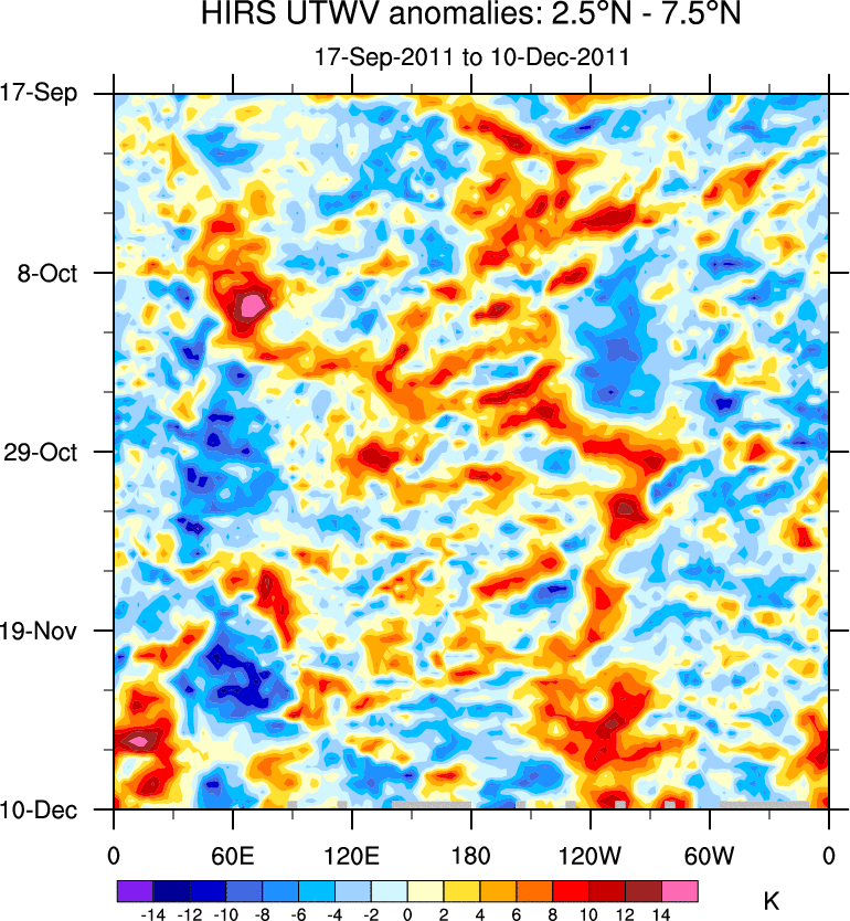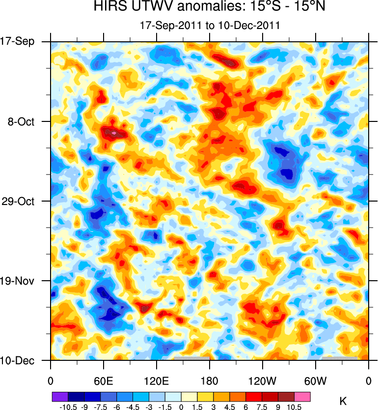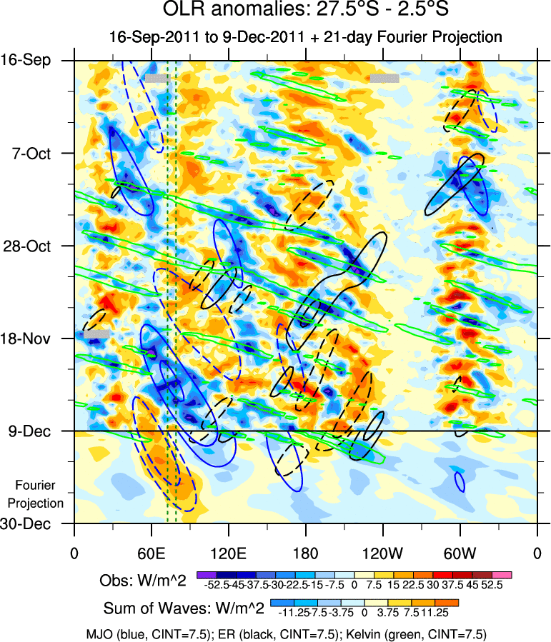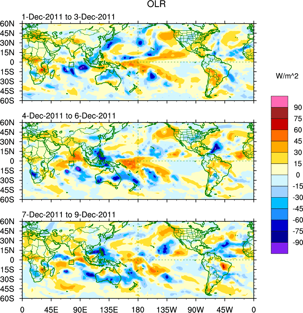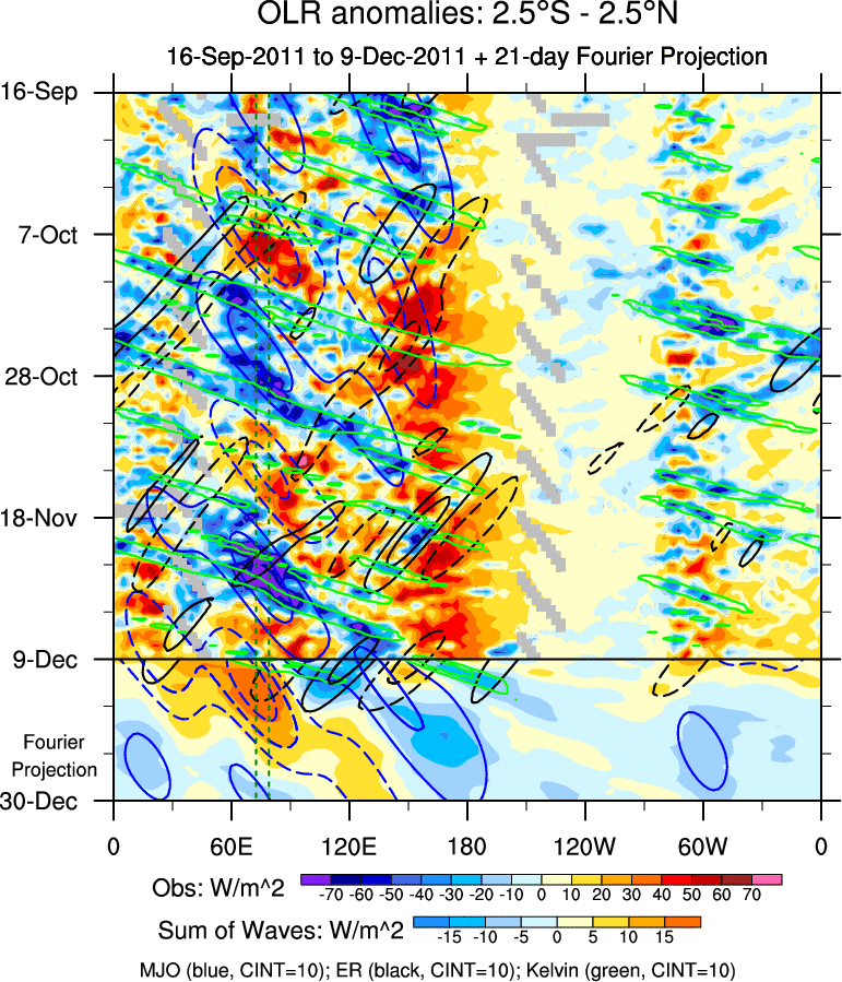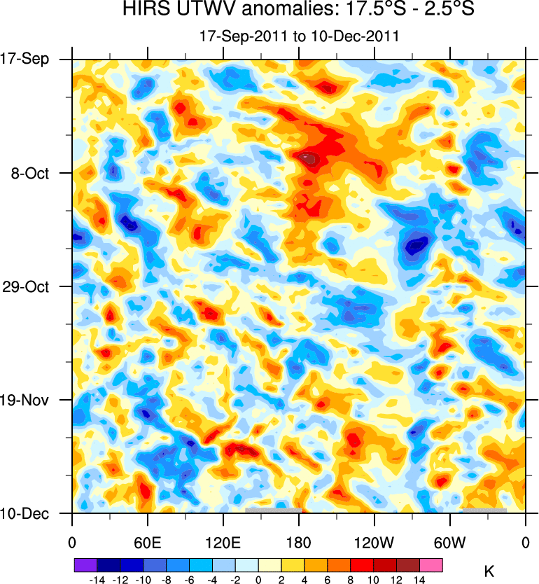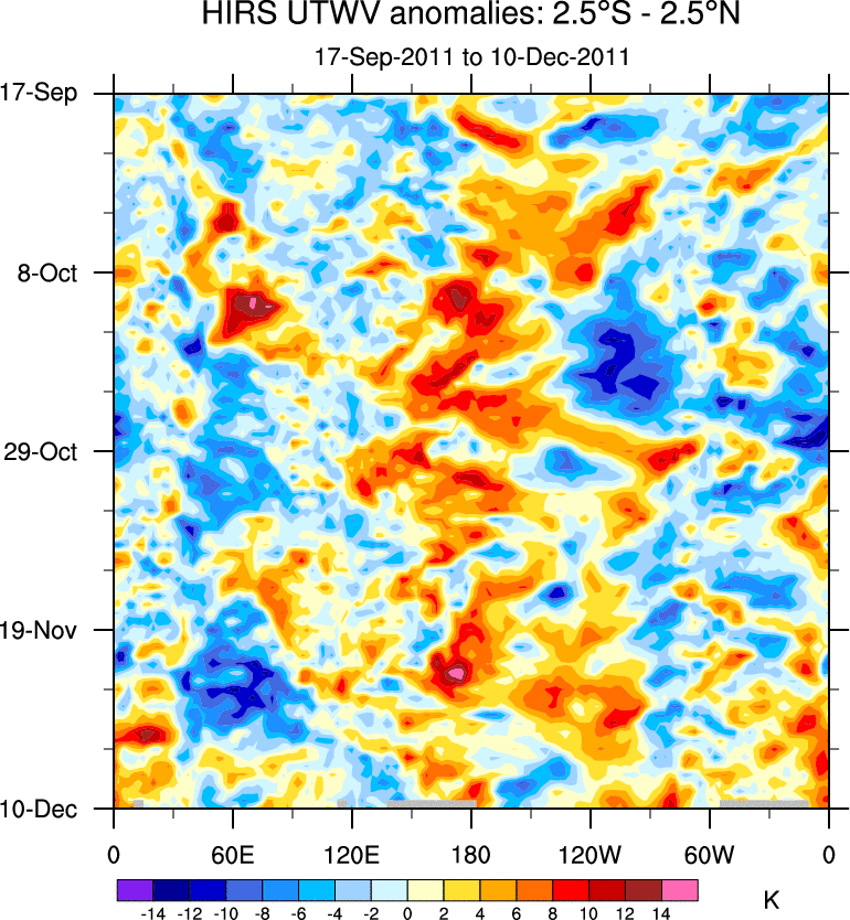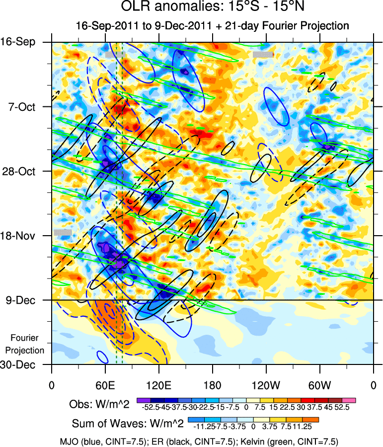 To identify tropical waves in near real-time, the OLR and UTWV data are filtered following Wheeler & Weickmann (2001 MWR). The daily anomalies are calculated using the first 3 harmonics of the seasonal cycle for 1979–2009. Missing values are then filled using linear interpolation in space and time. The most recent 365 days of anomalies are padded with 659 days of zeroes, and the result is filtered for each wave type.