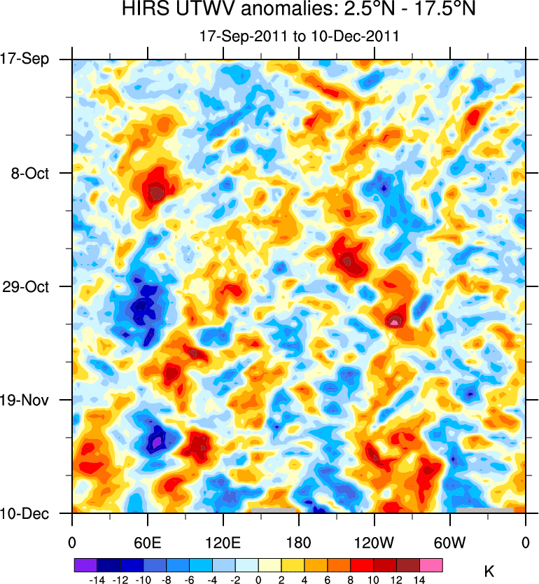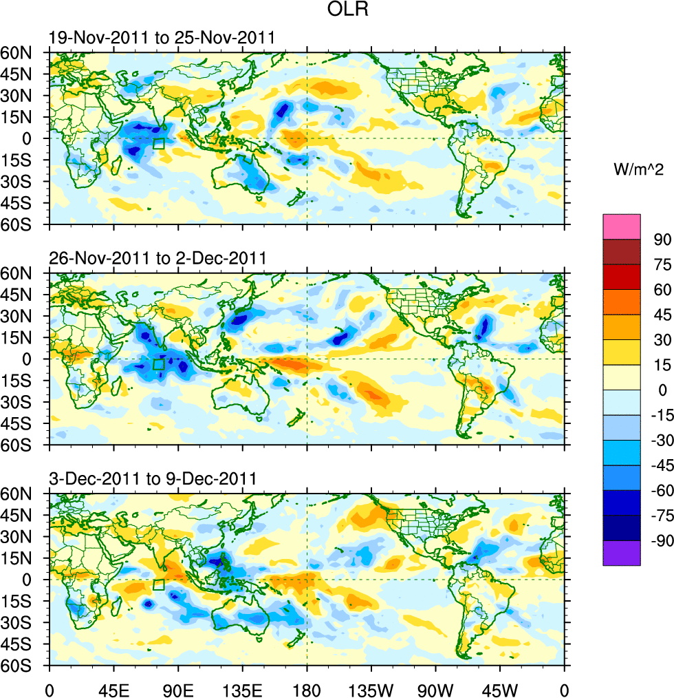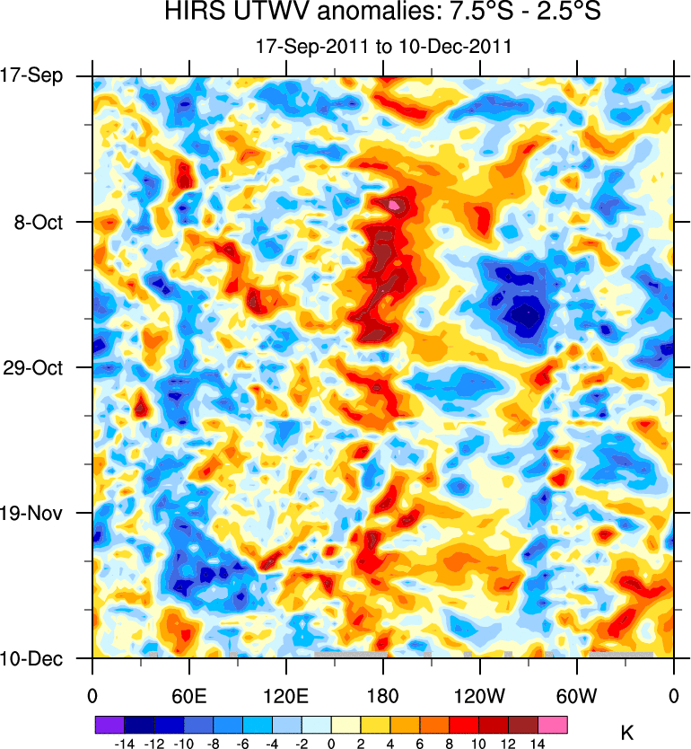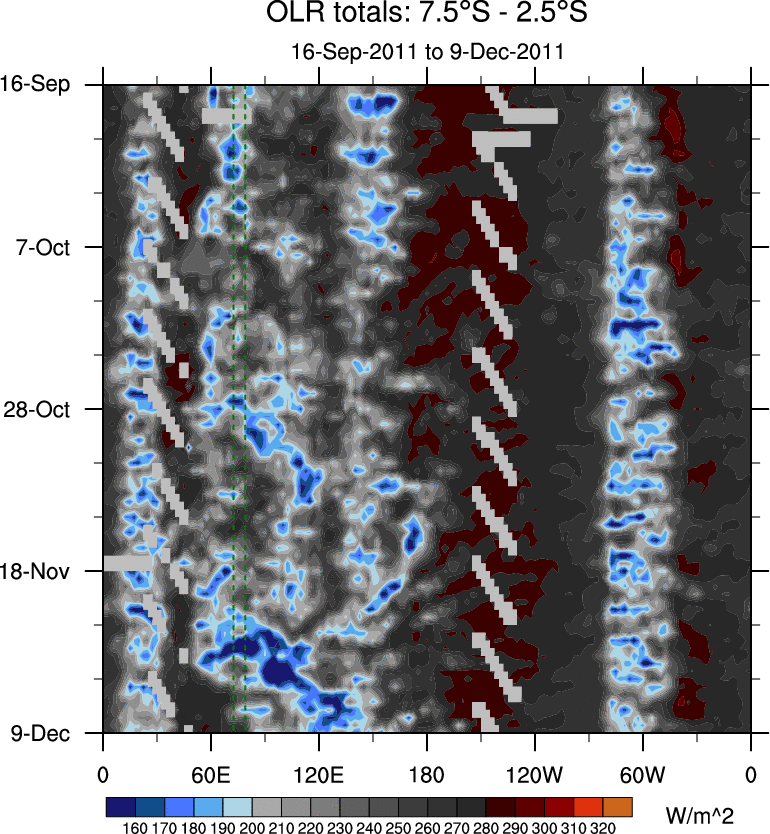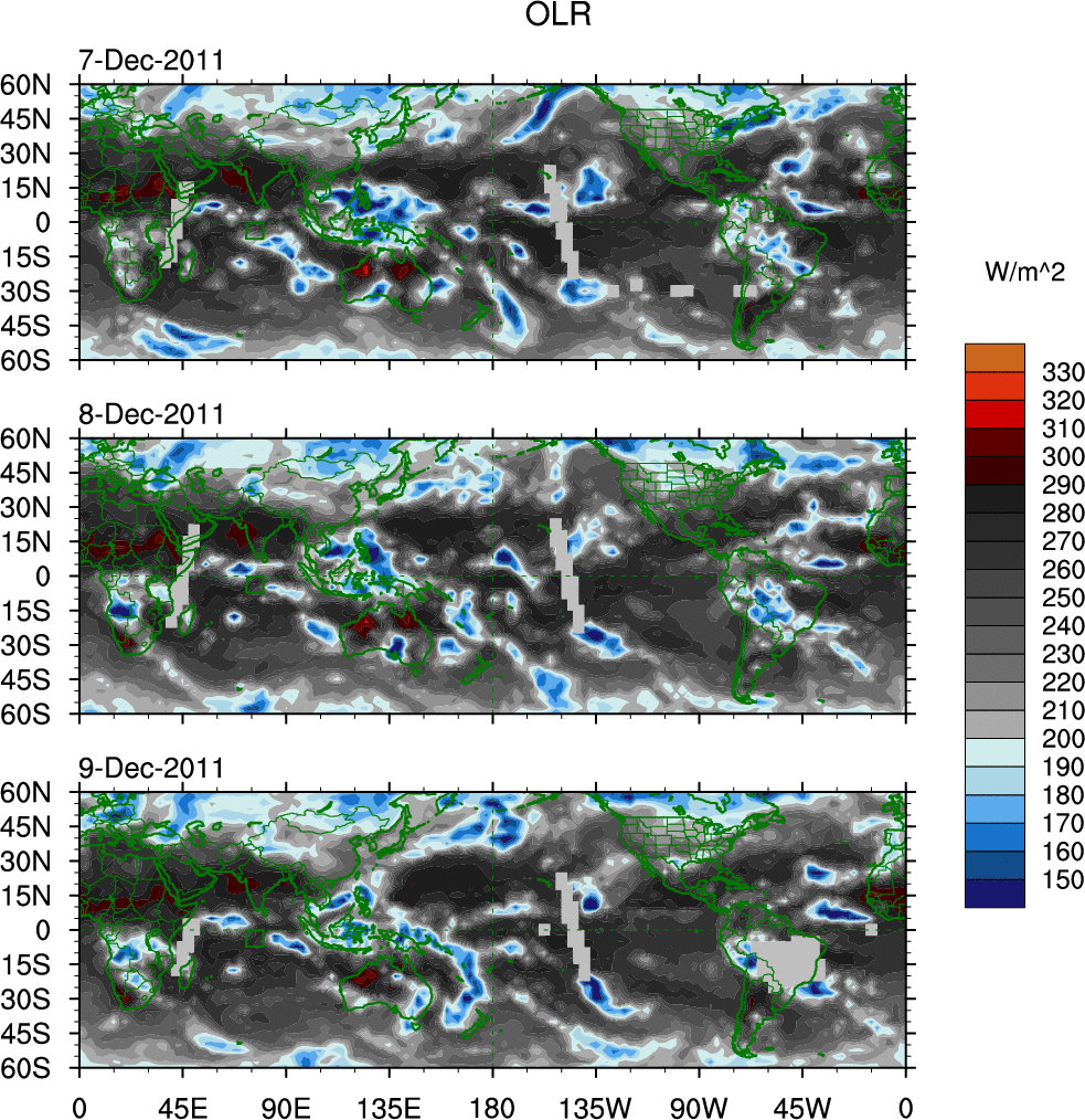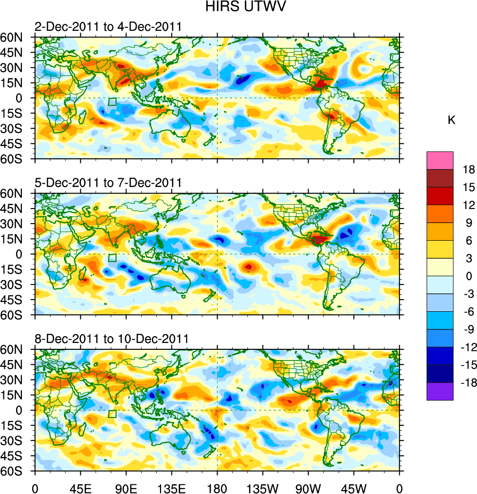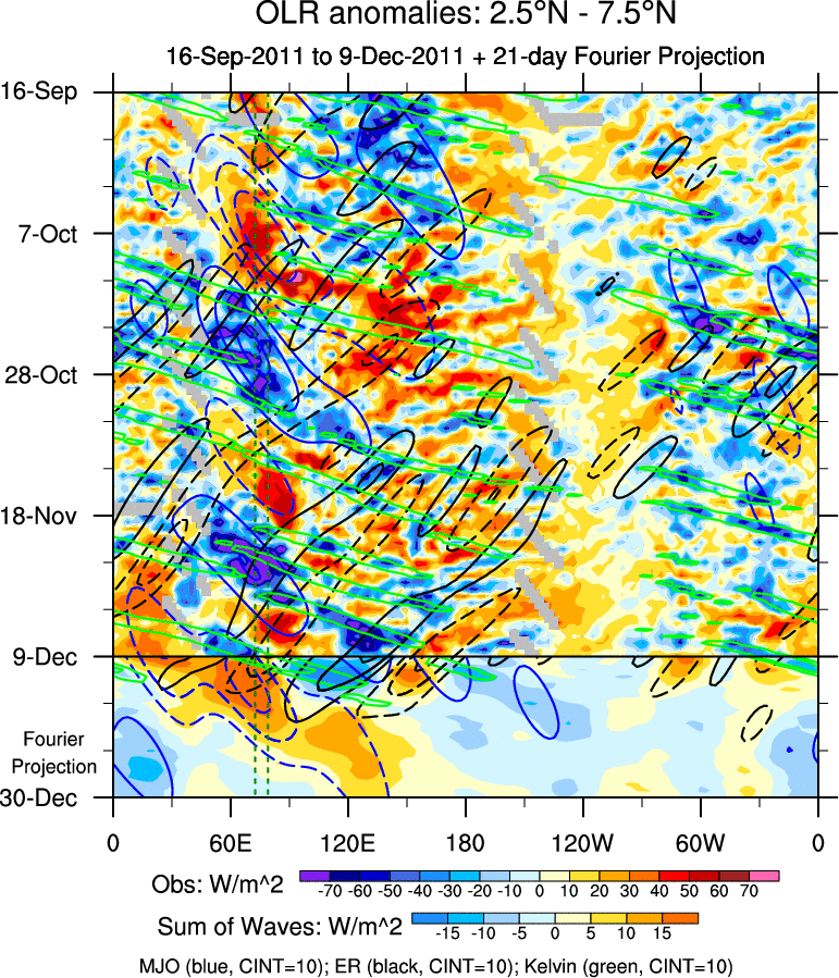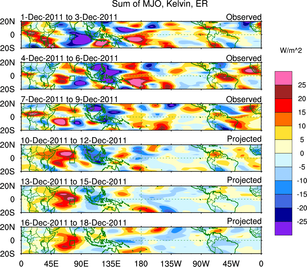 To identify tropical waves in near real-time, the OLR and UTWV data are filtered following Wheeler & Weickmann (2001 MWR). The daily anomalies are calculated using the first 3 harmonics of the seasonal cycle for 1979–2009. Missing values are then filled using linear interpolation in space and time. The most recent 365 days of anomalies are padded with 659 days of zeroes, and the result is filtered for each wave type.