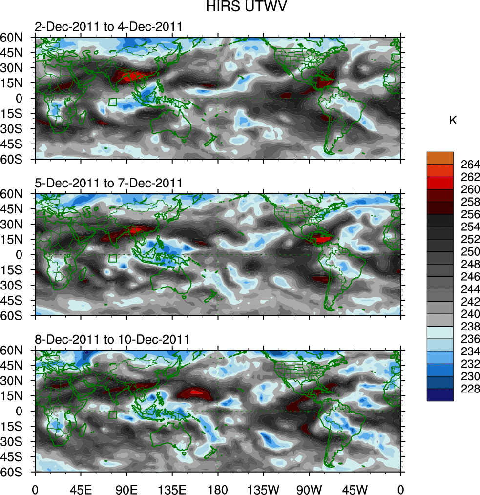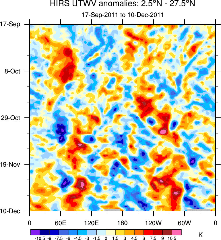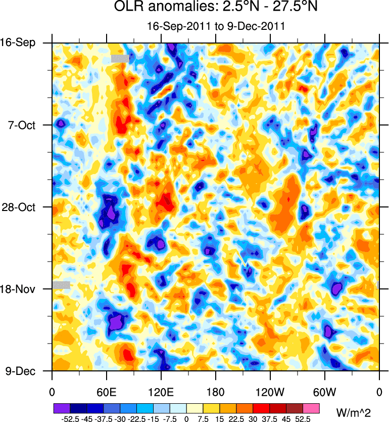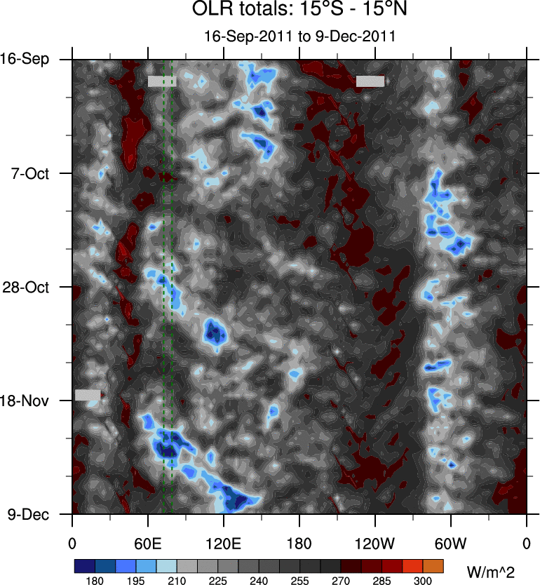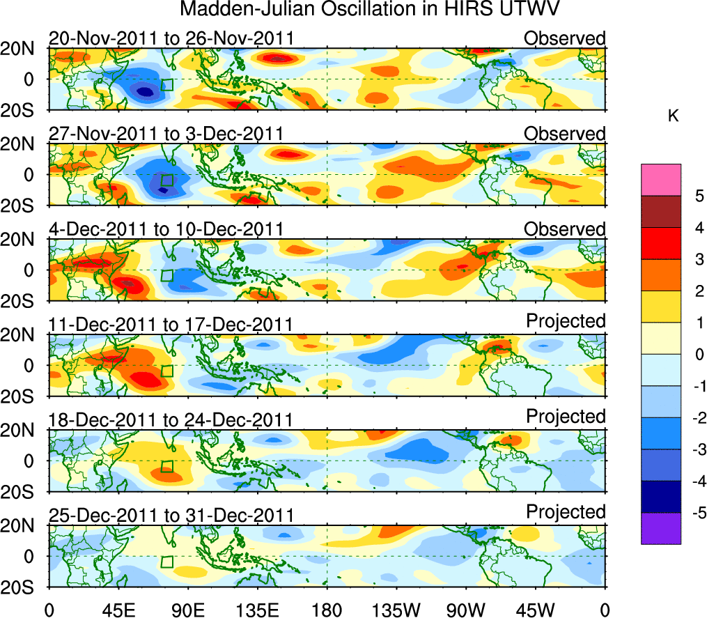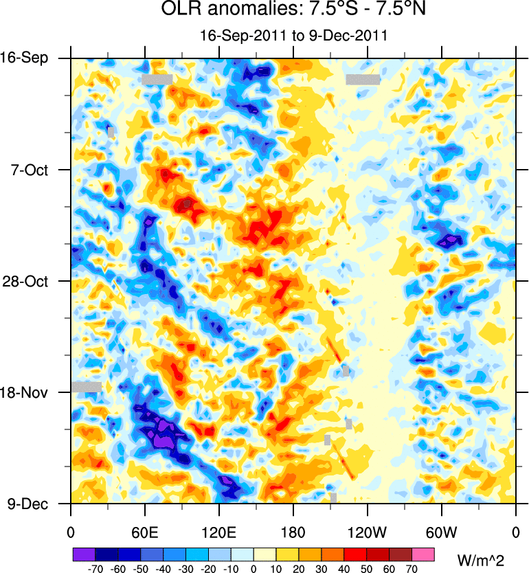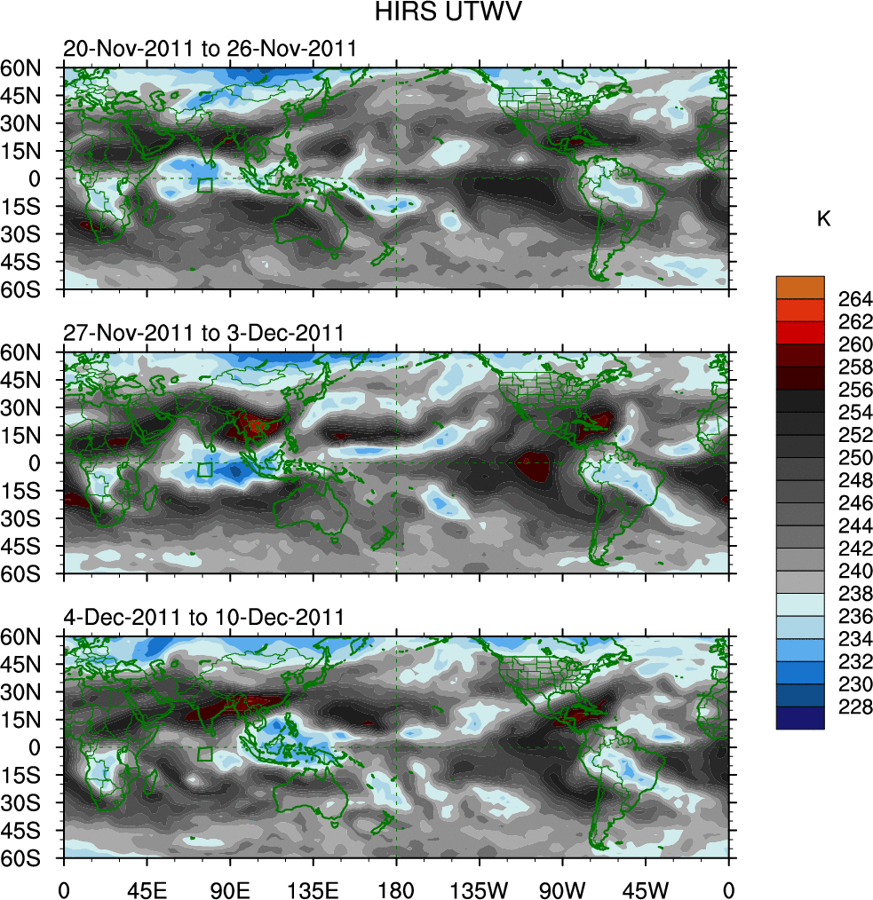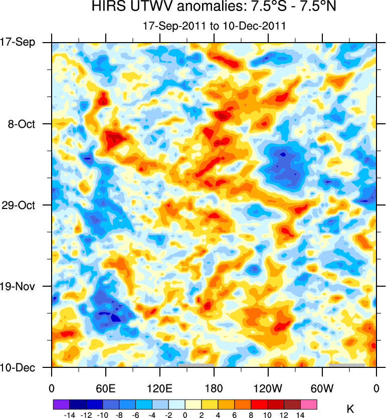 To identify tropical waves in near real-time, the OLR and UTWV data are filtered following Wheeler & Weickmann (2001 MWR). The daily anomalies are calculated using the first 3 harmonics of the seasonal cycle for 1979–2009. Missing values are then filled using linear interpolation in space and time. The most recent 365 days of anomalies are padded with 659 days of zeroes, and the result is filtered for each wave type.