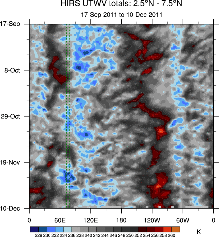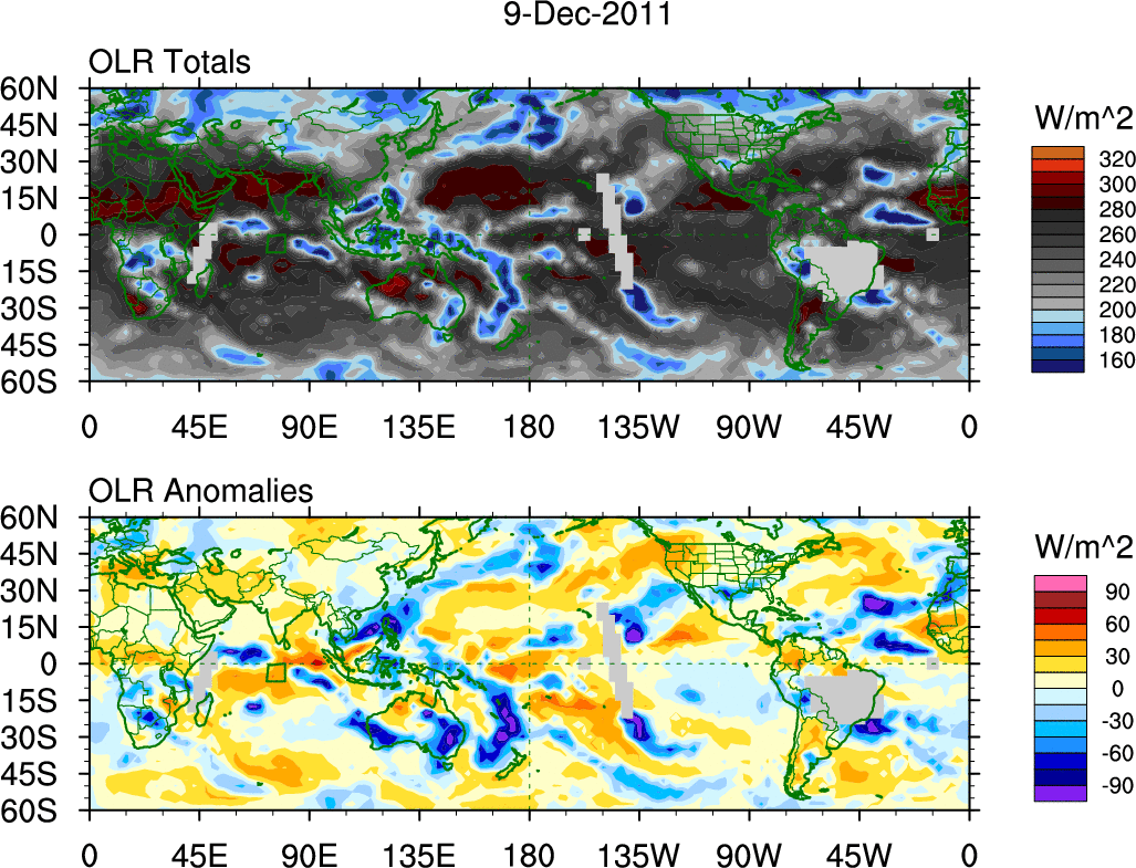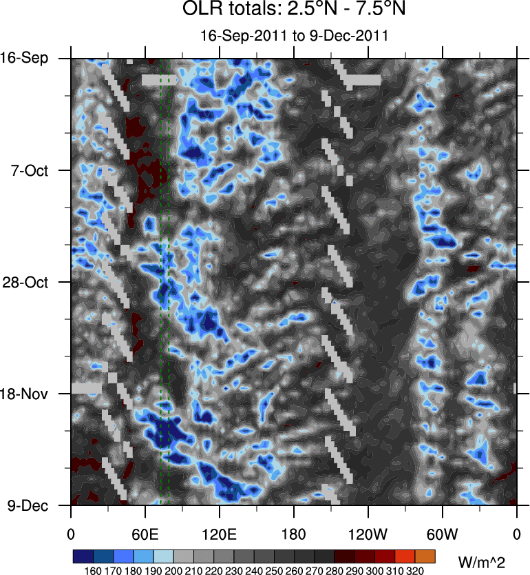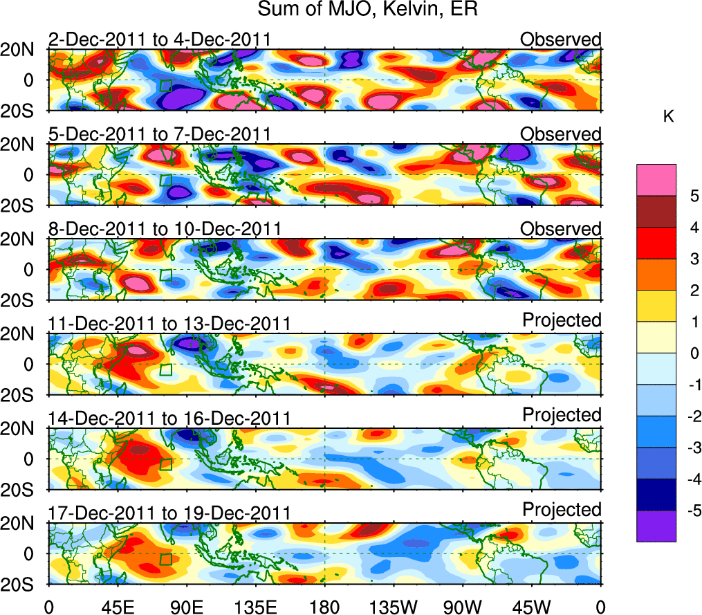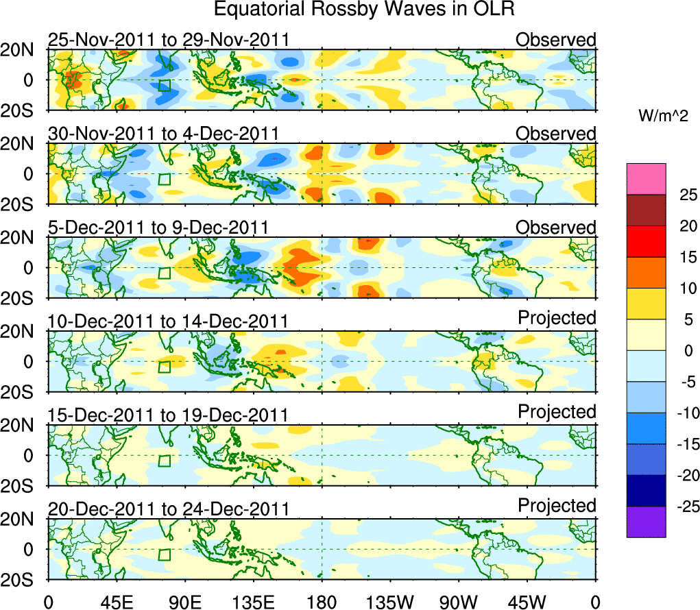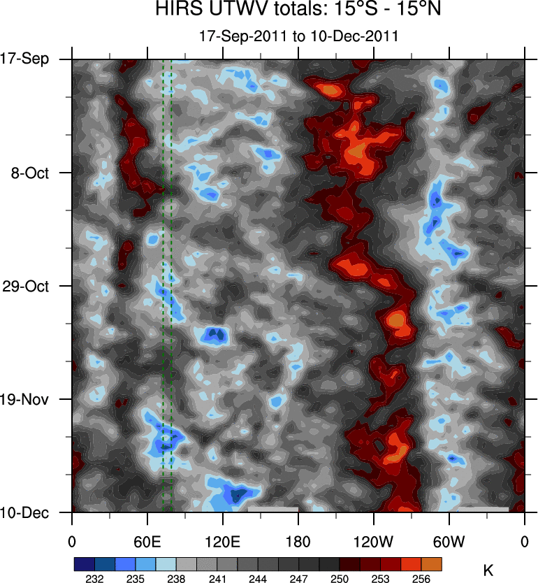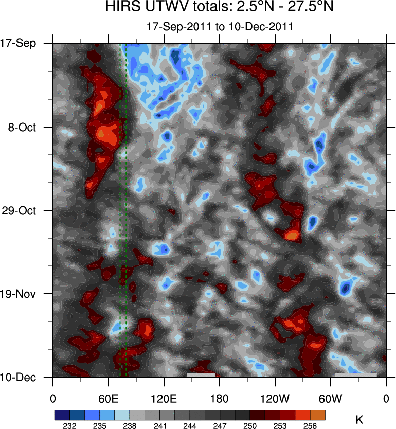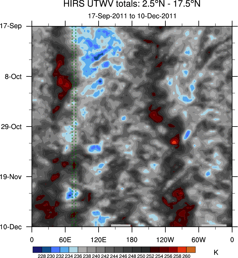 To identify tropical waves in near real-time, the OLR and UTWV data are filtered following Wheeler & Weickmann (2001 MWR). The daily anomalies are calculated using the first 3 harmonics of the seasonal cycle for 1979–2009. Missing values are then filled using linear interpolation in space and time. The most recent 365 days of anomalies are padded with 659 days of zeroes, and the result is filtered for each wave type.