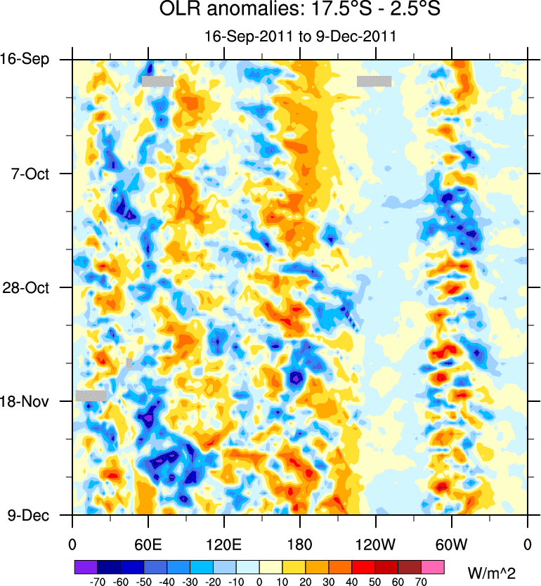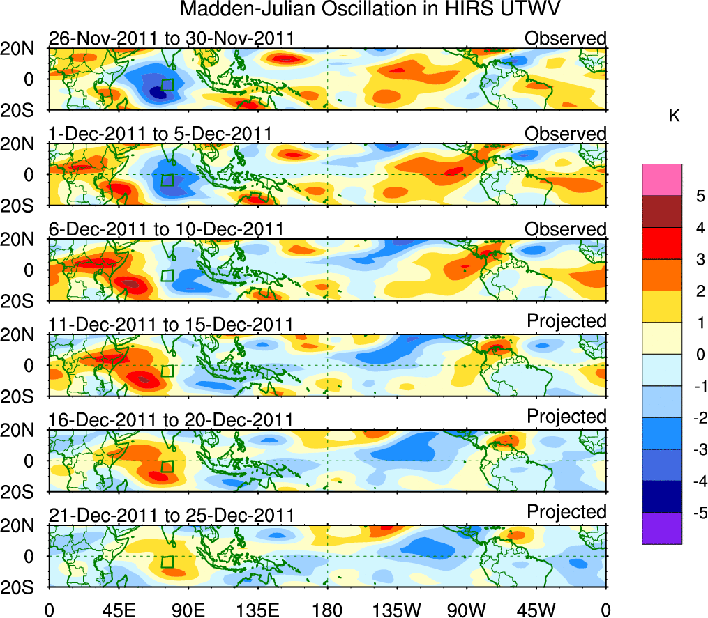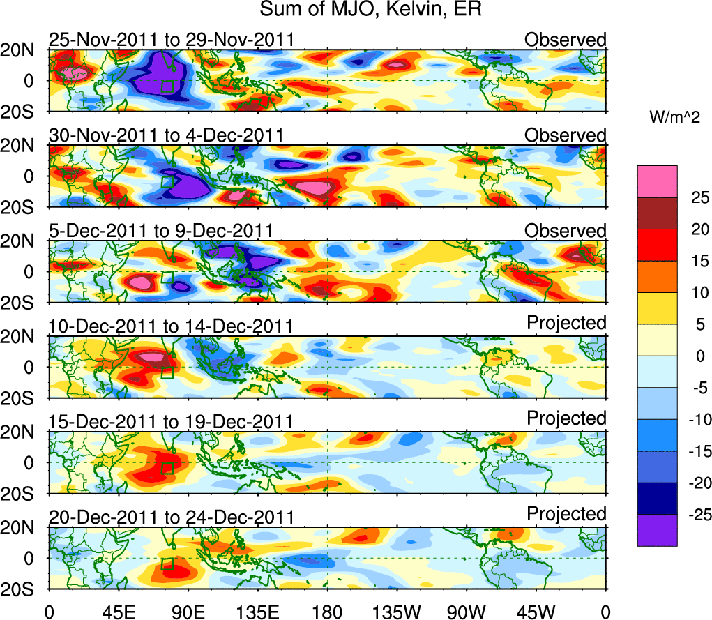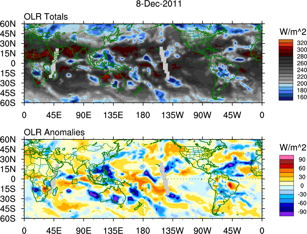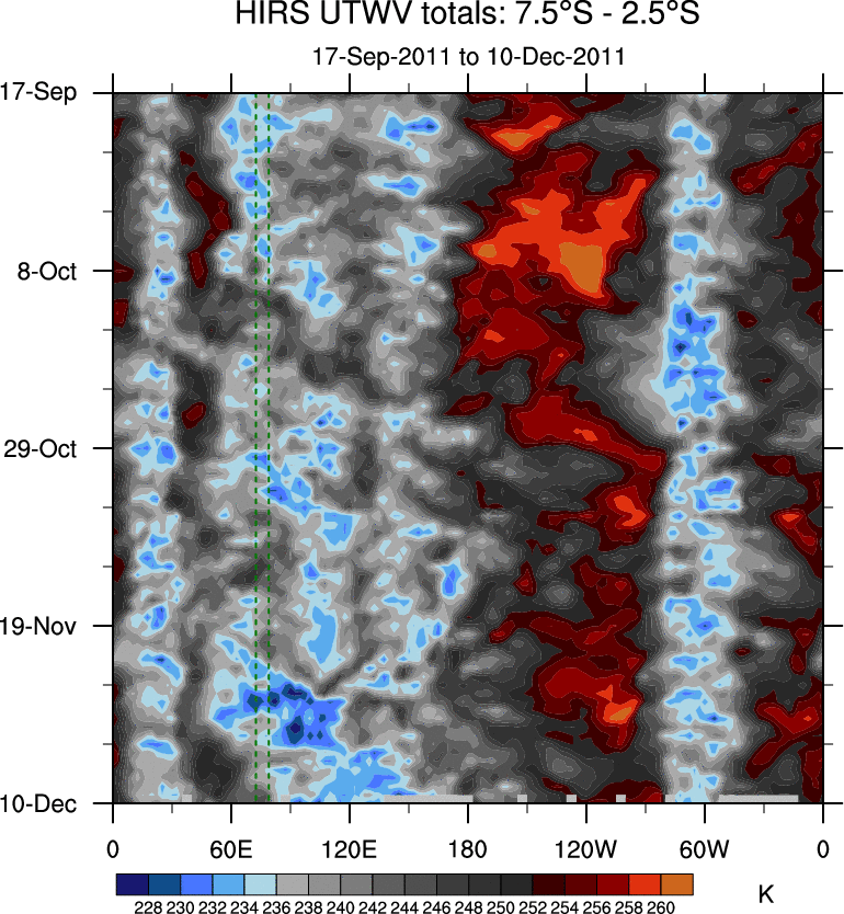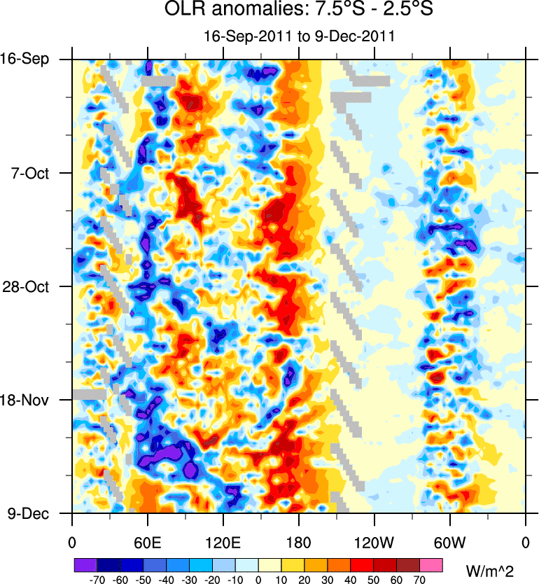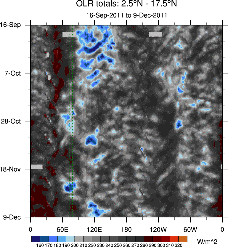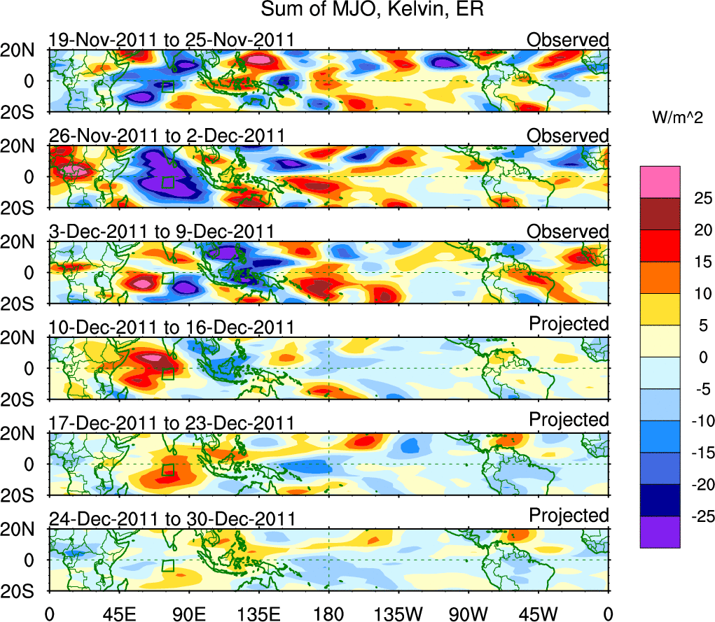 To identify tropical waves in near real-time, the OLR and UTWV data are filtered following Wheeler & Weickmann (2001 MWR). The daily anomalies are calculated using the first 3 harmonics of the seasonal cycle for 1979–2009. Missing values are then filled using linear interpolation in space and time. The most recent 365 days of anomalies are padded with 659 days of zeroes, and the result is filtered for each wave type.