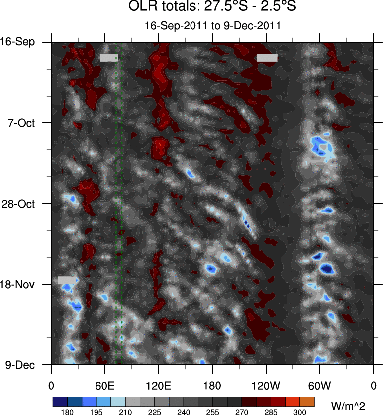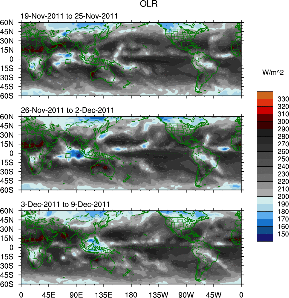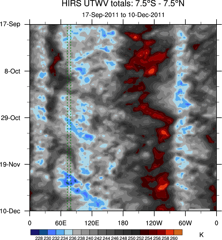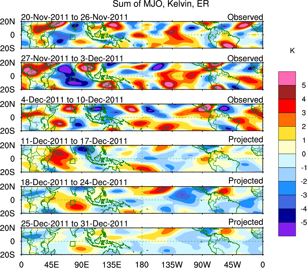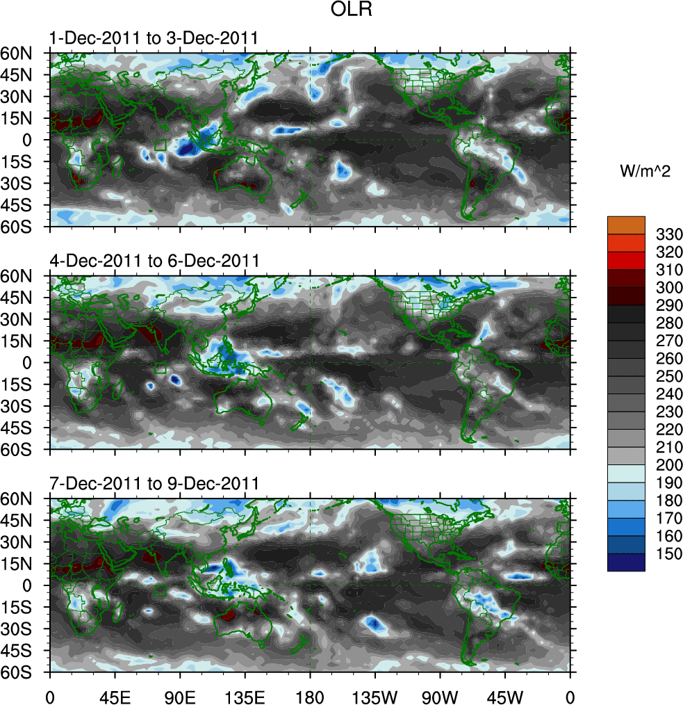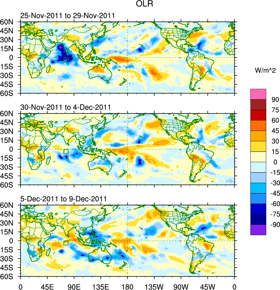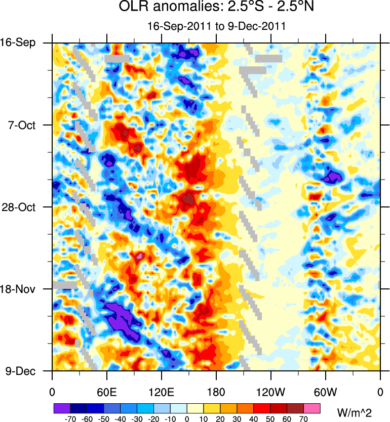 To identify tropical waves in near real-time, the OLR and UTWV data are filtered following Wheeler & Weickmann (2001 MWR). The daily anomalies are calculated using the first 3 harmonics of the seasonal cycle for 1979–2009. Missing values are then filled using linear interpolation in space and time. The most recent 365 days of anomalies are padded with 659 days of zeroes, and the result is filtered for each wave type.