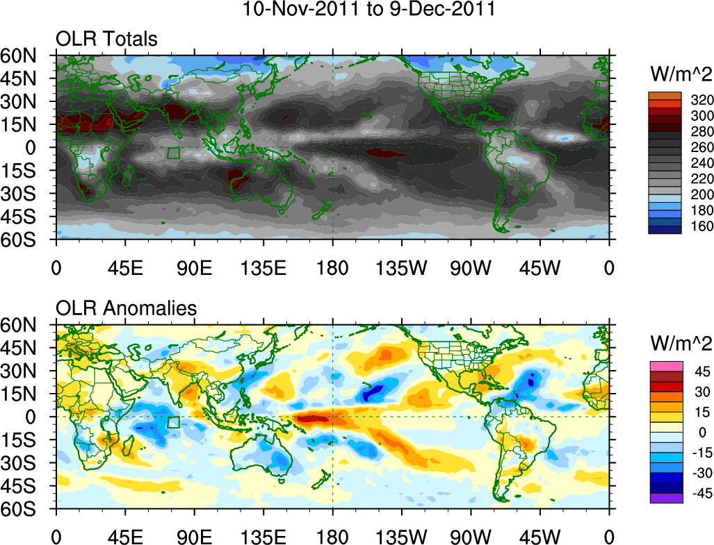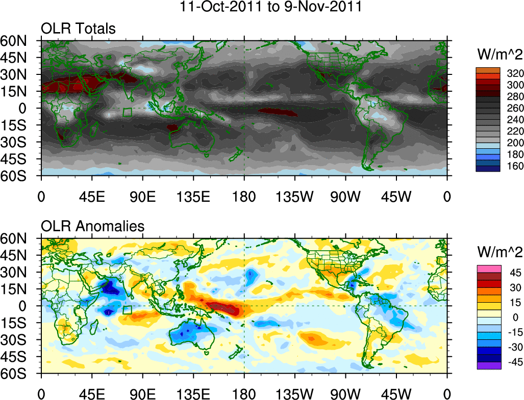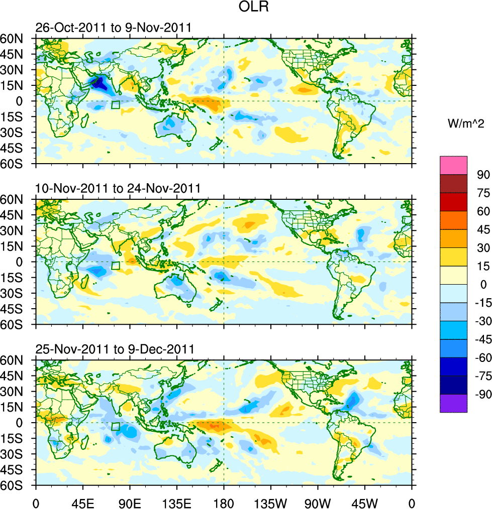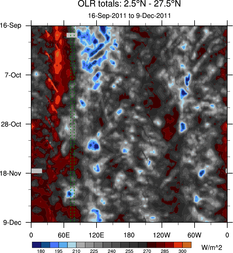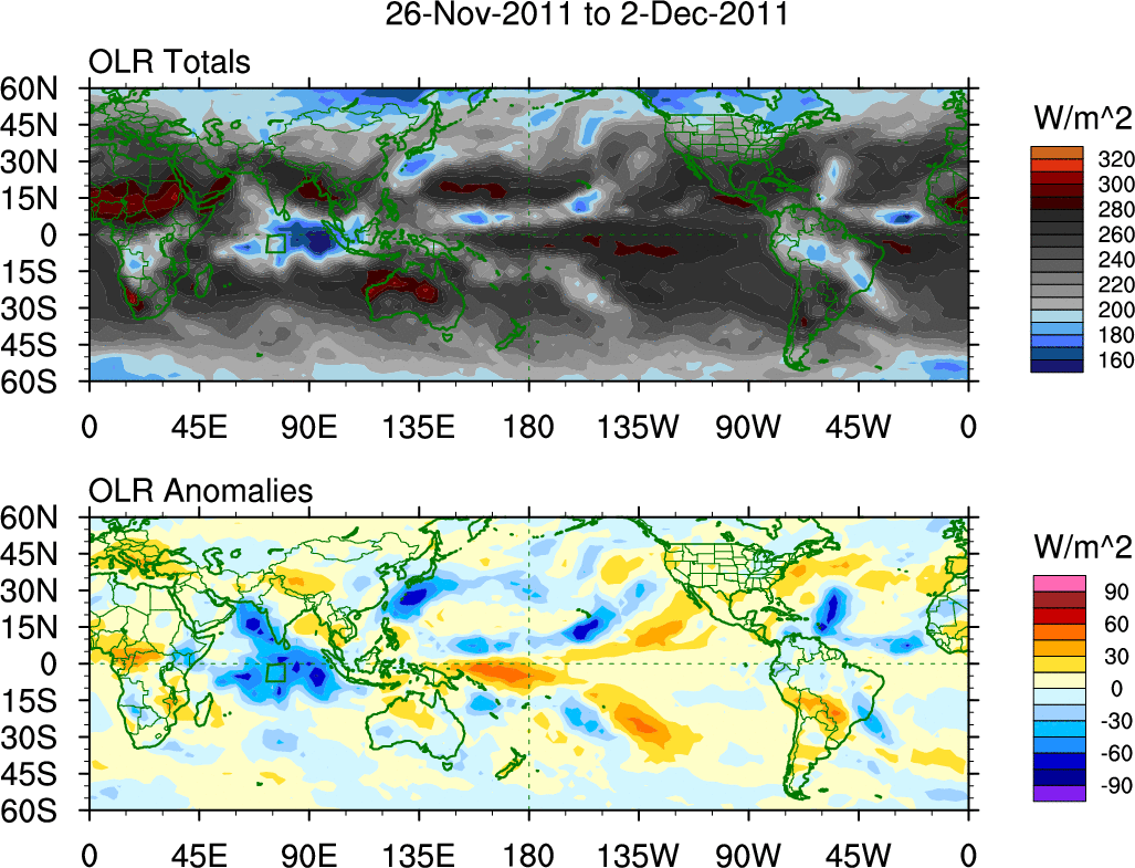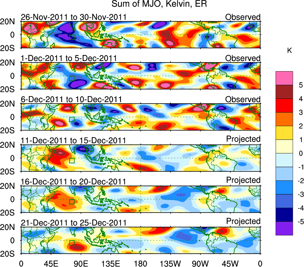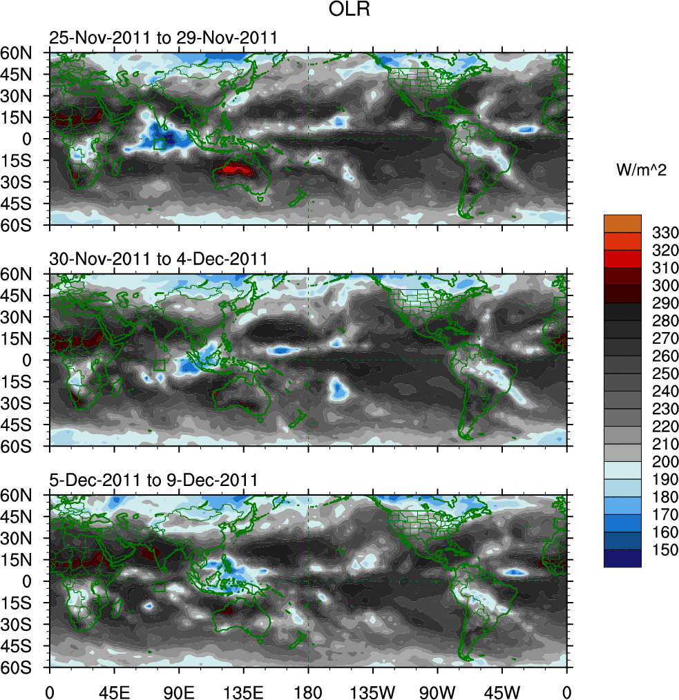 To identify tropical waves in near real-time, the OLR and UTWV data are filtered following Wheeler & Weickmann (2001 MWR). The daily anomalies are calculated using the first 3 harmonics of the seasonal cycle for 1979–2009. Missing values are then filled using linear interpolation in space and time. The most recent 365 days of anomalies are padded with 659 days of zeroes, and the result is filtered for each wave type.