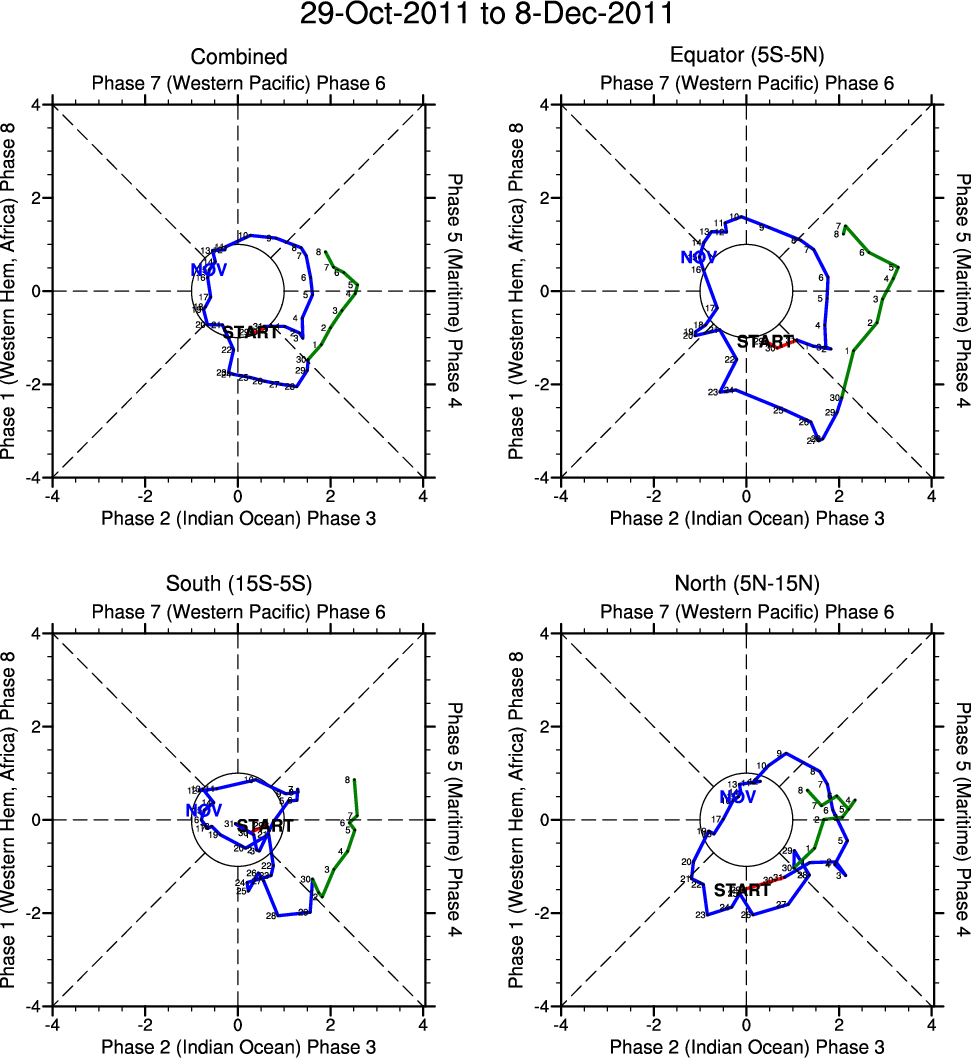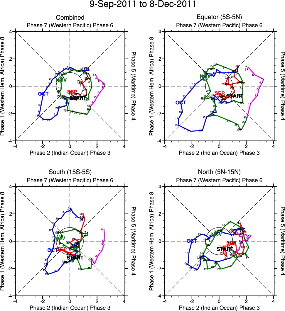 This page takes that simple index and breaks it down into its components, either by variable or by latitude. For latitudes, the data from each latitude band are simply projected onto the original RMM empirical orthogonal functions (EOFs), which were calculated using the full band 15S-15N. For the variables, the data are similarly projected on the original EOFs. In this case, the resulting PCs are re-standardized based on their 1980-2010 time series. This step is necessary for comparison because the OLR PCs have significantly lower amplitudes.