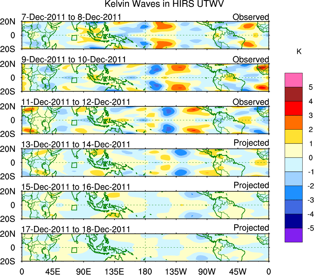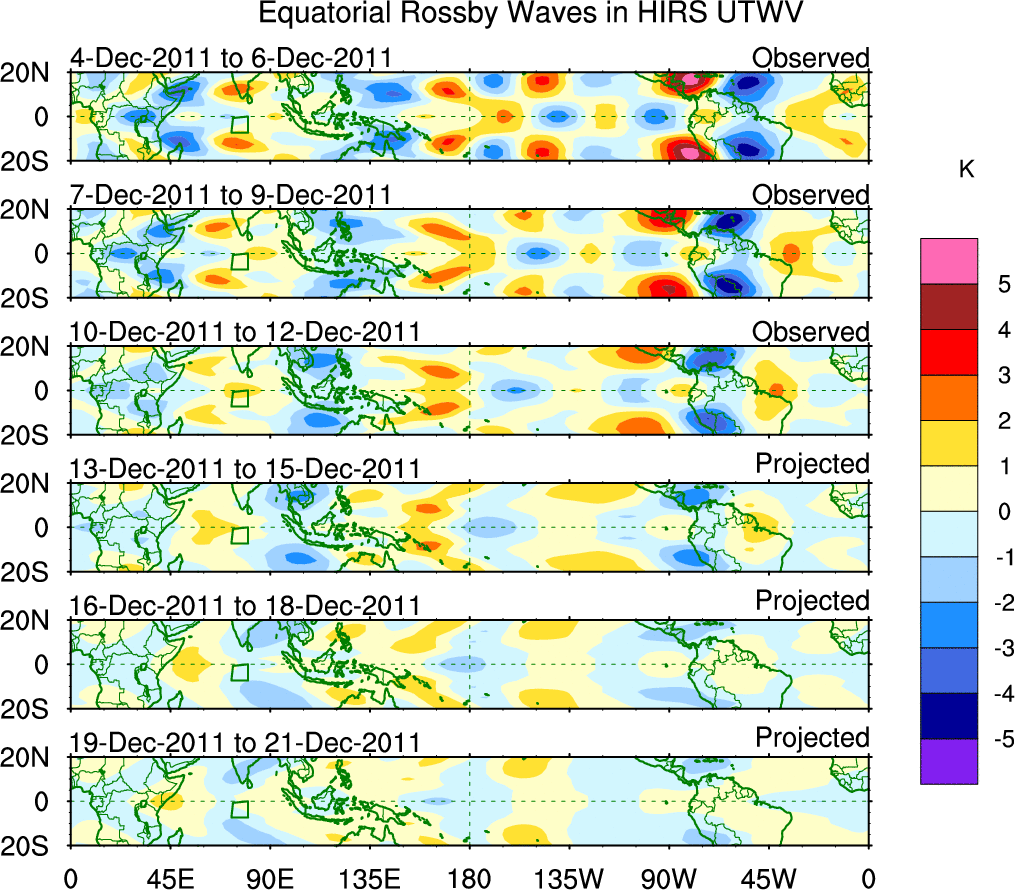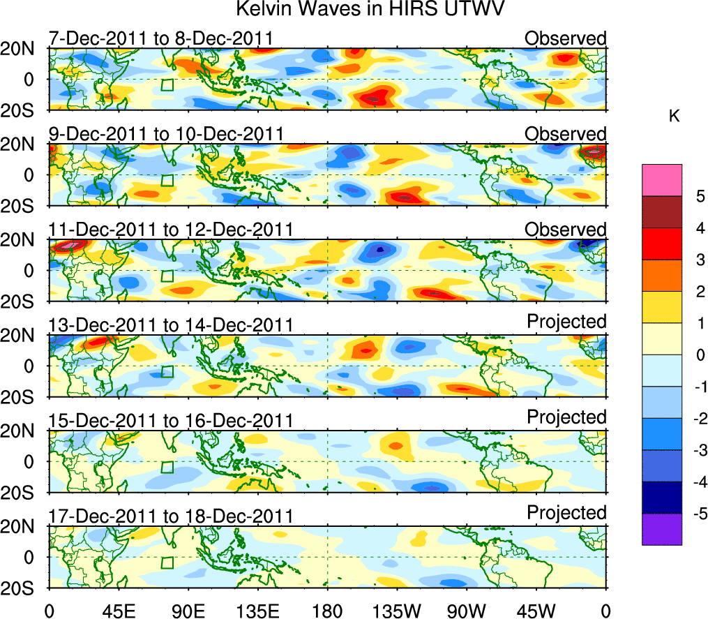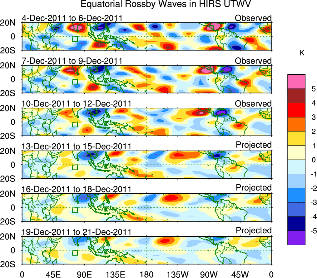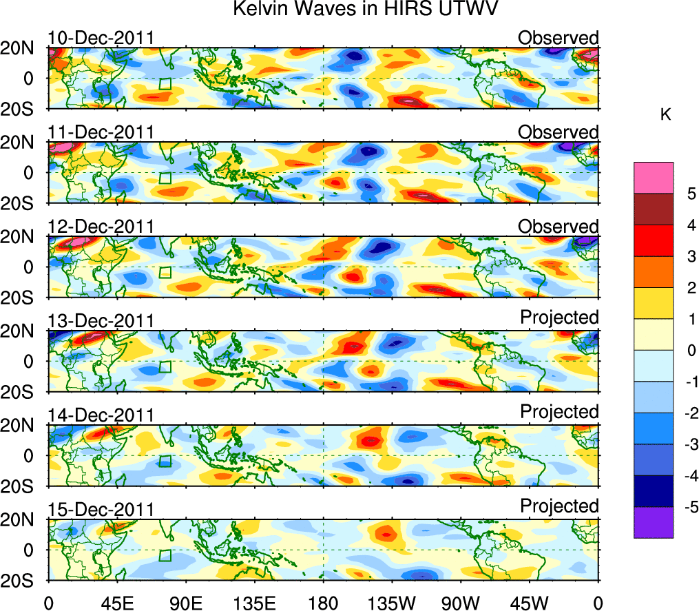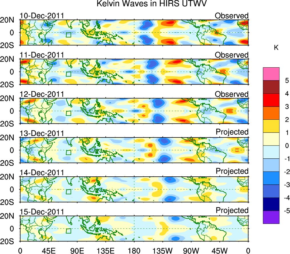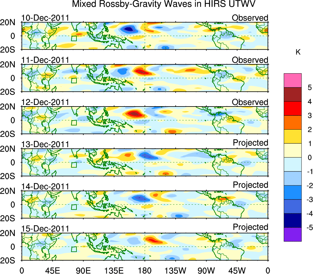 To identify tropical waves in near real-time, the OLR and UTWV data are filtered following Wheeler & Weickmann (2001 MWR). The daily anomalies are calculated using the first 3 harmonics of the seasonal cycle for 1979–2009. Missing values are then filled using linear interpolation in space and time. The most recent 365 days of anomalies are padded with 659 days of zeroes, and the result is filtered for each wave type.