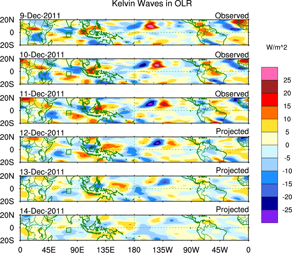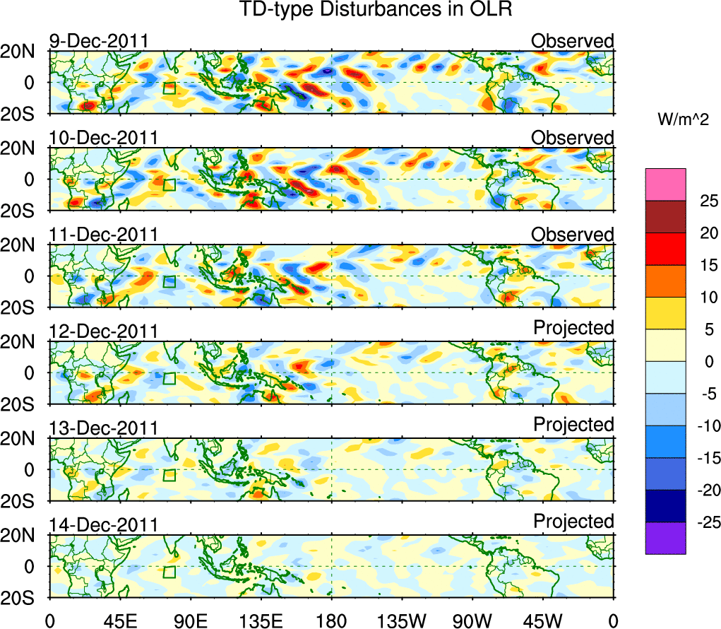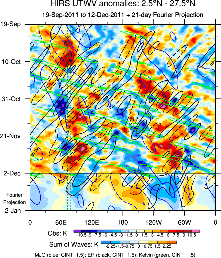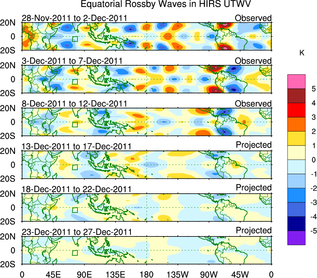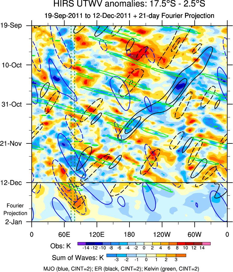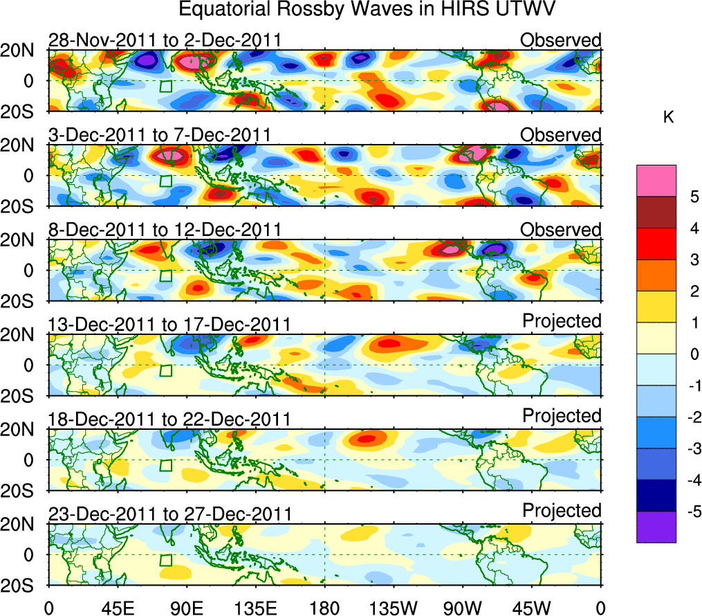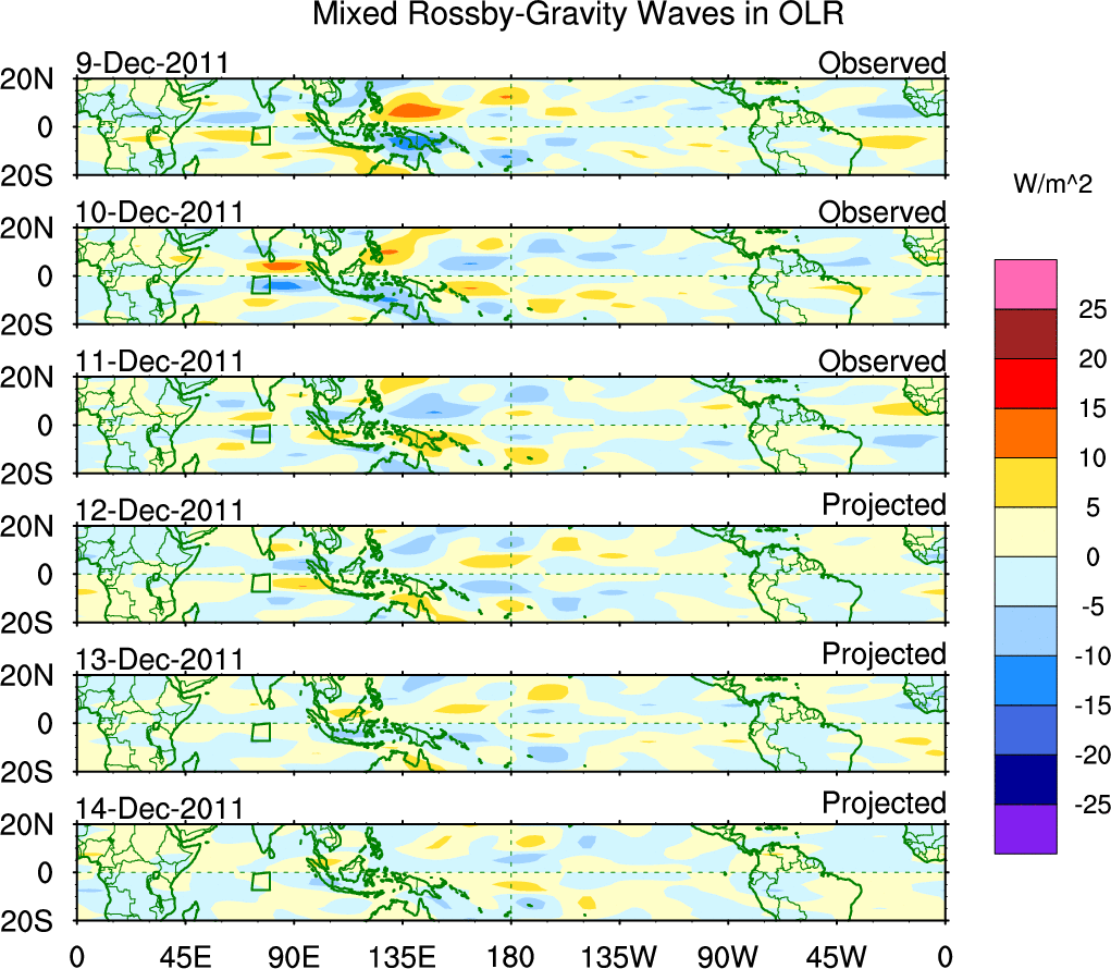 To identify tropical waves in near real-time, the OLR and UTWV data are filtered following Wheeler & Weickmann (2001 MWR). The daily anomalies are calculated using the first 3 harmonics of the seasonal cycle for 1979–2009. Missing values are then filled using linear interpolation in space and time. The most recent 365 days of anomalies are padded with 659 days of zeroes, and the result is filtered for each wave type.