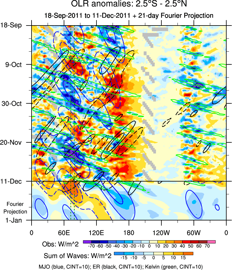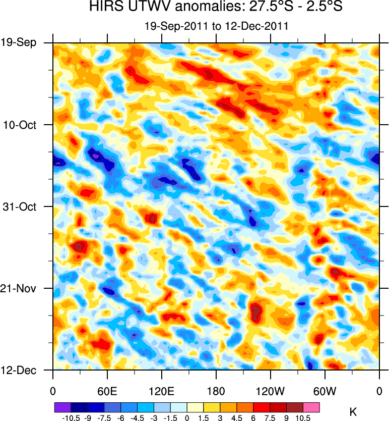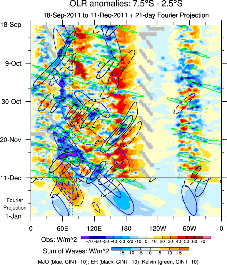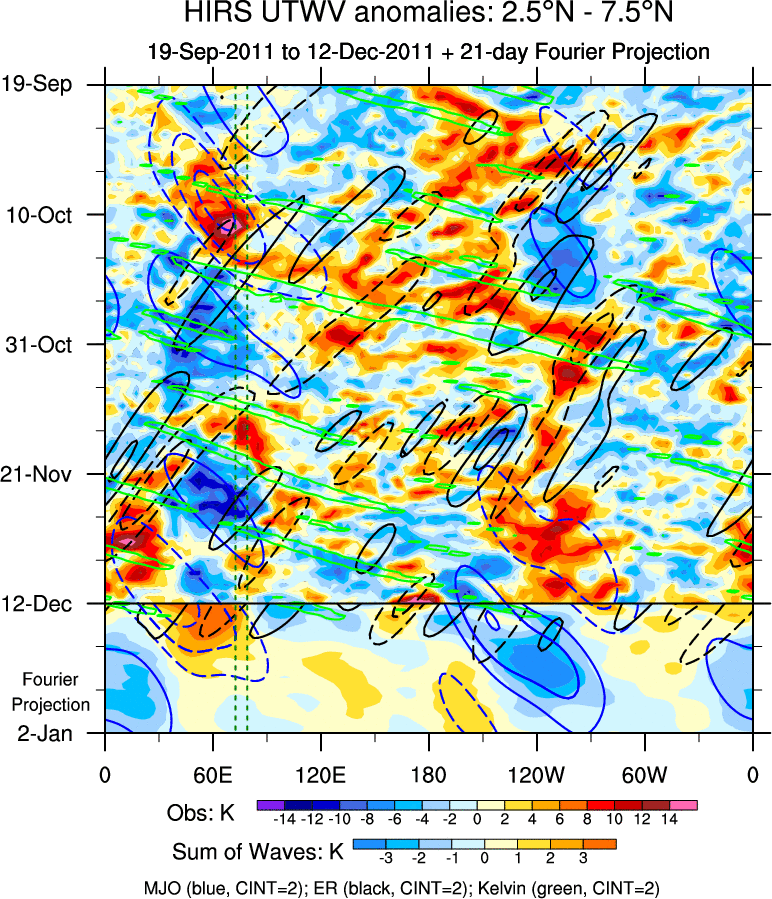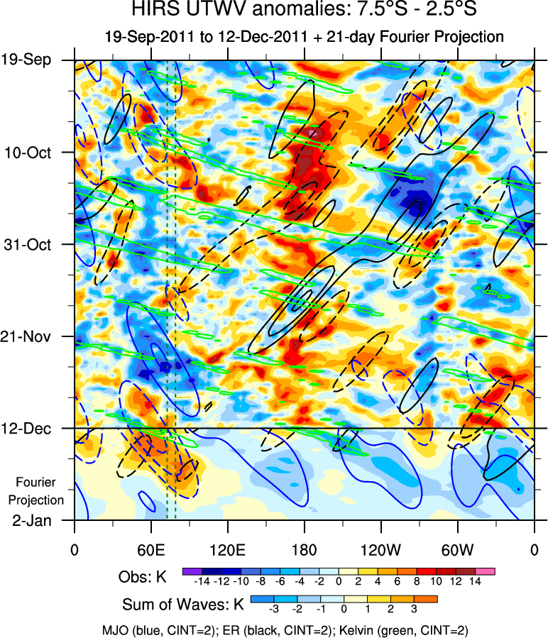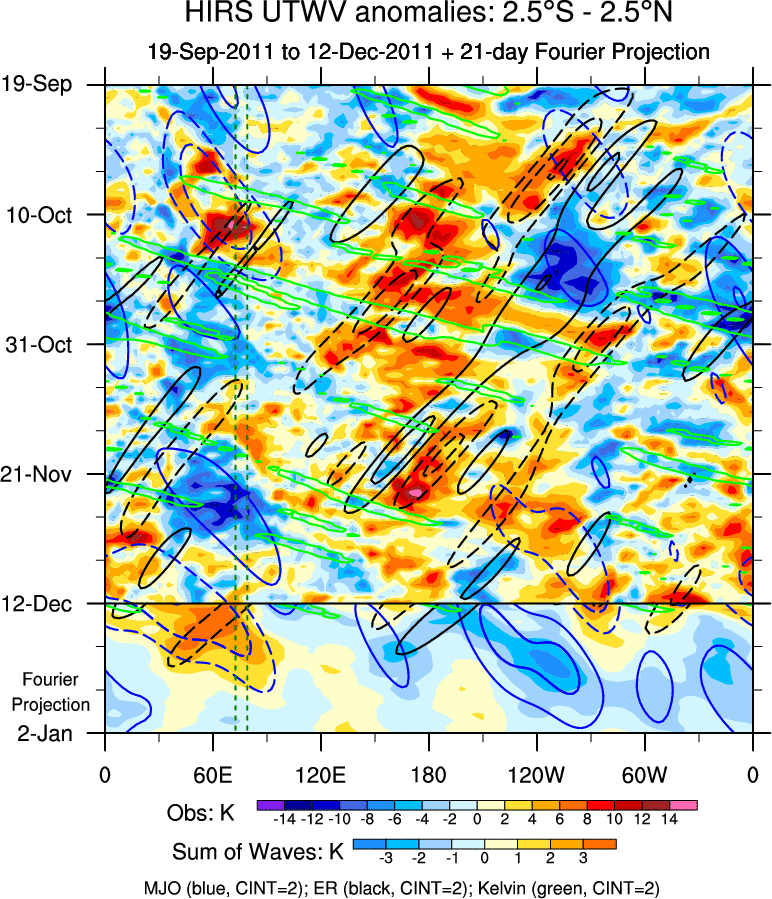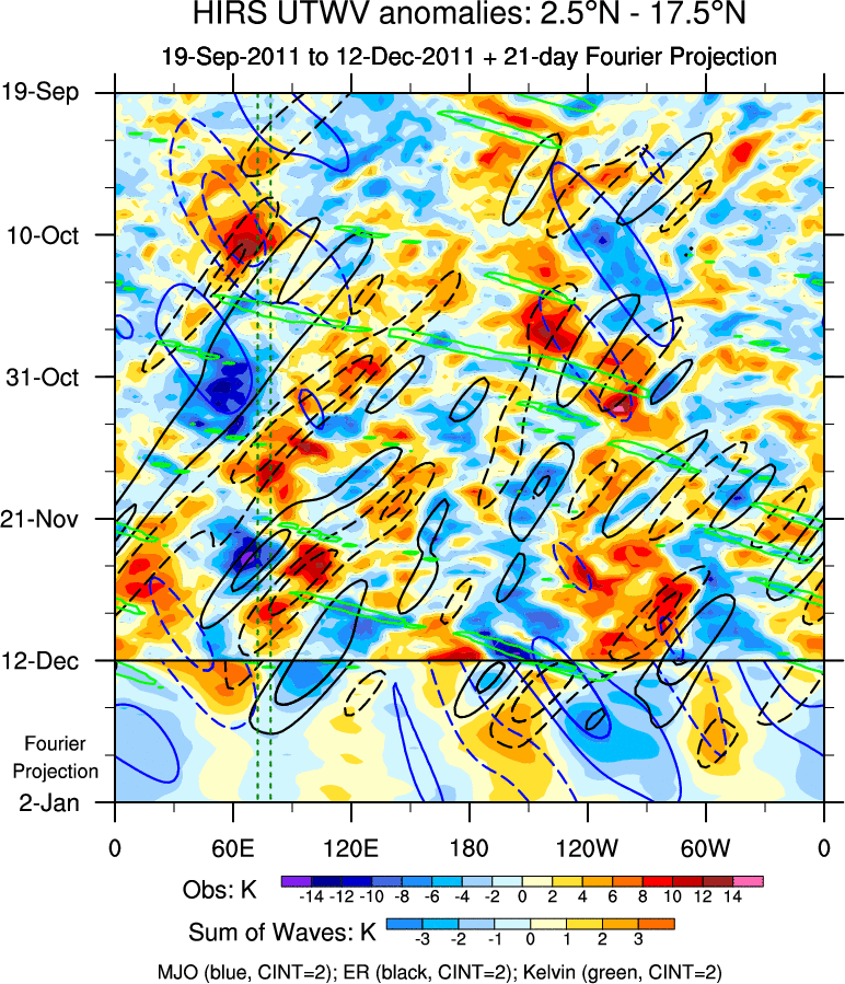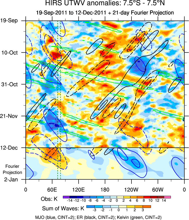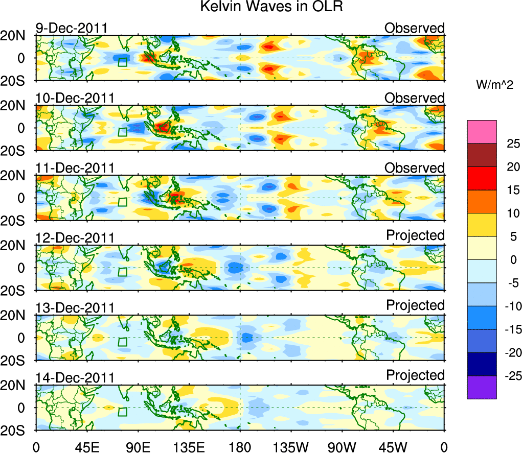 To identify tropical waves in near real-time, the OLR and UTWV data are filtered following Wheeler & Weickmann (2001 MWR). The daily anomalies are calculated using the first 3 harmonics of the seasonal cycle for 1979–2009. Missing values are then filled using linear interpolation in space and time. The most recent 365 days of anomalies are padded with 659 days of zeroes, and the result is filtered for each wave type.