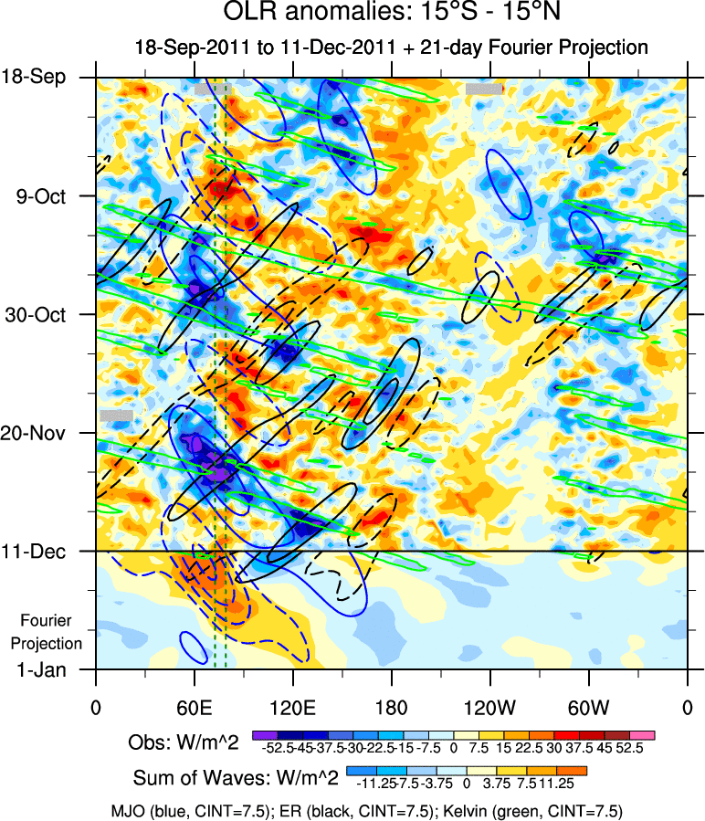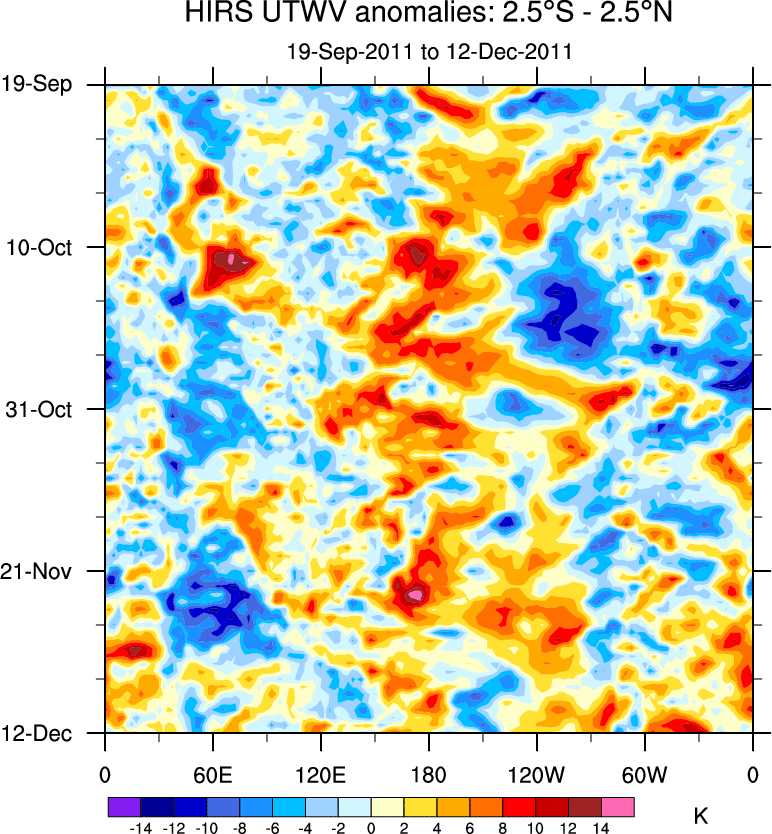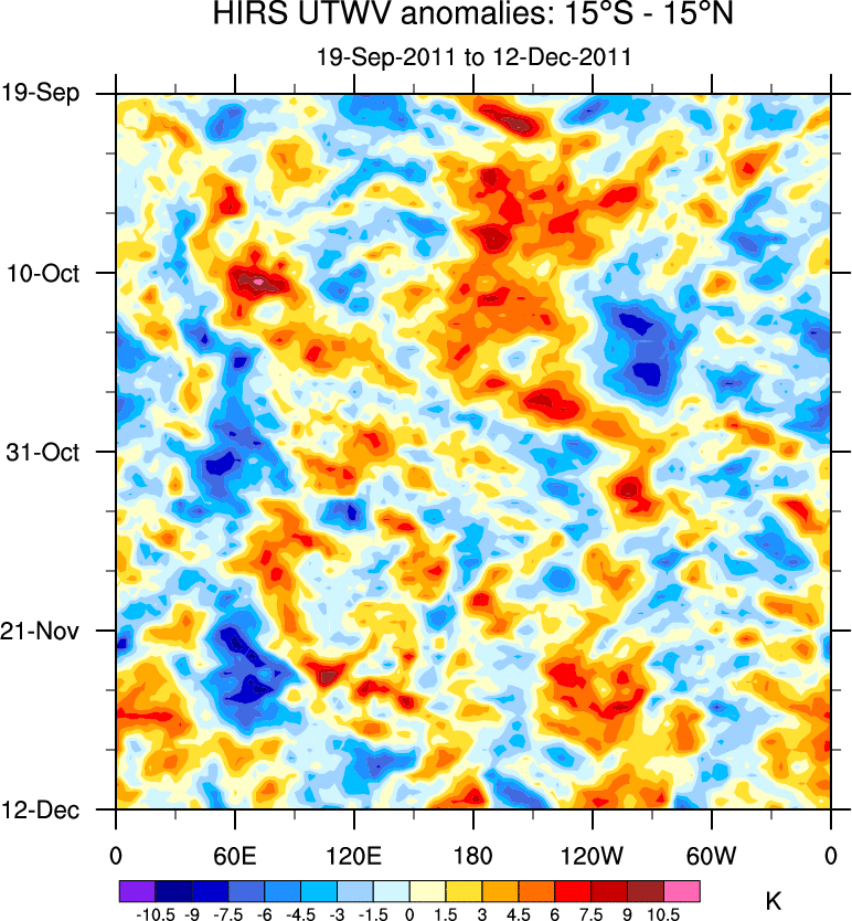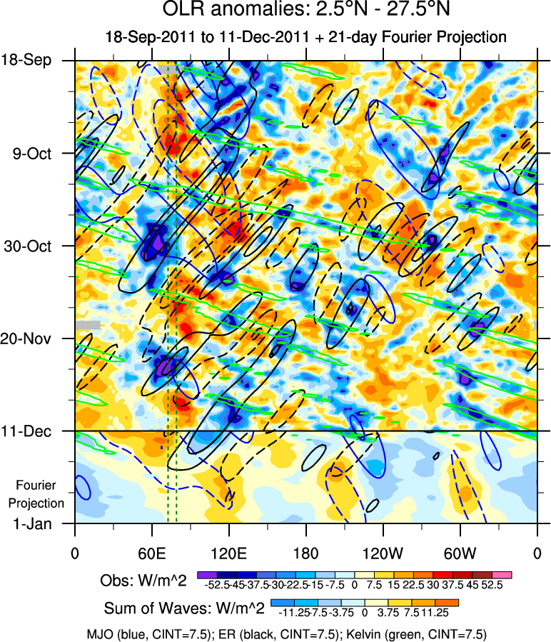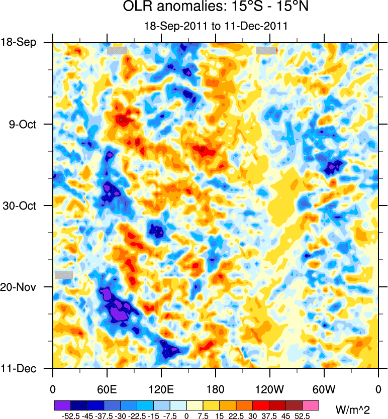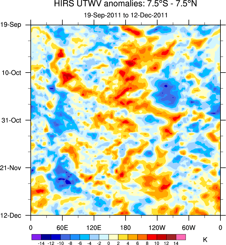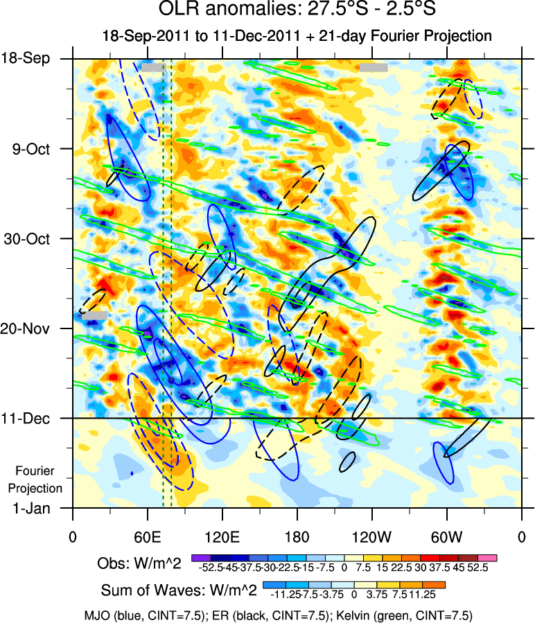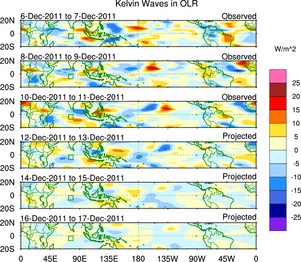 To identify tropical waves in near real-time, the OLR and UTWV data are filtered following Wheeler & Weickmann (2001 MWR). The daily anomalies are calculated using the first 3 harmonics of the seasonal cycle for 1979–2009. Missing values are then filled using linear interpolation in space and time. The most recent 365 days of anomalies are padded with 659 days of zeroes, and the result is filtered for each wave type.