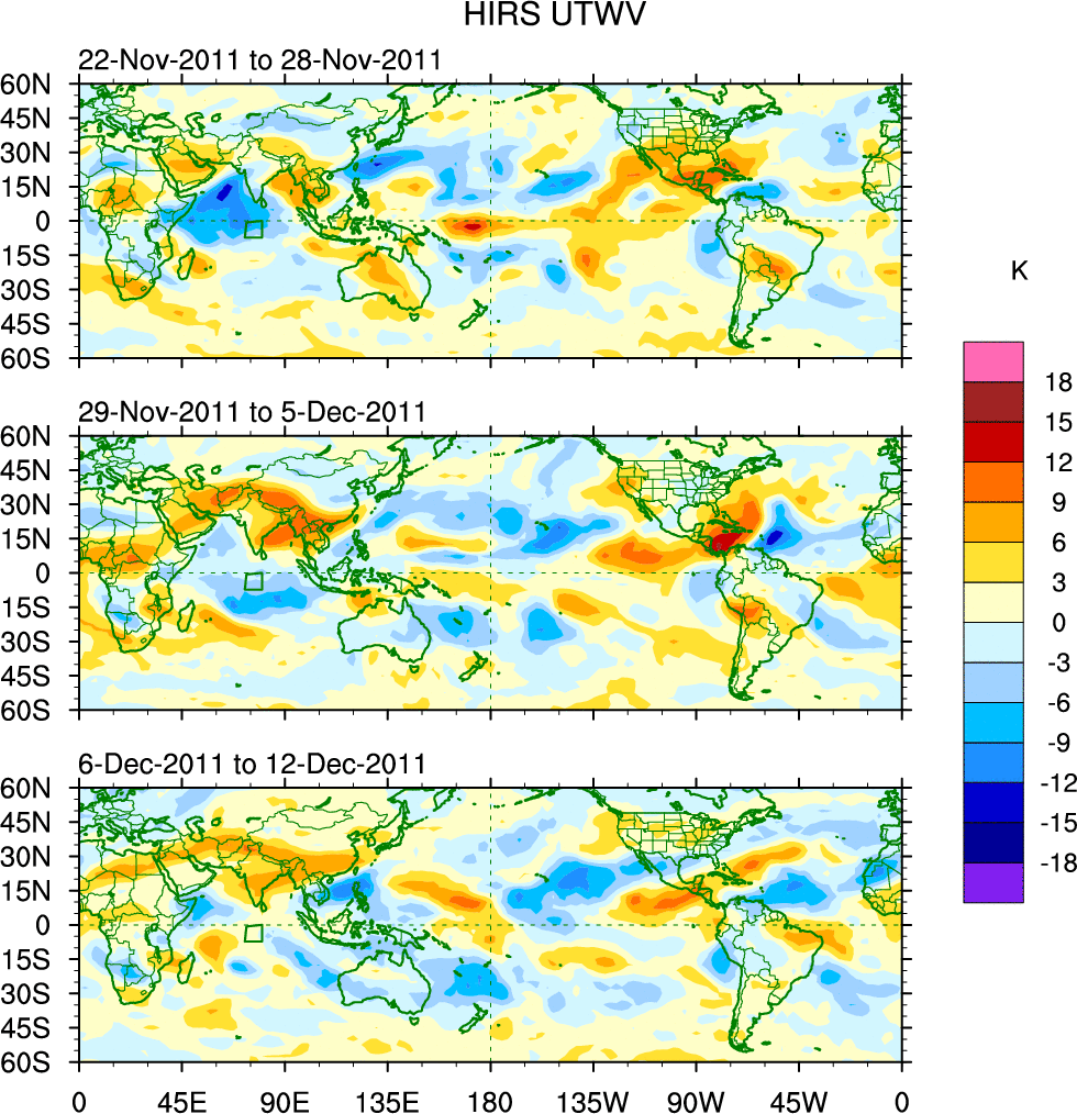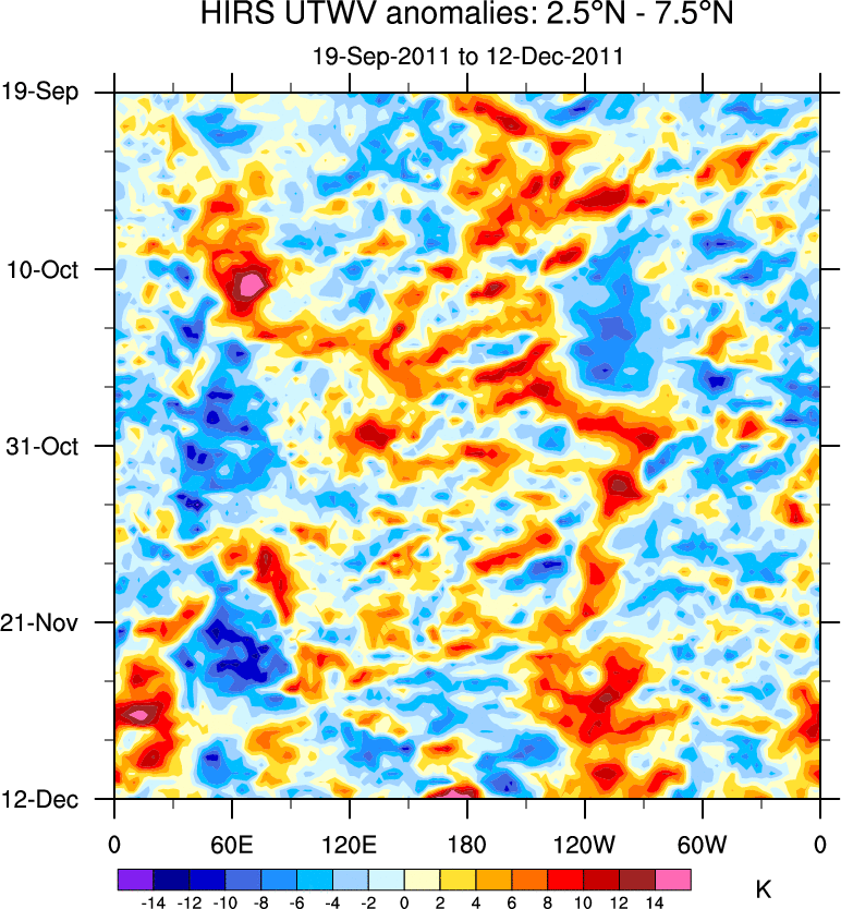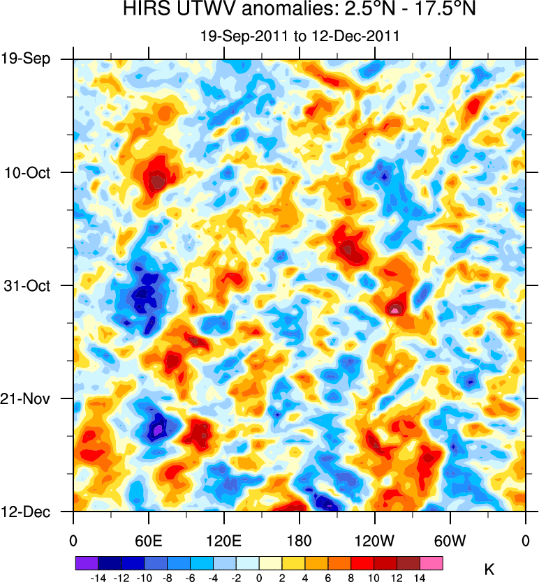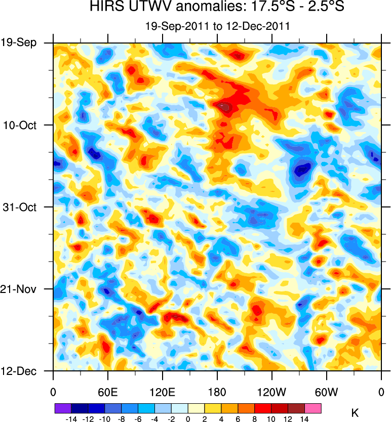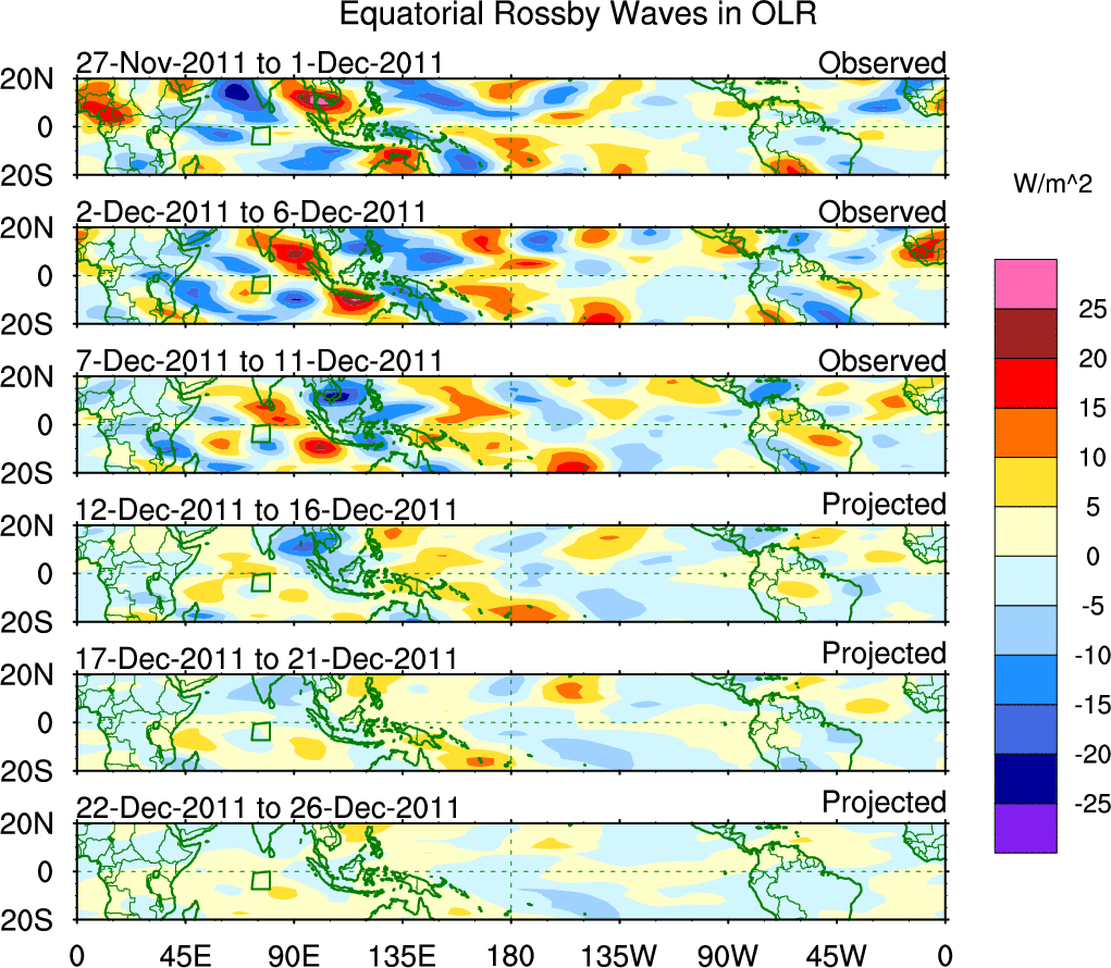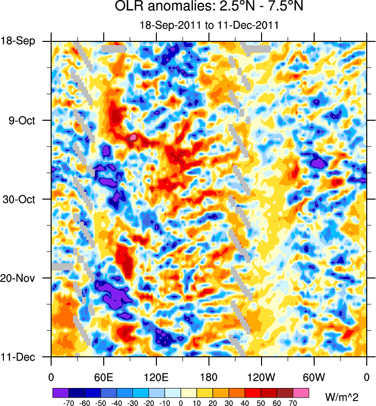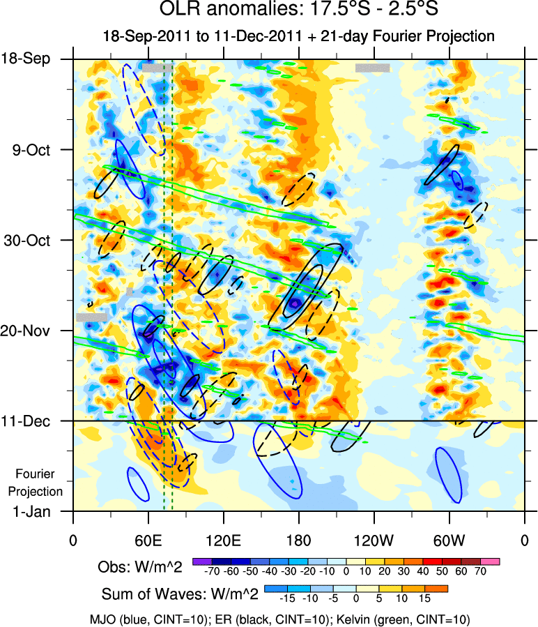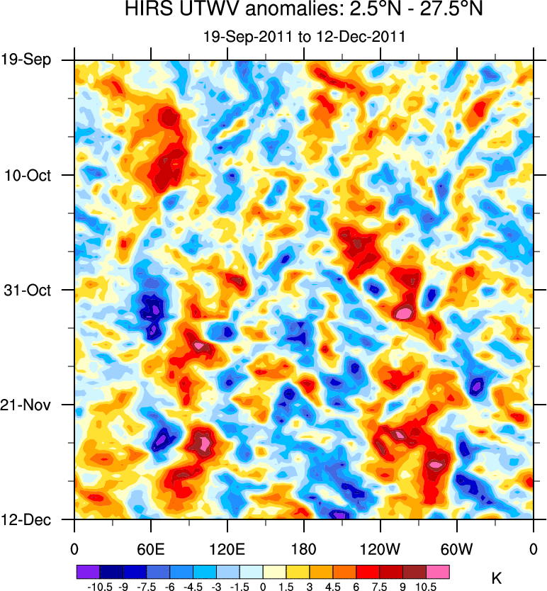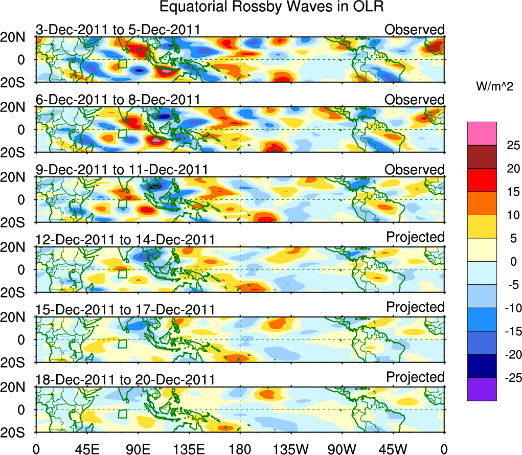To identify tropical waves in near real-time, the OLR and UTWV data are filtered following Wheeler & Weickmann (2001 MWR). The daily anomalies are calculated using the first 3 harmonics of the seasonal cycle for 1979–2009. Missing values are then filled using linear interpolation in space and time. The most recent 365 days of anomalies are padded with 659 days of zeroes, and the result is filtered for each wave type.