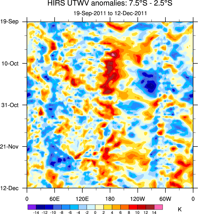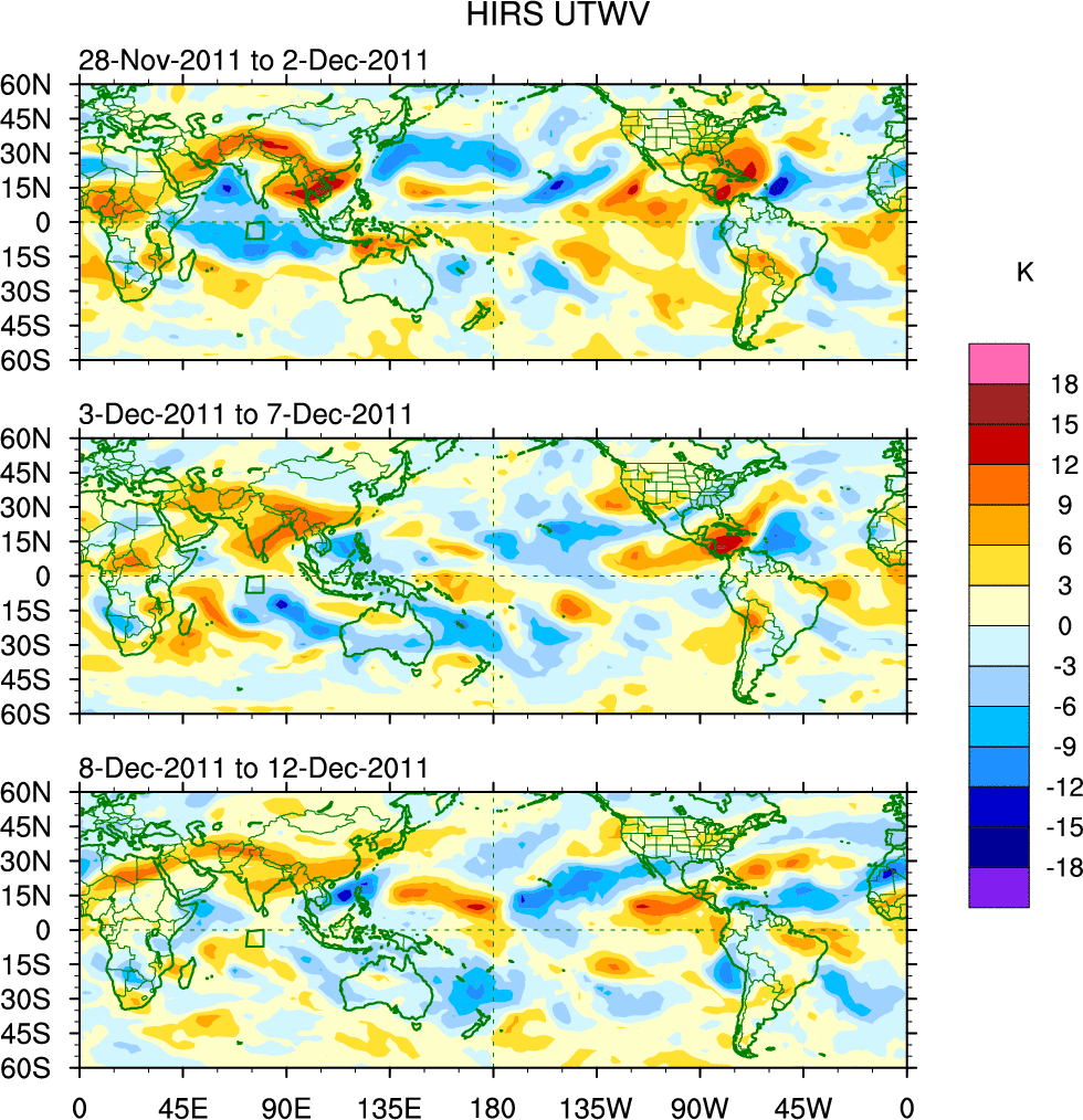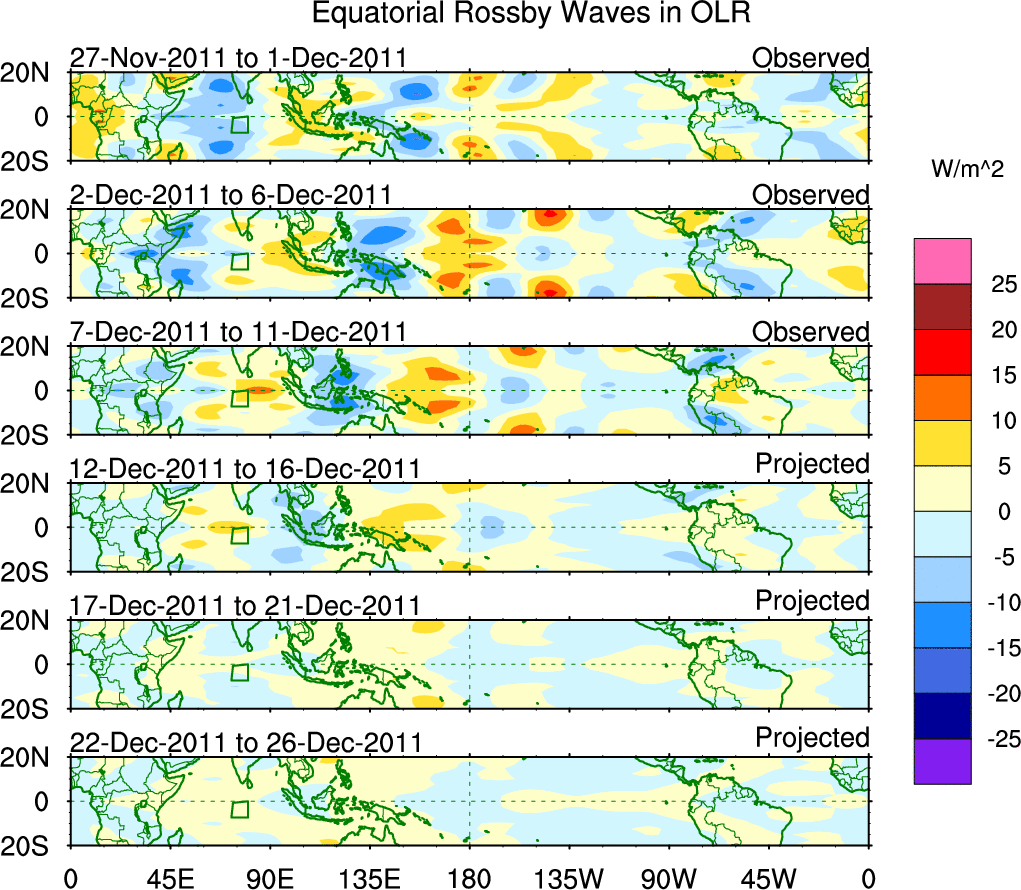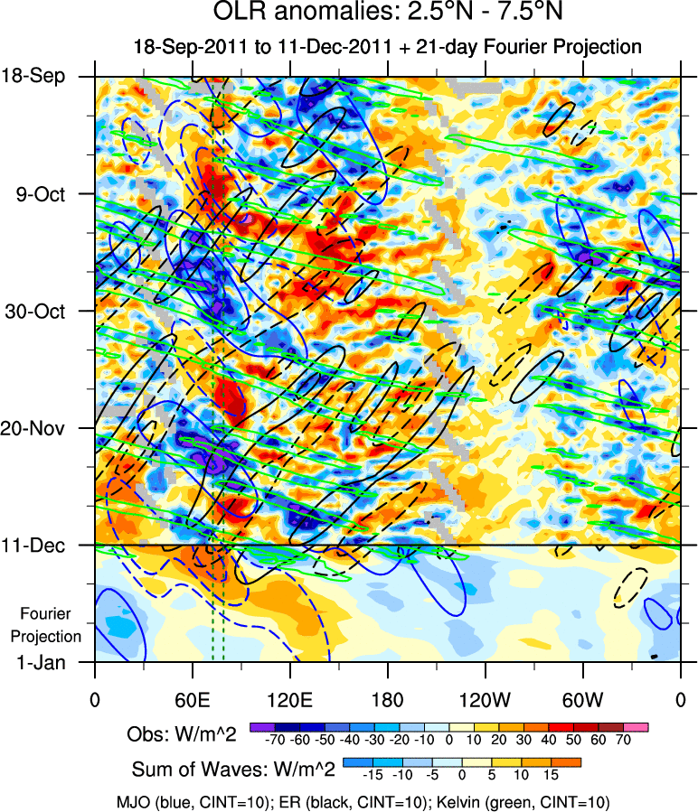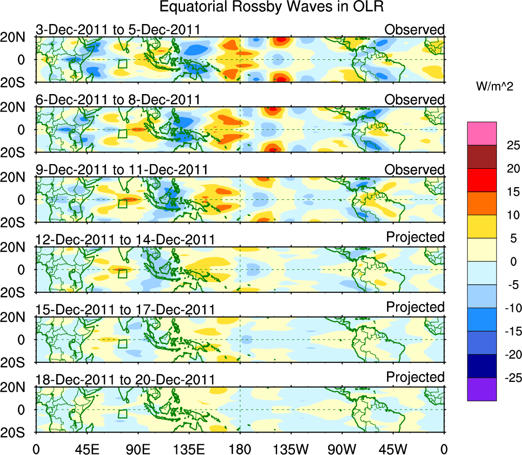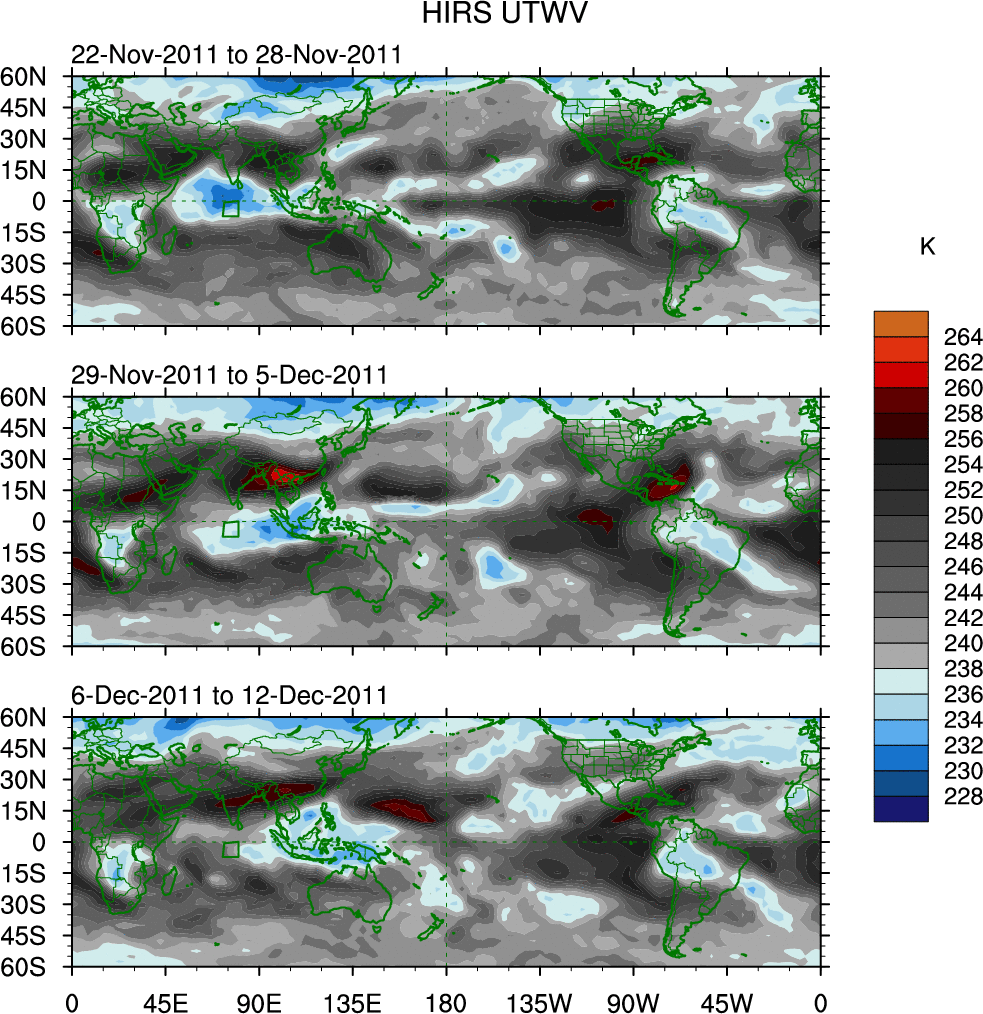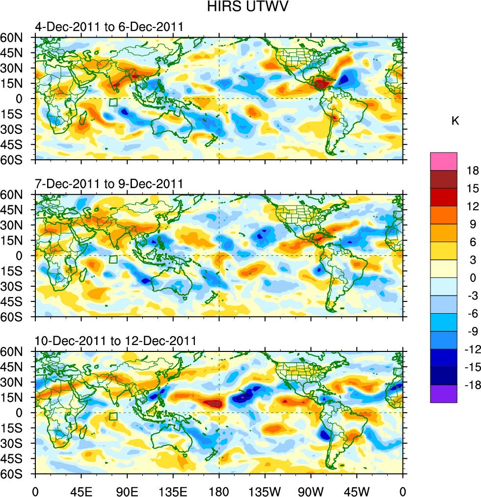 To identify tropical waves in near real-time, the OLR and UTWV data are filtered following Wheeler & Weickmann (2001 MWR). The daily anomalies are calculated using the first 3 harmonics of the seasonal cycle for 1979–2009. Missing values are then filled using linear interpolation in space and time. The most recent 365 days of anomalies are padded with 659 days of zeroes, and the result is filtered for each wave type.