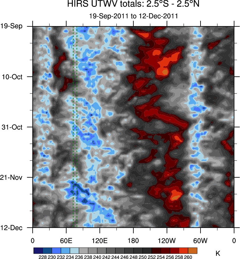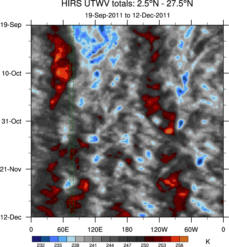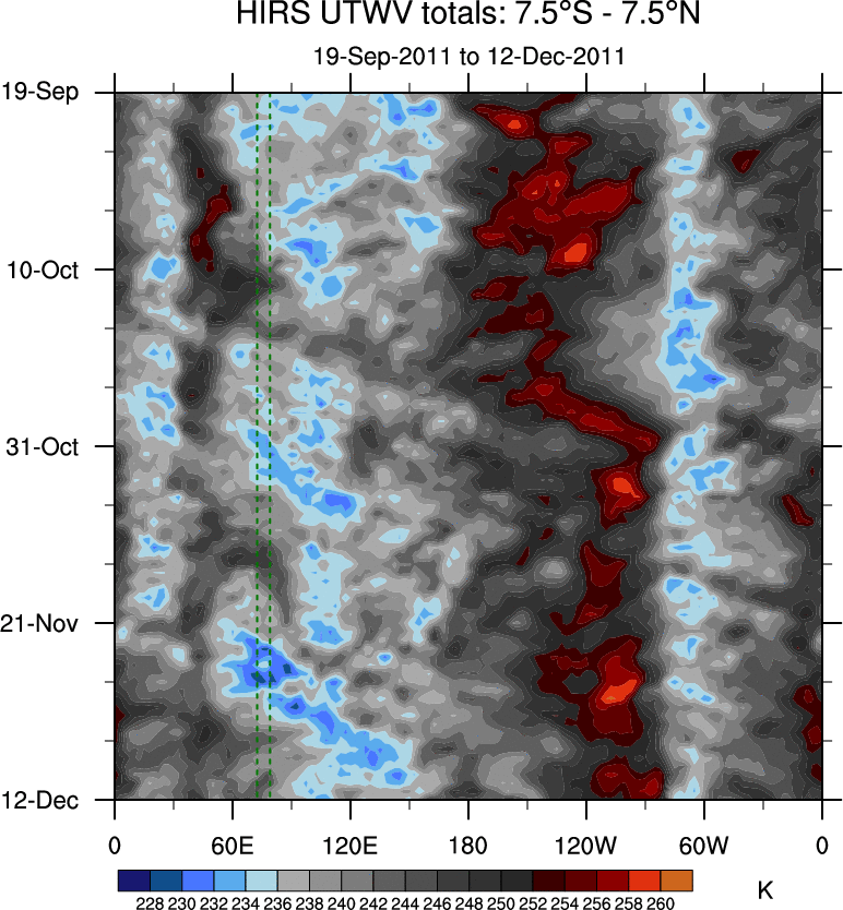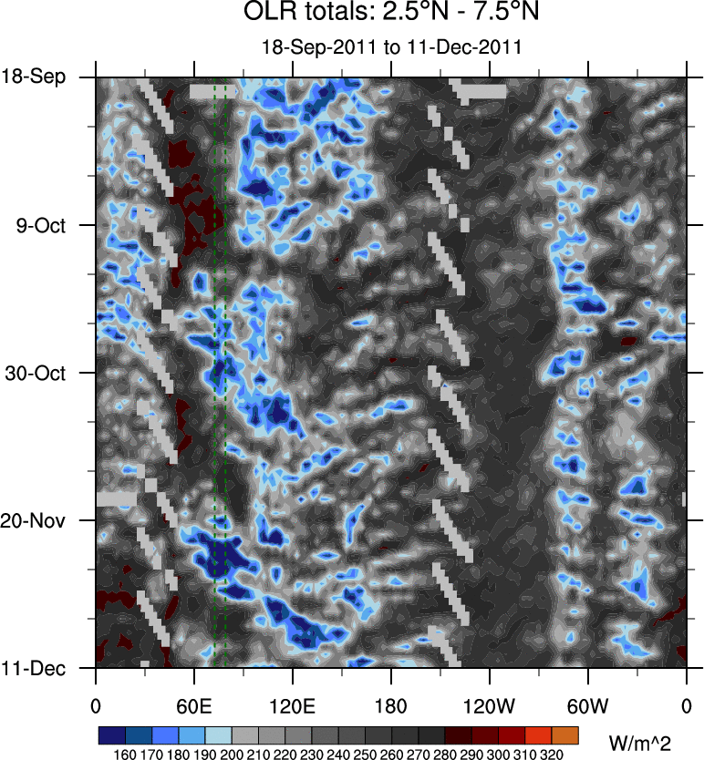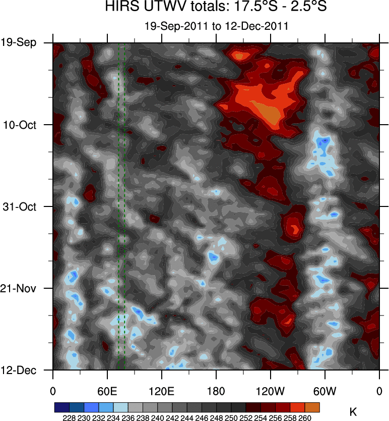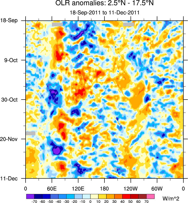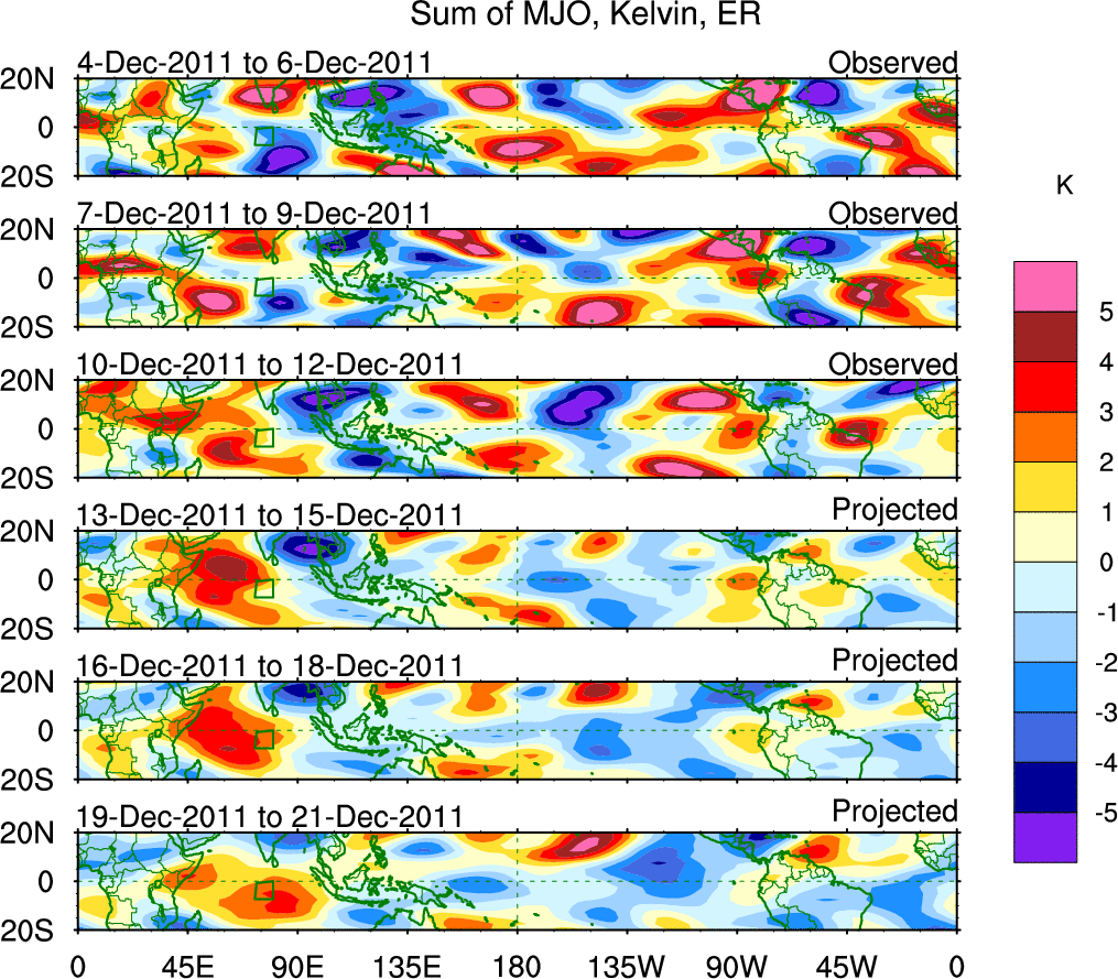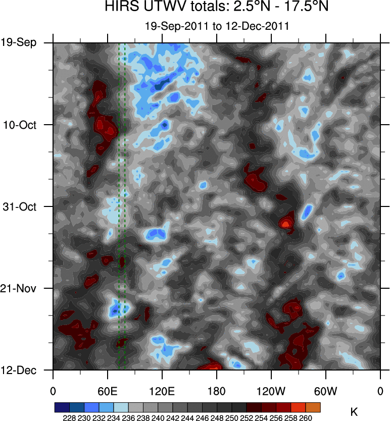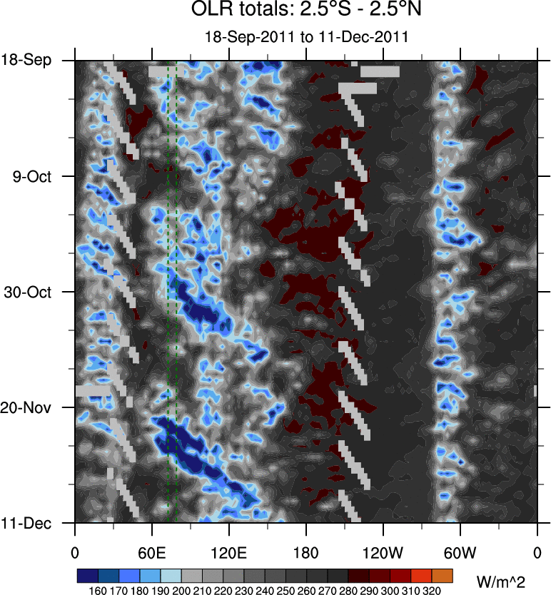To identify tropical waves in near real-time, the OLR and UTWV data are filtered following Wheeler & Weickmann (2001 MWR). The daily anomalies are calculated using the first 3 harmonics of the seasonal cycle for 1979–2009. Missing values are then filled using linear interpolation in space and time. The most recent 365 days of anomalies are padded with 659 days of zeroes, and the result is filtered for each wave type.