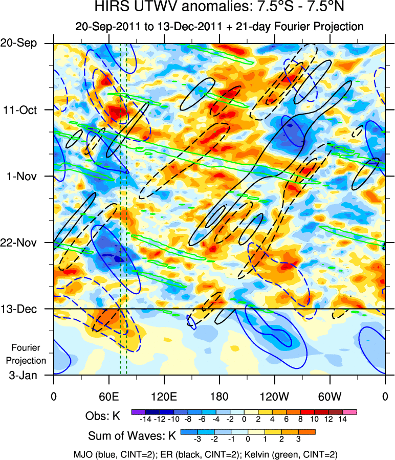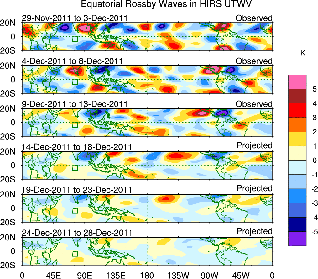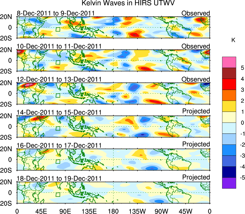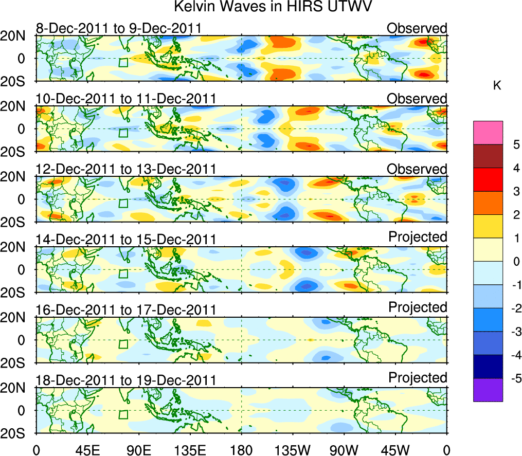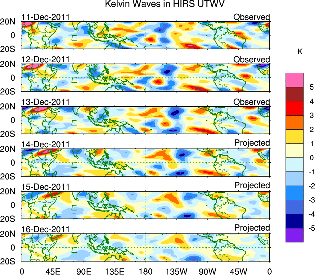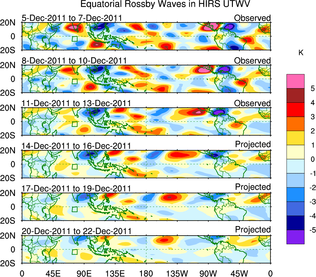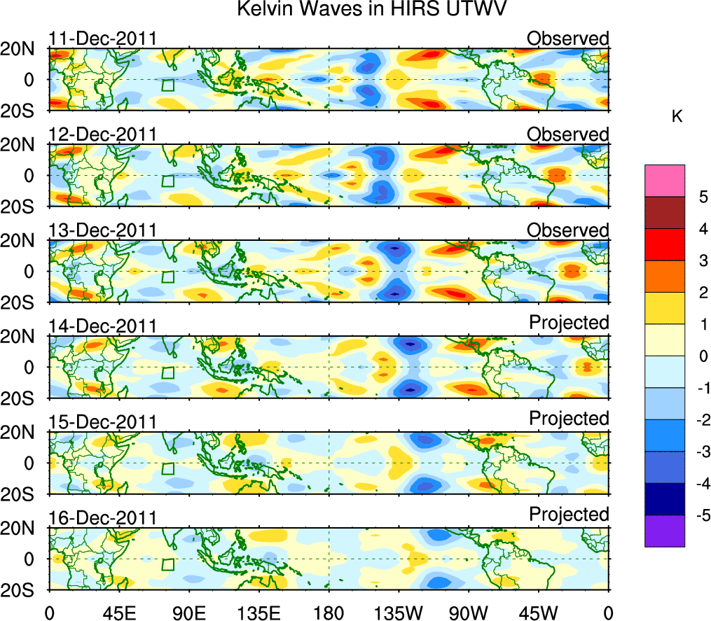 To identify tropical waves in near real-time, the OLR and UTWV data are filtered following Wheeler & Weickmann (2001 MWR). The daily anomalies are calculated using the first 3 harmonics of the seasonal cycle for 1979–2009. Missing values are then filled using linear interpolation in space and time. The most recent 365 days of anomalies are padded with 659 days of zeroes, and the result is filtered for each wave type.