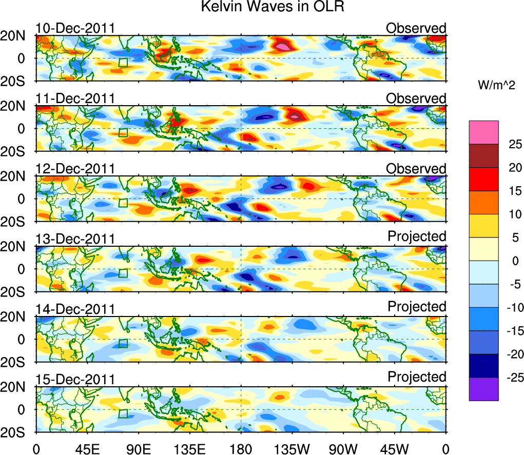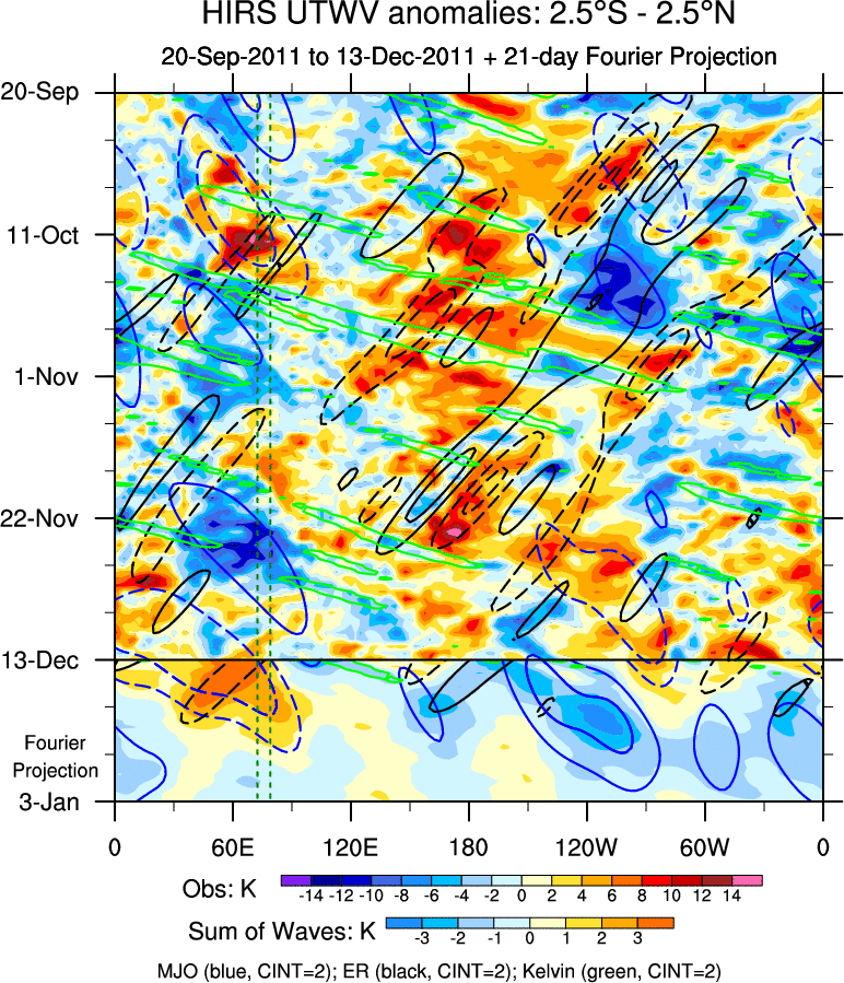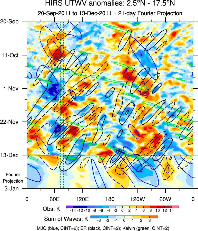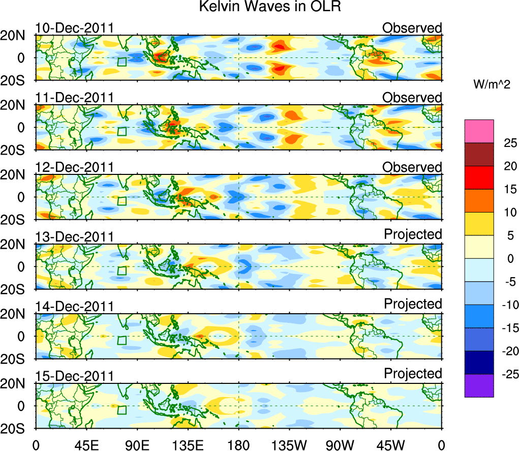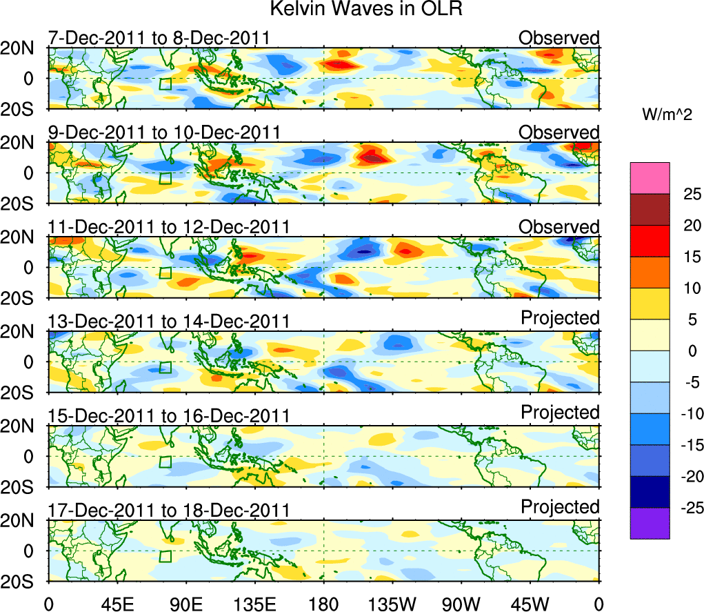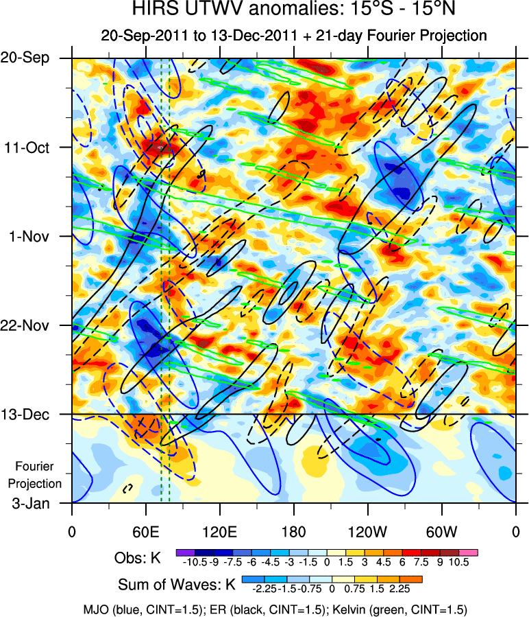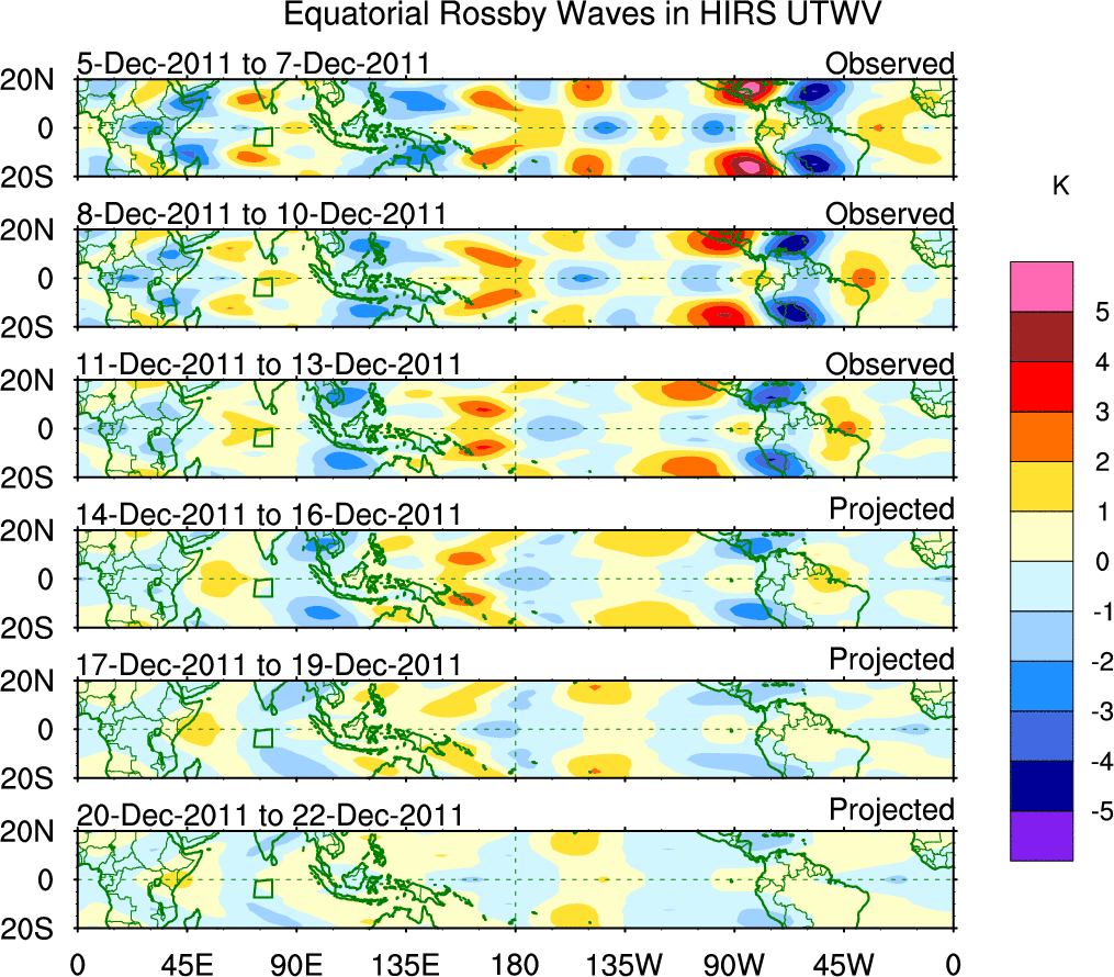 To identify tropical waves in near real-time, the OLR and UTWV data are filtered following Wheeler & Weickmann (2001 MWR). The daily anomalies are calculated using the first 3 harmonics of the seasonal cycle for 1979–2009. Missing values are then filled using linear interpolation in space and time. The most recent 365 days of anomalies are padded with 659 days of zeroes, and the result is filtered for each wave type.