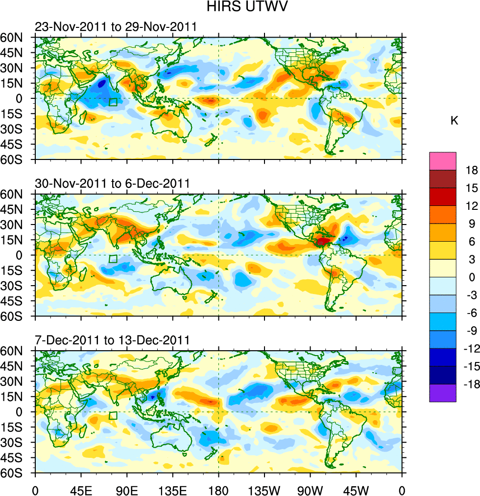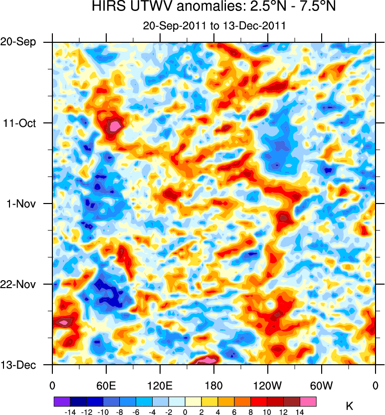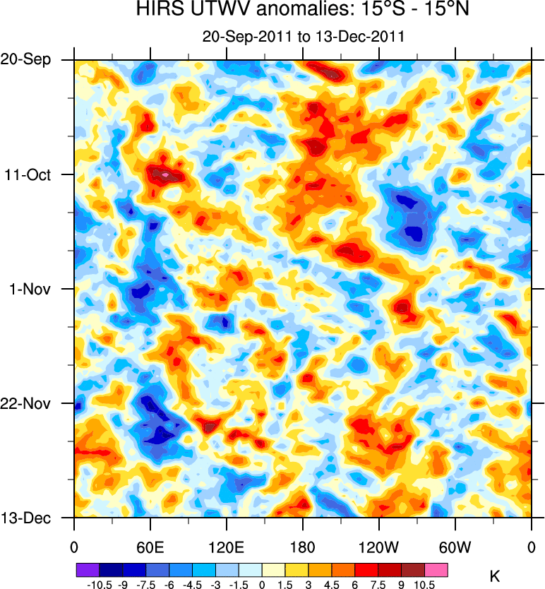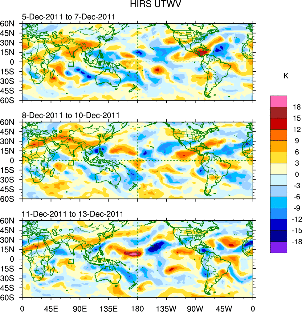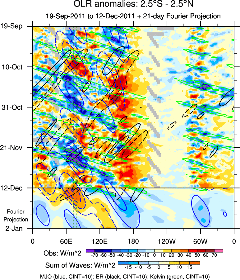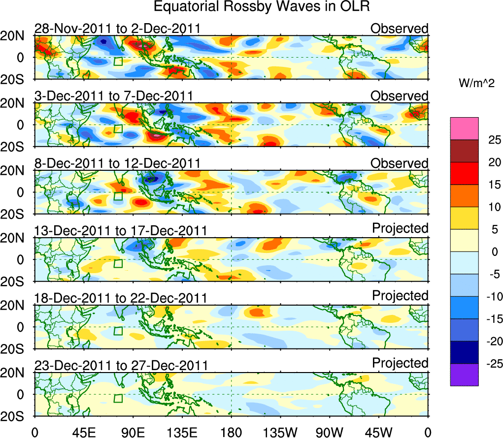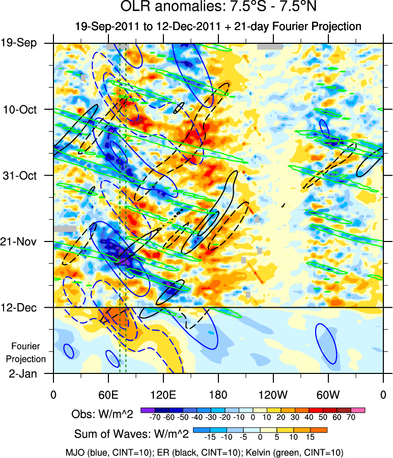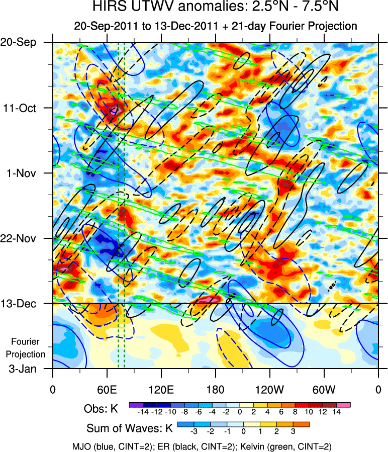 To identify tropical waves in near real-time, the OLR and UTWV data are filtered following Wheeler & Weickmann (2001 MWR). The daily anomalies are calculated using the first 3 harmonics of the seasonal cycle for 1979–2009. Missing values are then filled using linear interpolation in space and time. The most recent 365 days of anomalies are padded with 659 days of zeroes, and the result is filtered for each wave type.