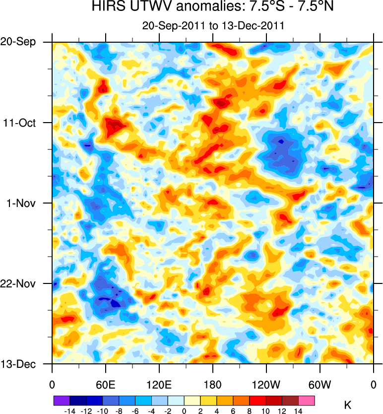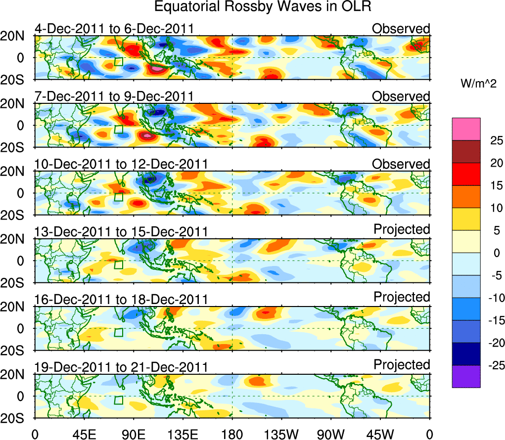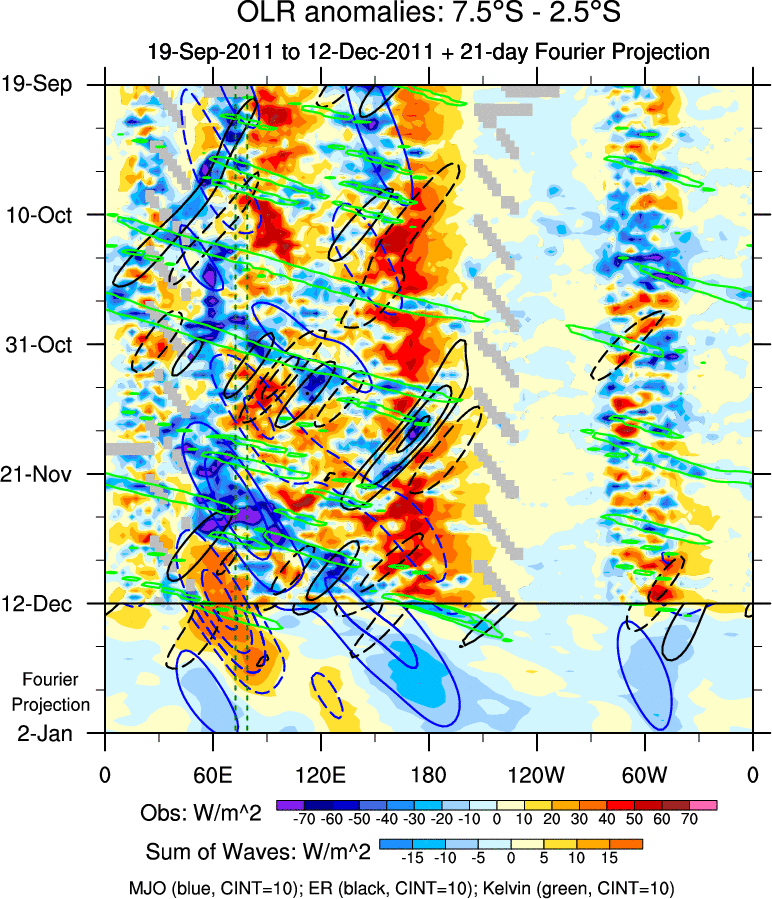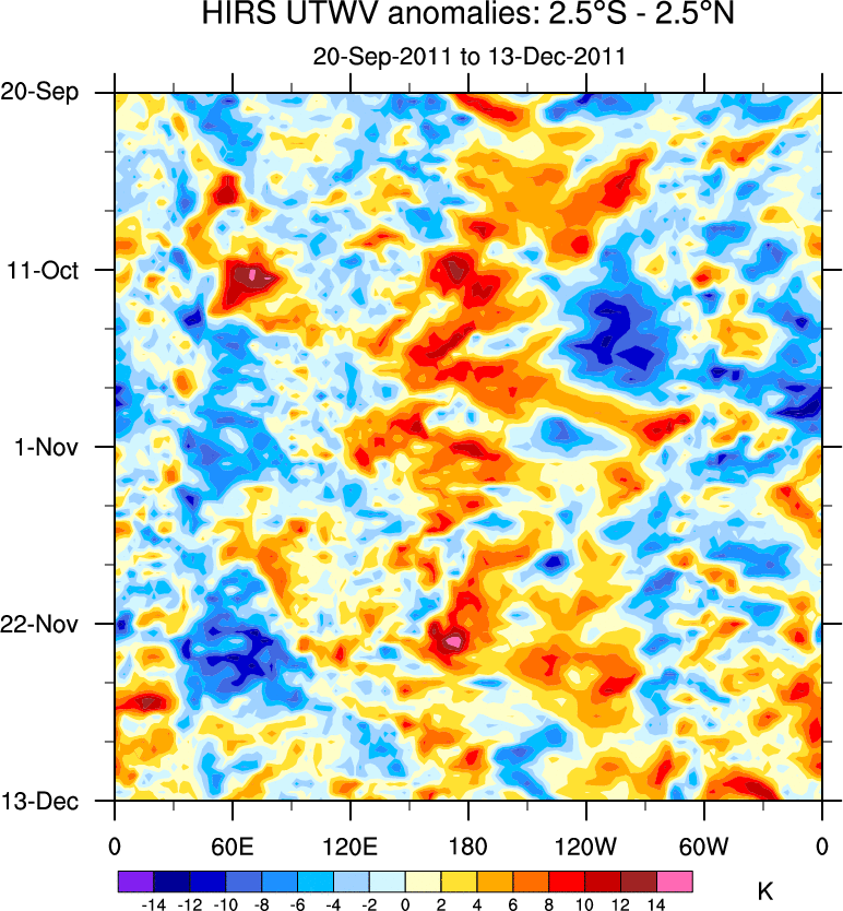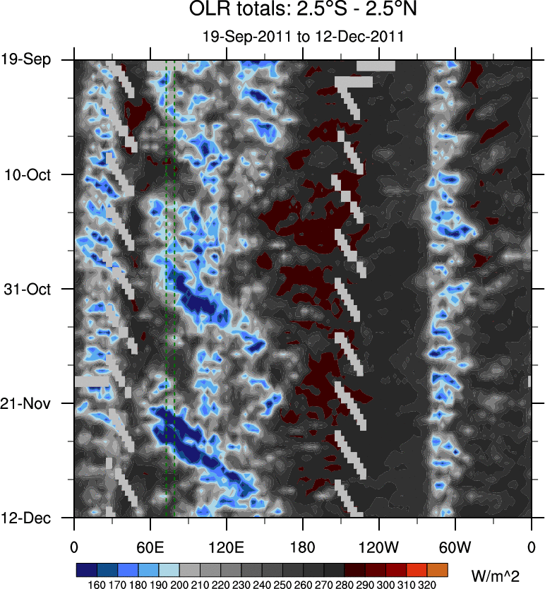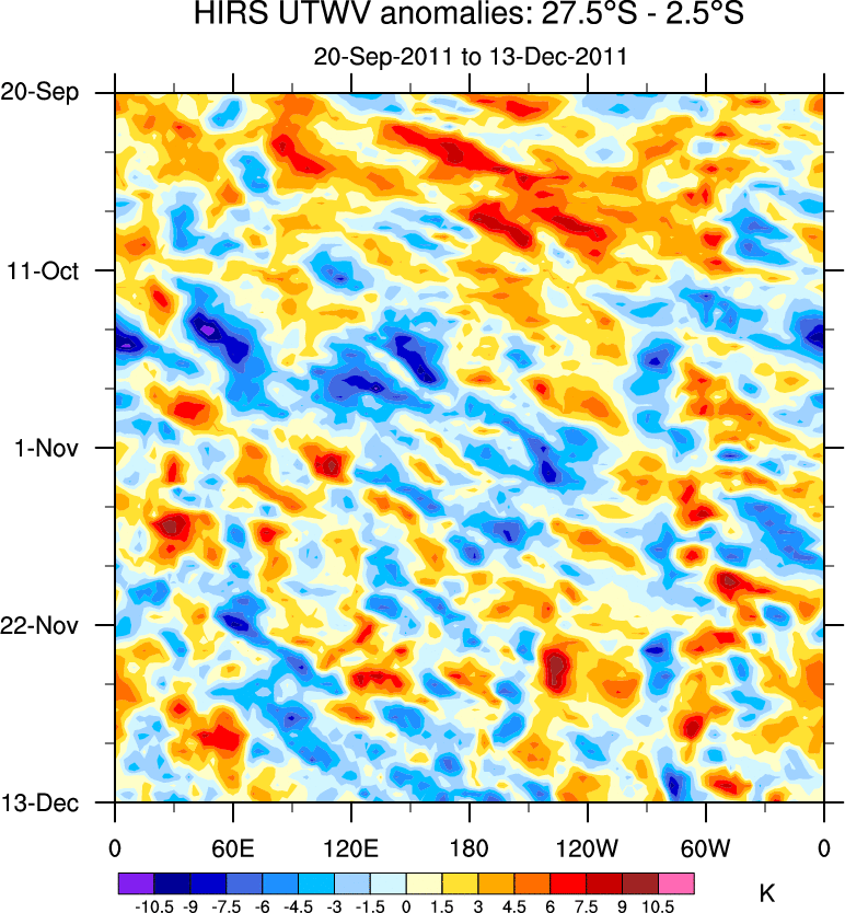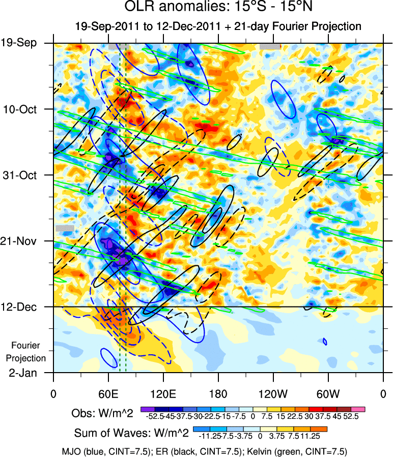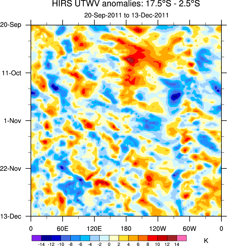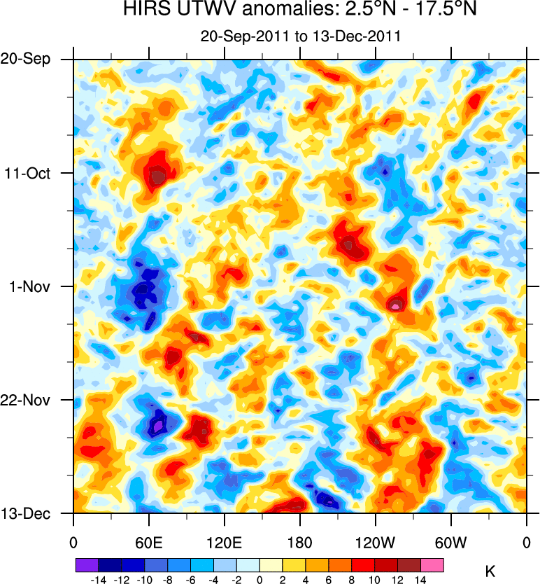 To identify tropical waves in near real-time, the OLR and UTWV data are filtered following Wheeler & Weickmann (2001 MWR). The daily anomalies are calculated using the first 3 harmonics of the seasonal cycle for 1979–2009. Missing values are then filled using linear interpolation in space and time. The most recent 365 days of anomalies are padded with 659 days of zeroes, and the result is filtered for each wave type.