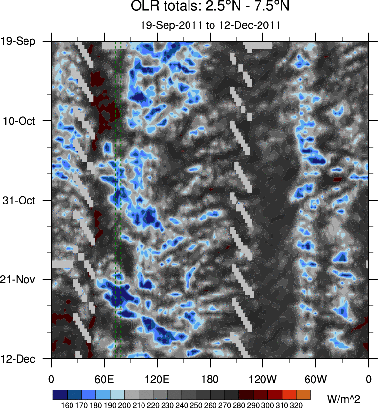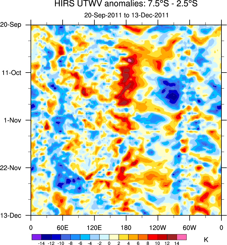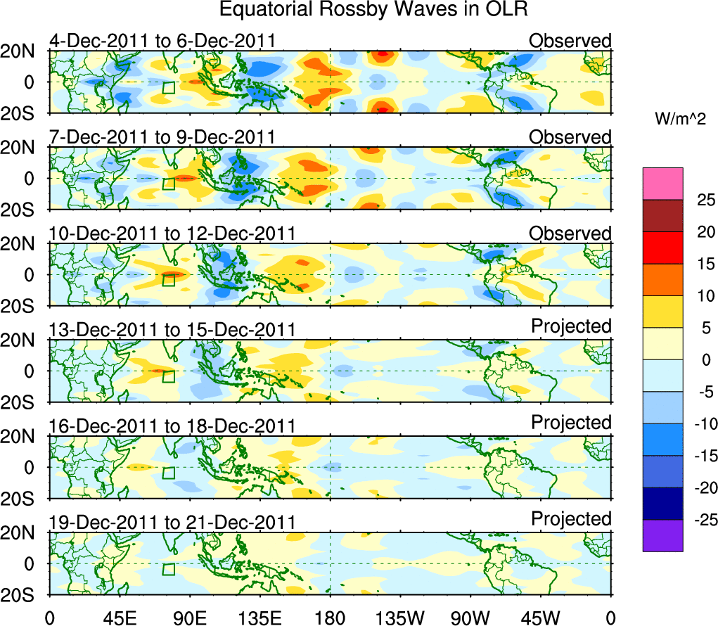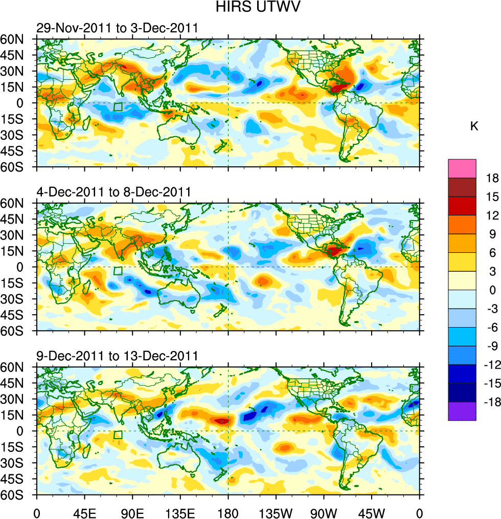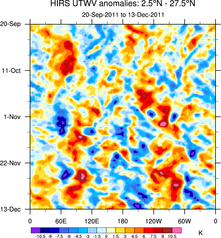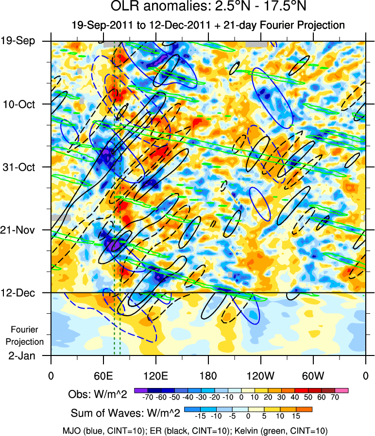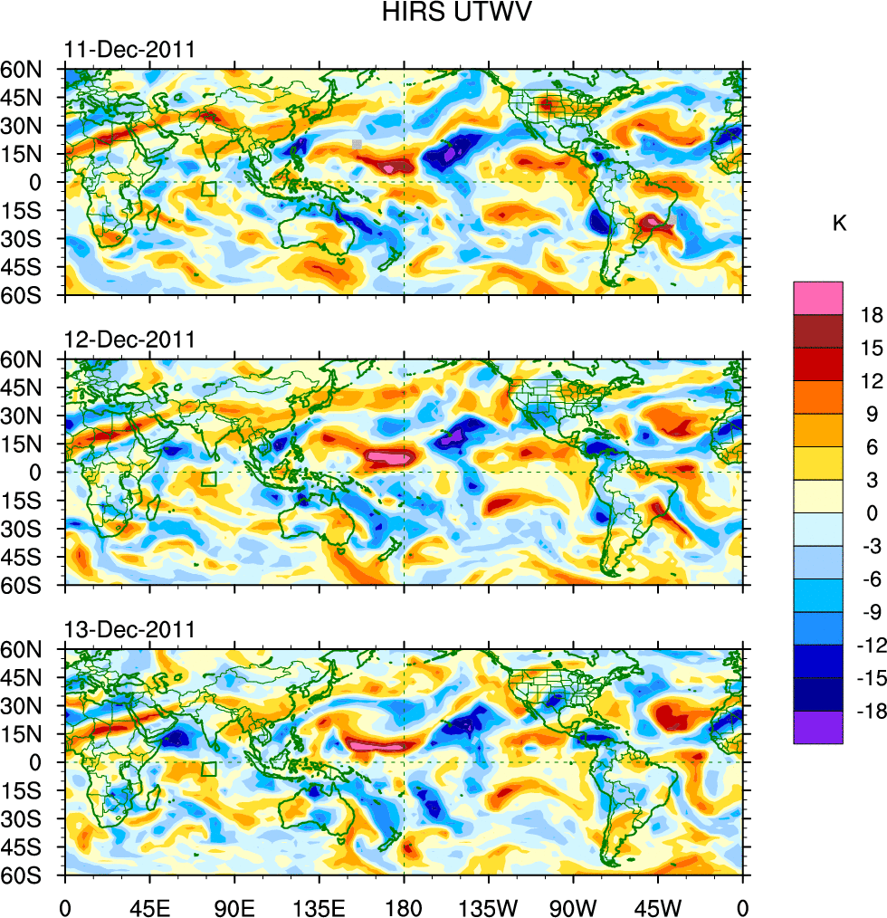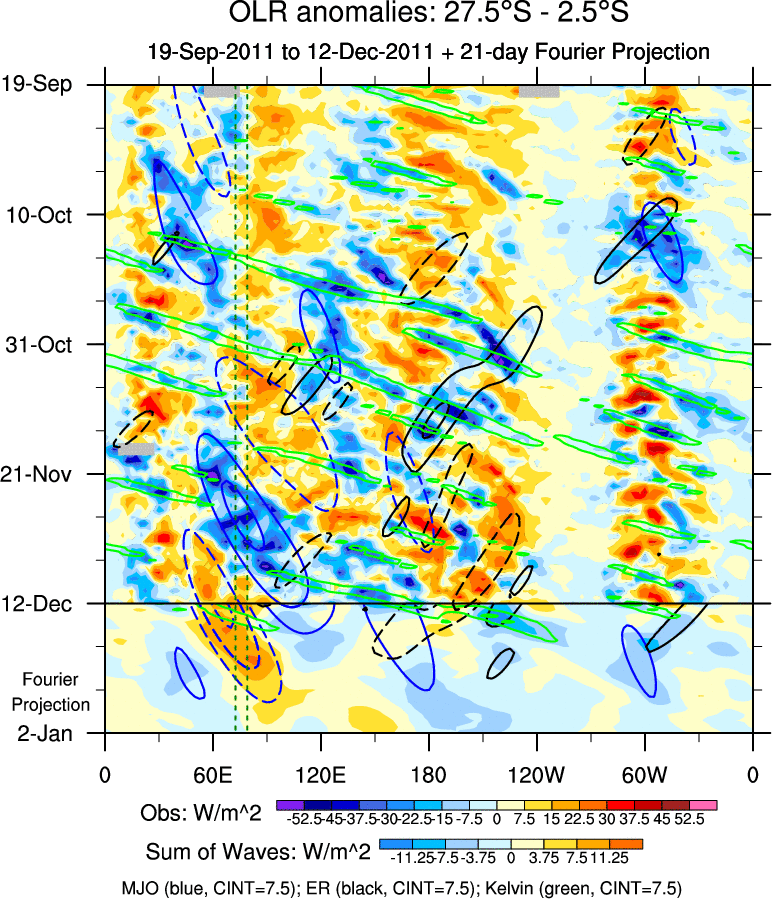 To identify tropical waves in near real-time, the OLR and UTWV data are filtered following Wheeler & Weickmann (2001 MWR). The daily anomalies are calculated using the first 3 harmonics of the seasonal cycle for 1979–2009. Missing values are then filled using linear interpolation in space and time. The most recent 365 days of anomalies are padded with 659 days of zeroes, and the result is filtered for each wave type.